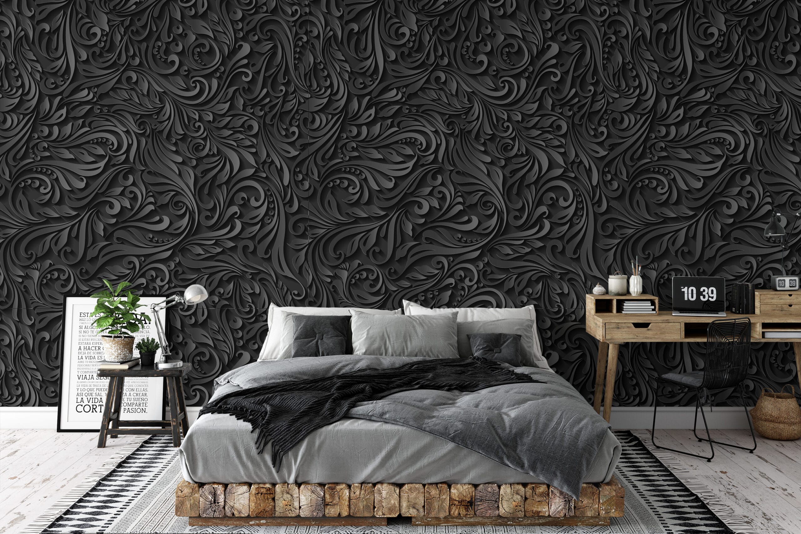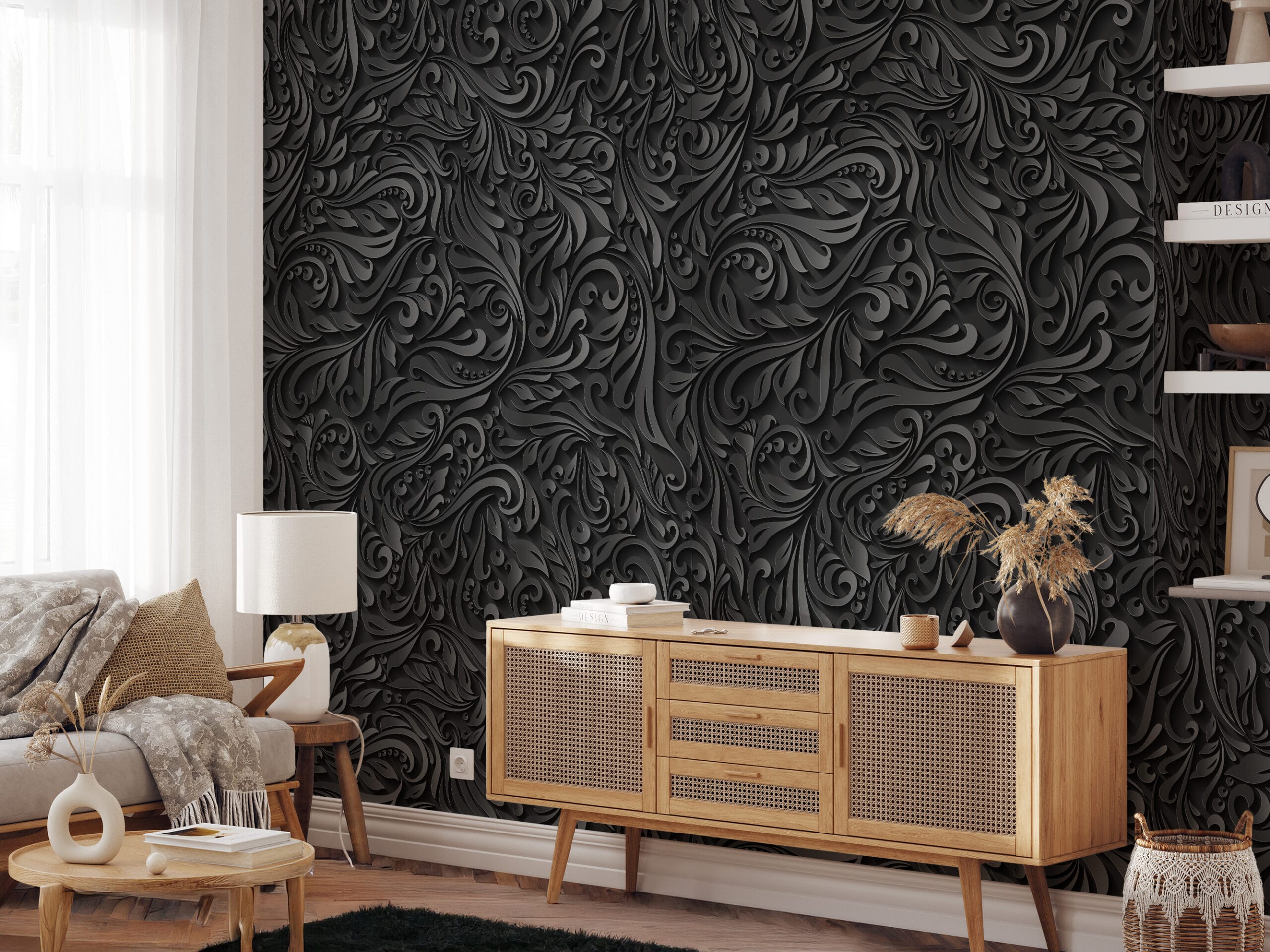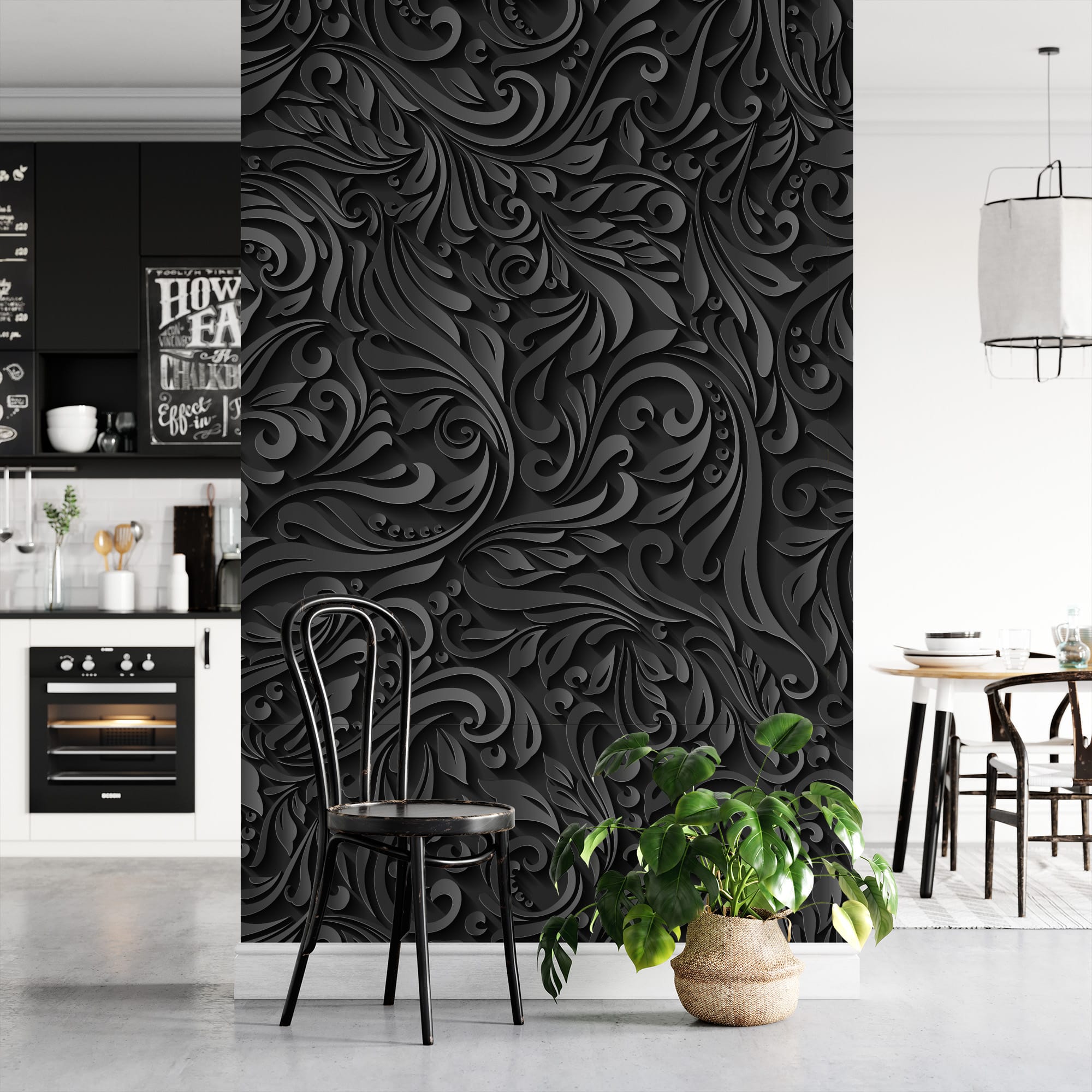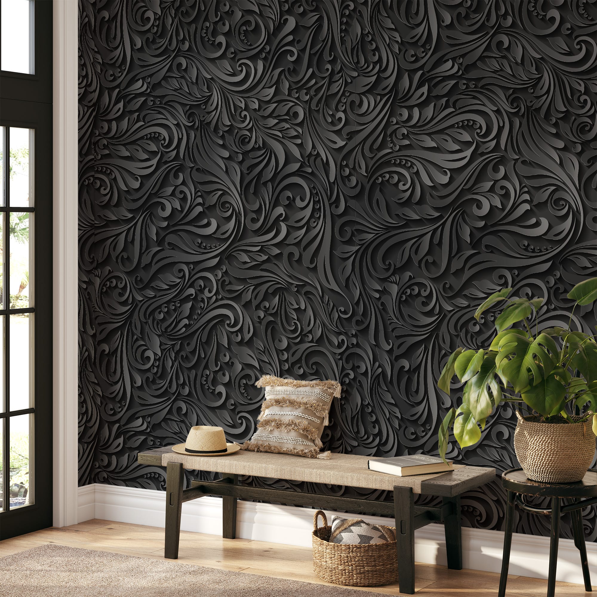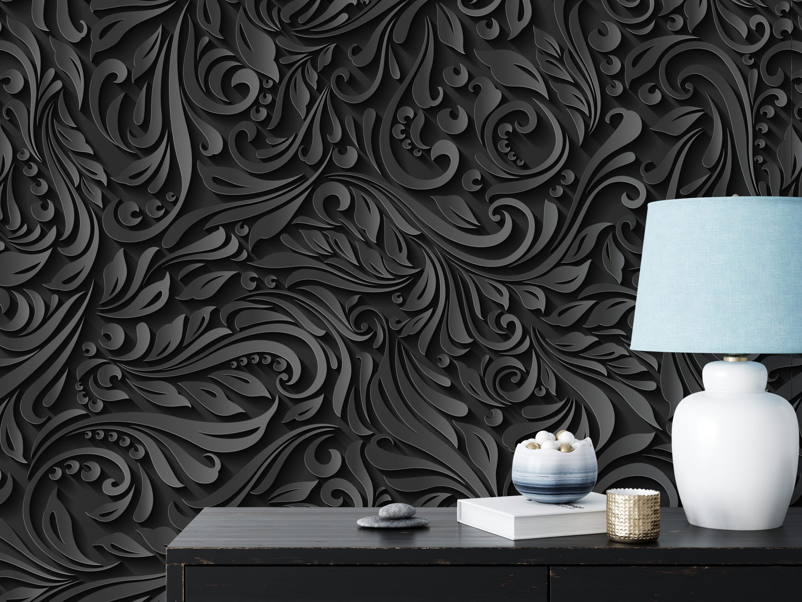 3D Embossed Black Floral Peel and Stick Wallpaper, Modern Dark Grey Damask Wall Mural, Luxurious Textured Swirl Removable Wallpaper abst-0023