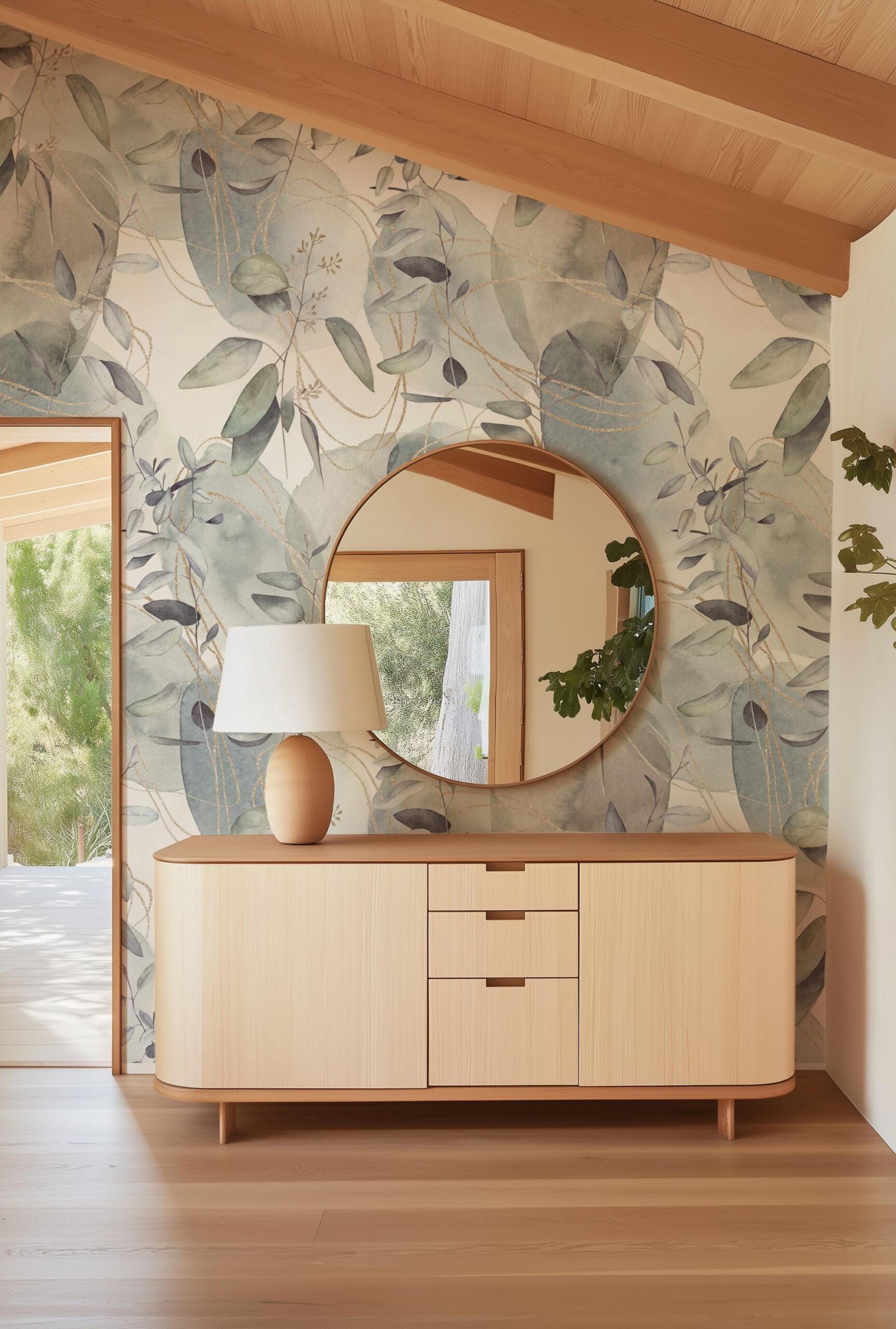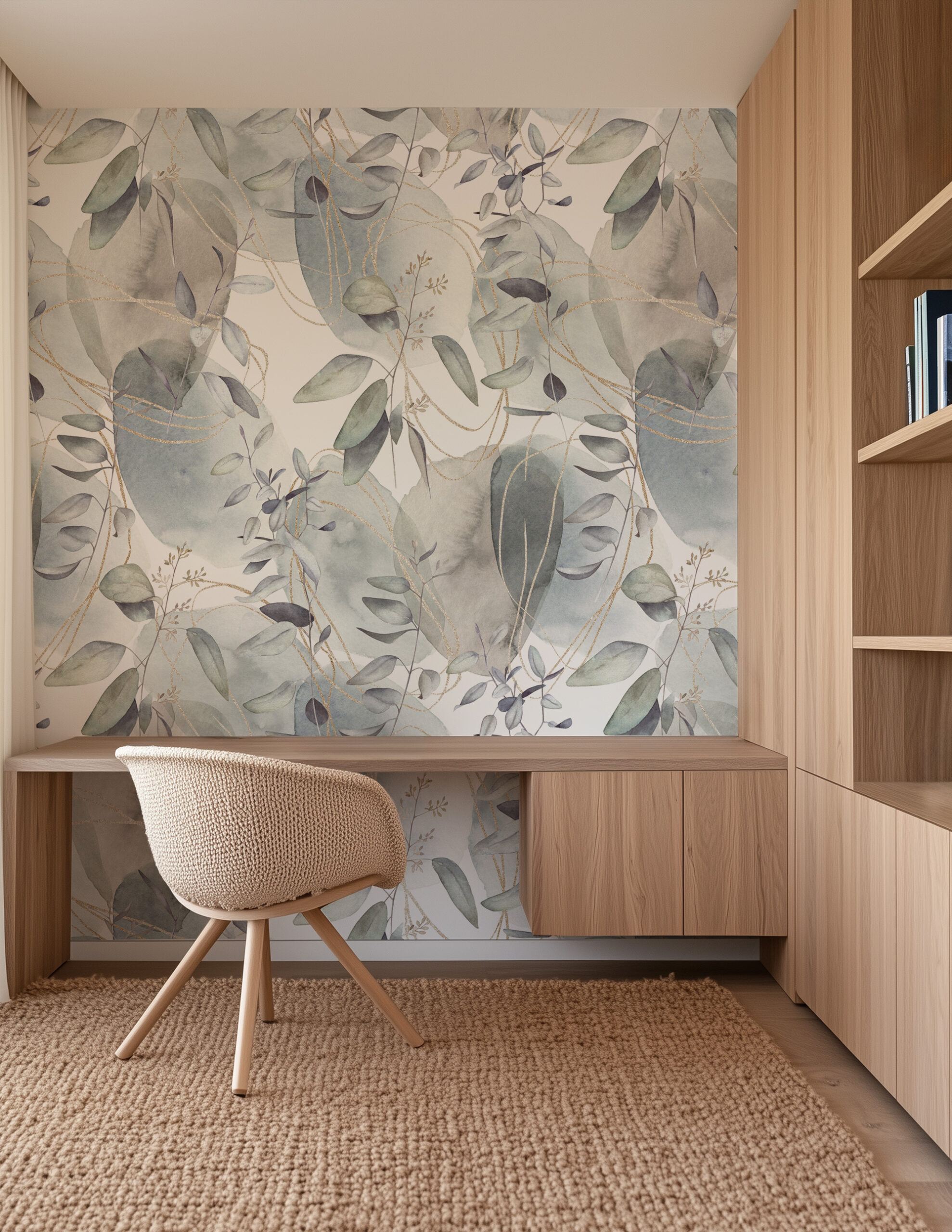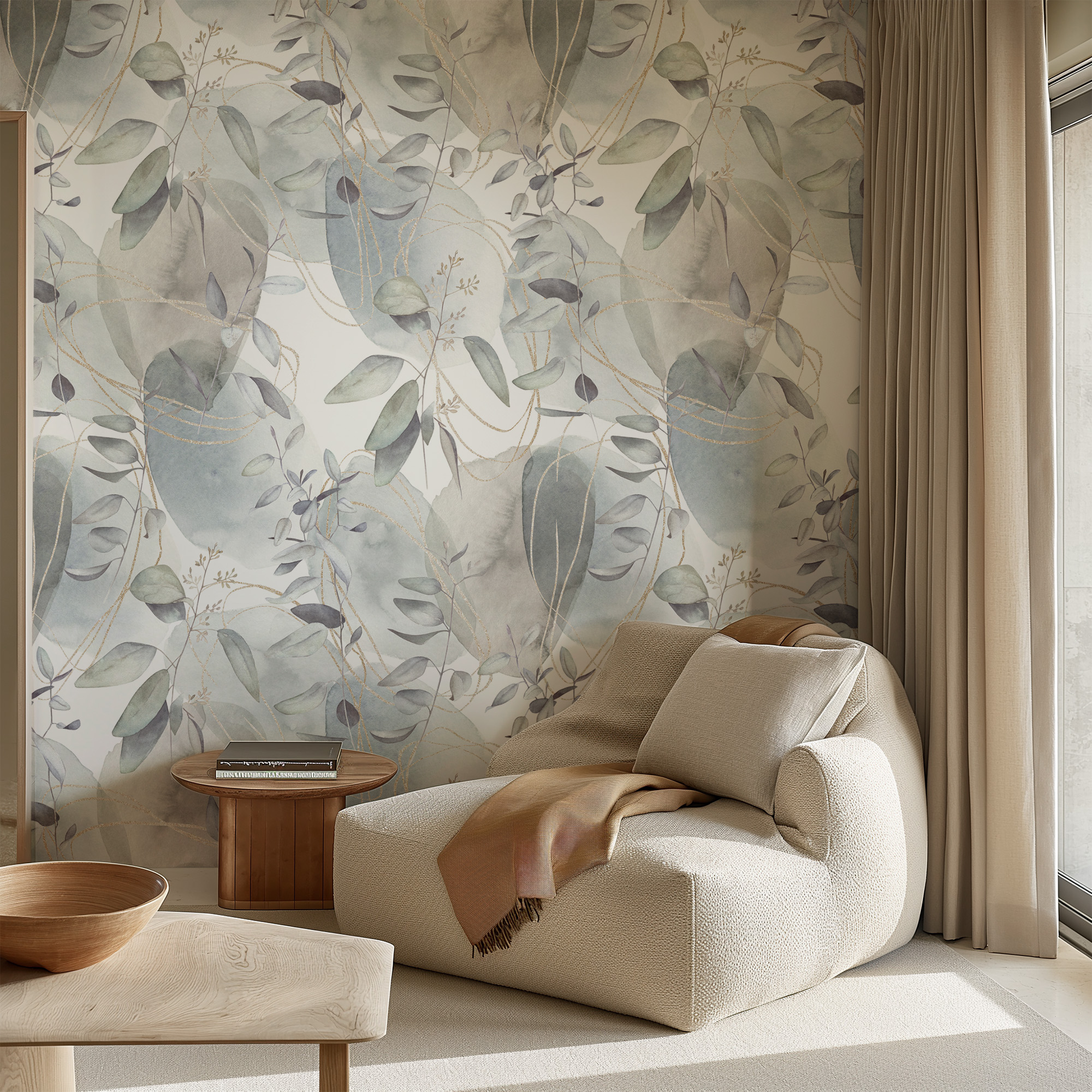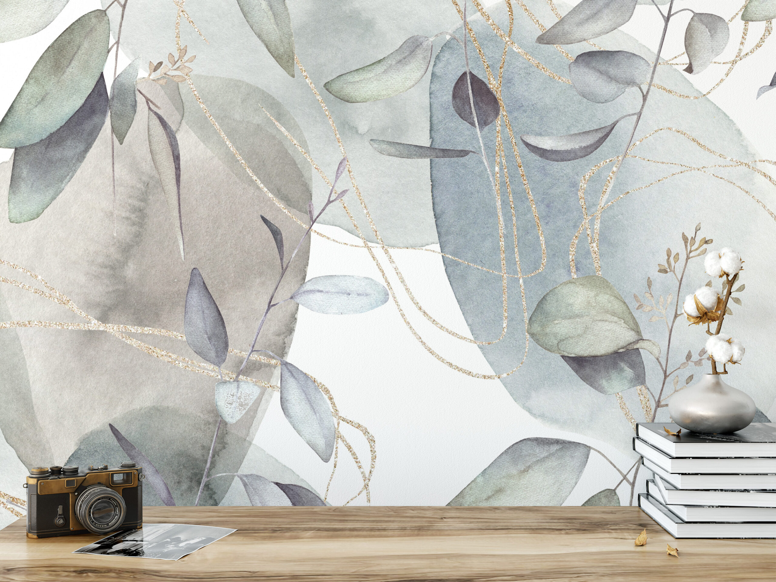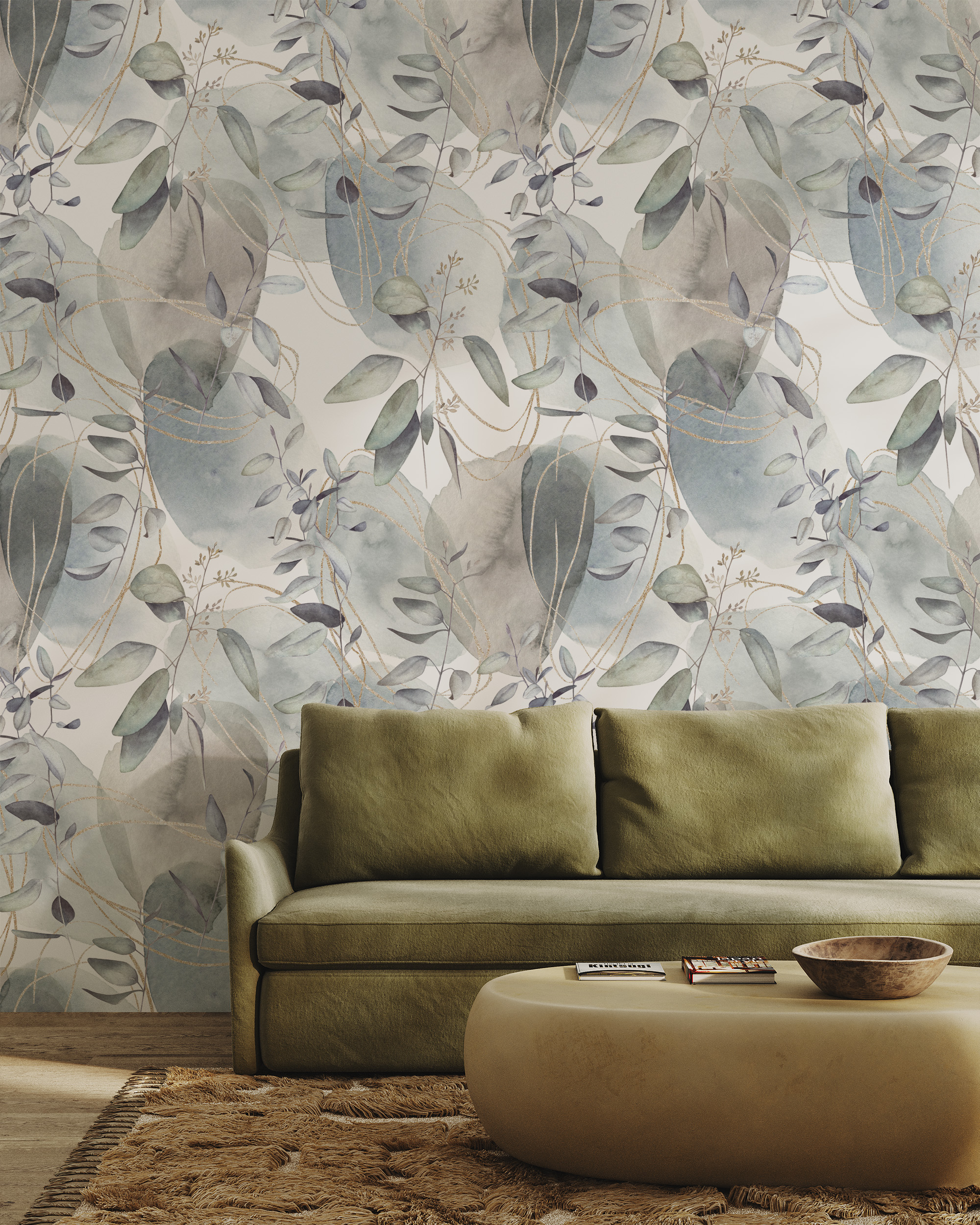 Abstract Watercolor Eucalyptus Peel and Stick Wallpaper, Ethereal Botanical Wall Mural with Gold Lines, Soft Sage and Blue Nature Decor flrl-0044