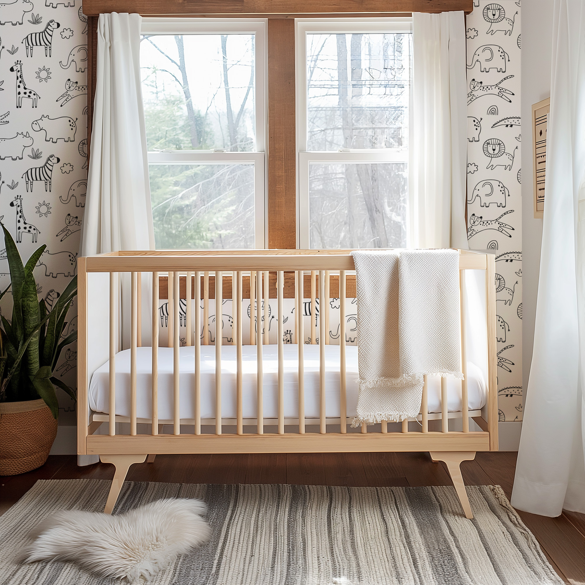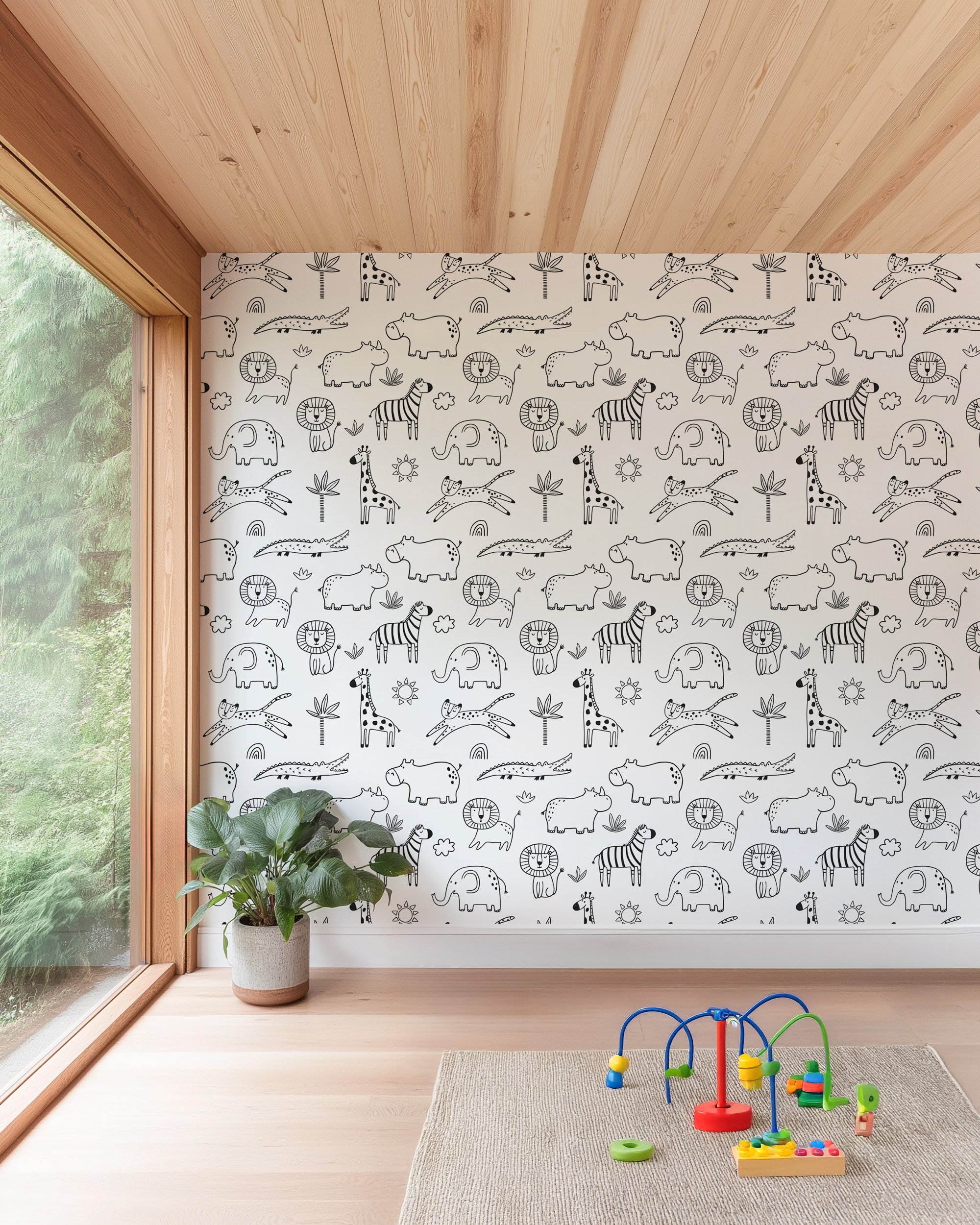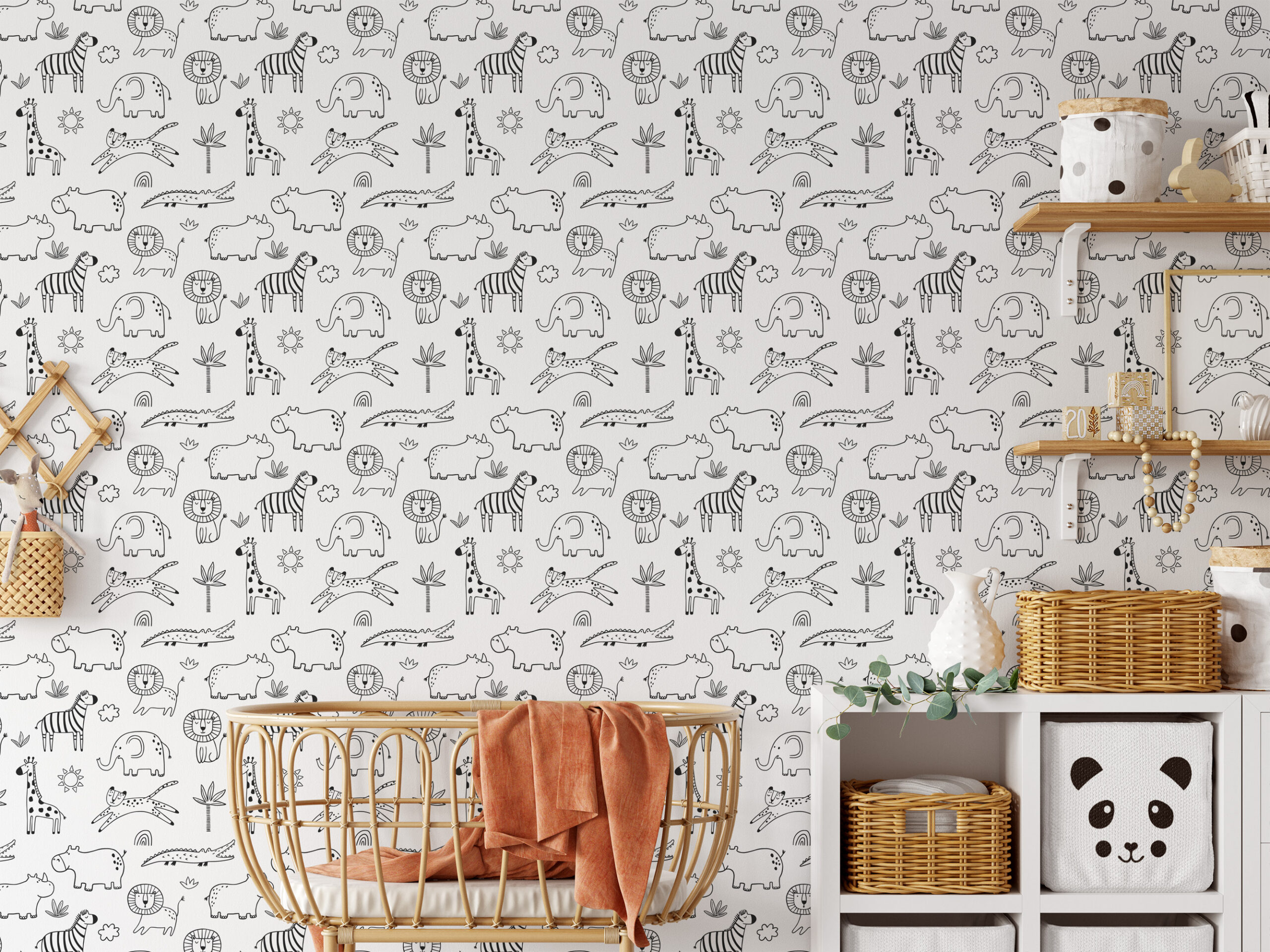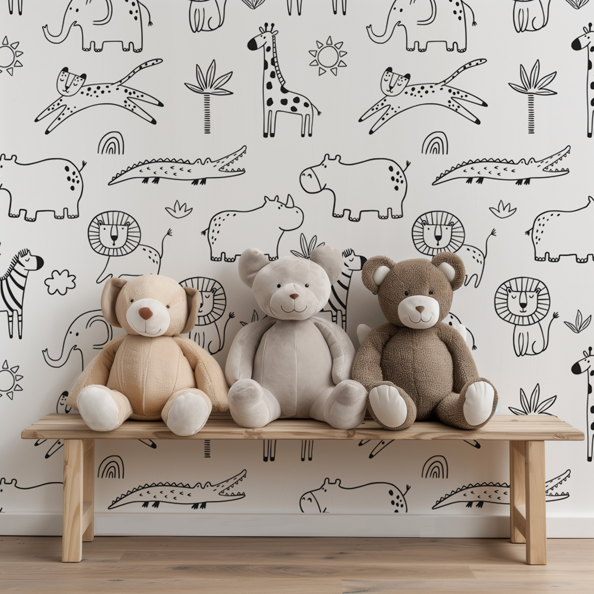 Black and White Safari Animals Line Art Kids Peel and Stick Wallpaper, Modern Scandi Nursery Wall Mural kids-0050
