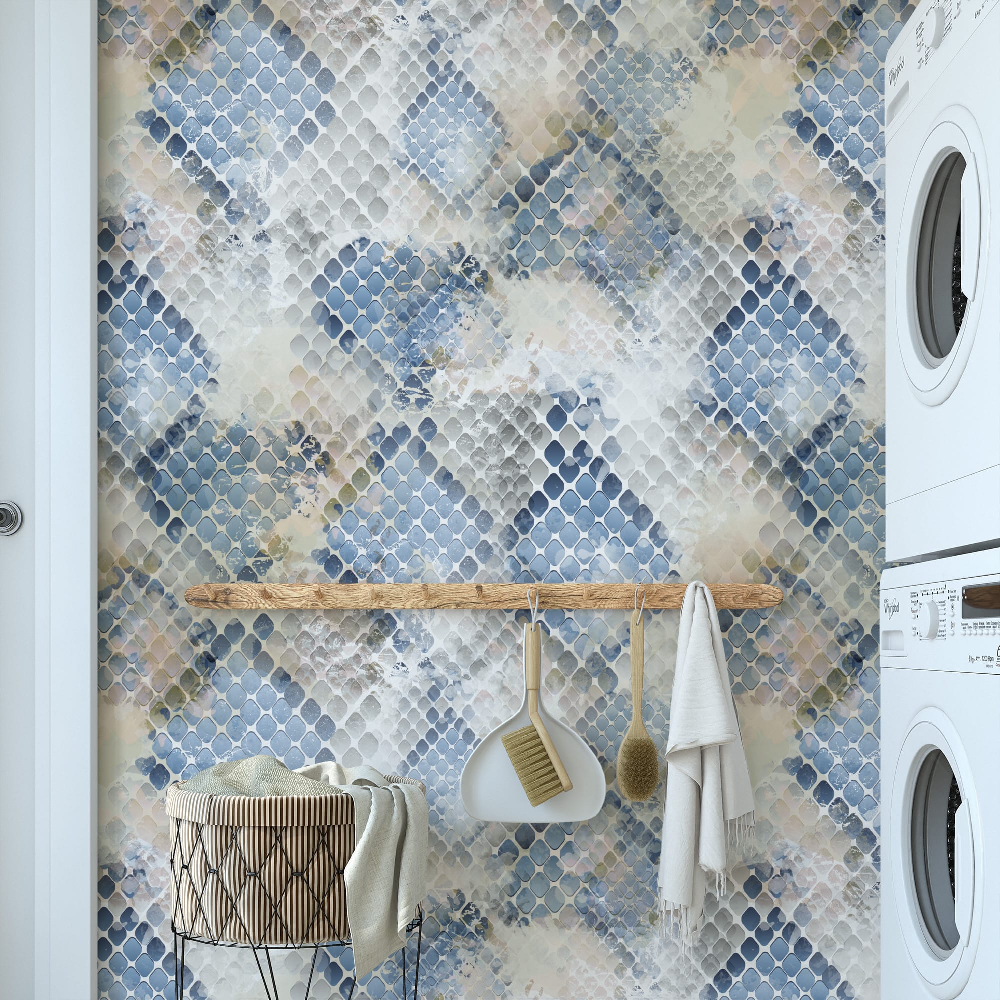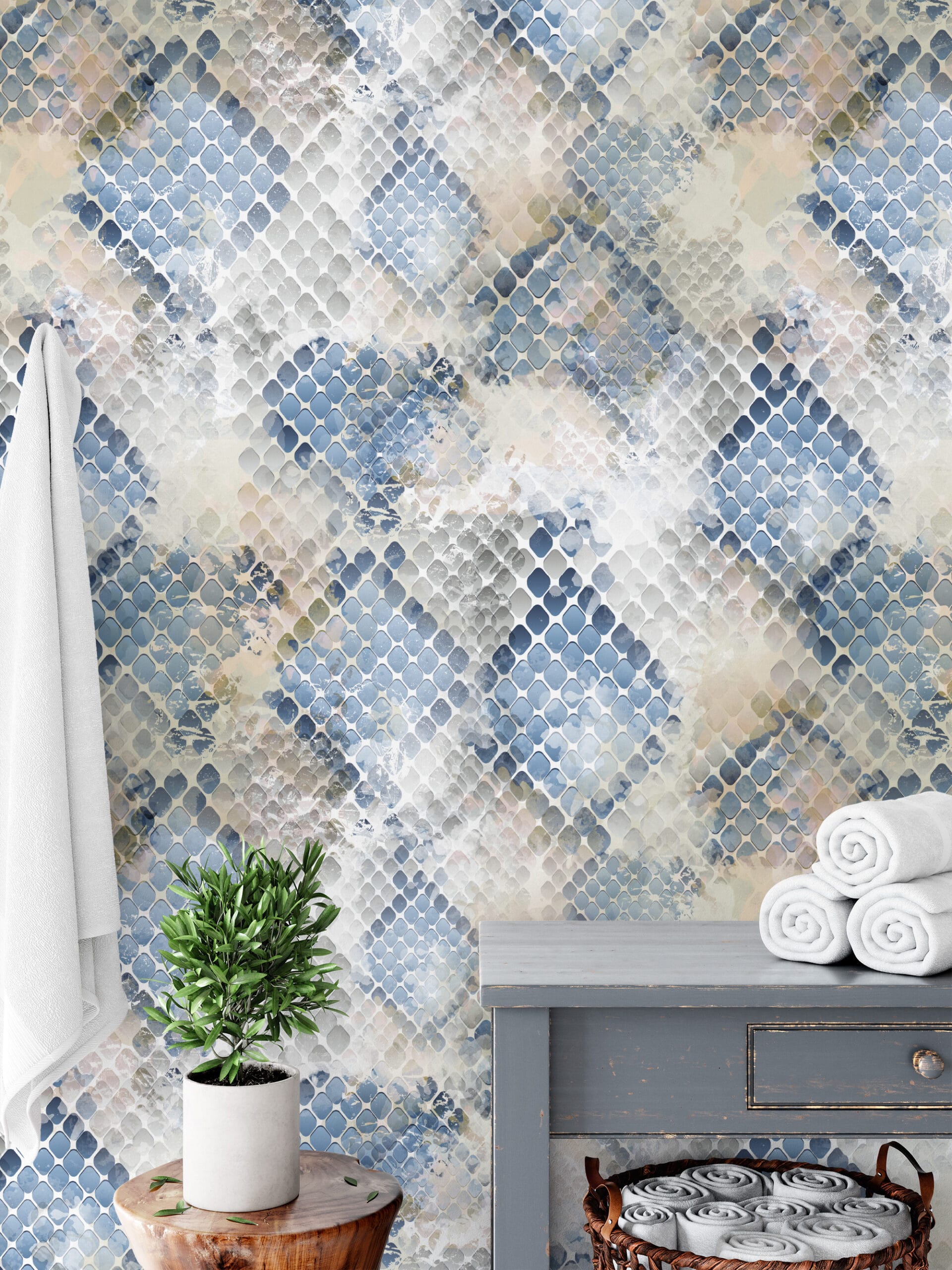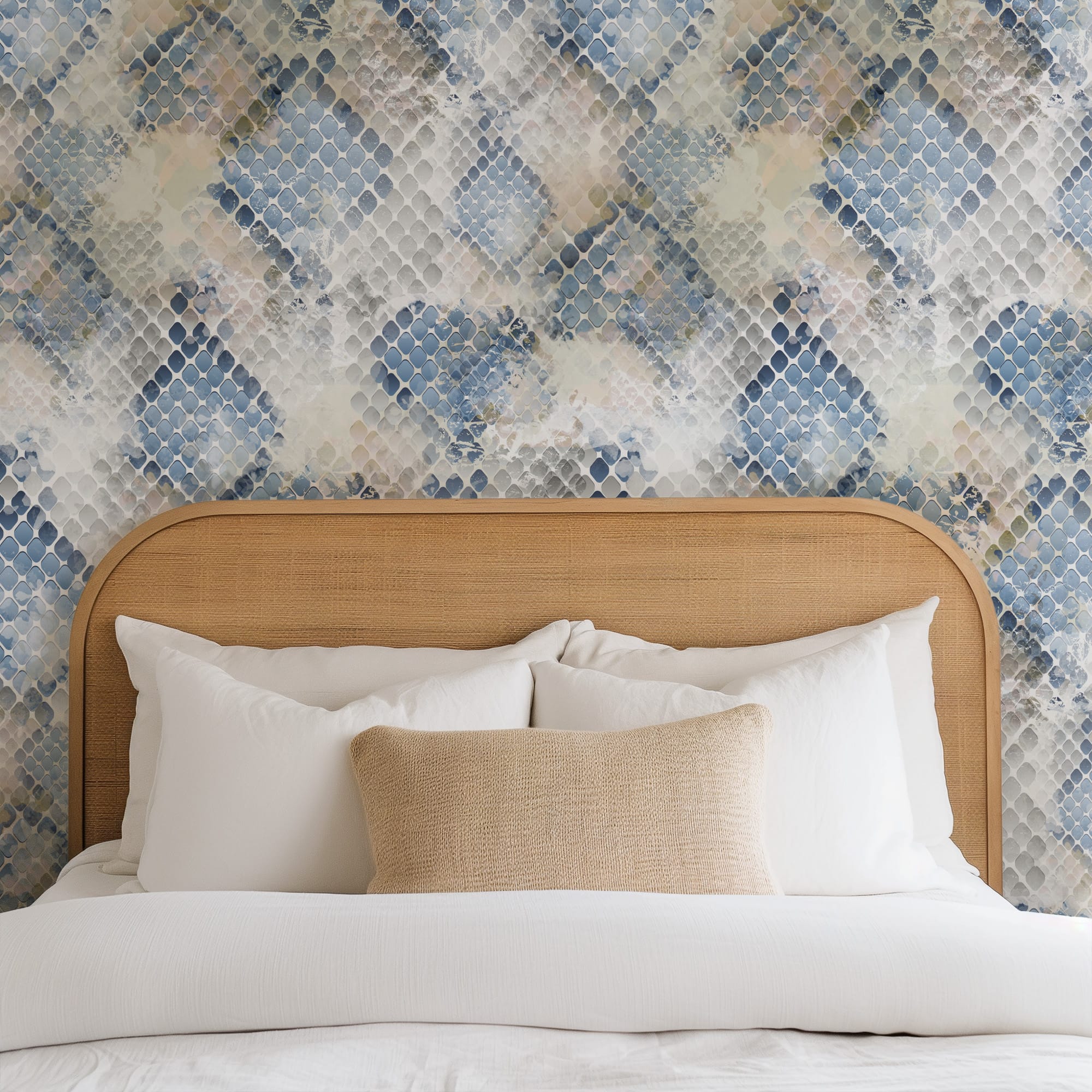 Blue and Grey Snakeskin Texture Peel and Stick Wallpaper, Modern Faux Reptile Scale Wall Mural, Contemporary Abstract Removable Wallpaper anml-0033