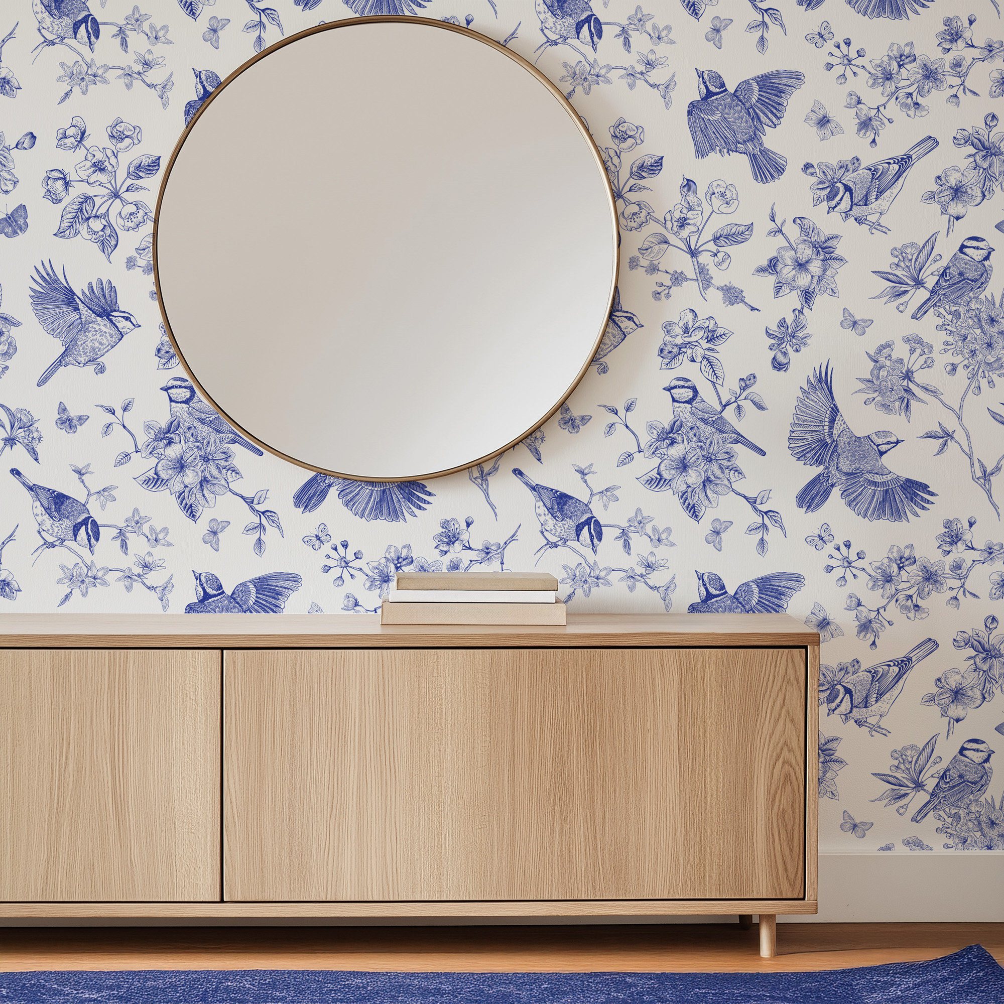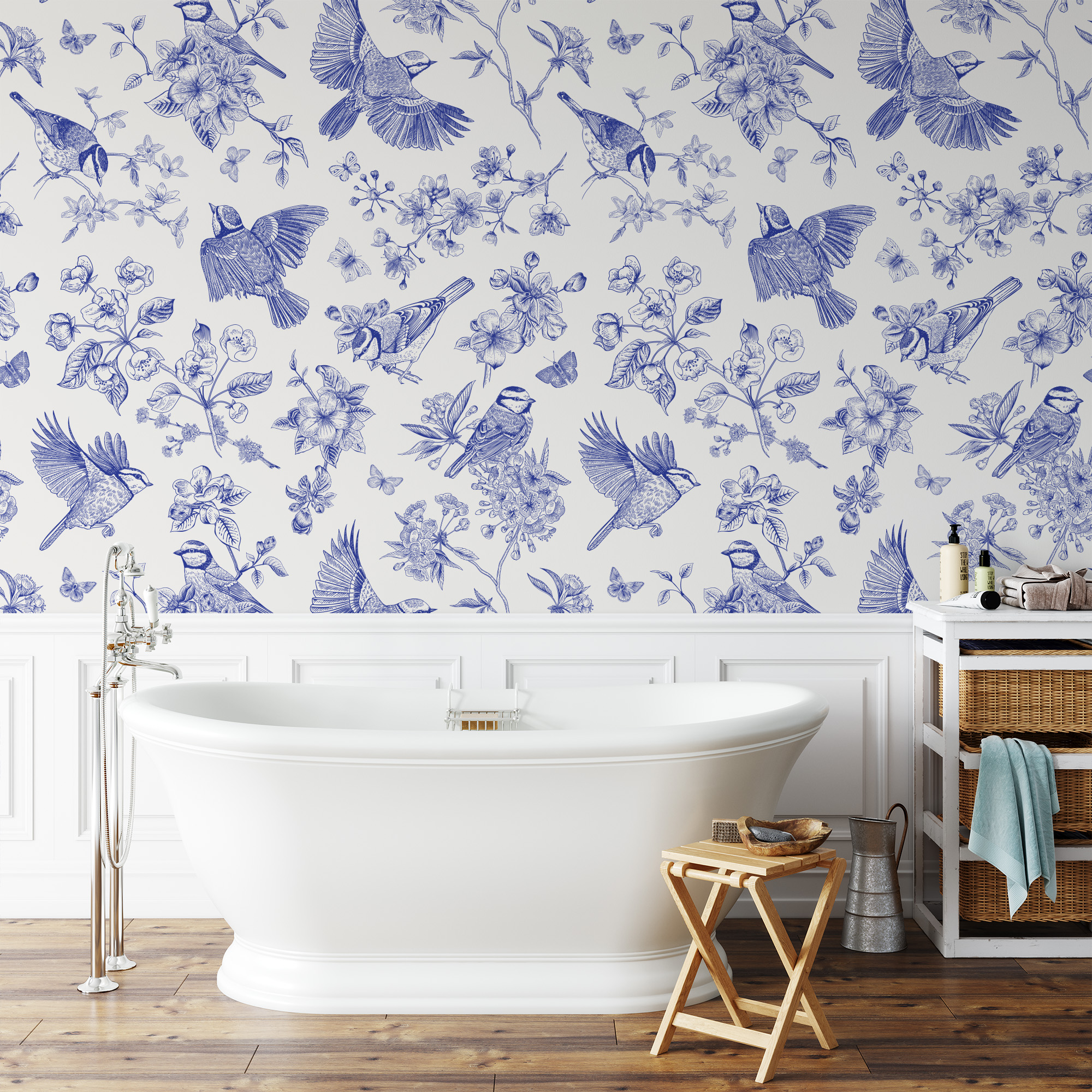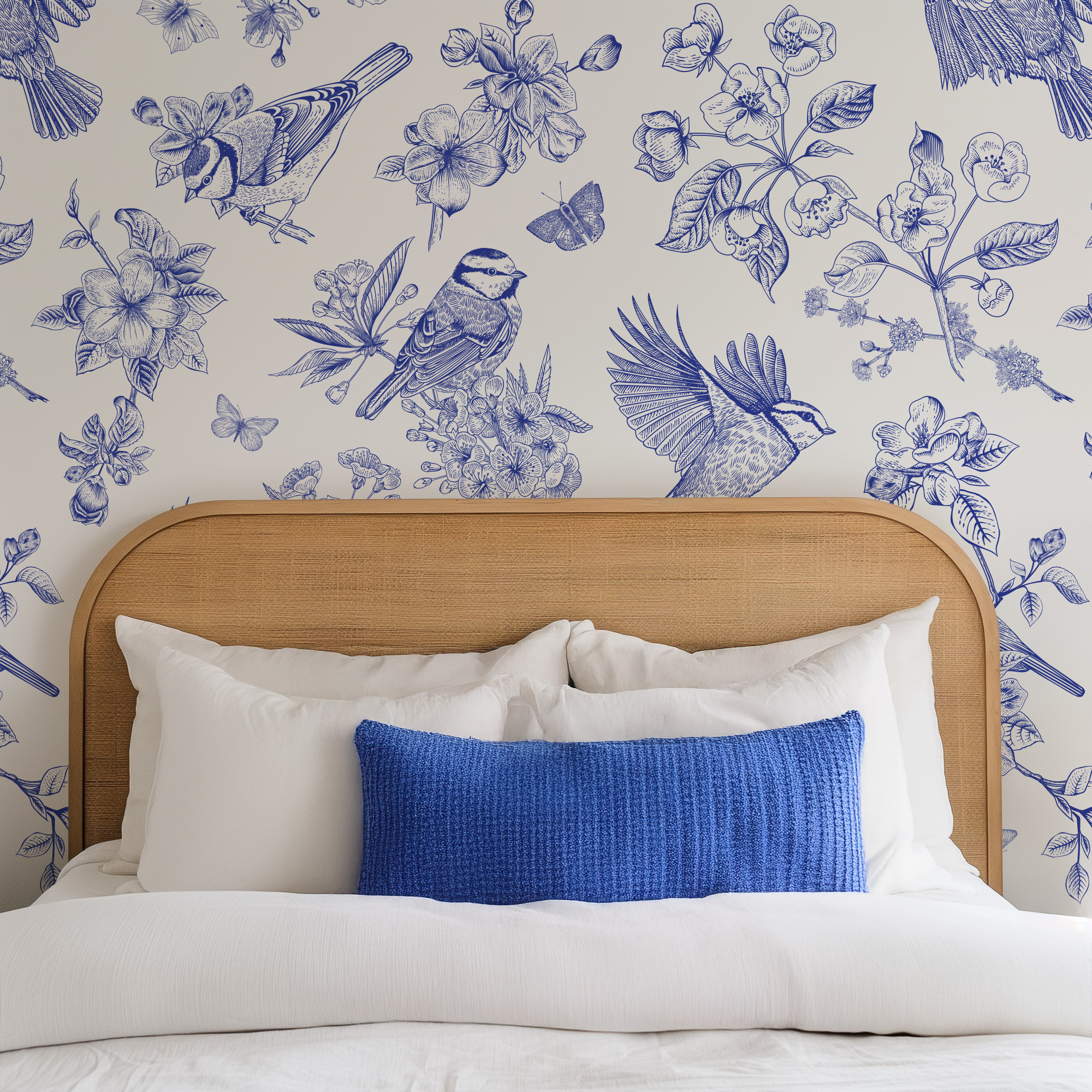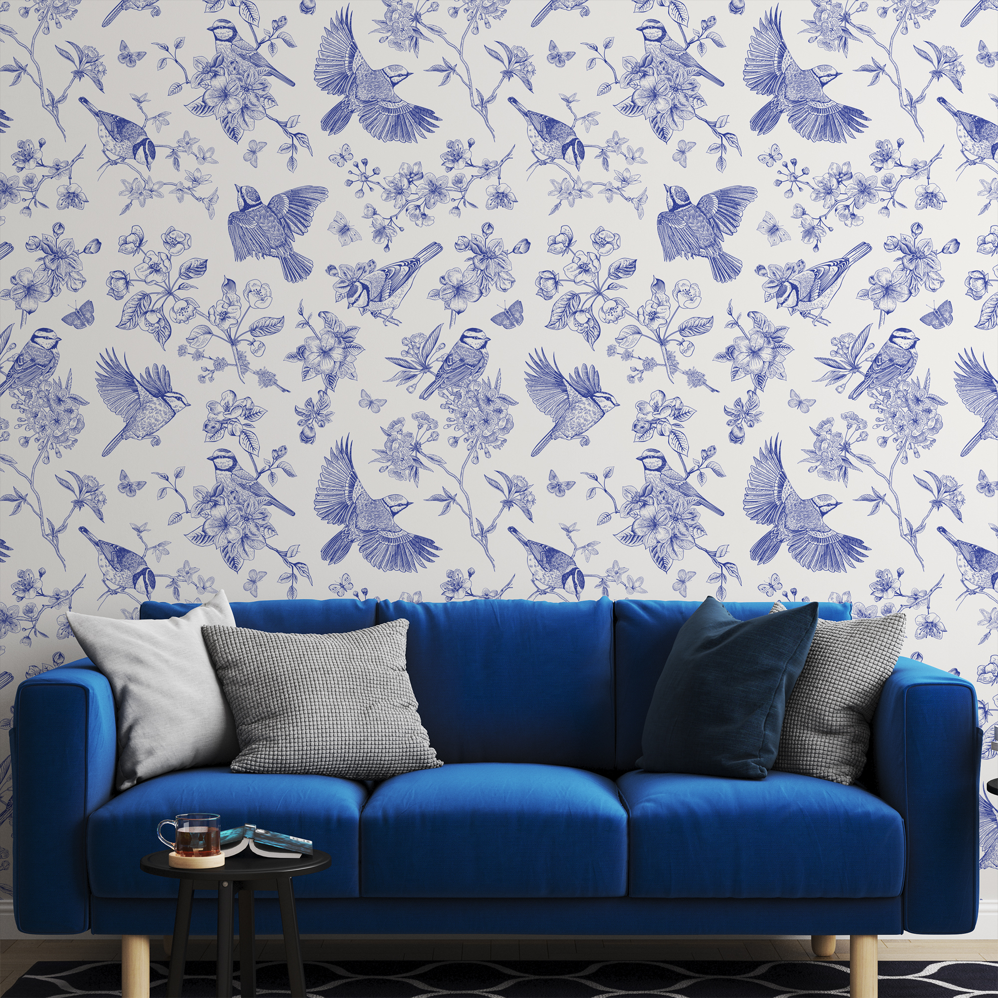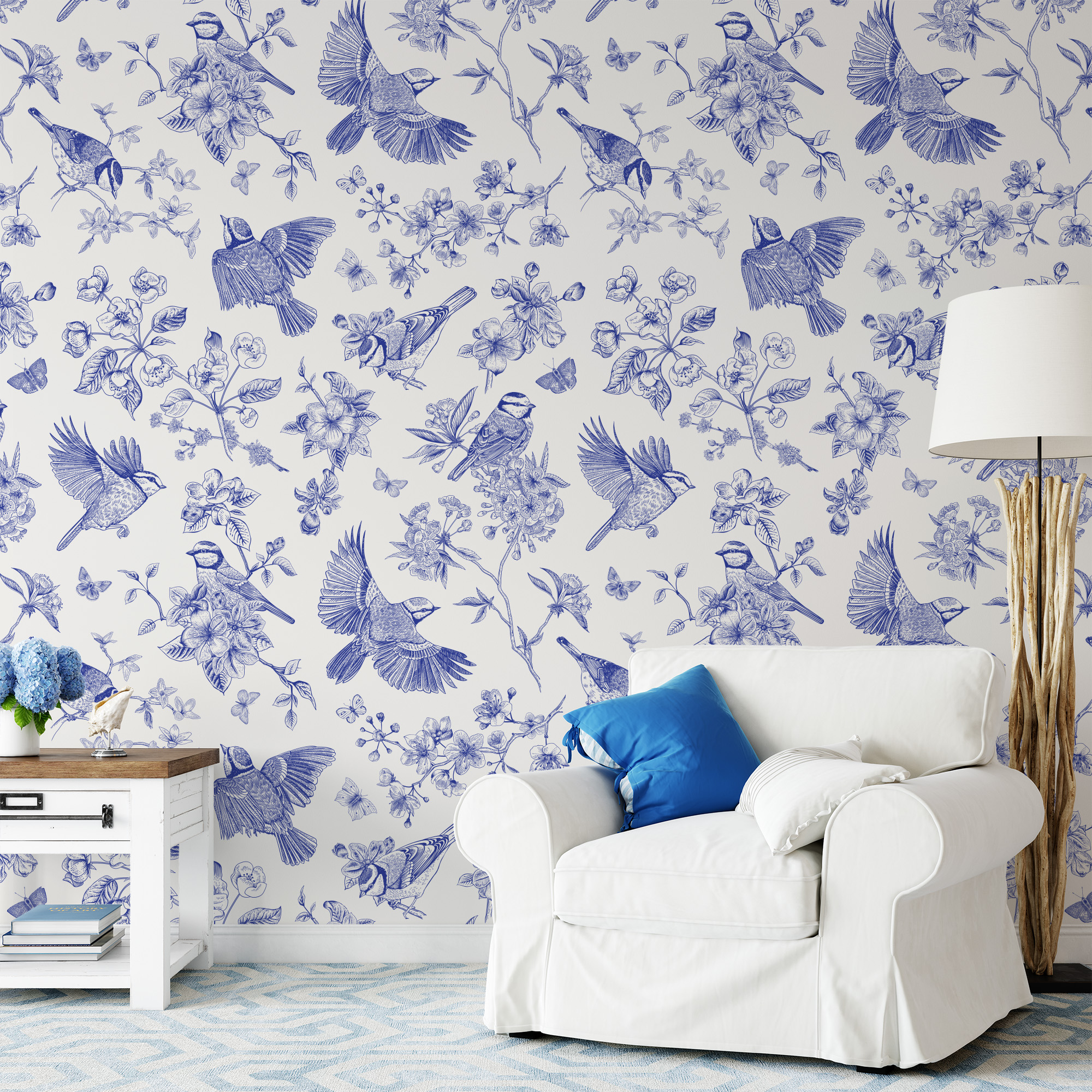 Blue and White Vintage Bird Peel and Stick Wallpaper, Floral Line Art Wall Mural, Elegant Chinoiserie Style Removable Wallpaper anml-0003