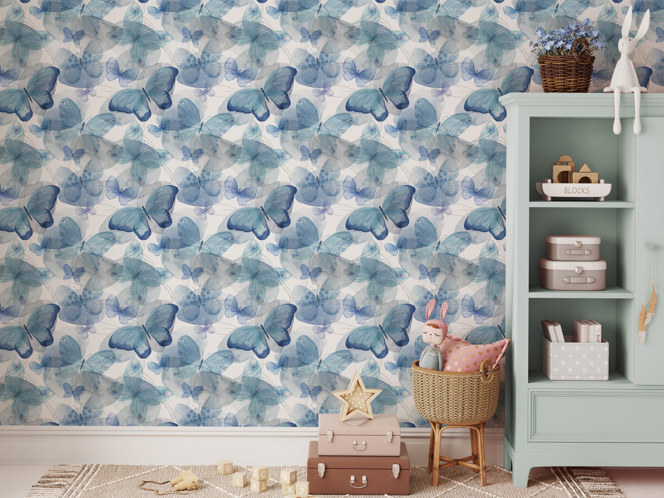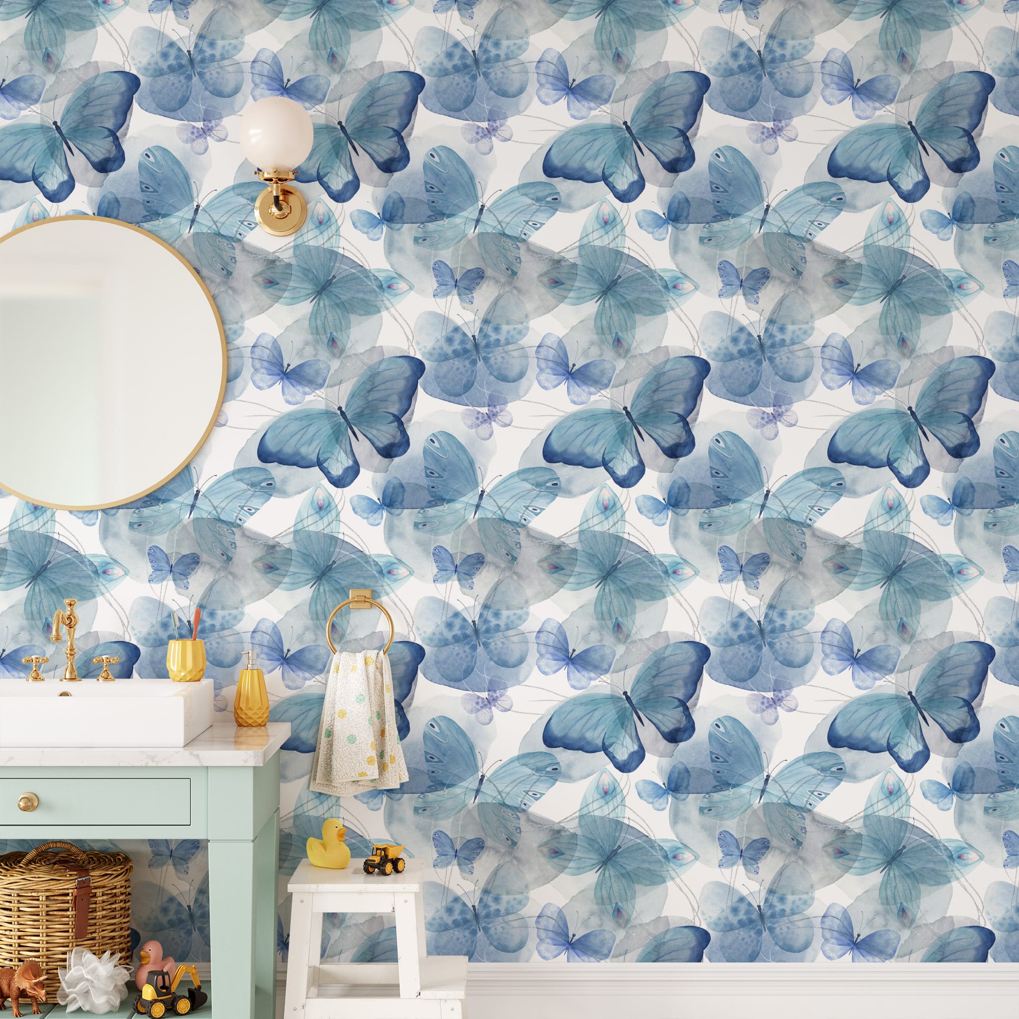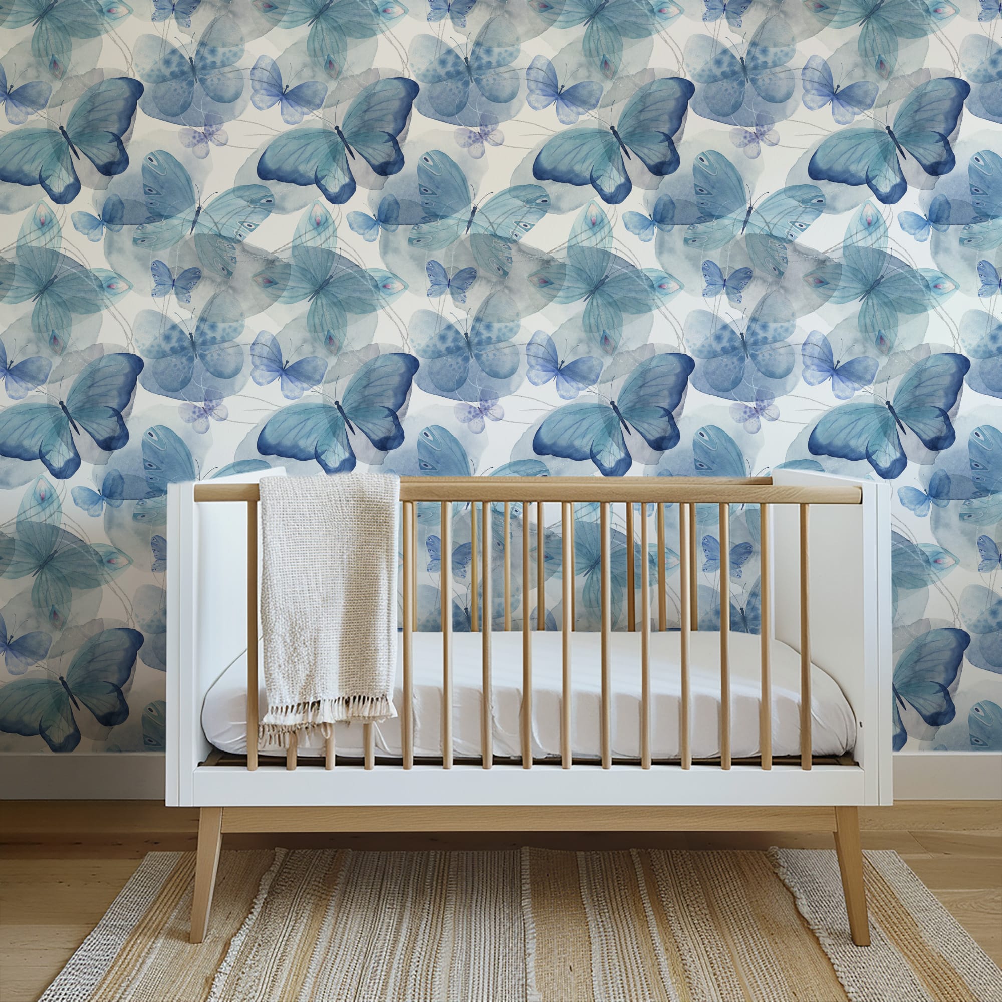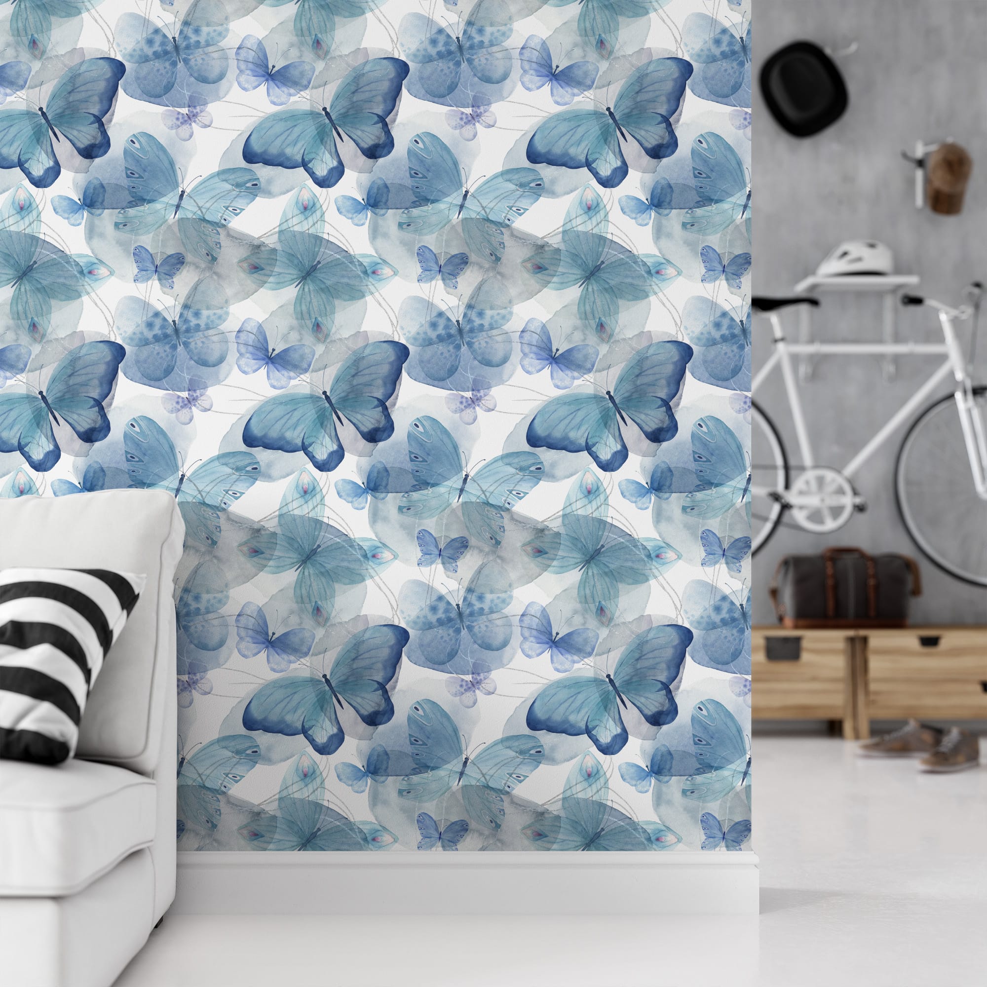 Blue Watercolor Butterfly Peel and Stick Wallpaper, Whimsical Nature Wall Mural, Modern Kids Room Removable Wallpaper anml-0011