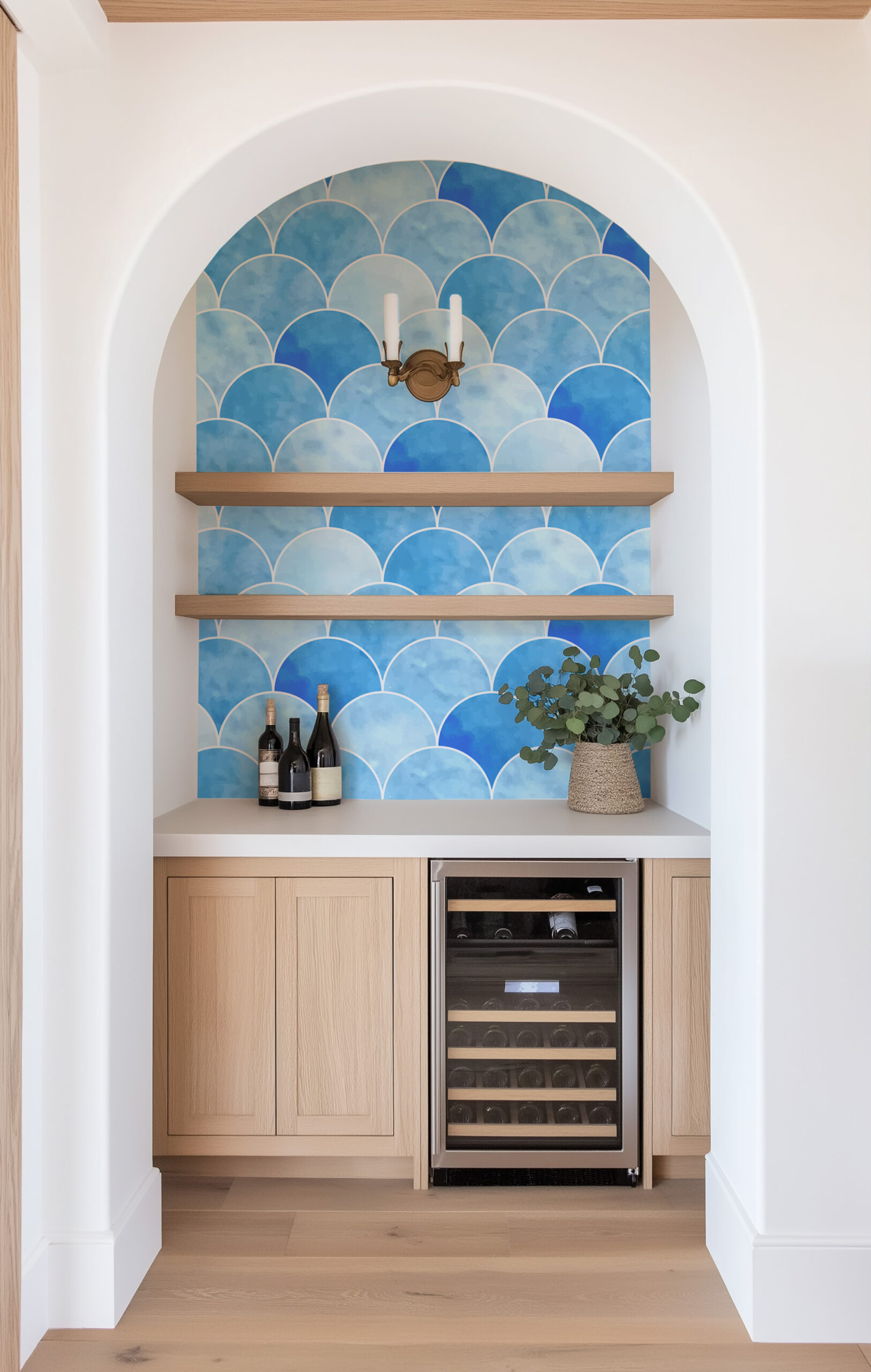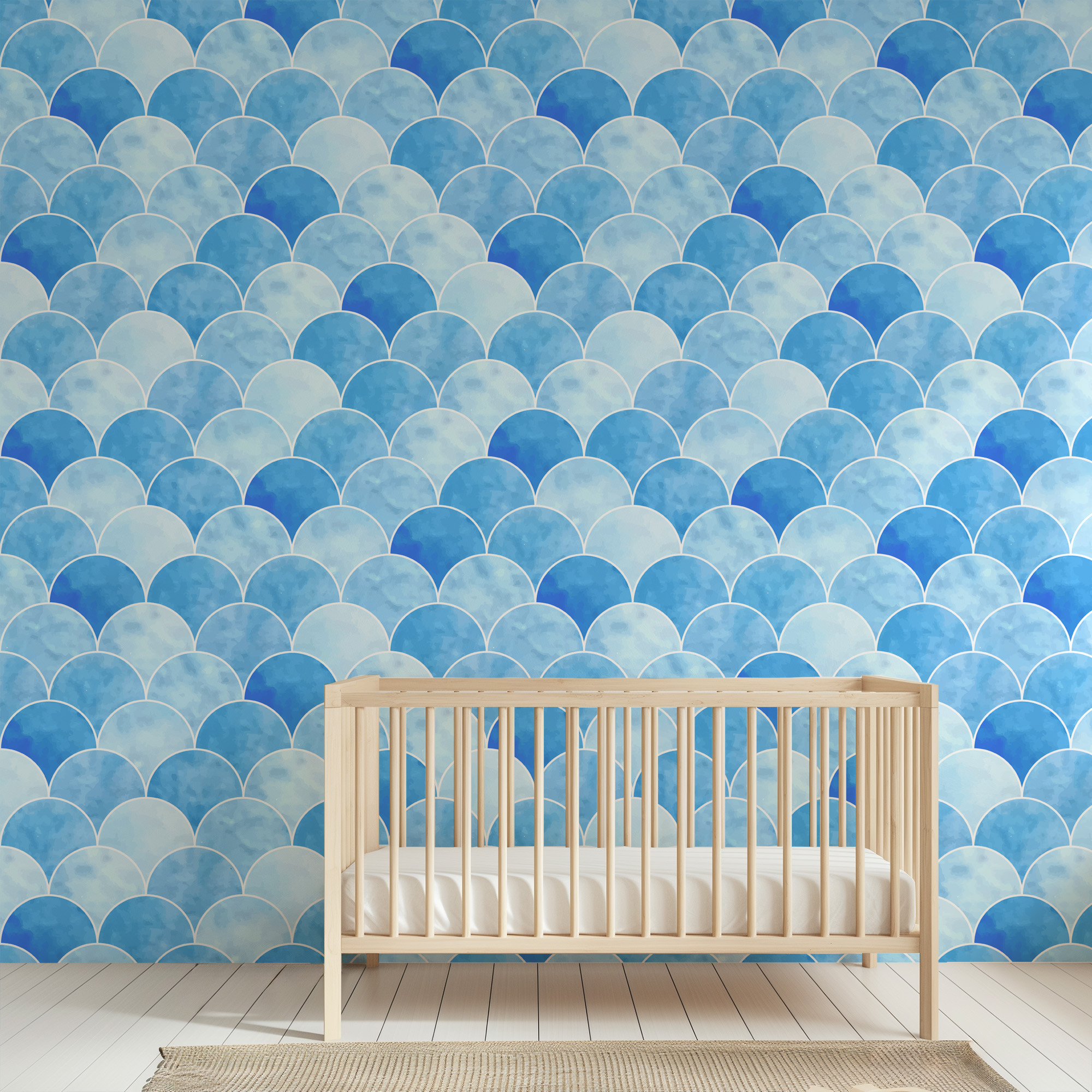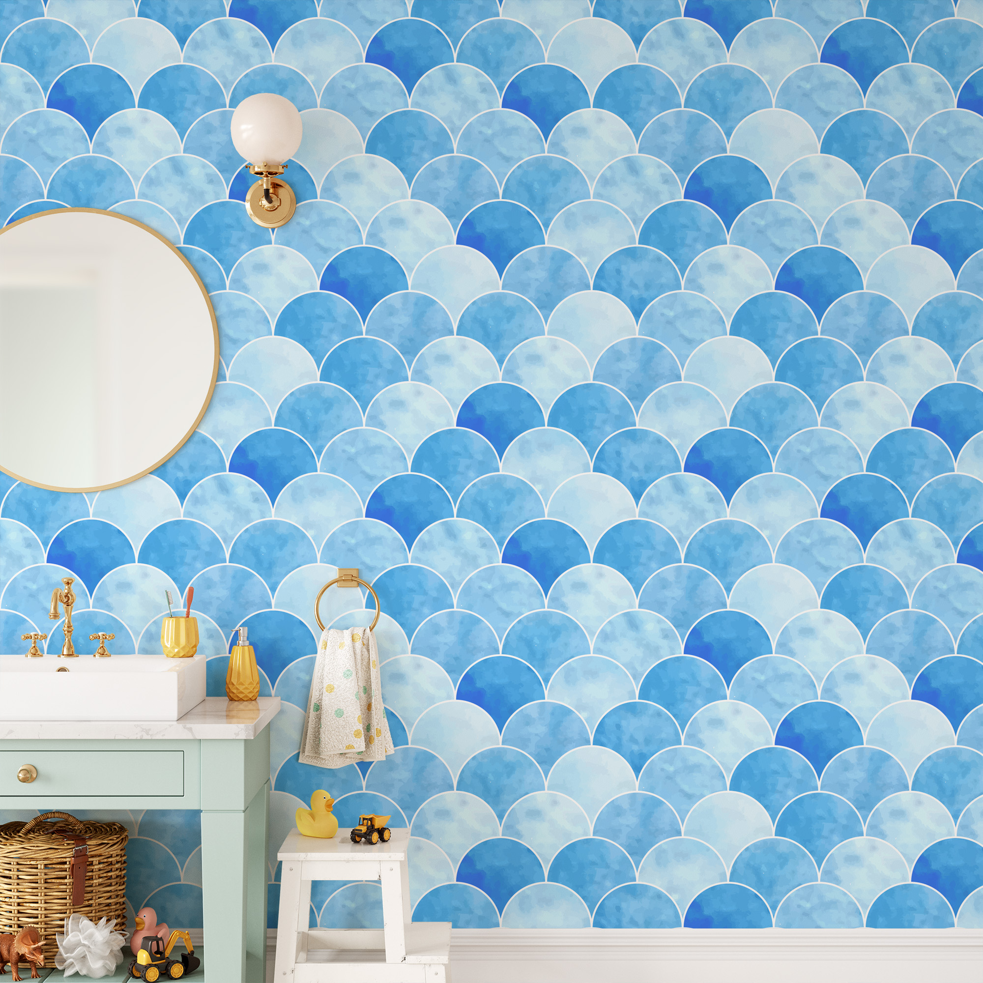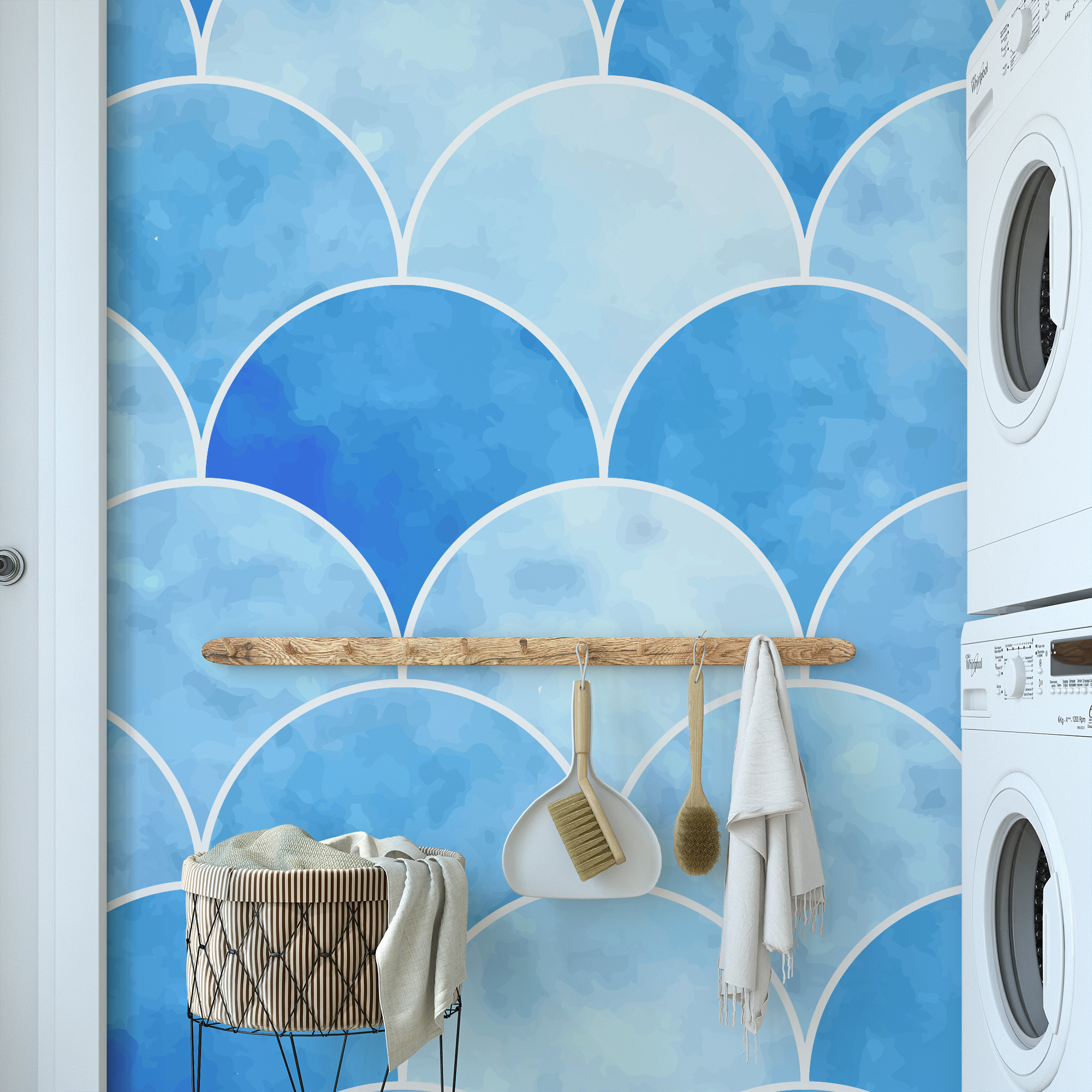 Blue Watercolor Scallop Fish Scale Peel and Stick Wallpaper, Modern Coastal Laundry Room Decor, Serene Ocean Wave Wall Mural gmla-0025