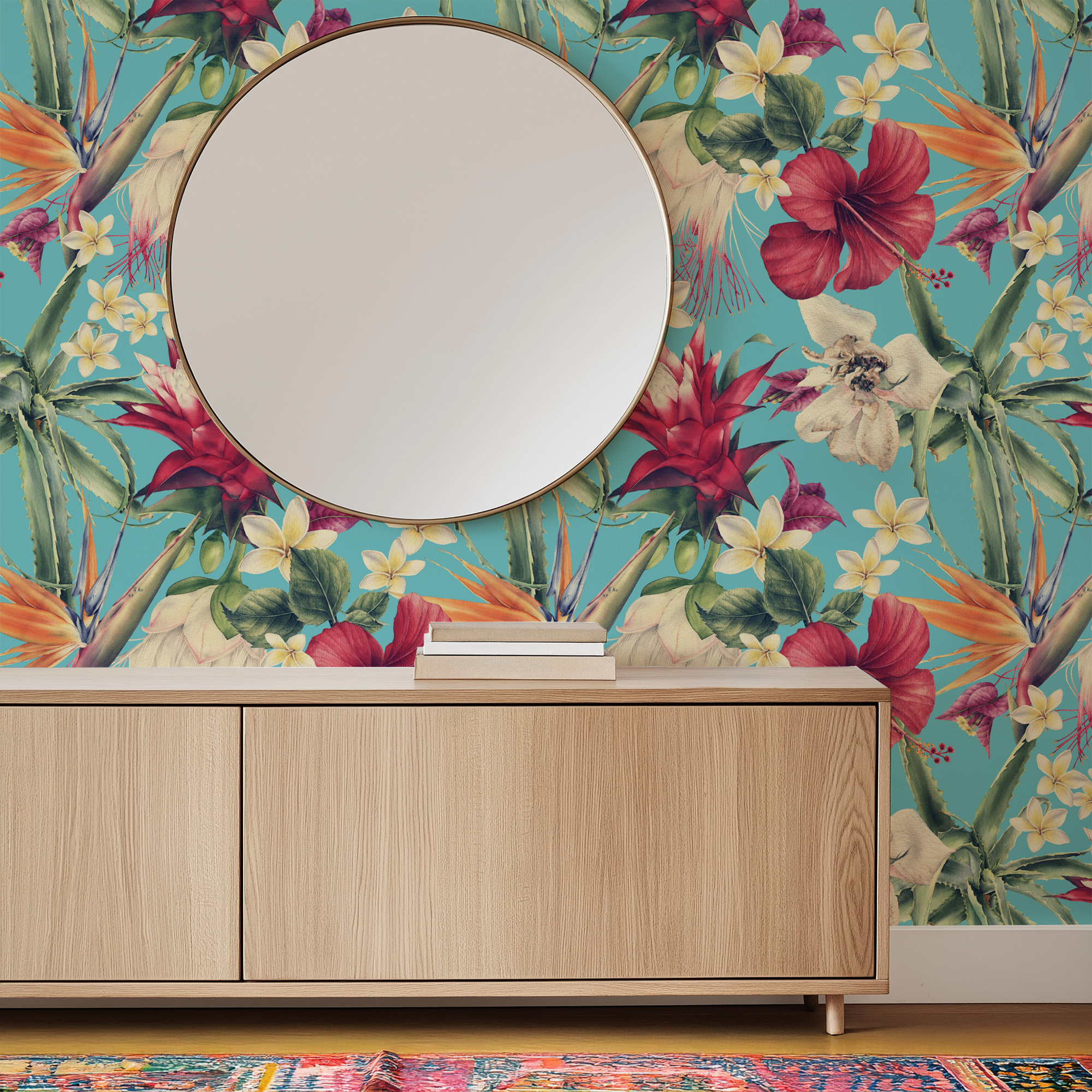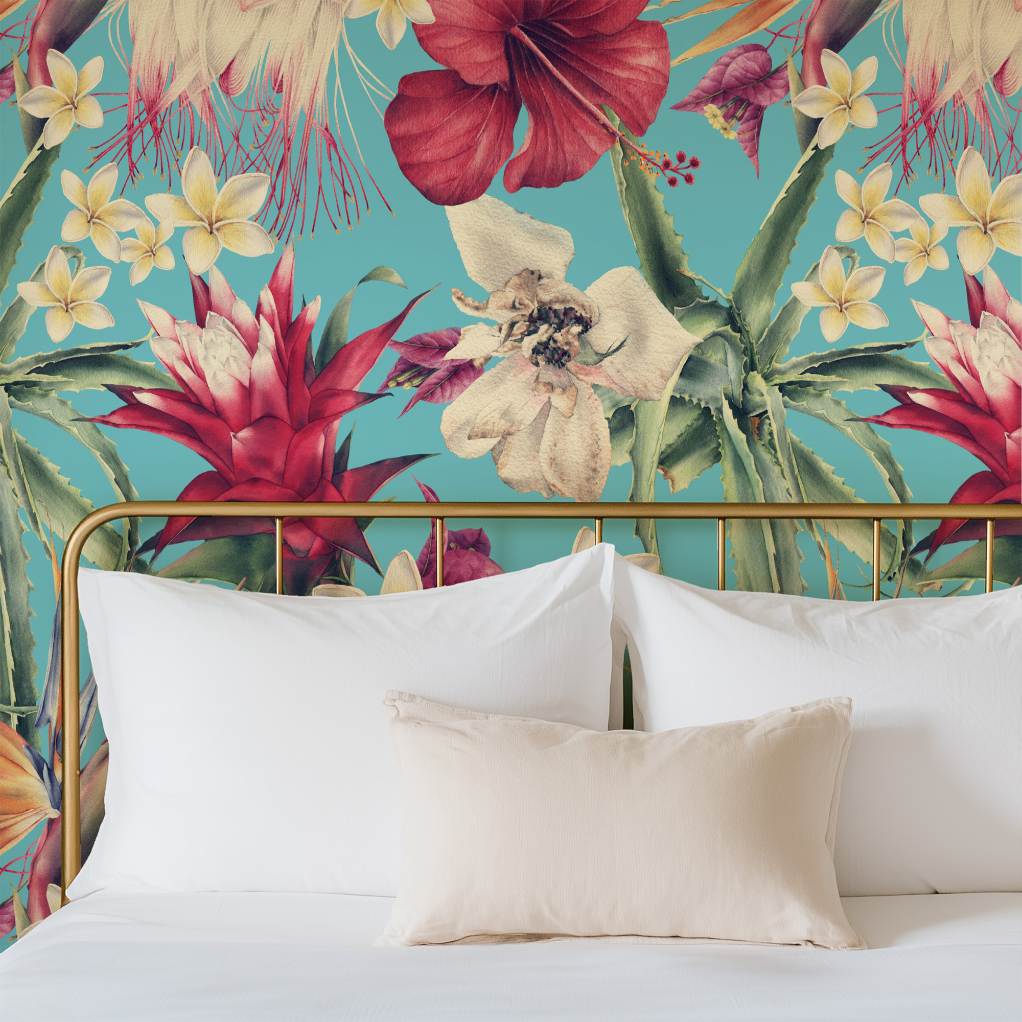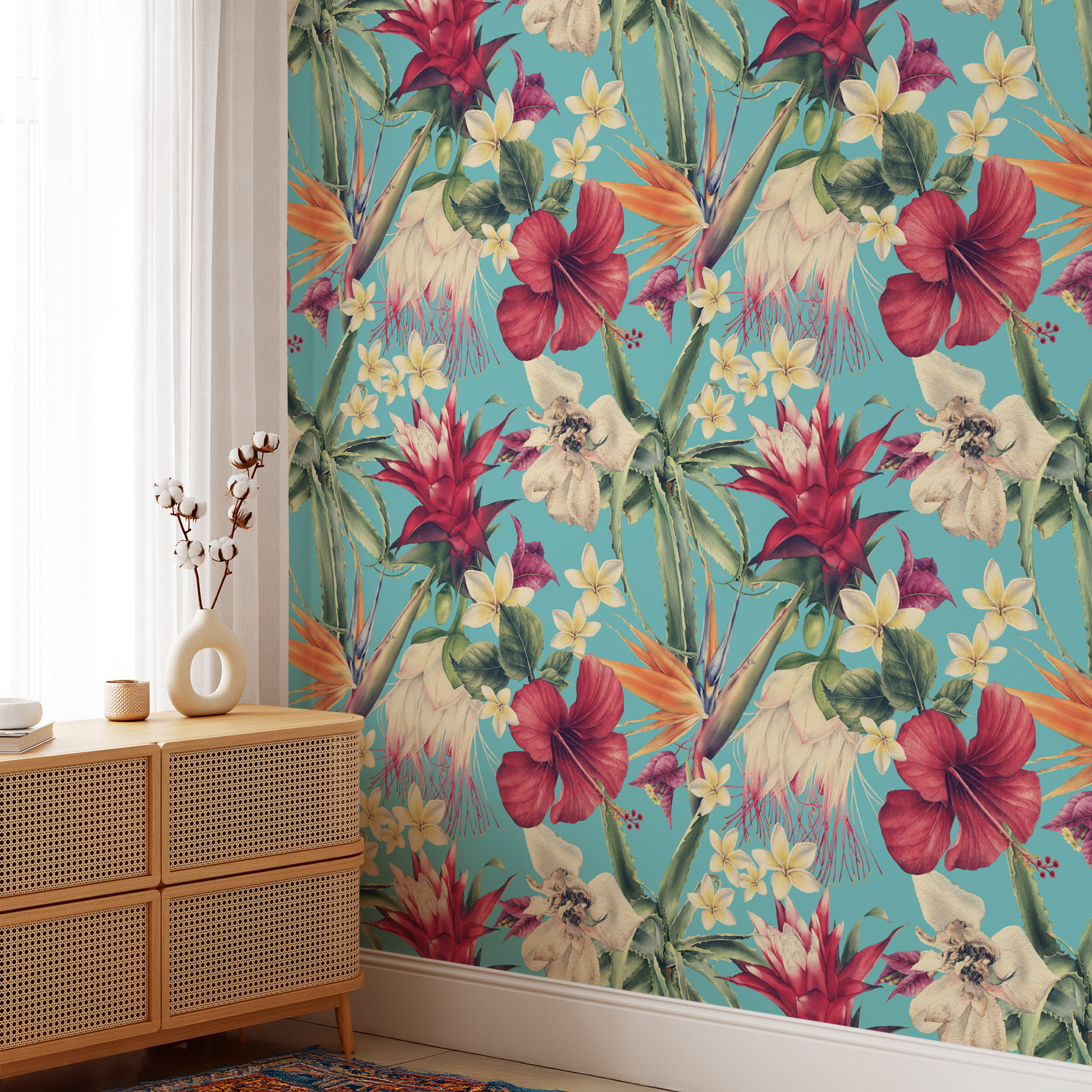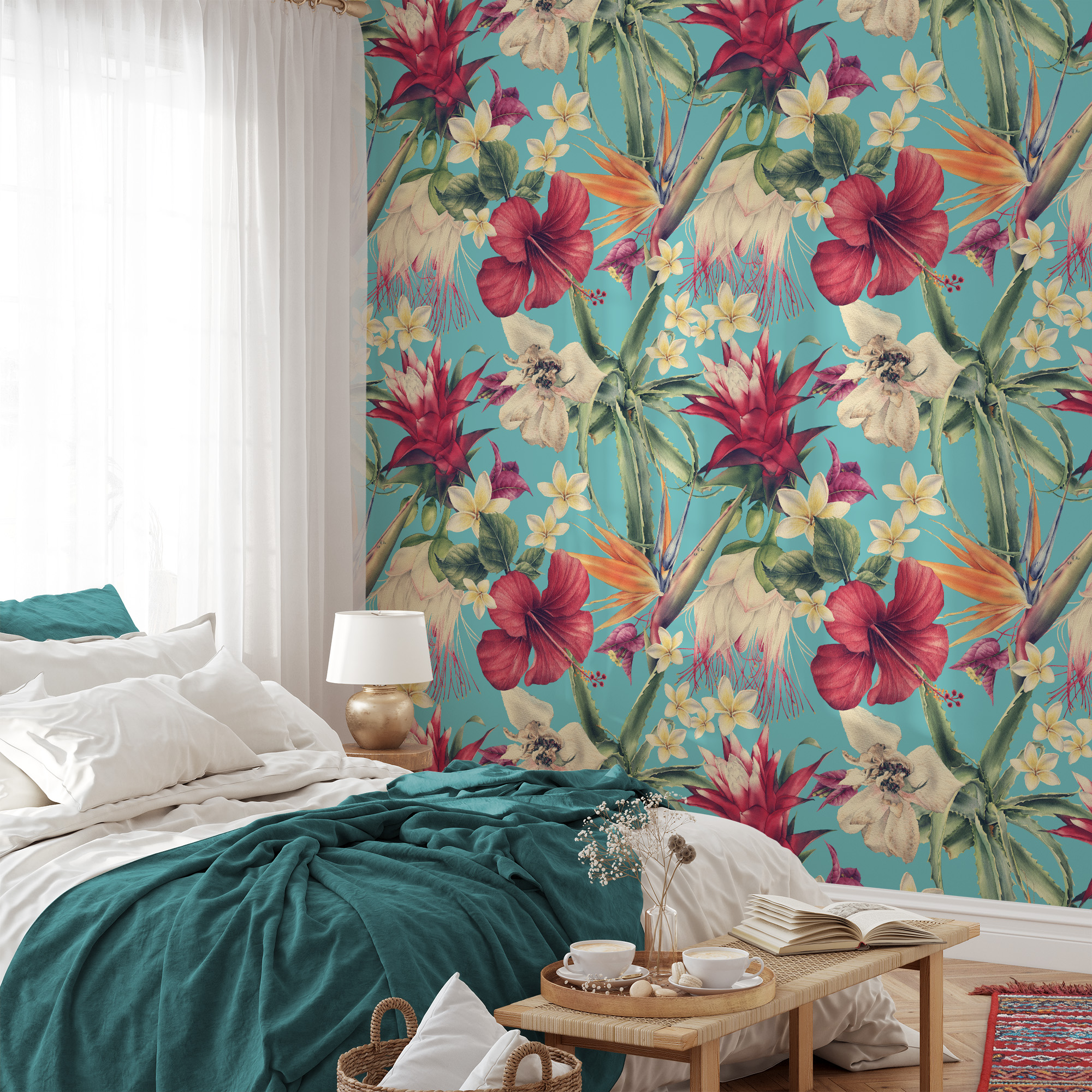 Bright Turquoise Tropical Hibiscus Wallpaper, Exotic Floral Wall Mural, Blue Teal Botanical Peel and Stick Wall Decor flrl-0002