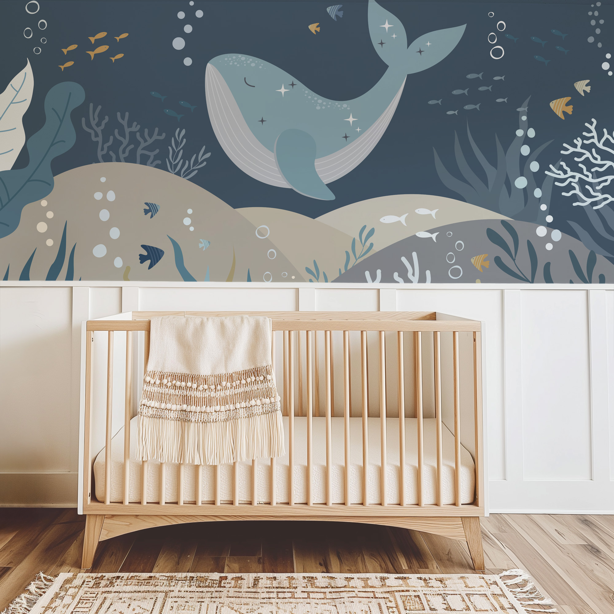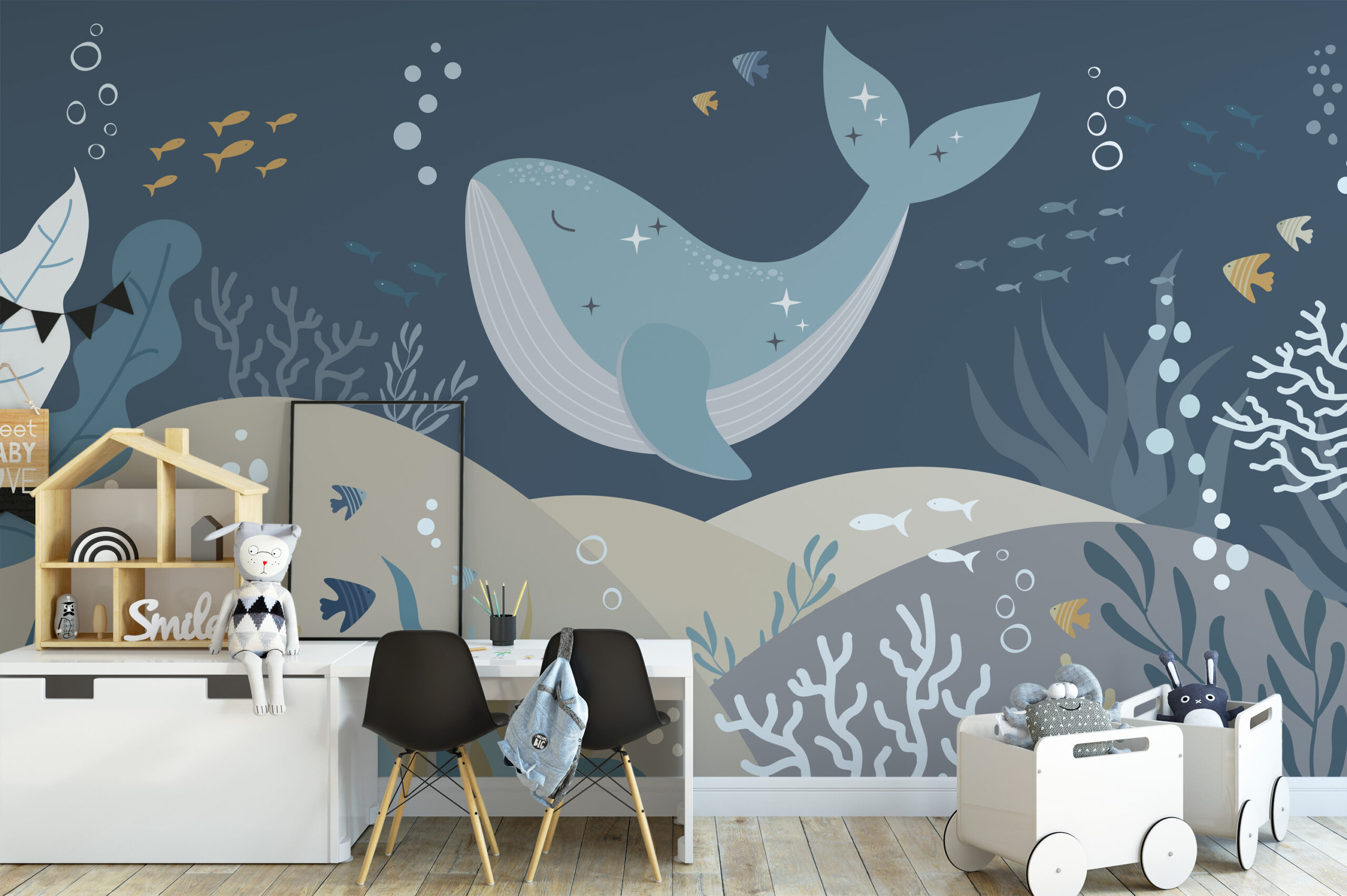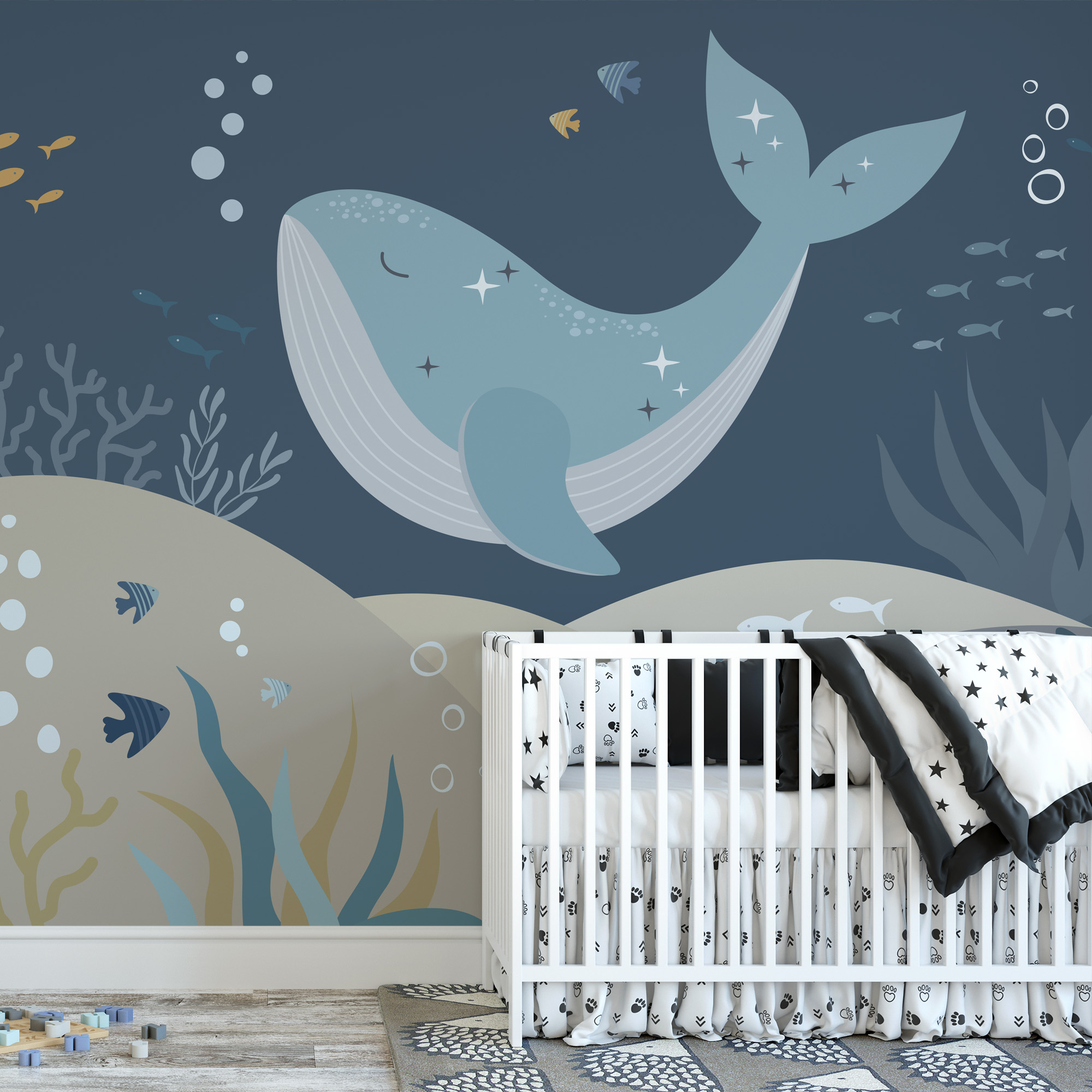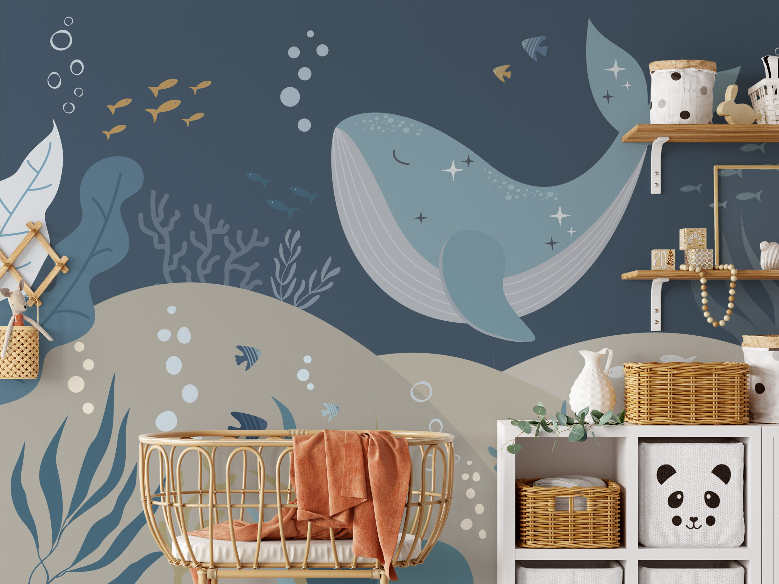 Deep Sea Majestic Whale and Underwater Stars Kids Peel and Stick Wallpaper, Navy Blue Nursery Wall Mural kids-0039