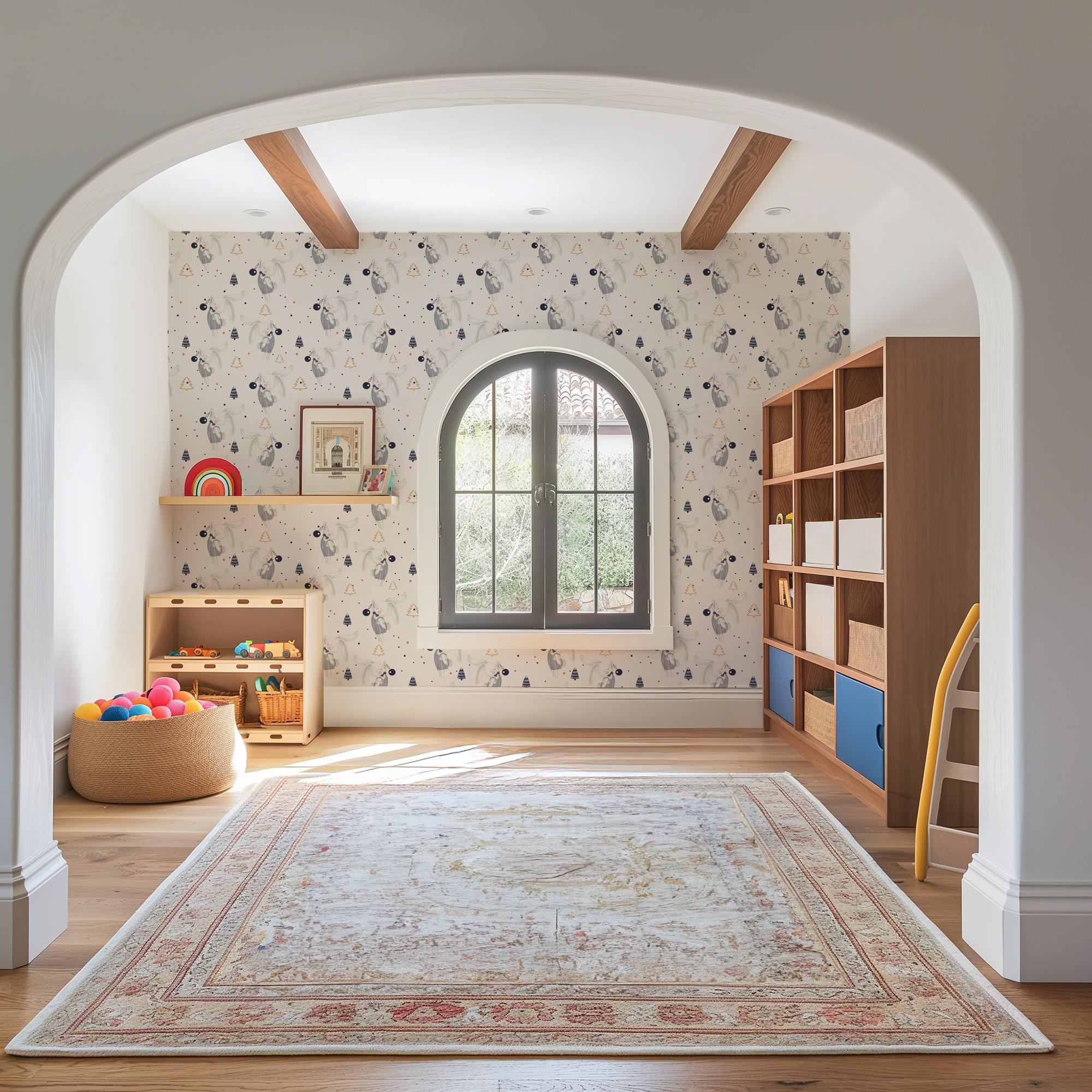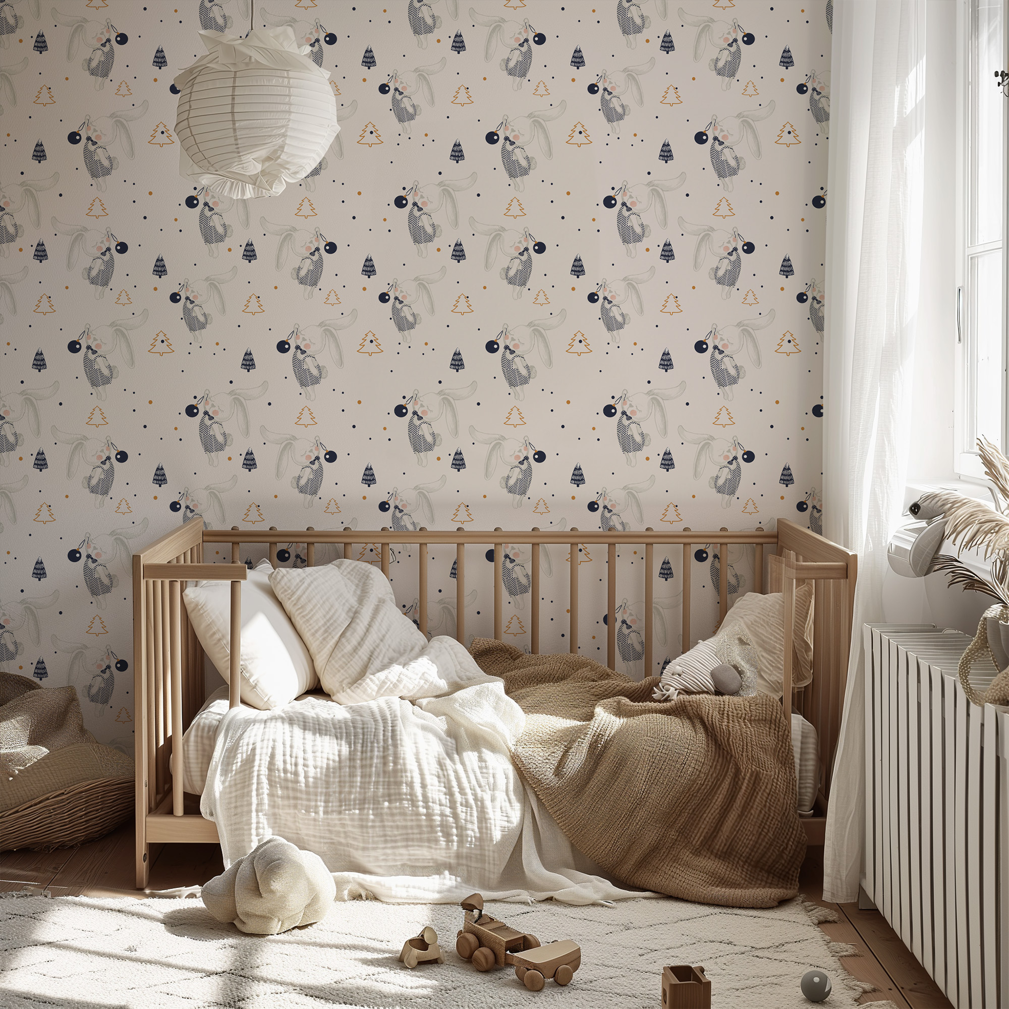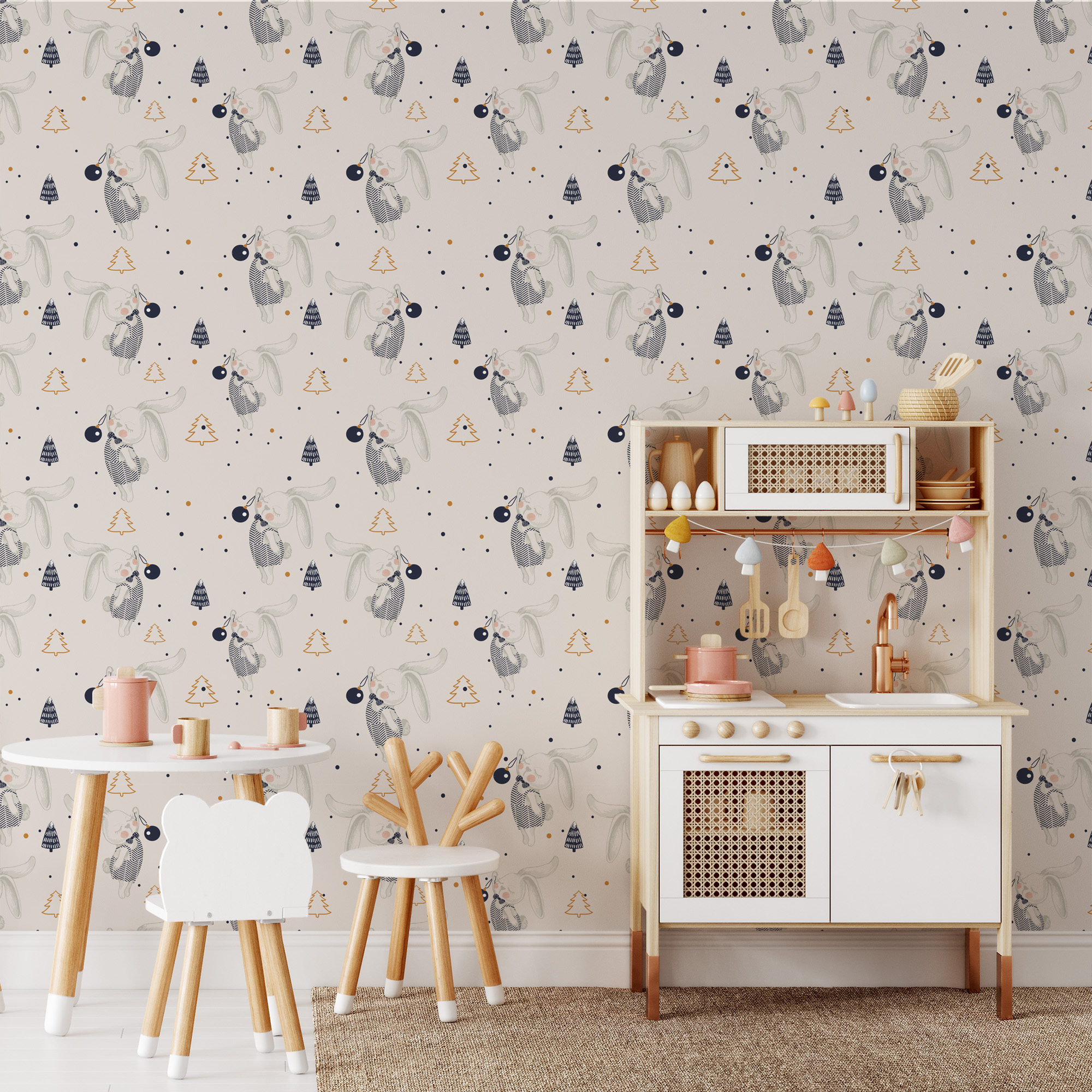 Dreamy Sleeping Bunny and Pine Tree Kids Peel and Stick Wallpaper, Neutral Scandi Nursery Wall Mural kids-0061