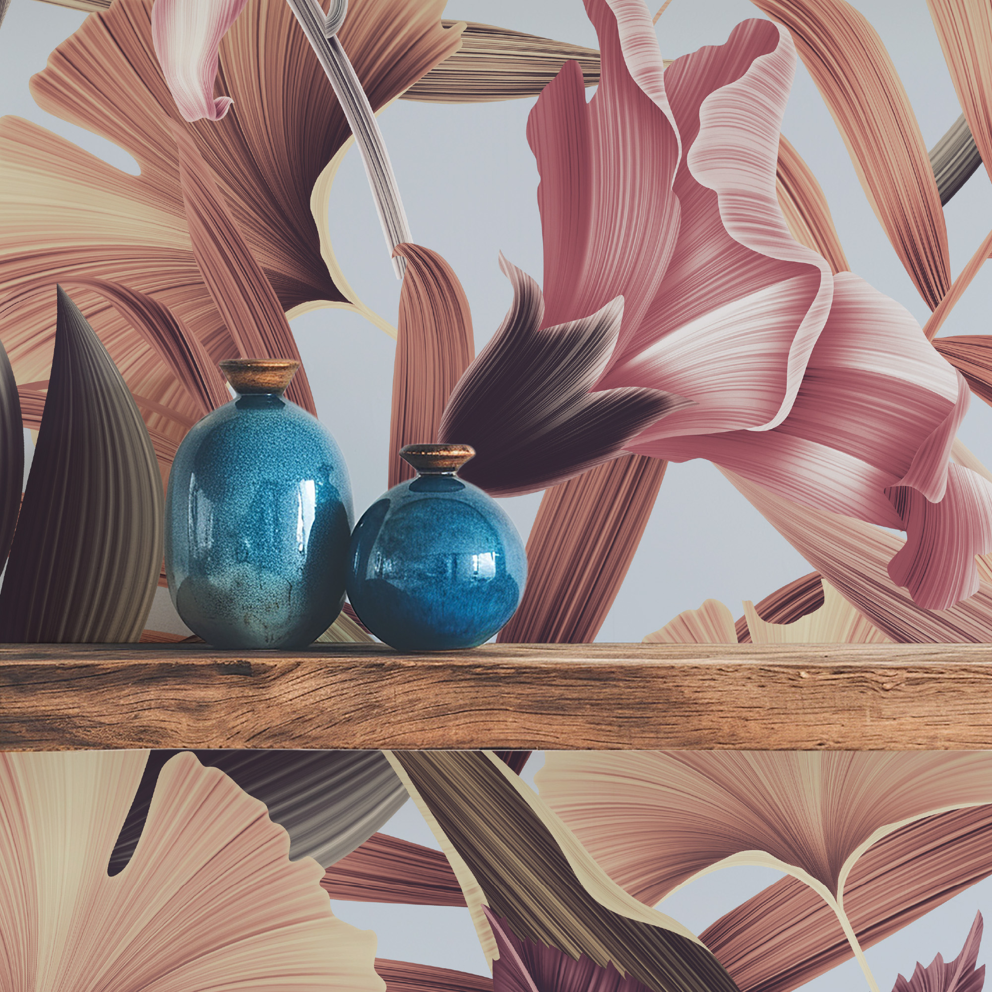 Earthy Mauve and Dusty Pink Tropical Botanical Peel and Stick Wallpaper, Large Ginkgo and Lily Wall Mural, Modern Organic Bedroom Decor flrl-0070