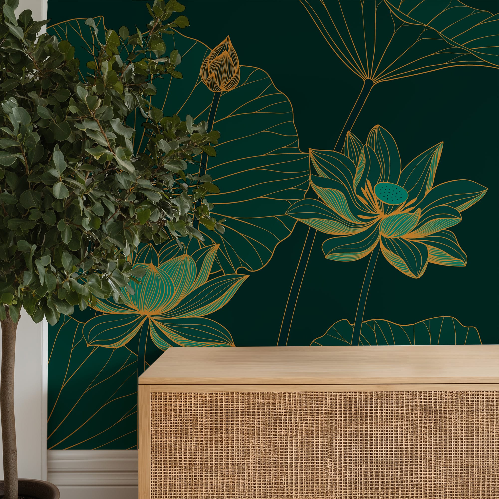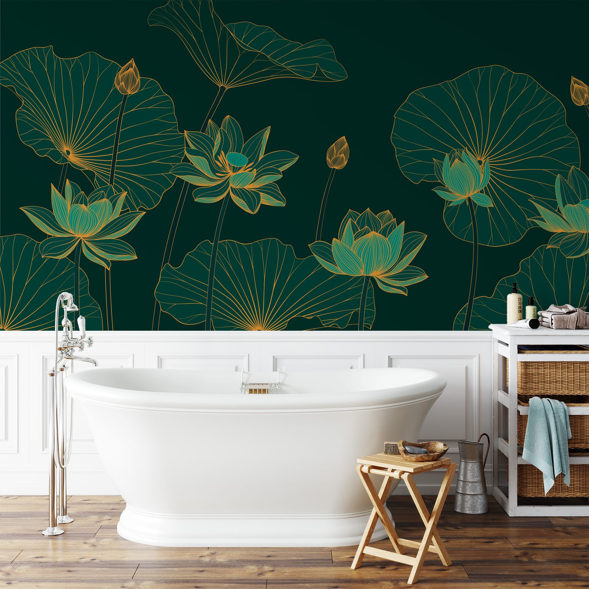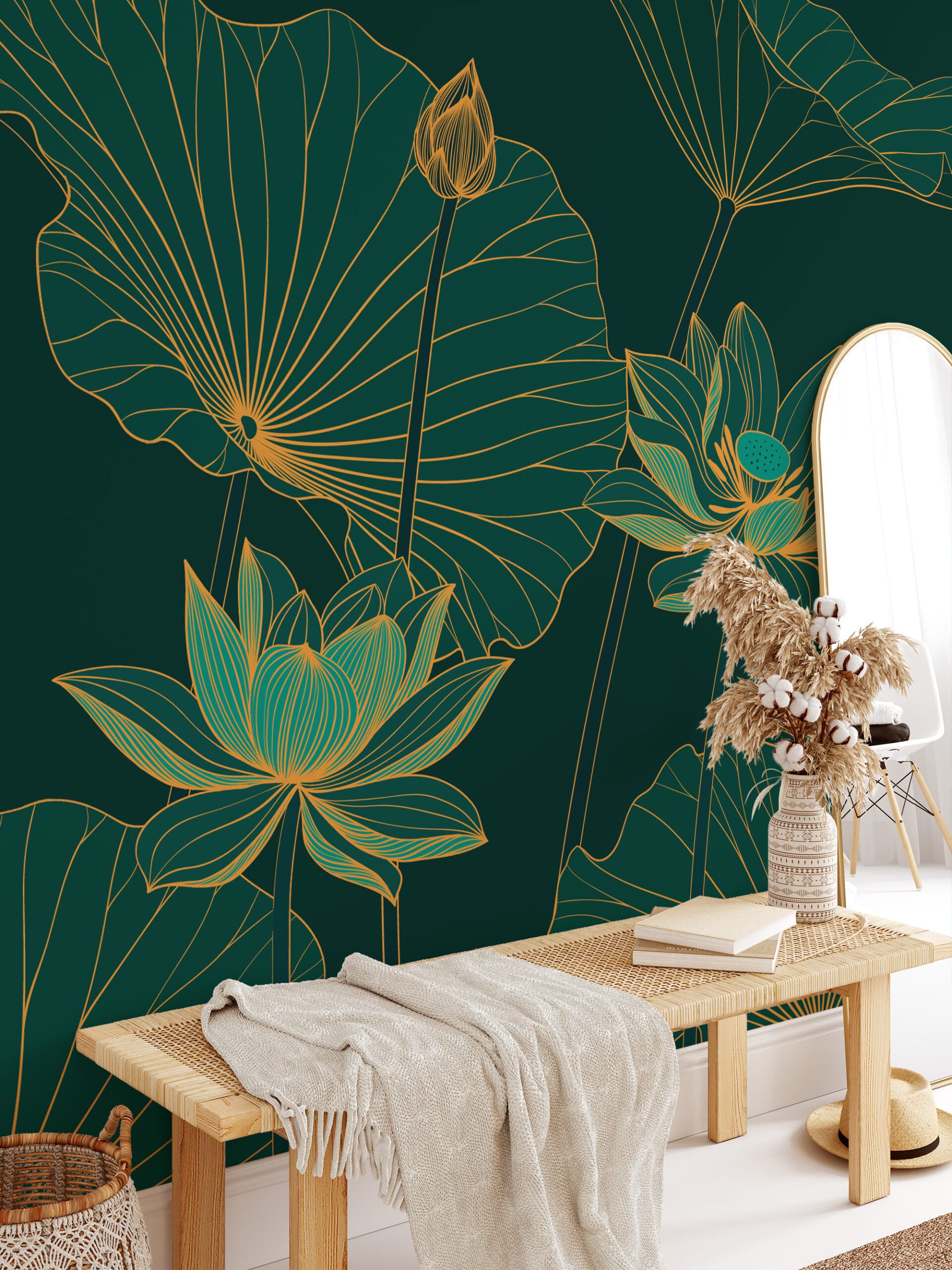 Emerald Green and Gold Lotus Wallpaper for Bathroom, Luxury Zen Water Lily Mural, Waterproof Peel and Stick Spa Wall Decor flrl-0035