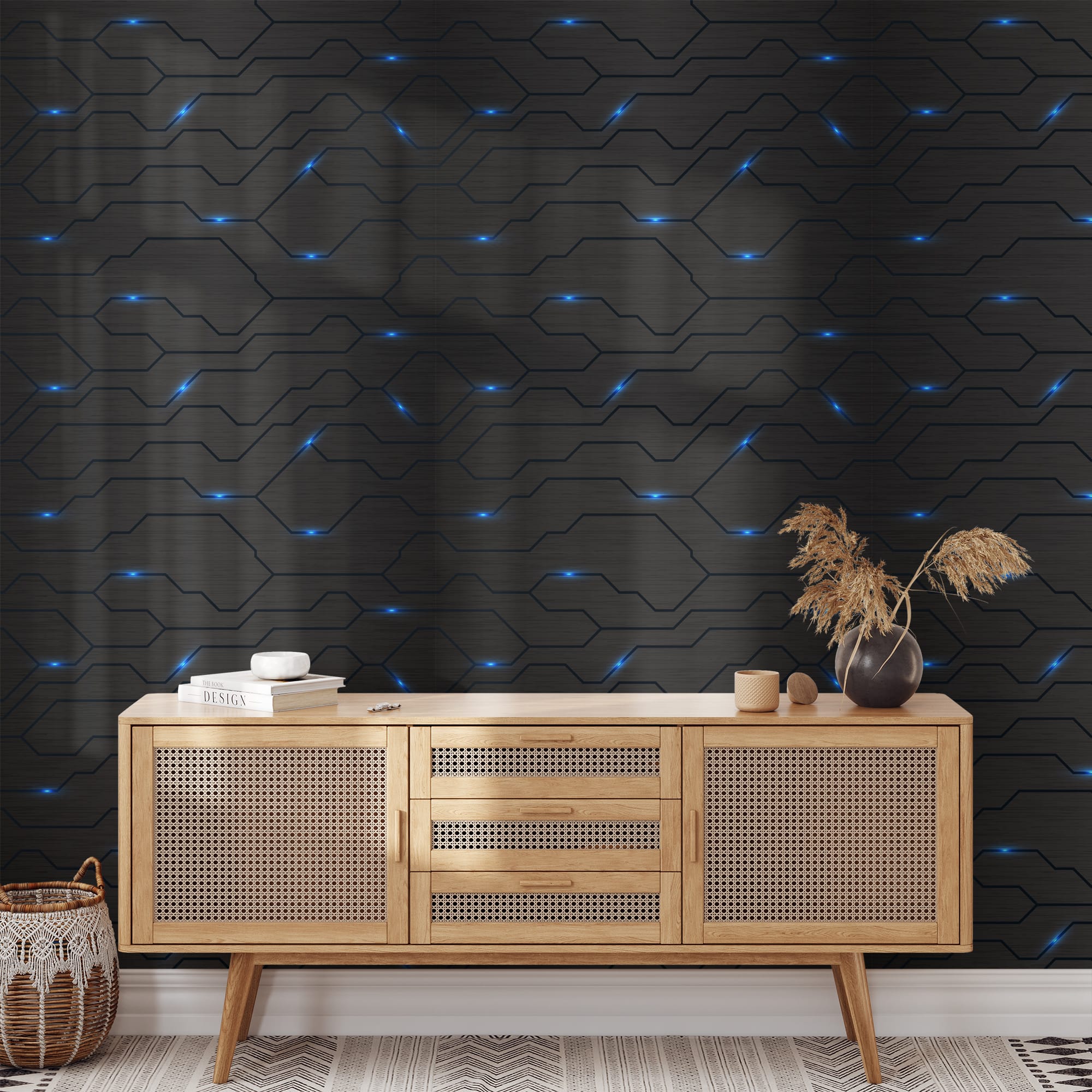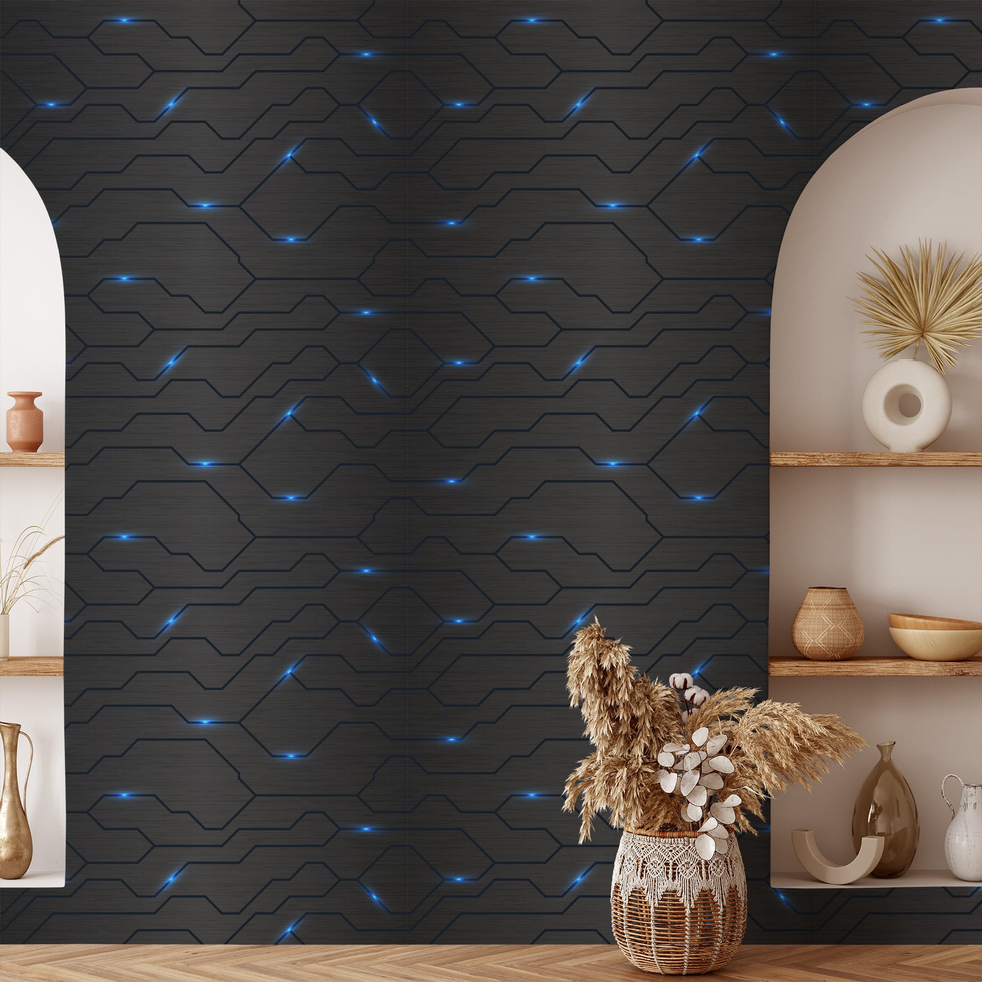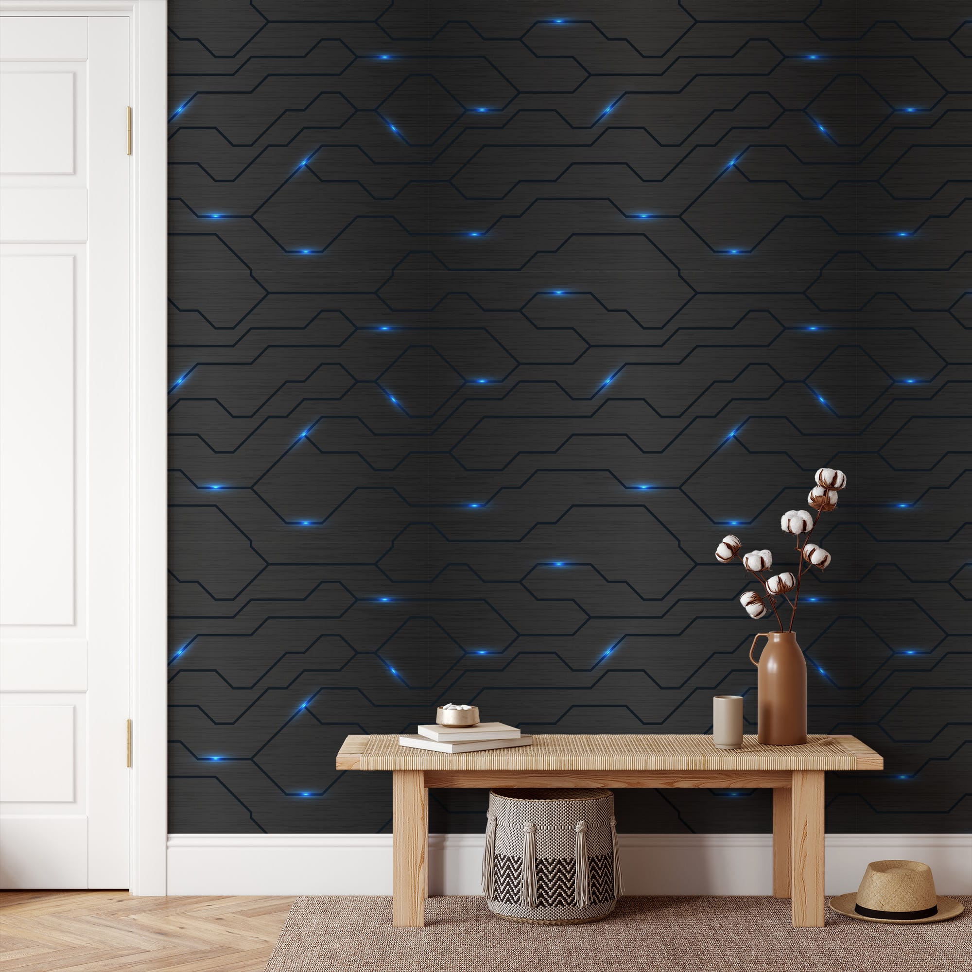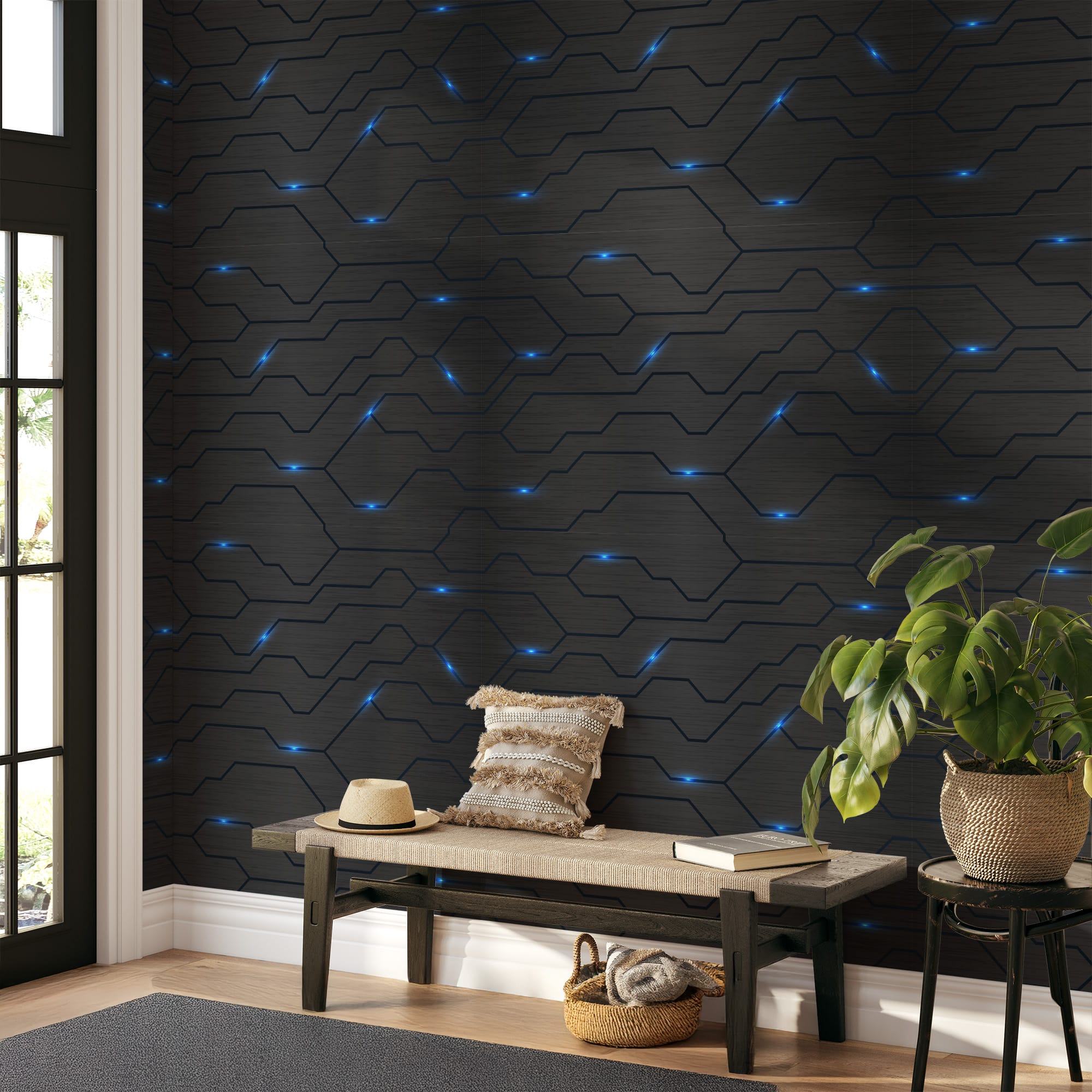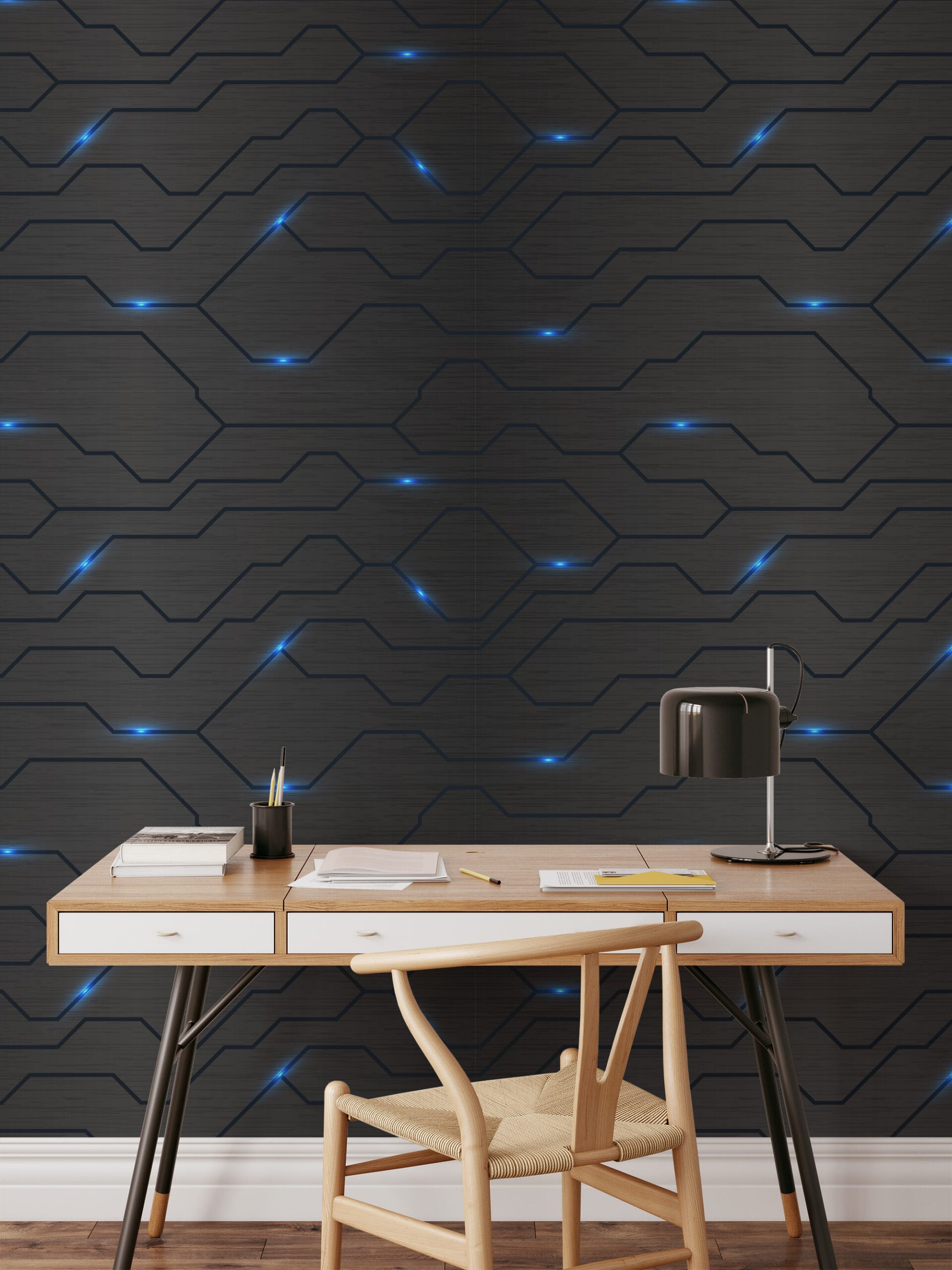 Futuristic Dark Grey Circuit Board Peel and Stick Wallpaper, Glowing Blue Tech Line Wall Mural, Cyberpunk Gaming Room Self Adhesive Wallpaper abst-0026