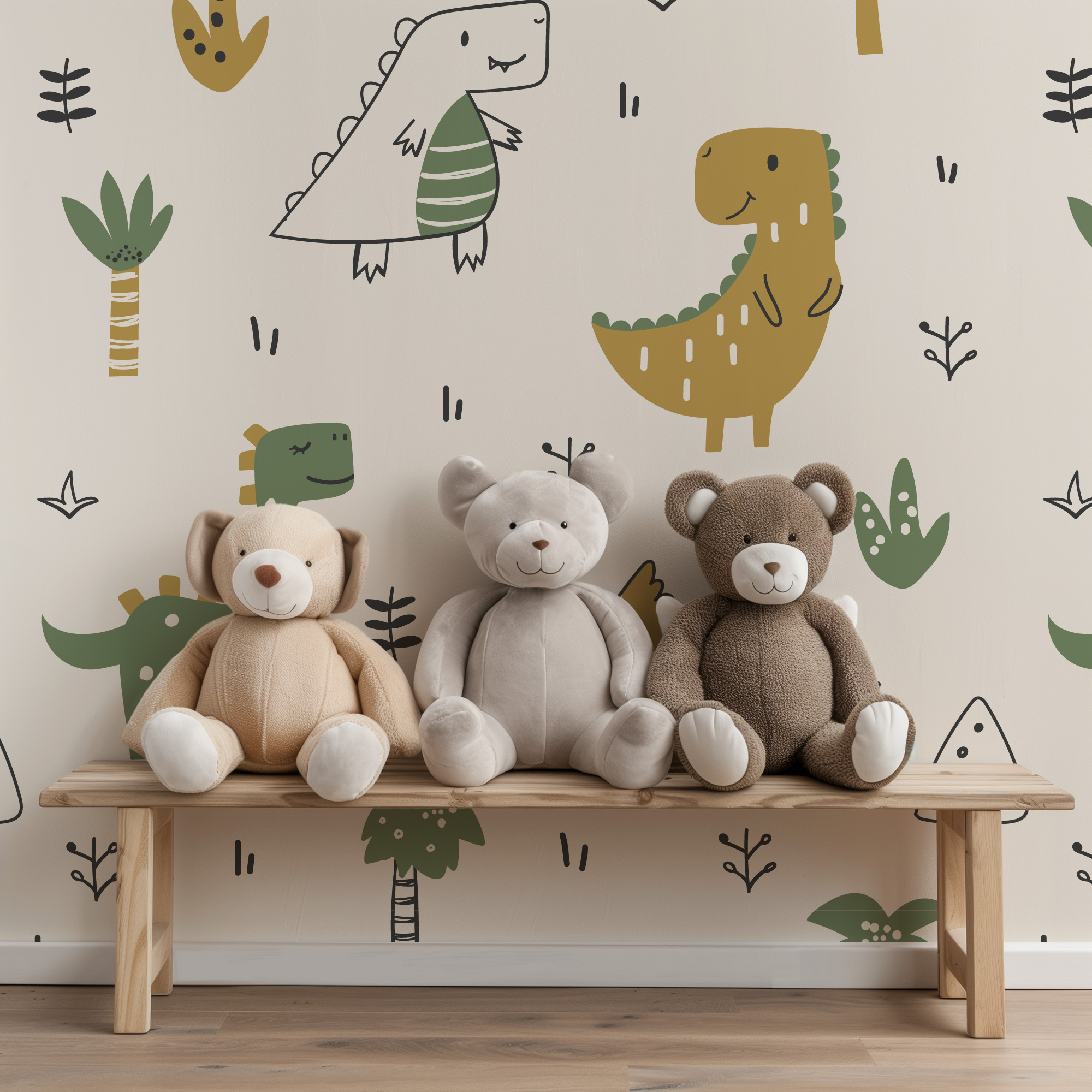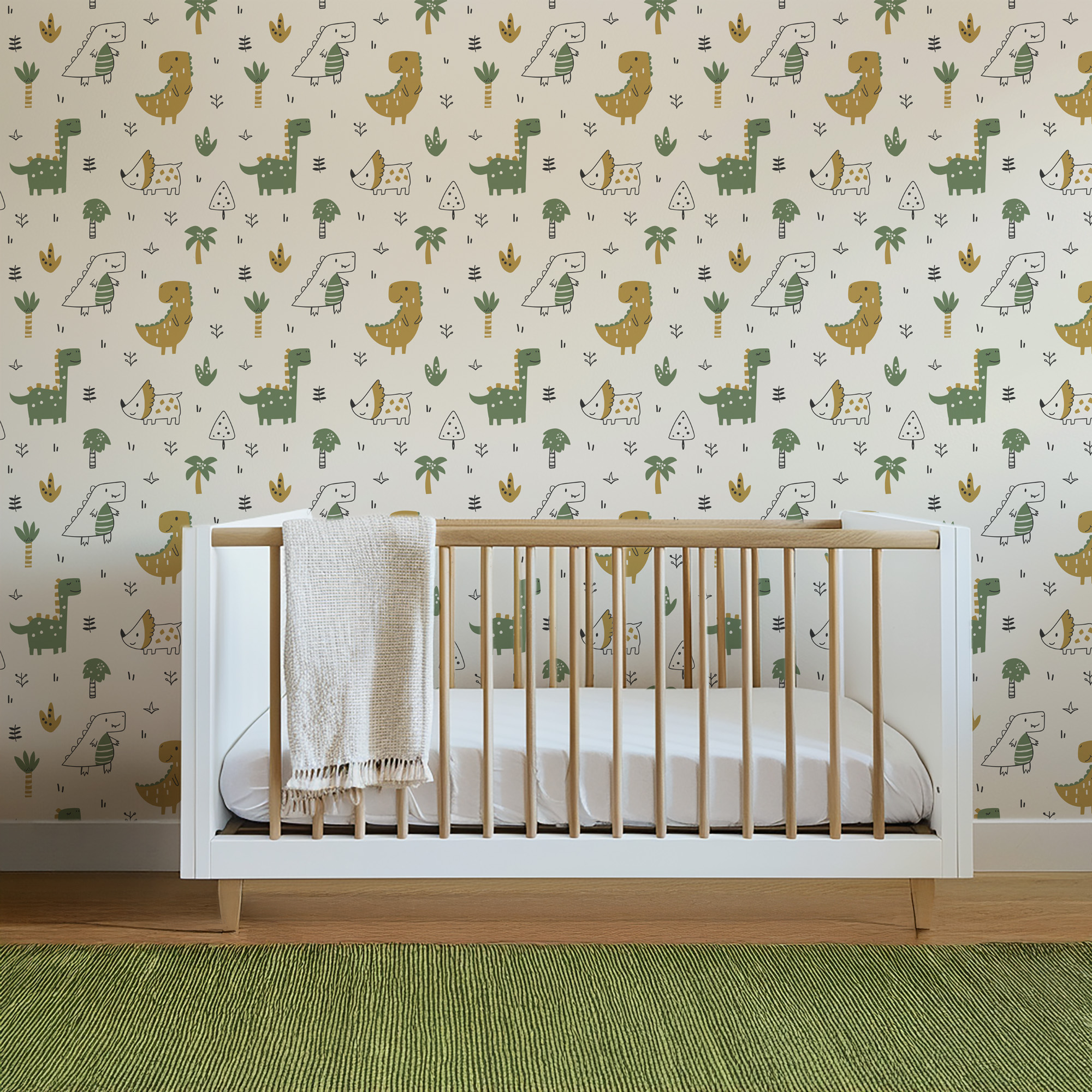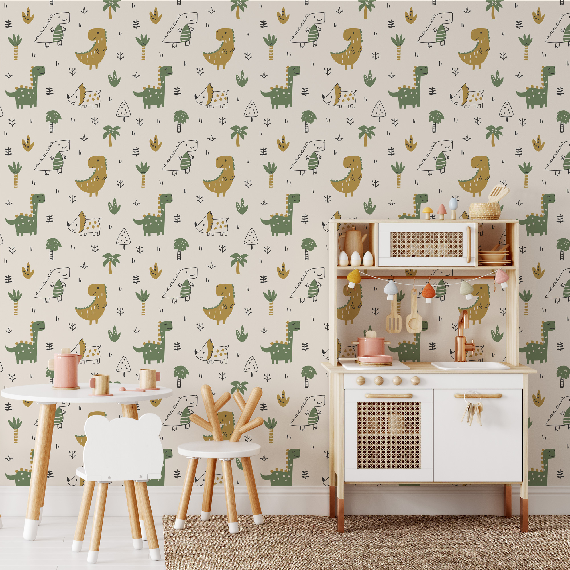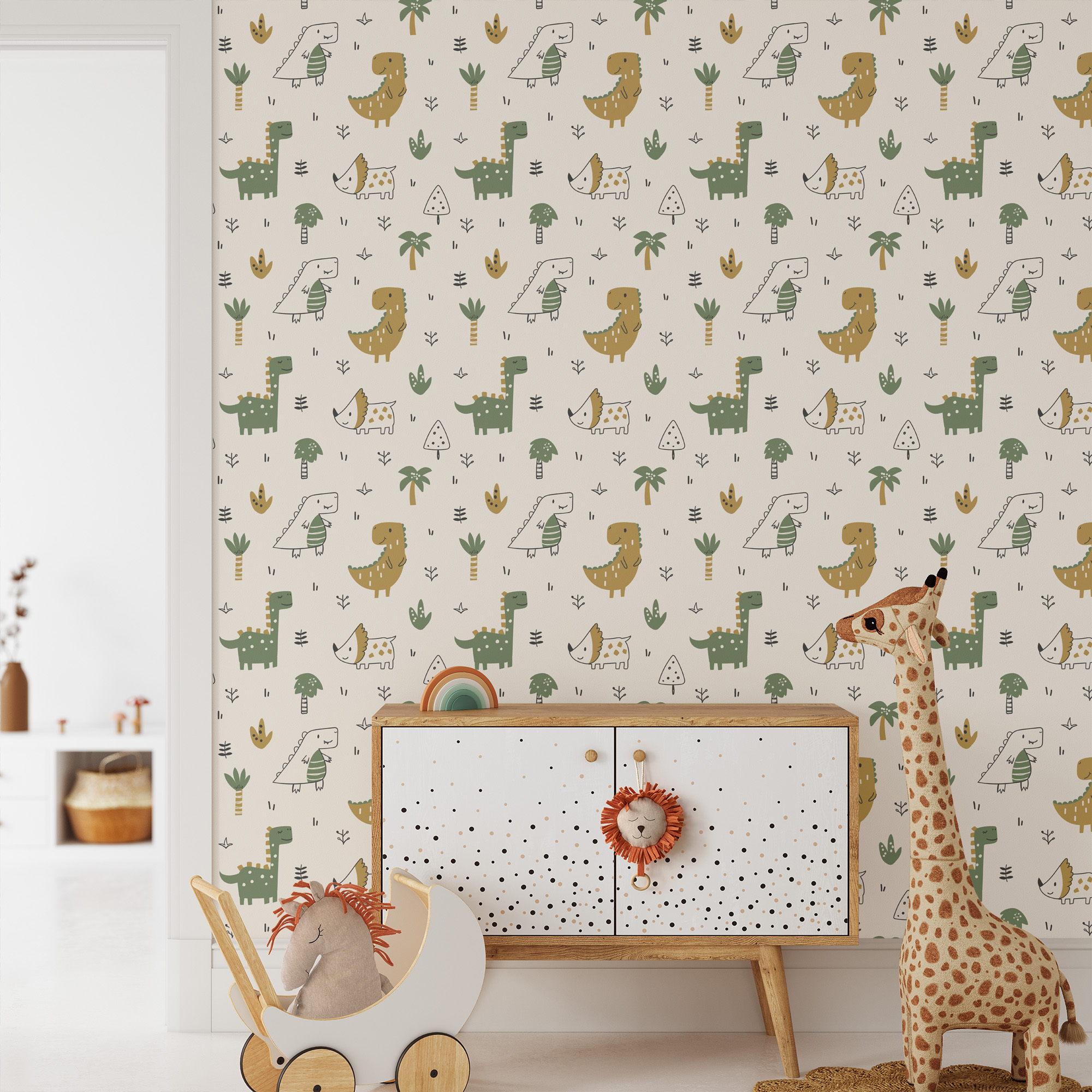 Green and Mustard Dinosaur Nursery Peel and Stick Wallpaper, Prehistoric Scandi Kids Wall Mural, Neutral Dino Decor kids-0033