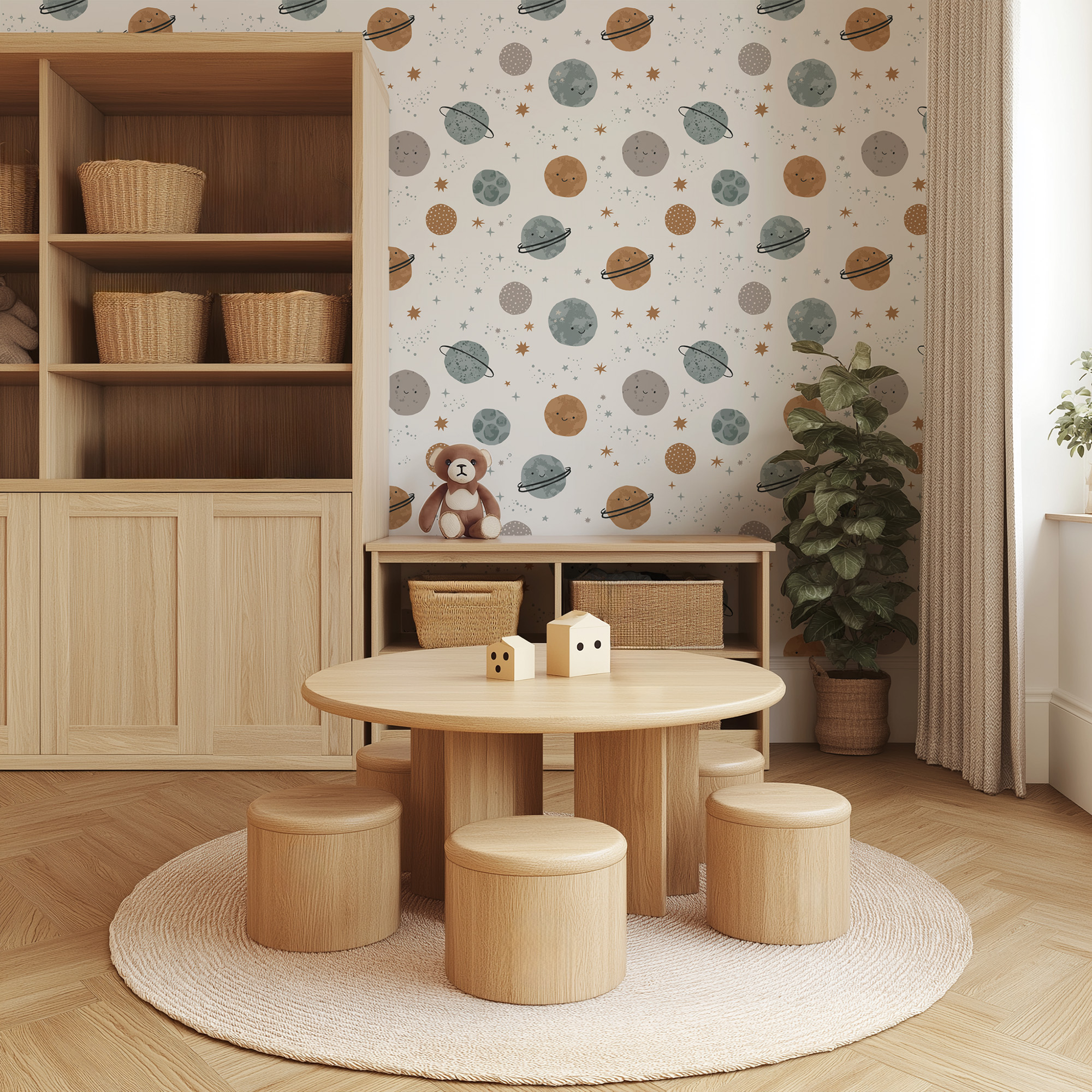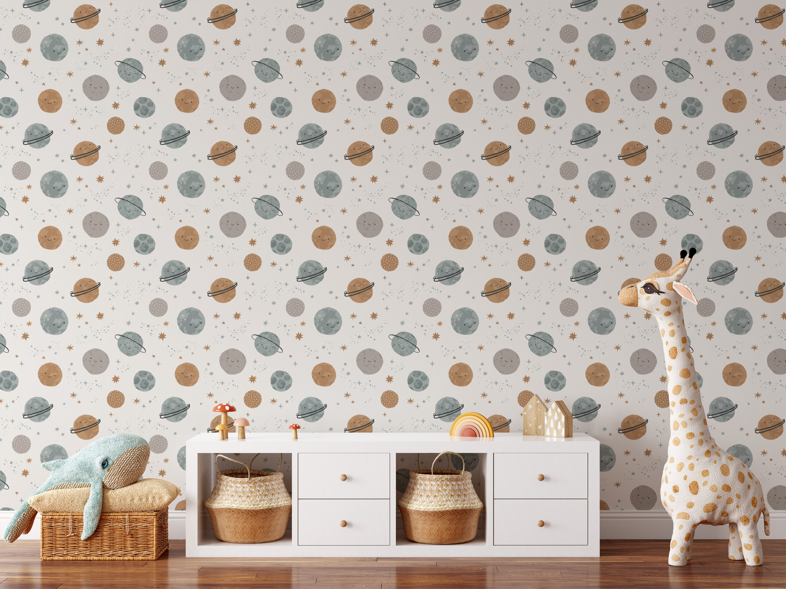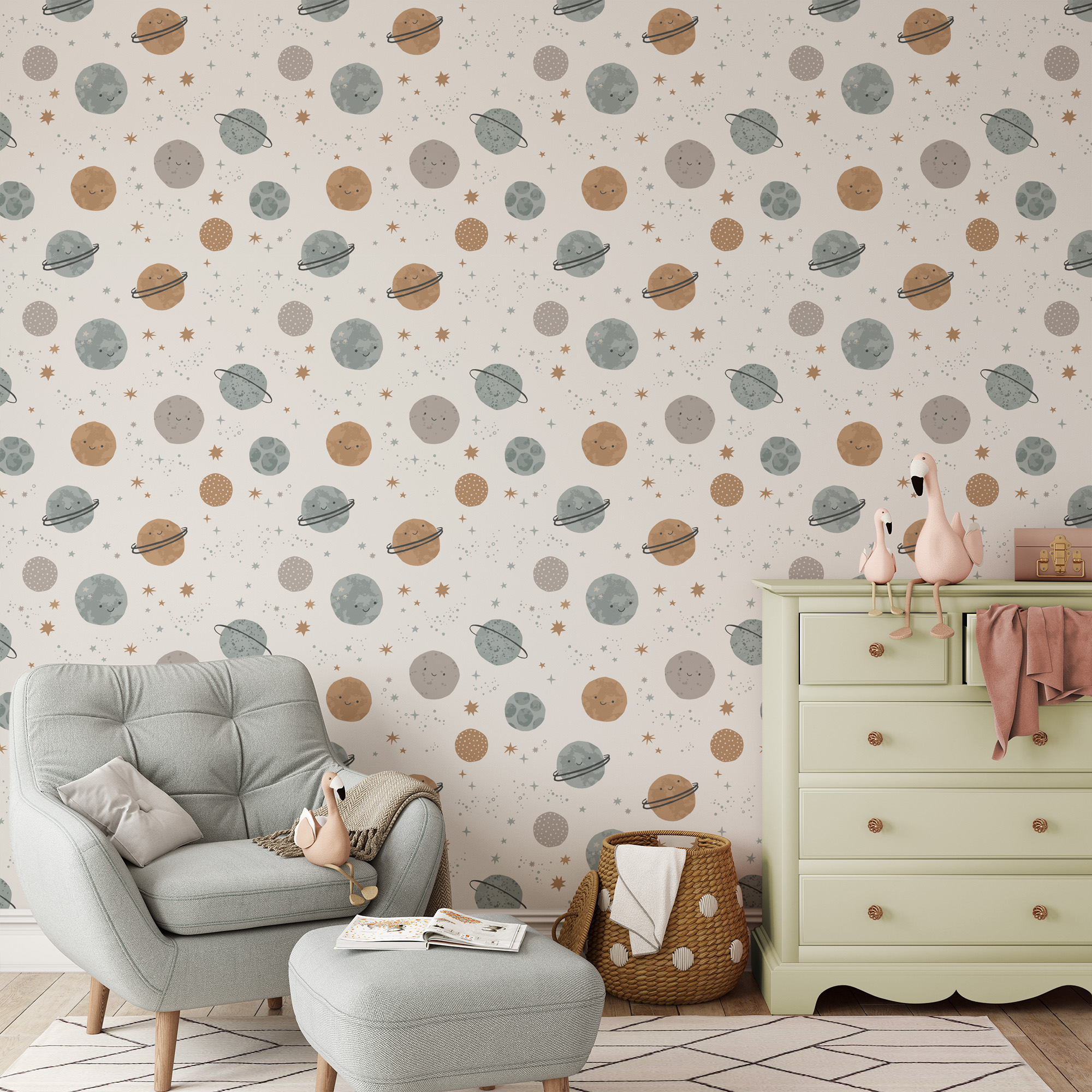 Happy Smiling Planets and Galaxy Kids Peel and Stick Wallpaper, Neutral Scandi Space Nursery Wall Mural kids-0041