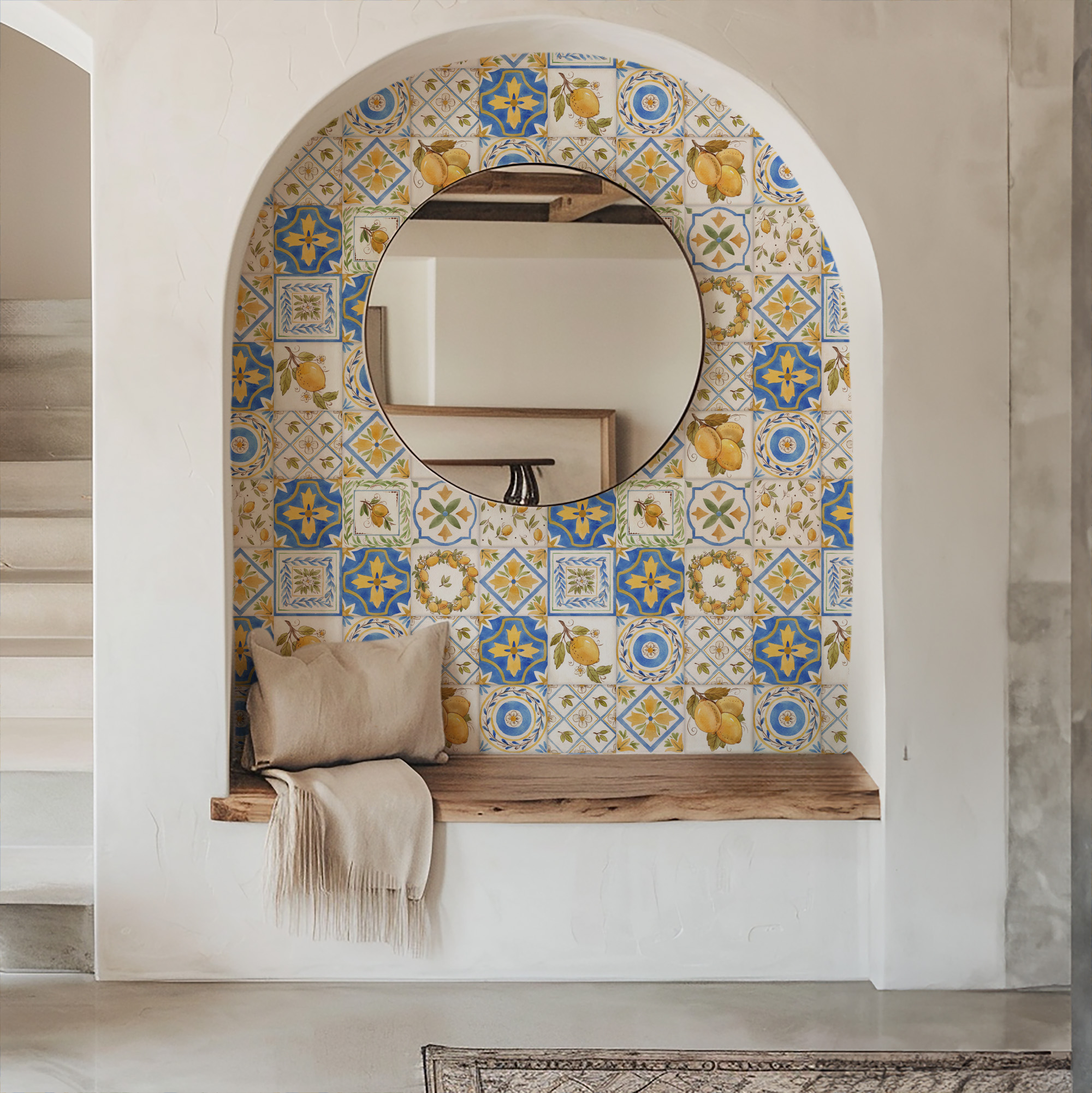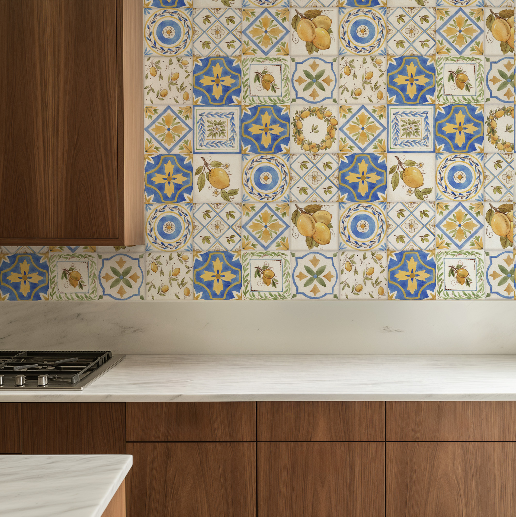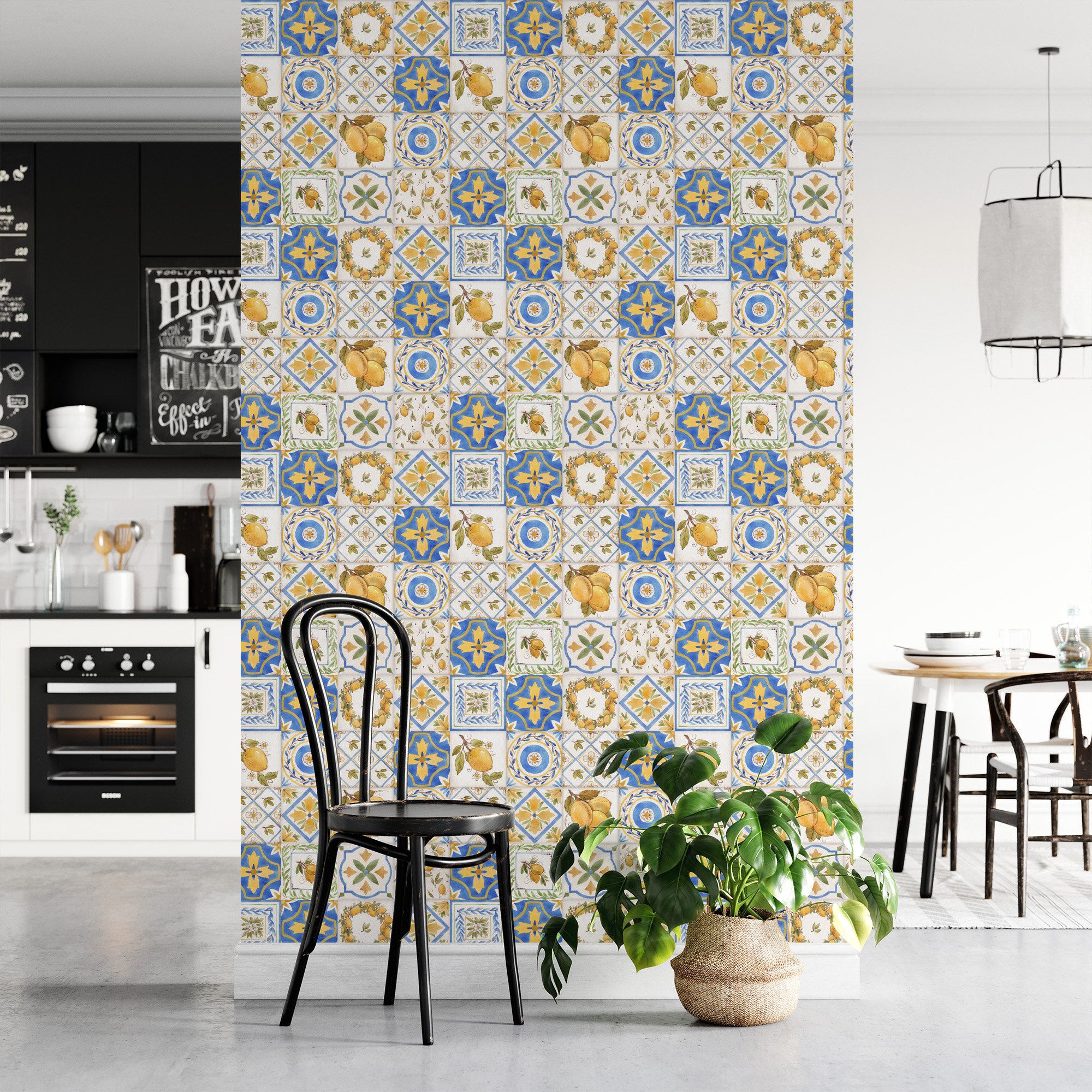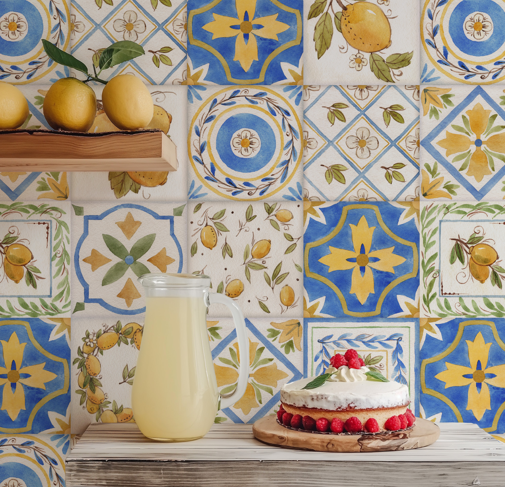 Mediterranean Blue and Yellow Tile Peel and Stick Wallpaper, Italian Majolica Lemon Pattern Wall Mural, Rustic Kitchen Backsplash Decor food-0001
