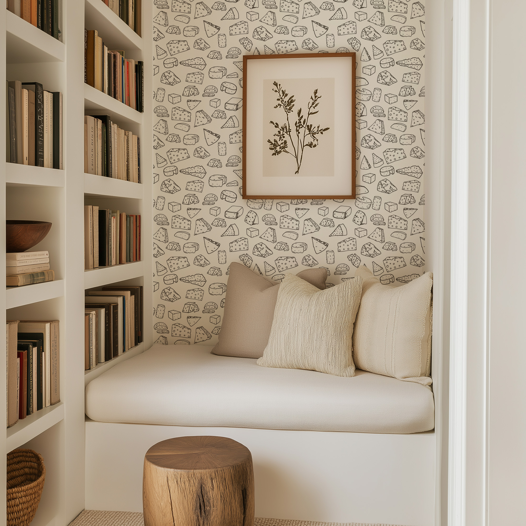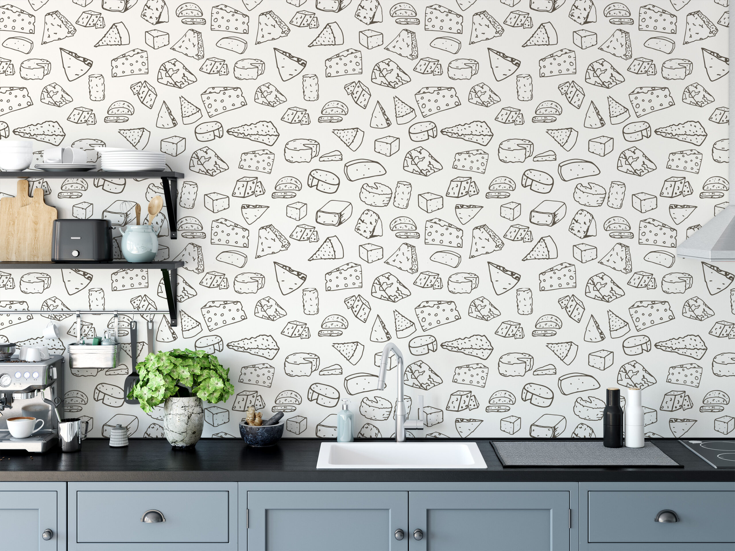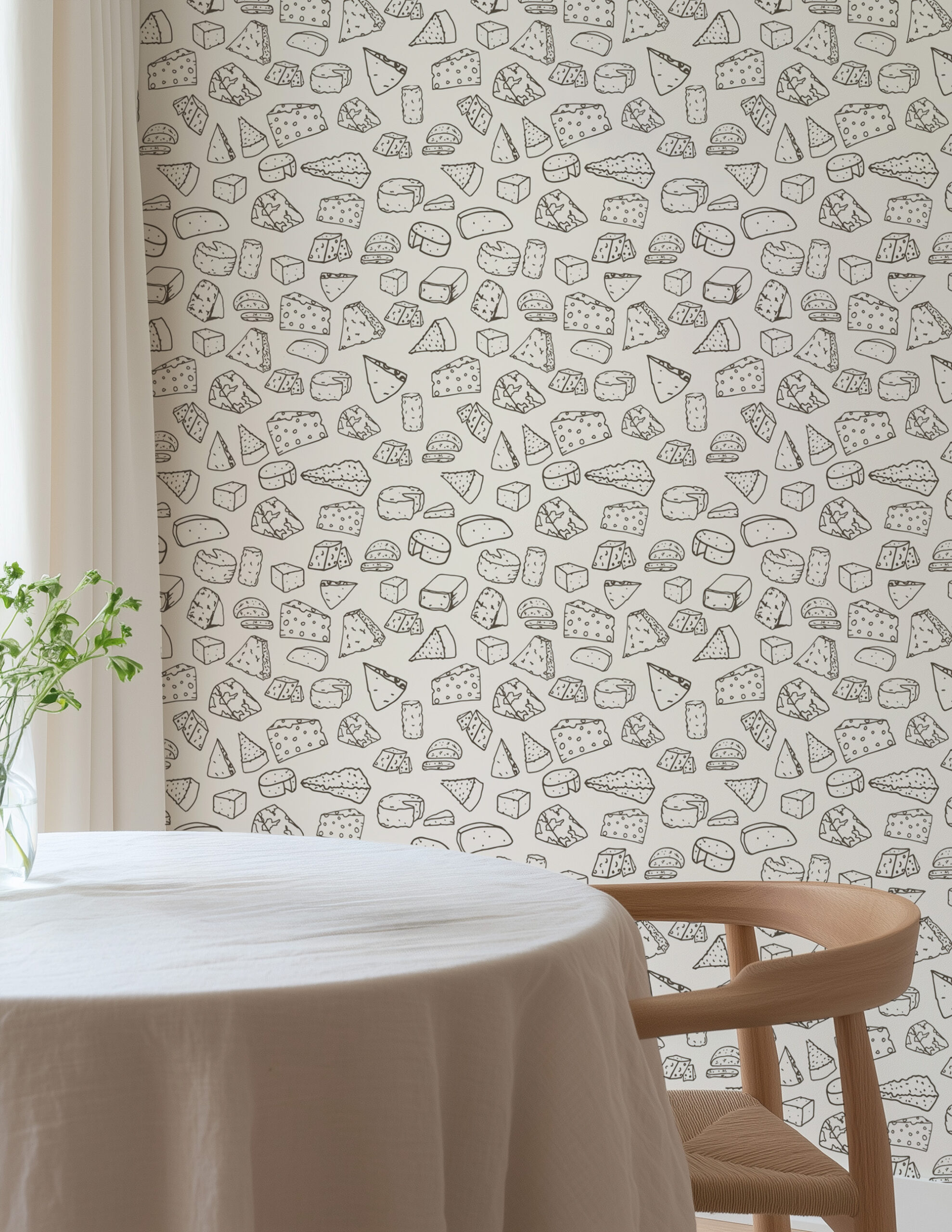 Minimalist Cheese Sketch Peel and Stick Wallpaper, Black and White Kitchen Wall Mural, Modern Food Line Art Decor food-0009