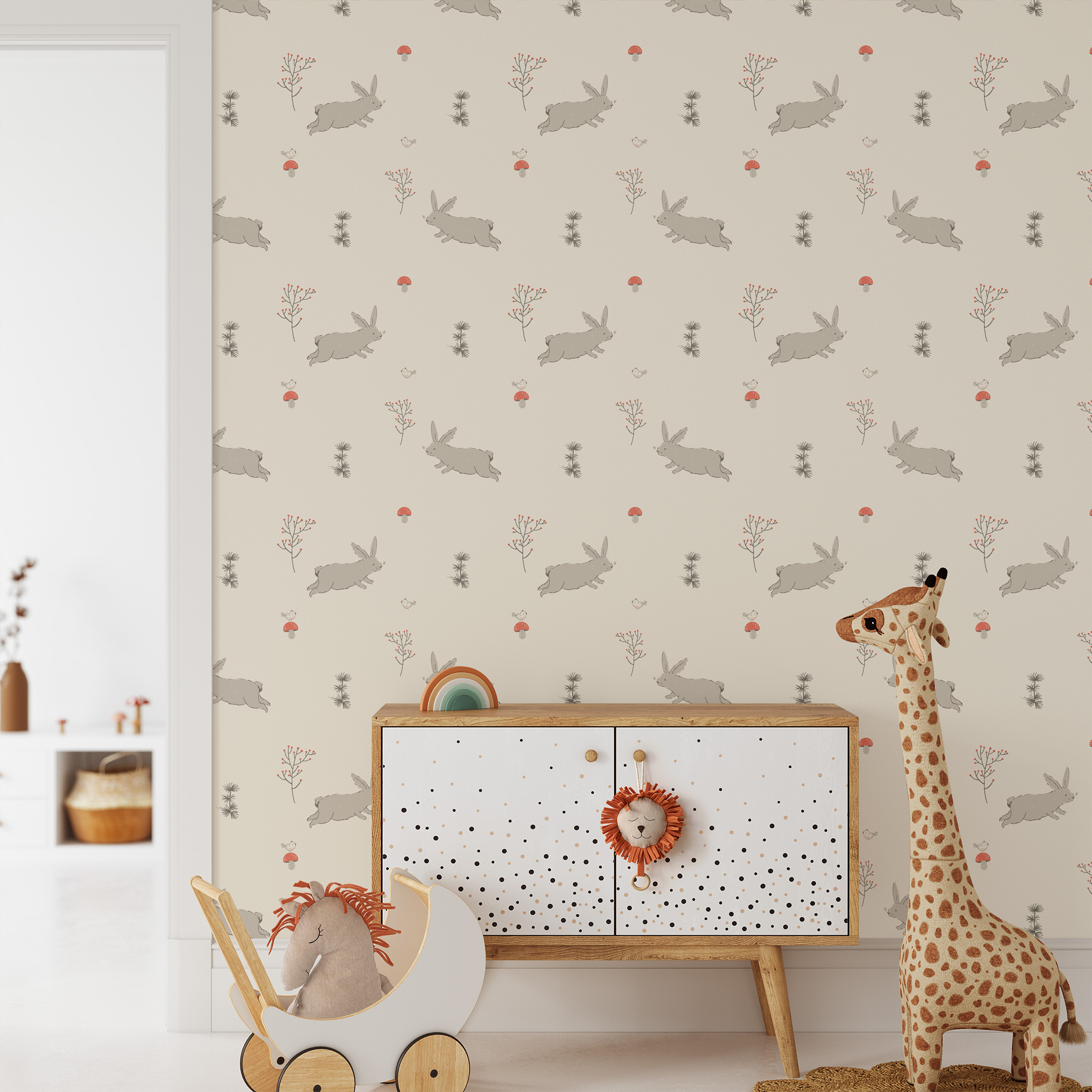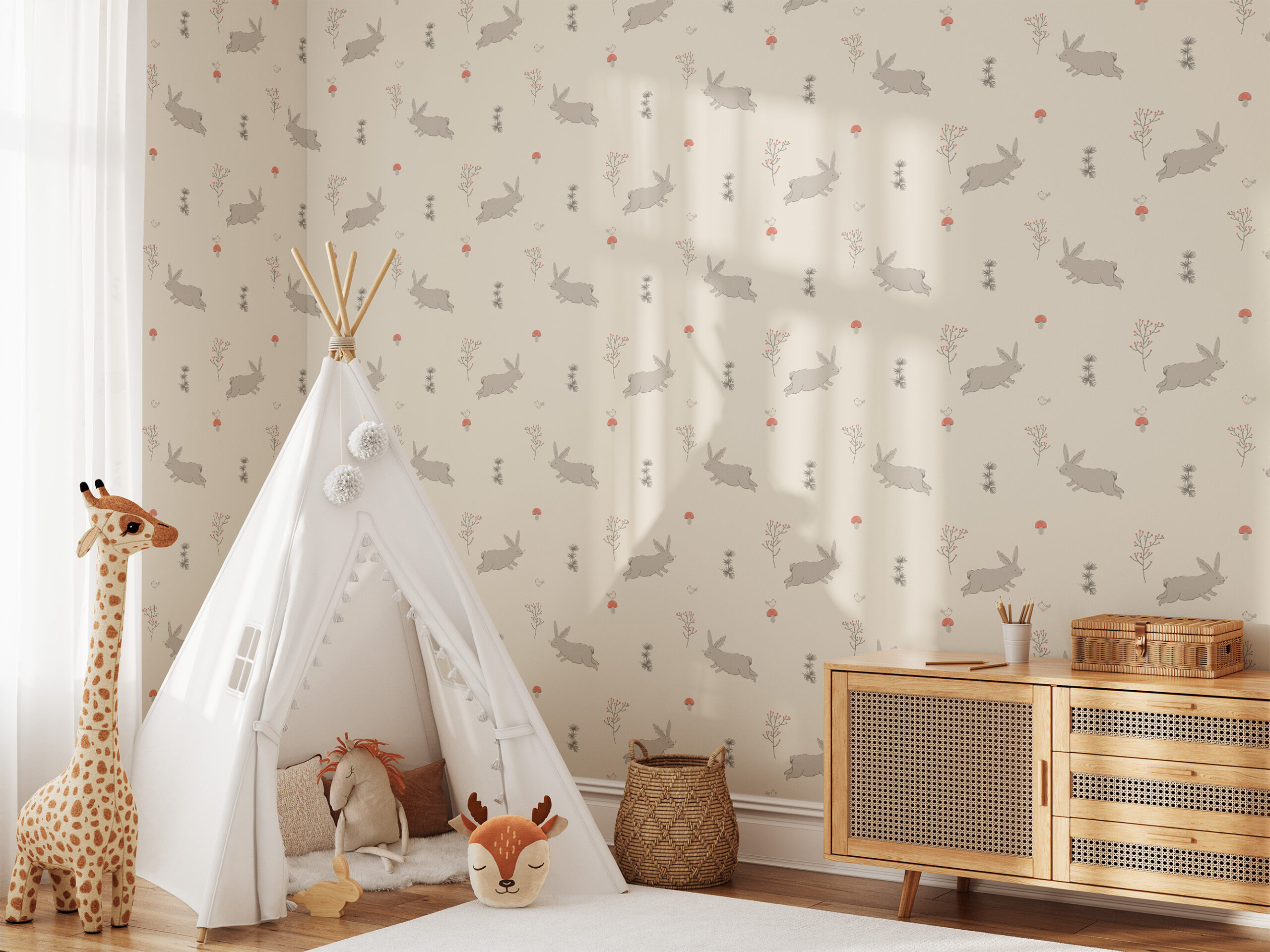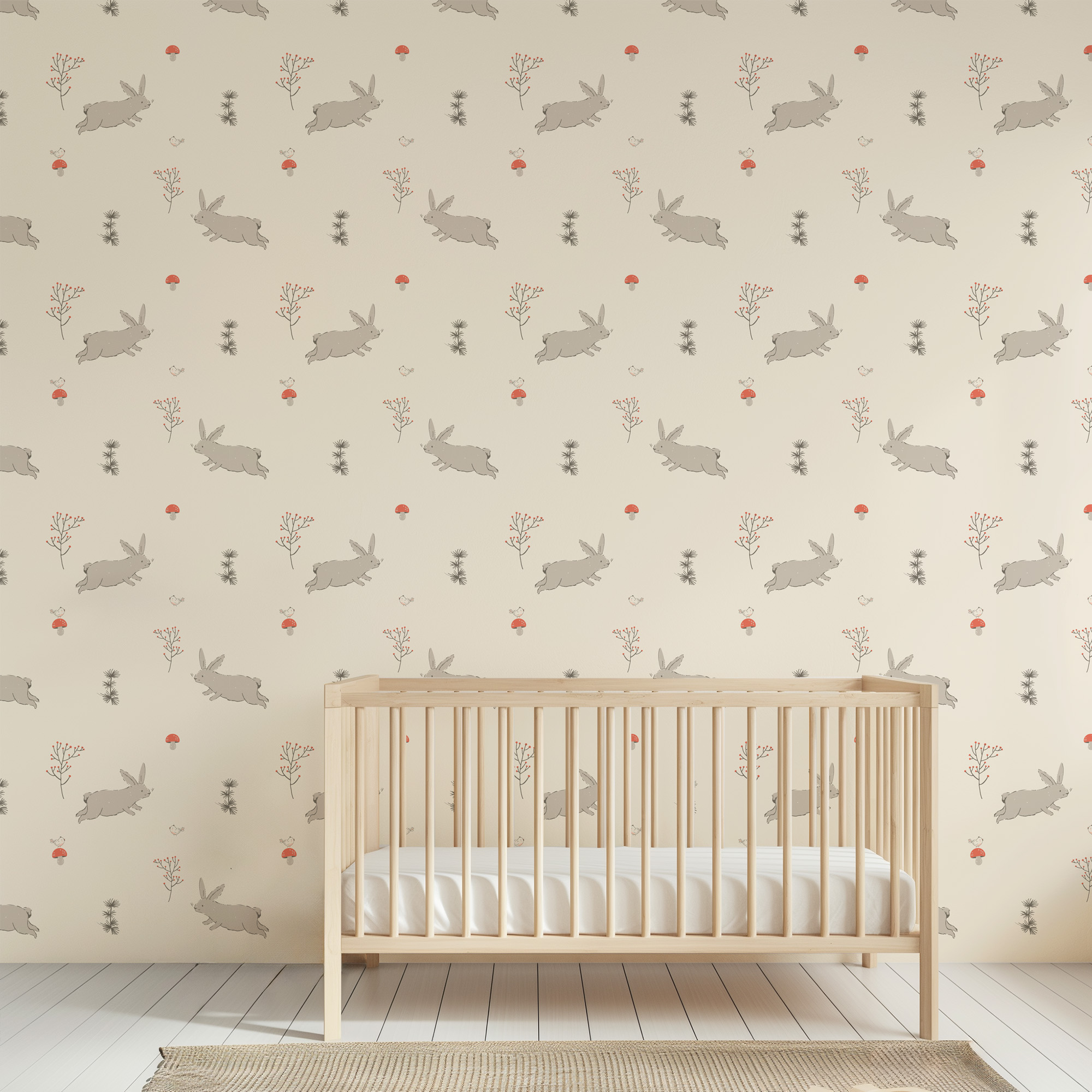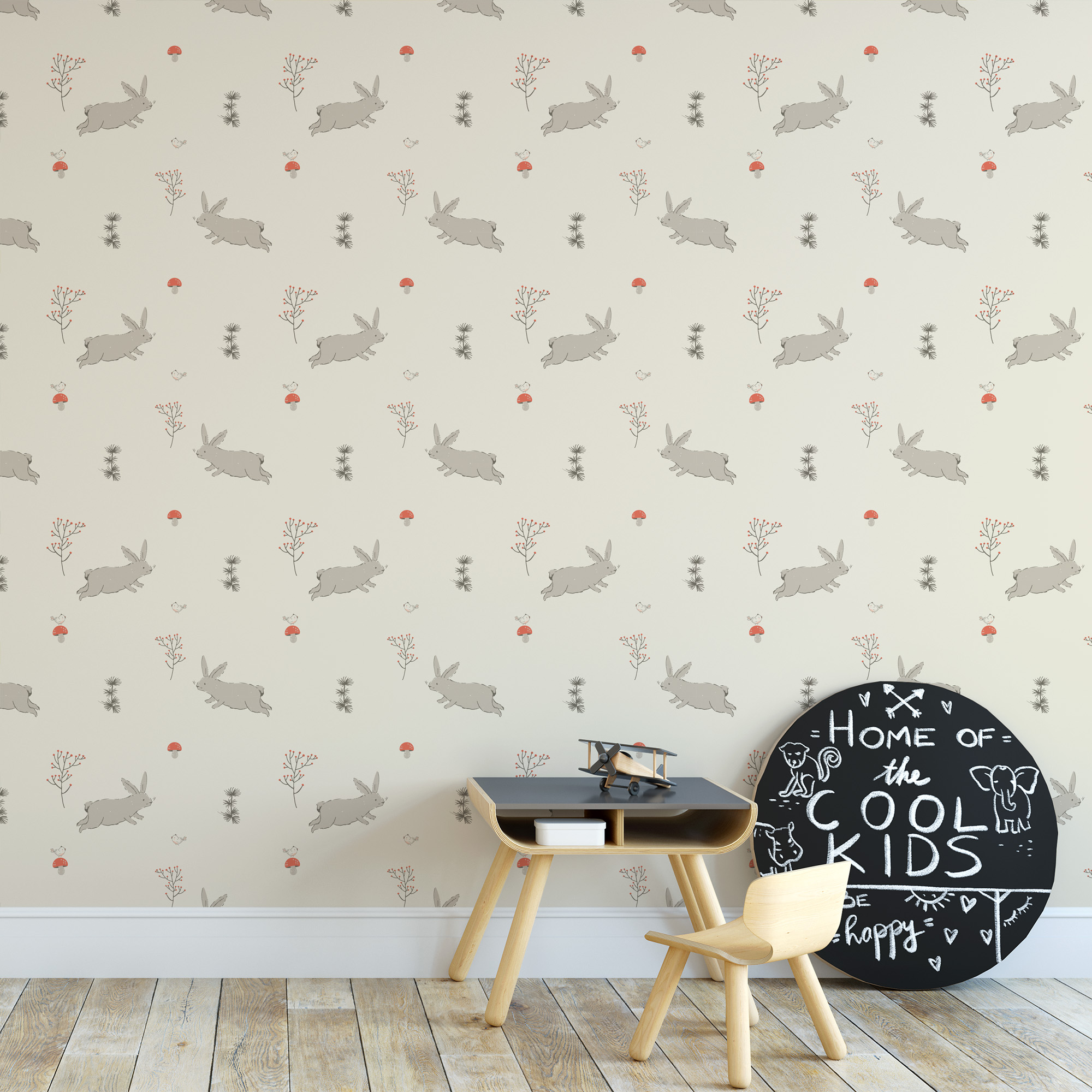 Minimalist Rabbit and Mushroom Kids Peel and Stick Wallpaper, Neutral Woodland Nursery Wall Mural, Earthy Bunny Decor kids-0038