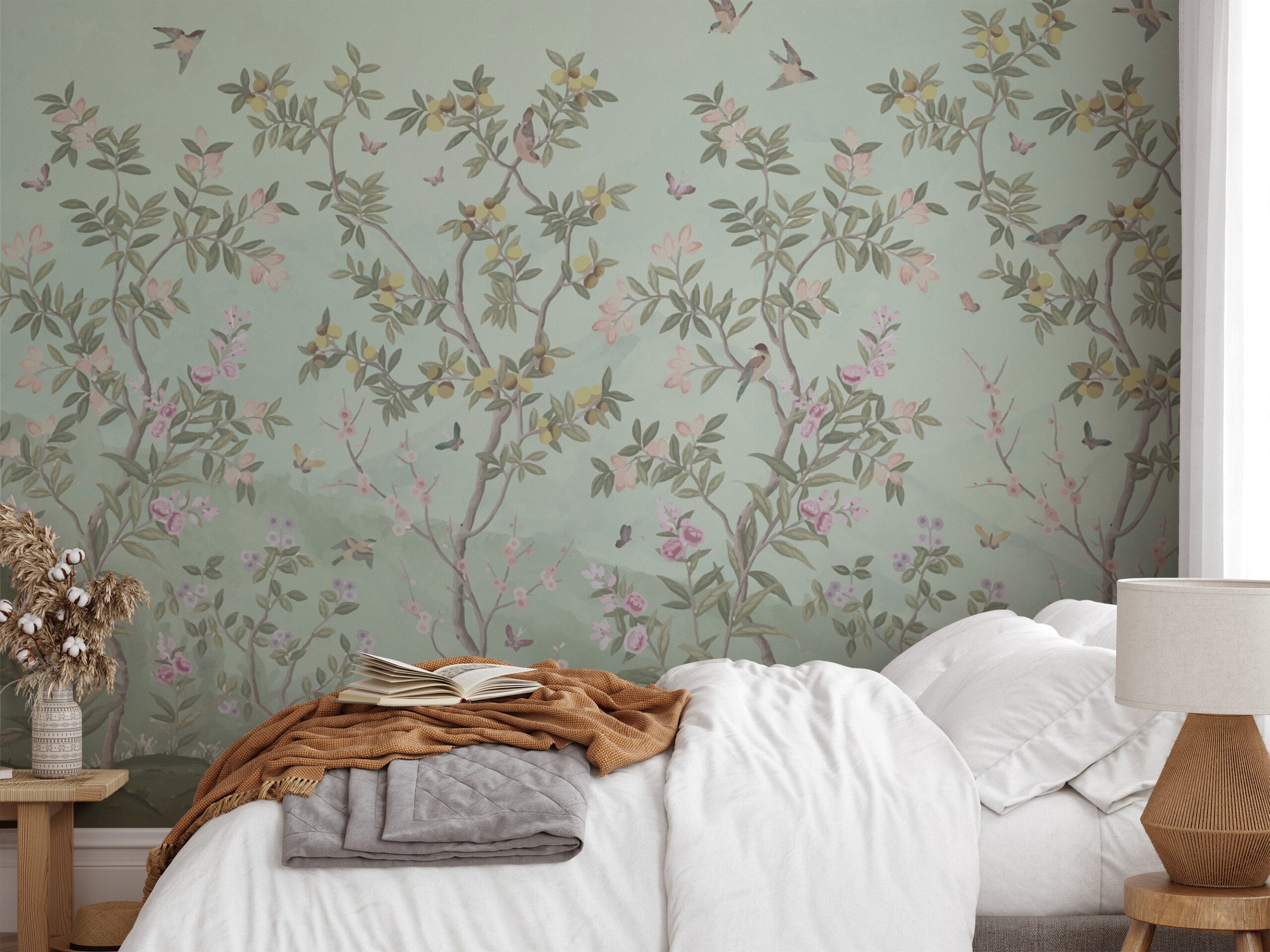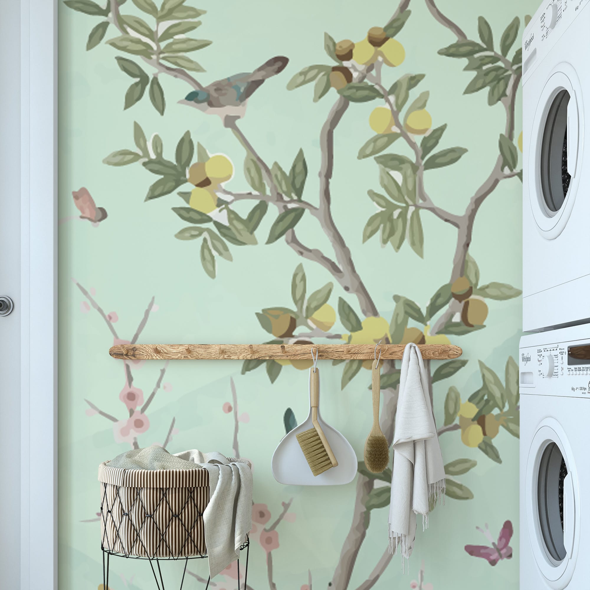 Mint Green Chinoiserie Bird and Fruit Tree Peel and Stick Wallpaper, Vintage Botanical Citrus Wall Mural, Fresh Nature Laundry Room Decor flrl-0064