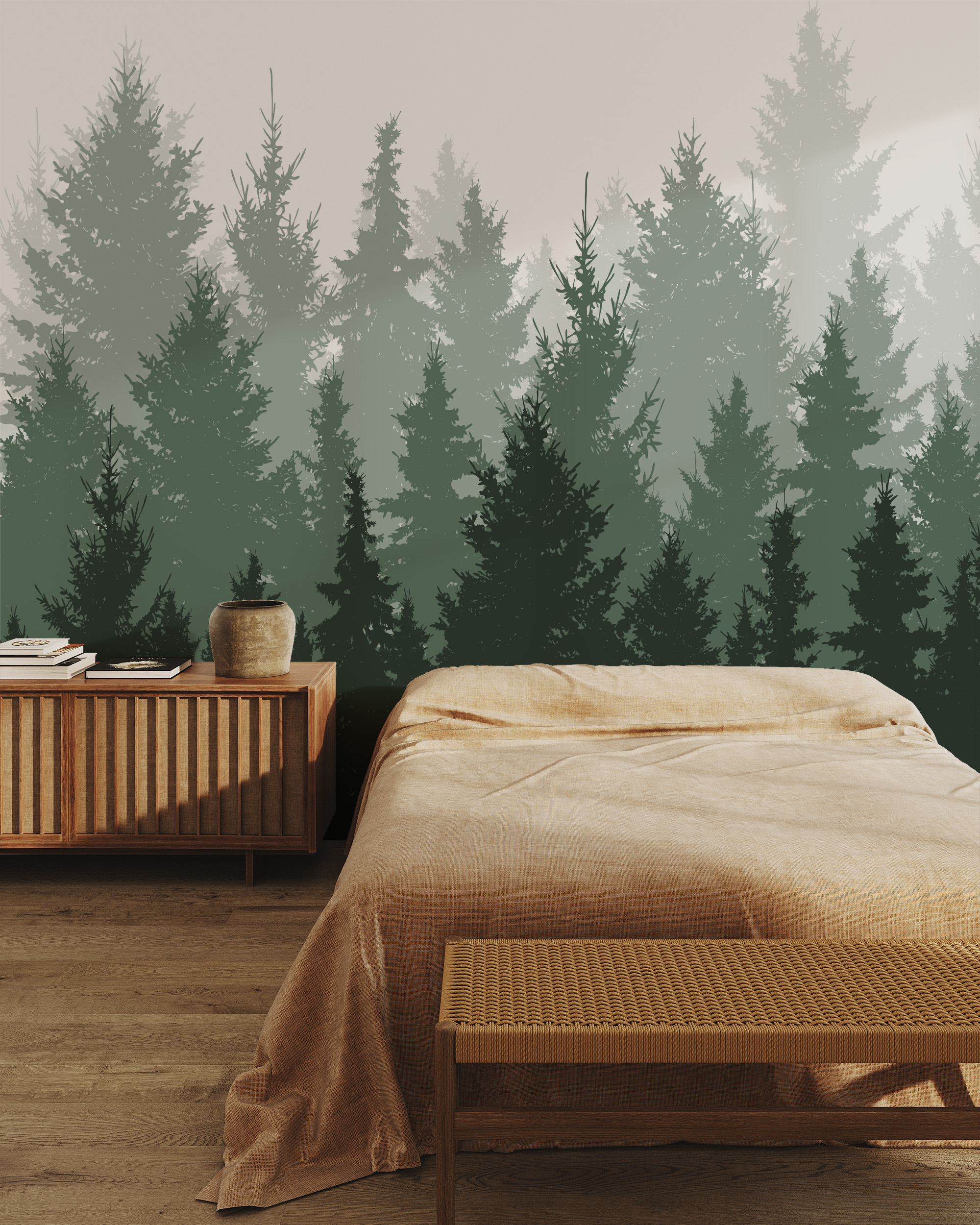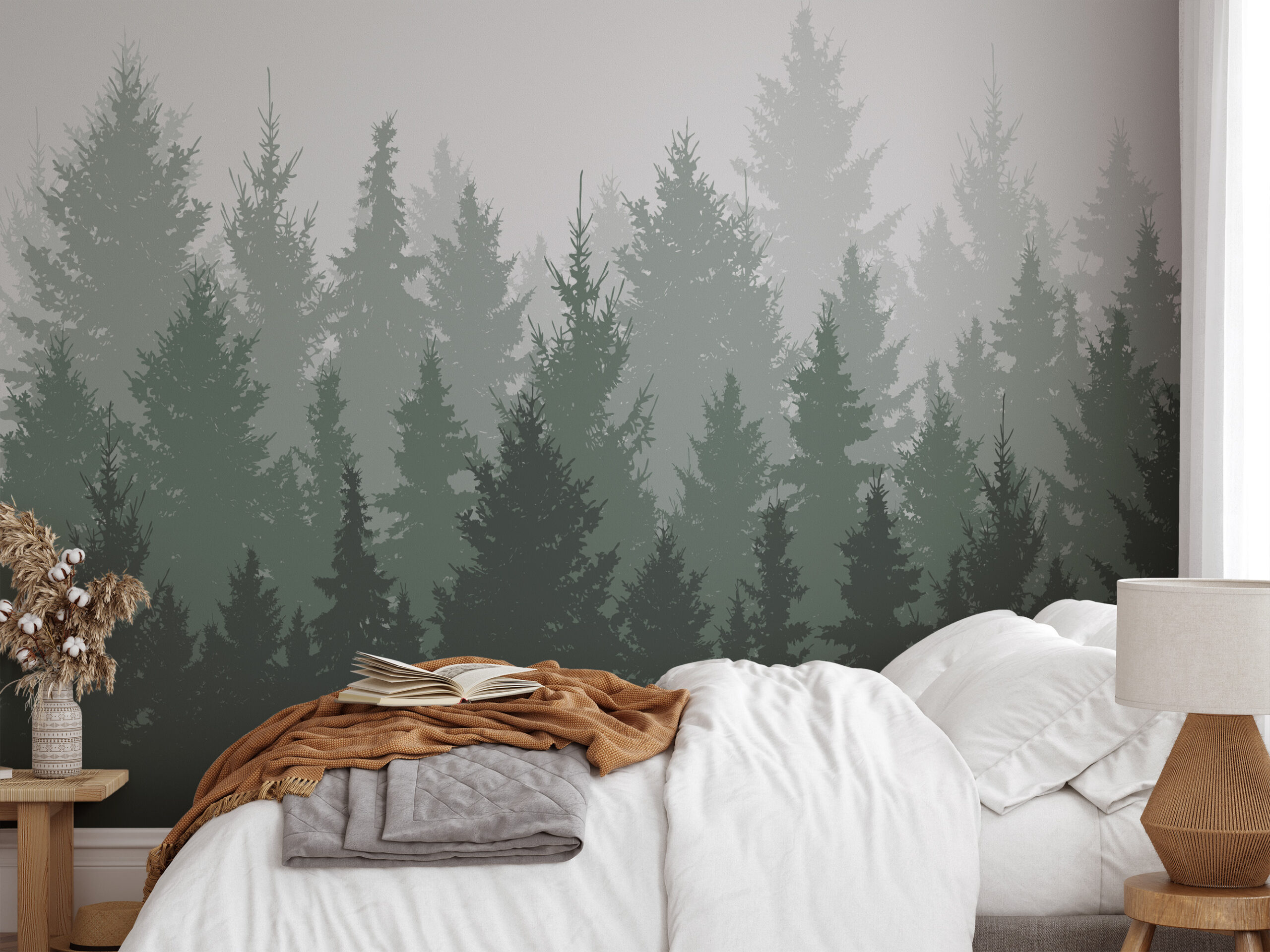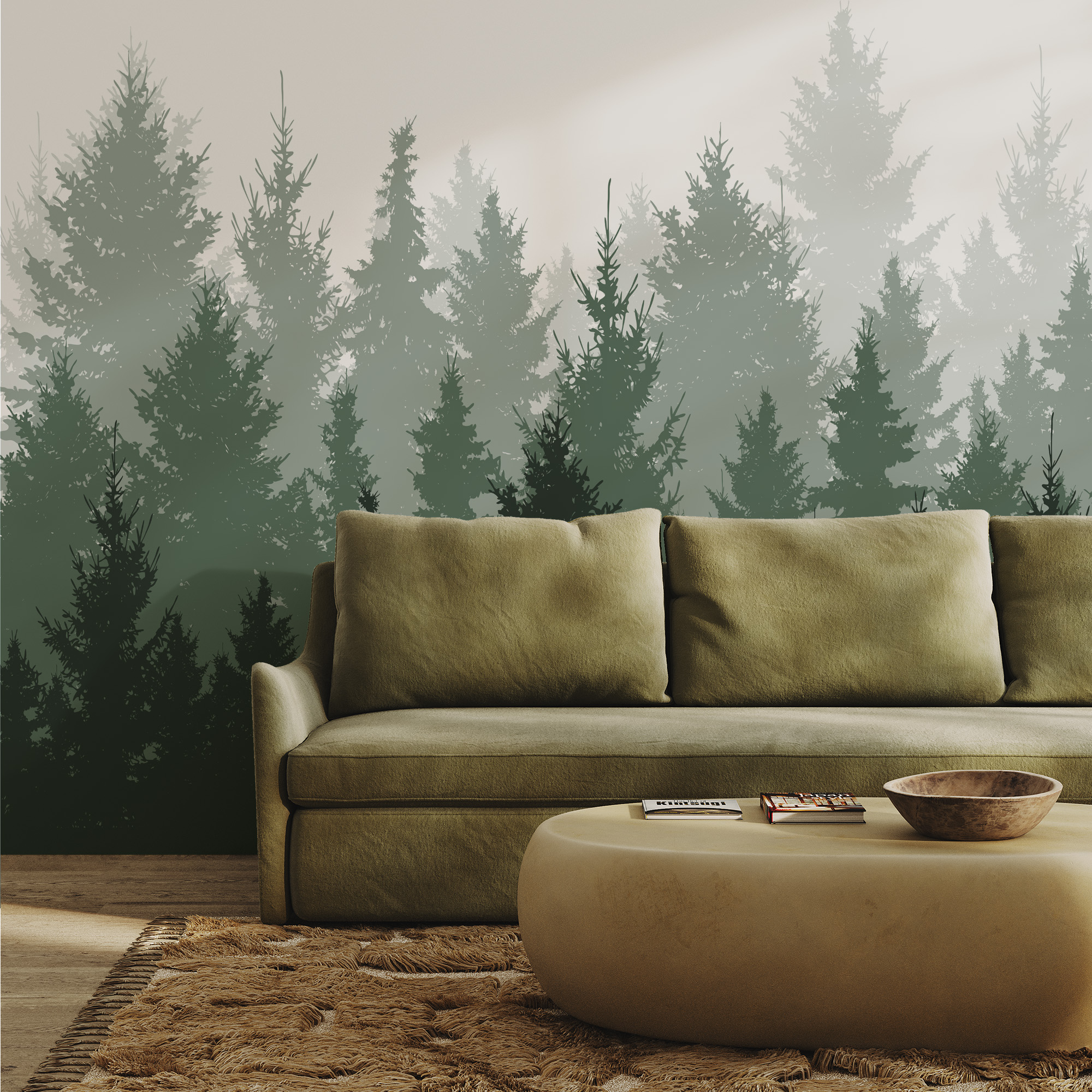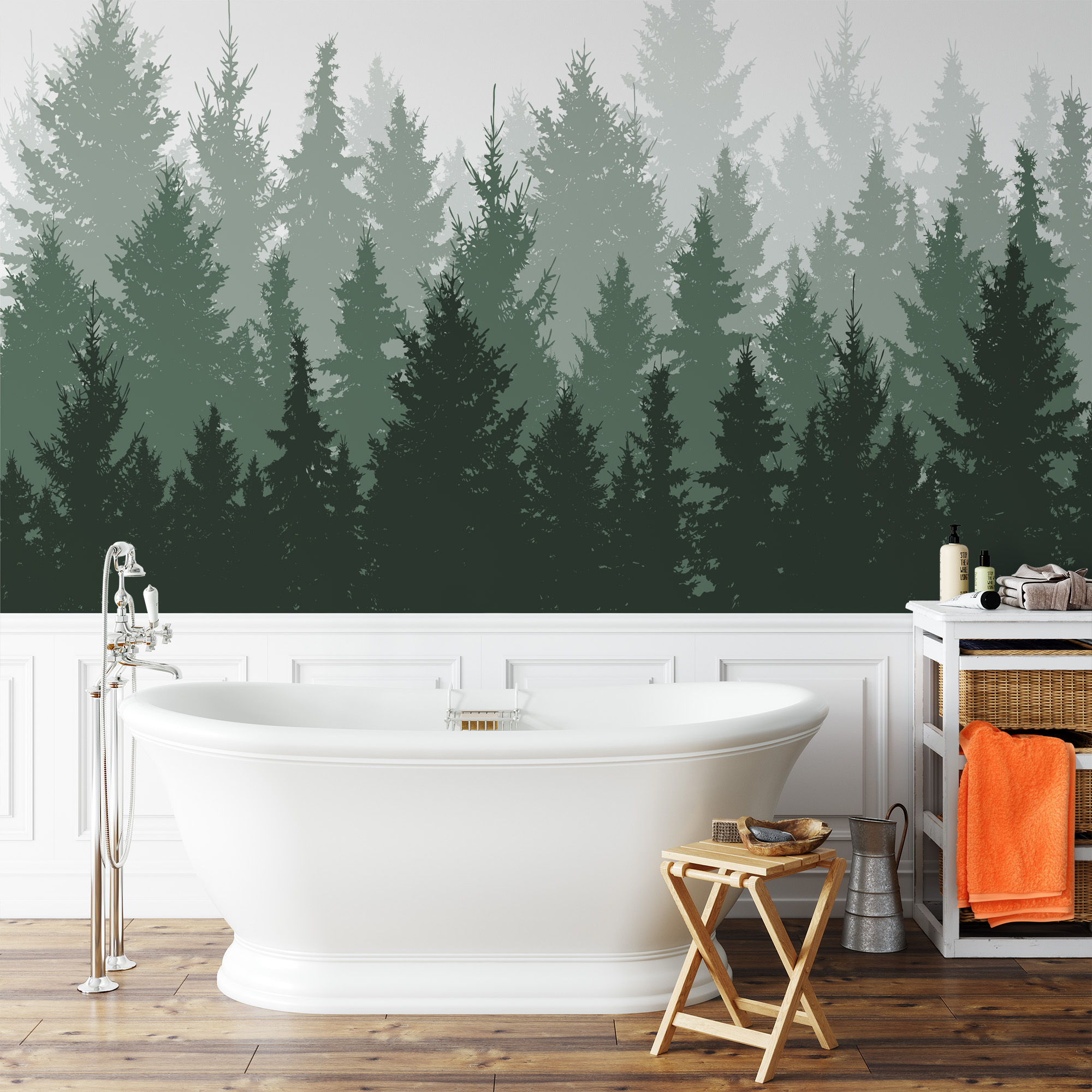 Misty Pine Forest Silhouette Peel and Stick Wallpaper, Serene Green and Grey Nature Bathroom Wall Mural ntrs-0003