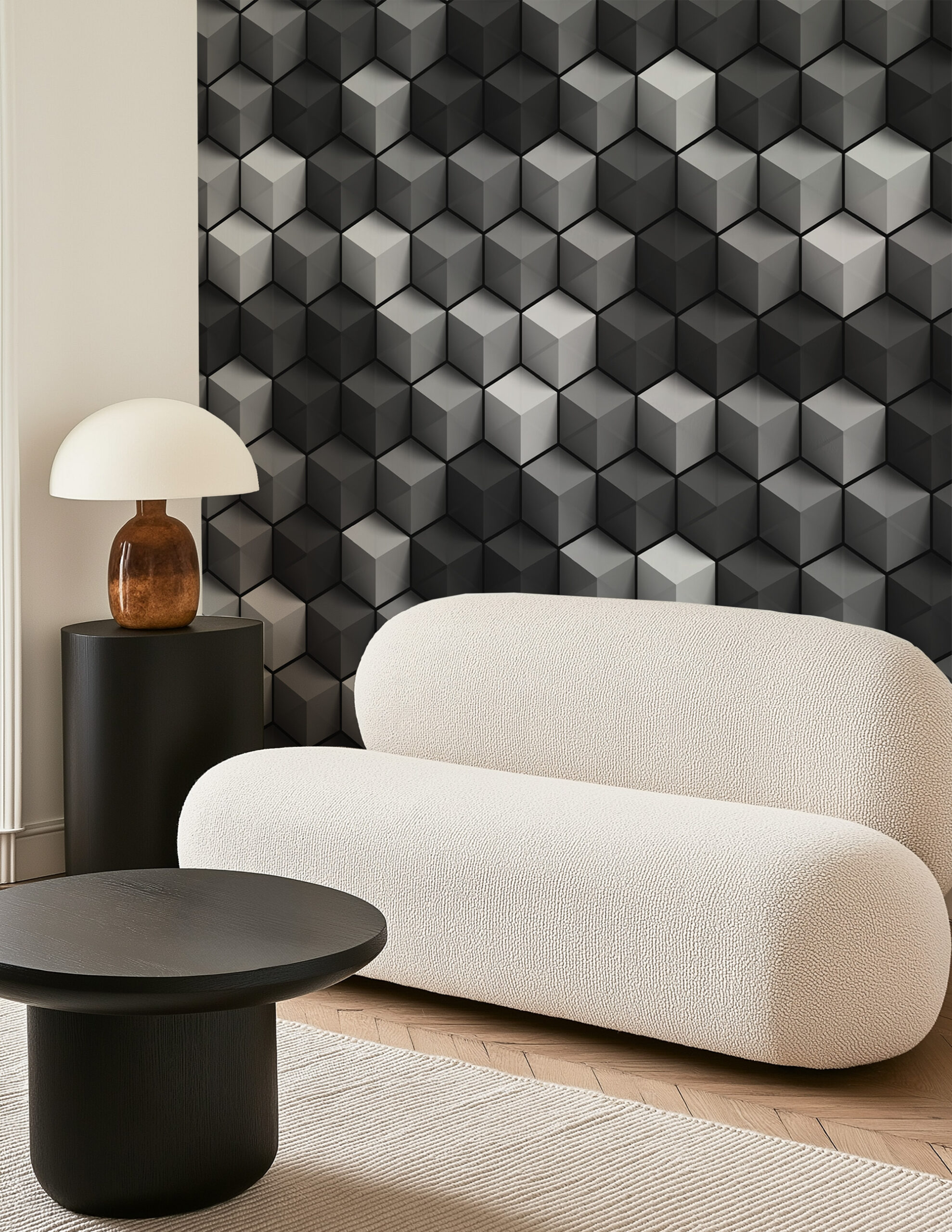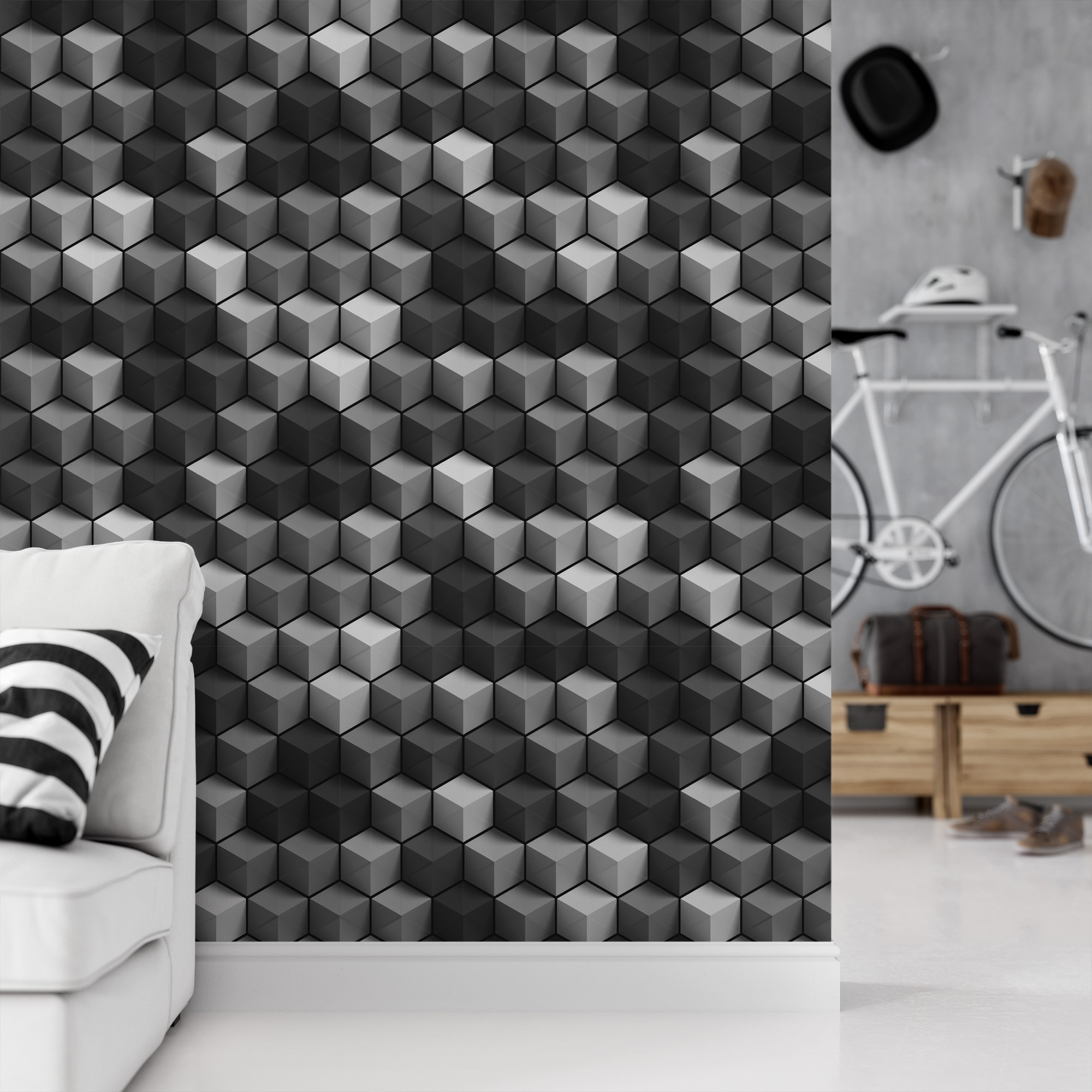 Modern 3D Black and Grey Cube Peel and Stick Wallpaper, Geometric Hexagon Wall Mural, Futuristic Isometric Architectural Decor gmla-0020