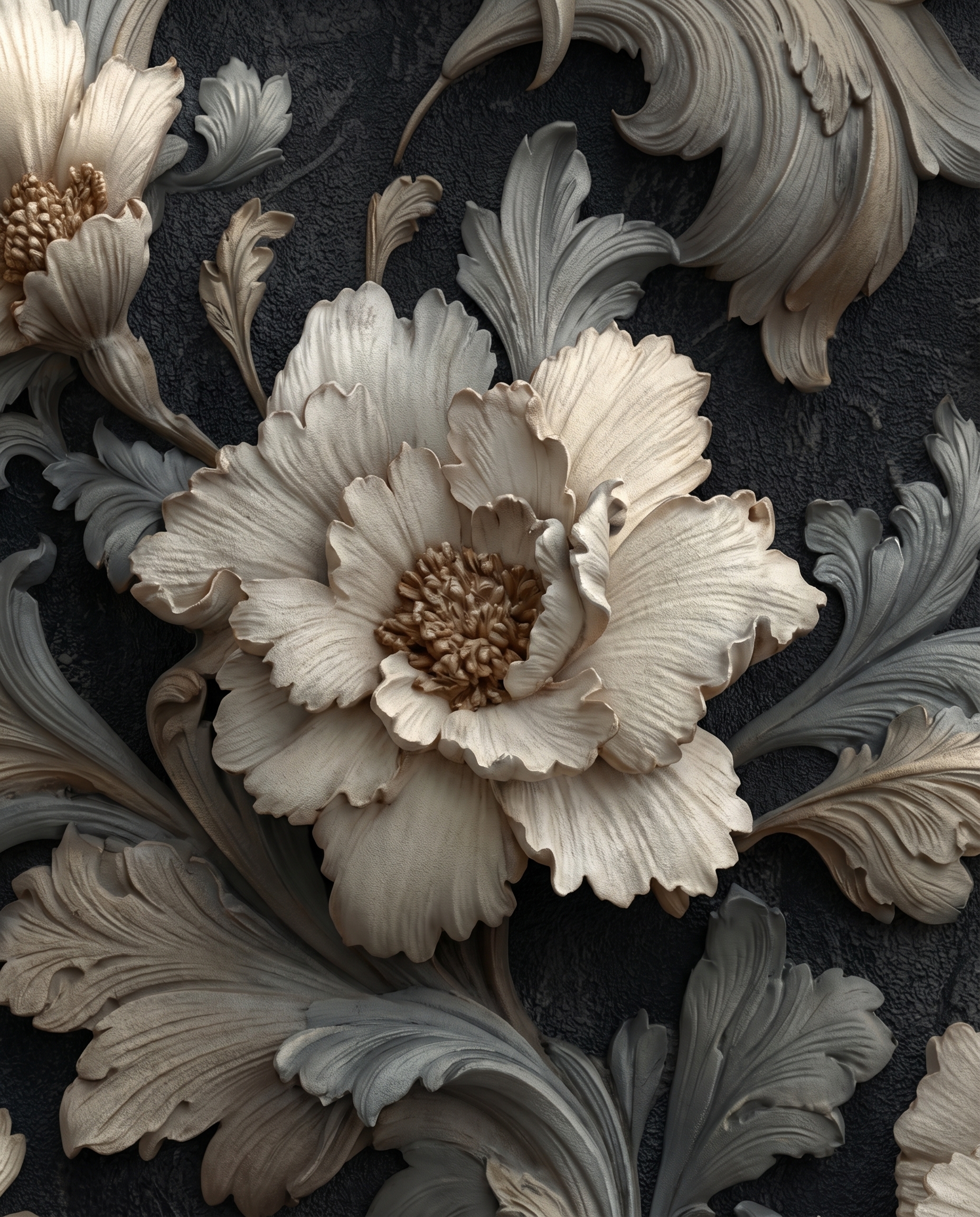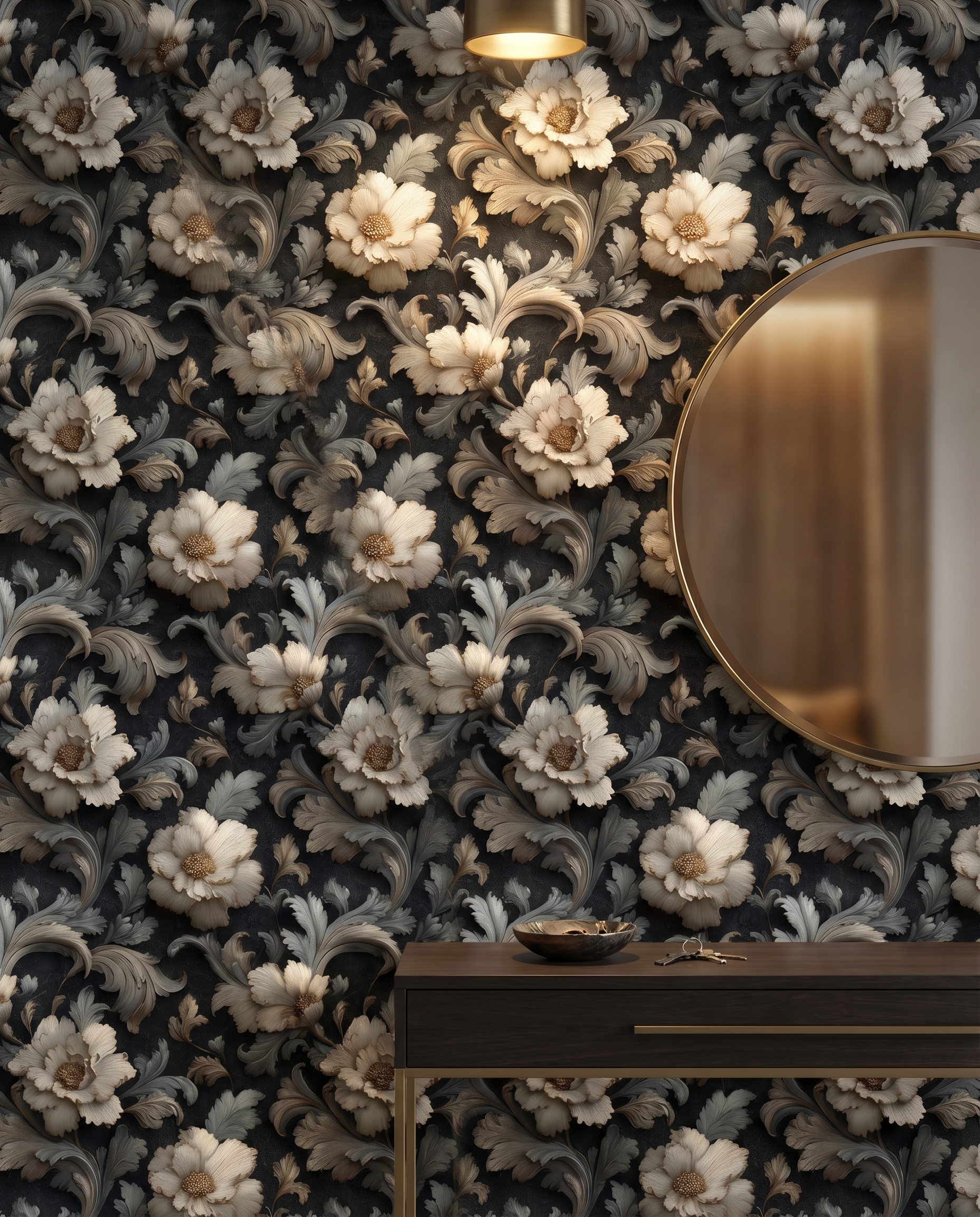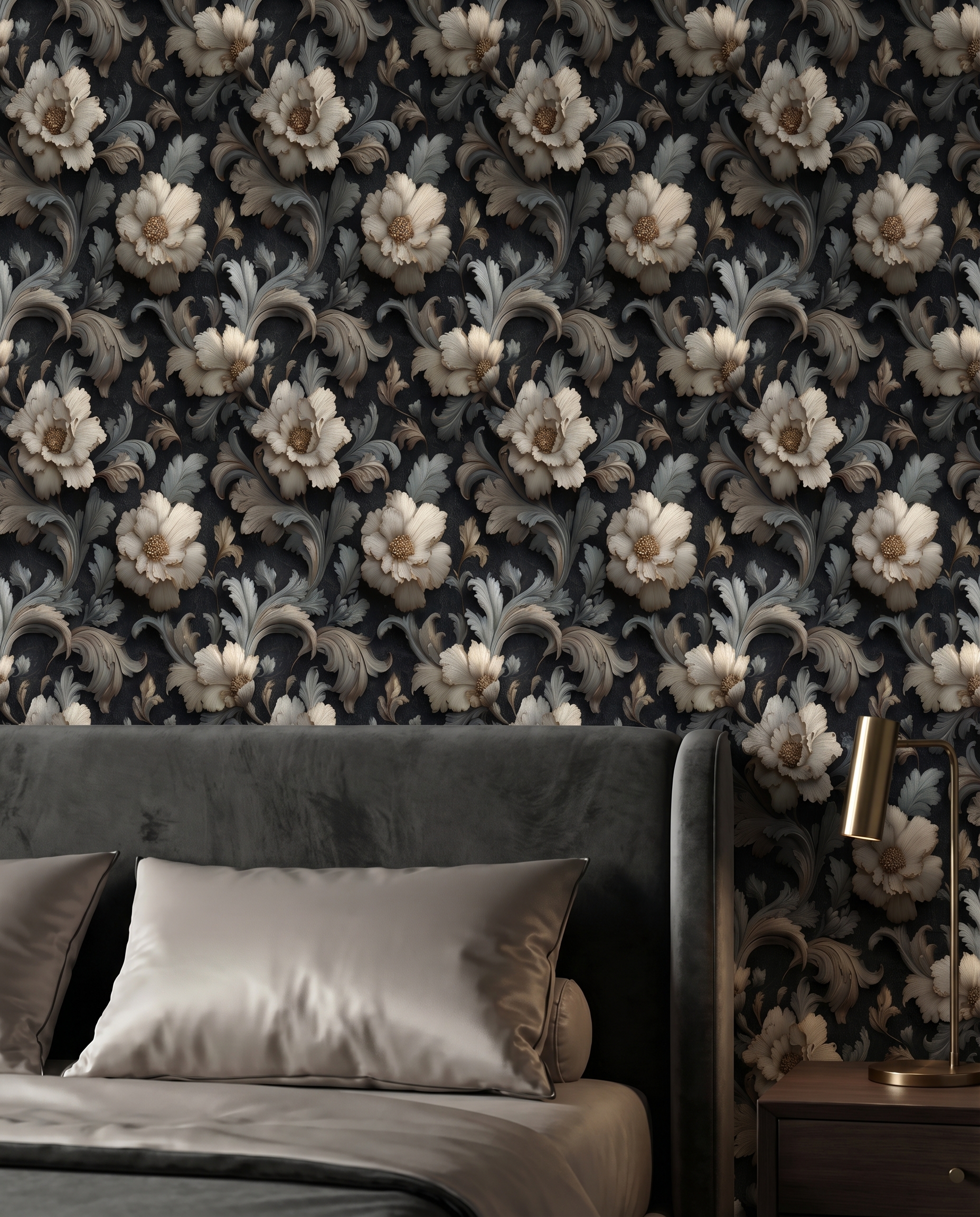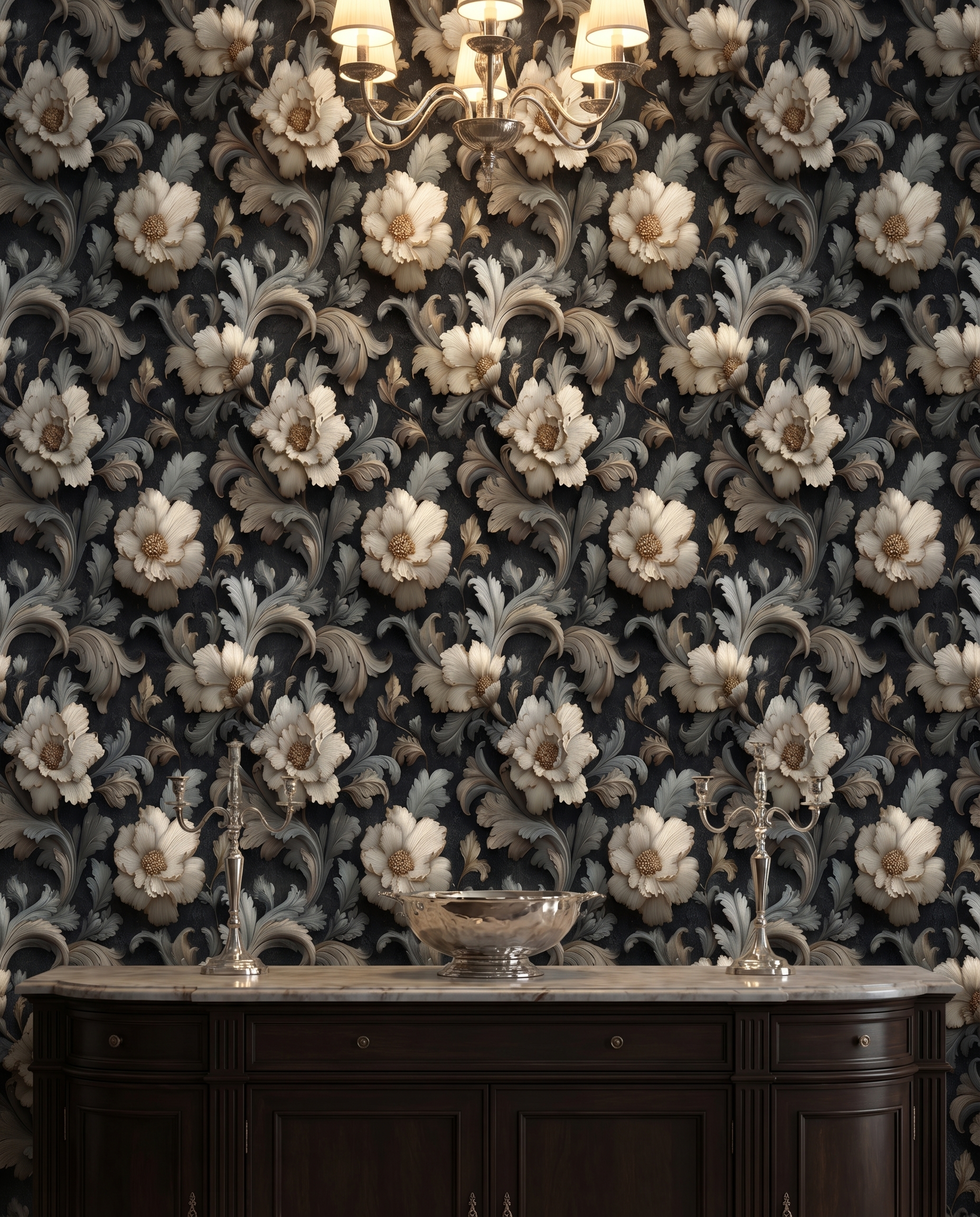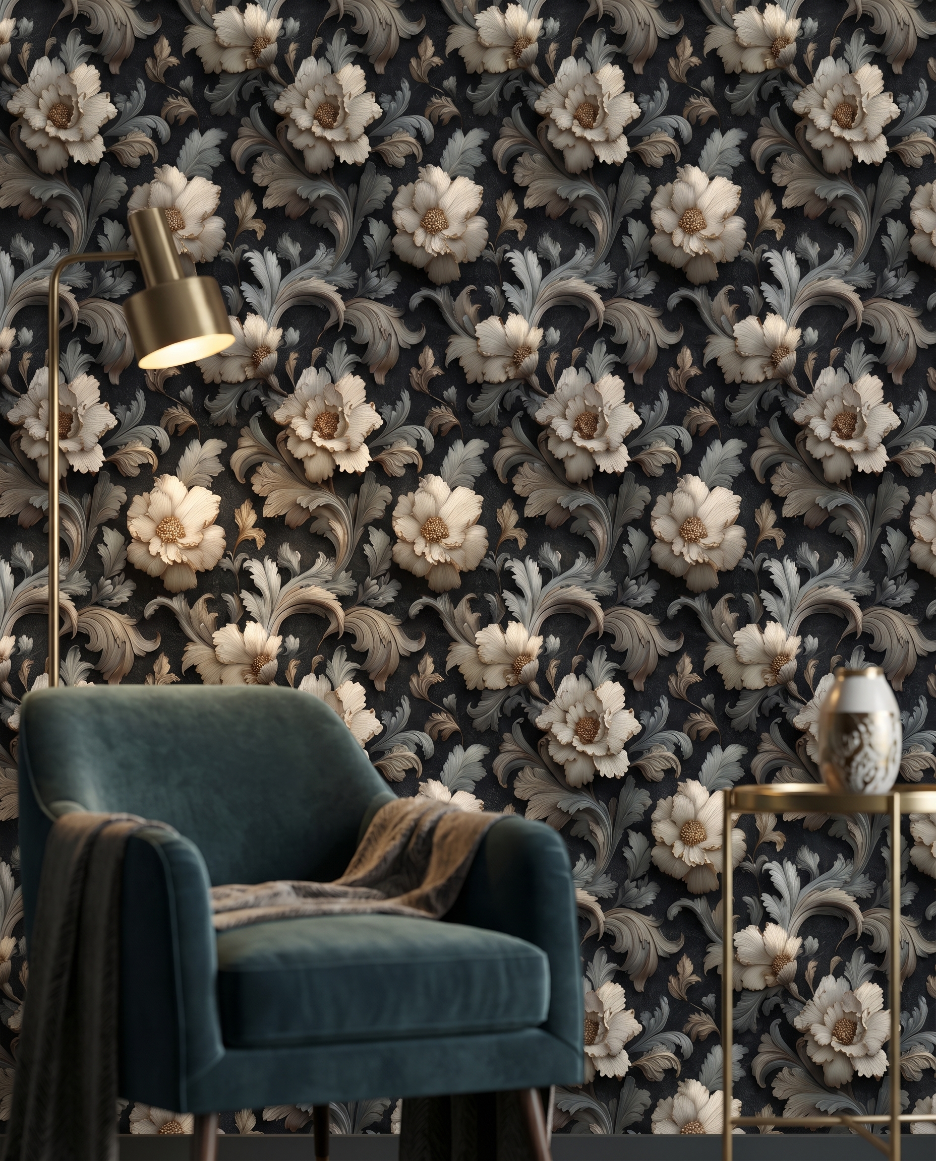 Modern 3D Embossed Floral Peel and Stick Wallpaper, Moody Charcoal and Cream Victorian Wall Mural m-flrl-004