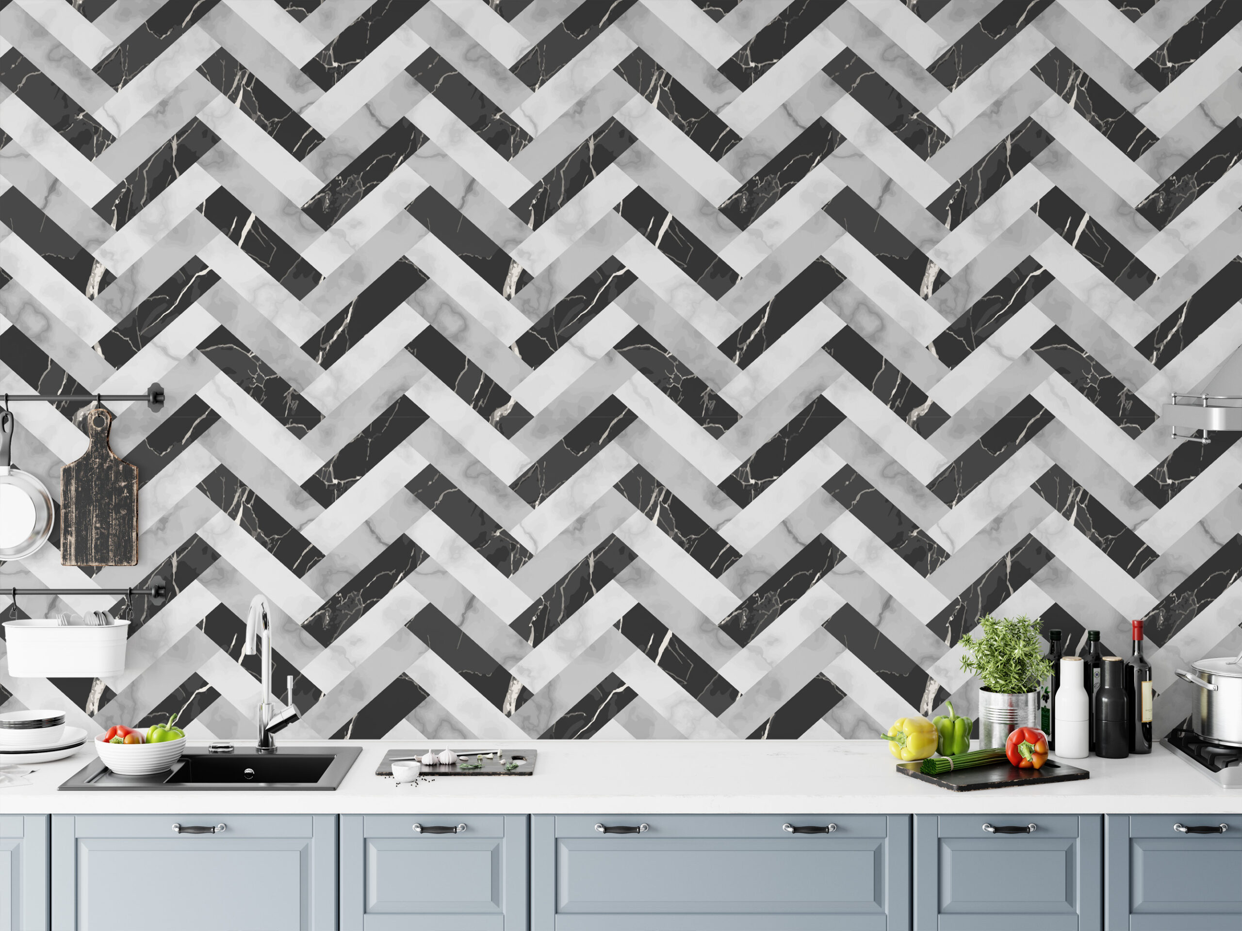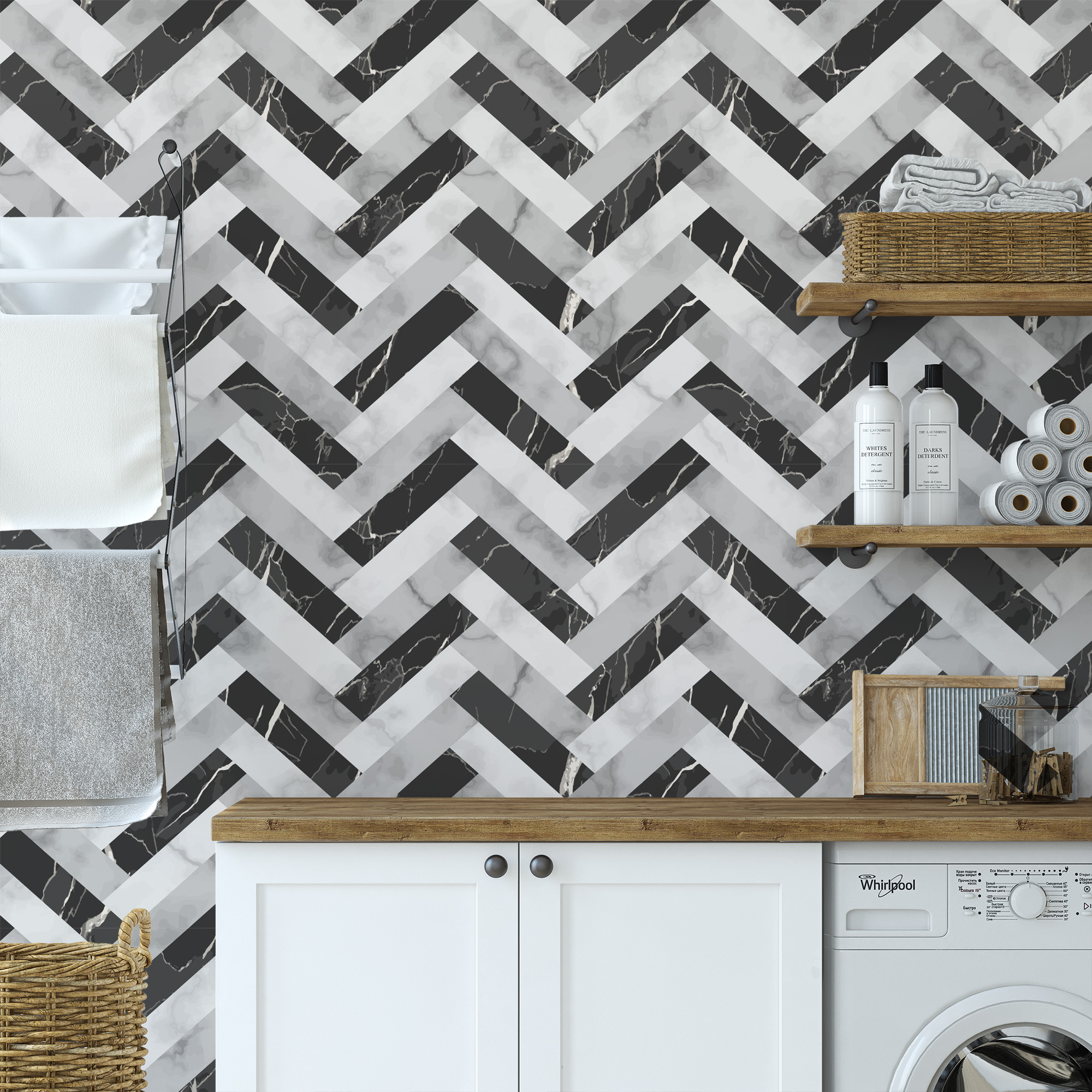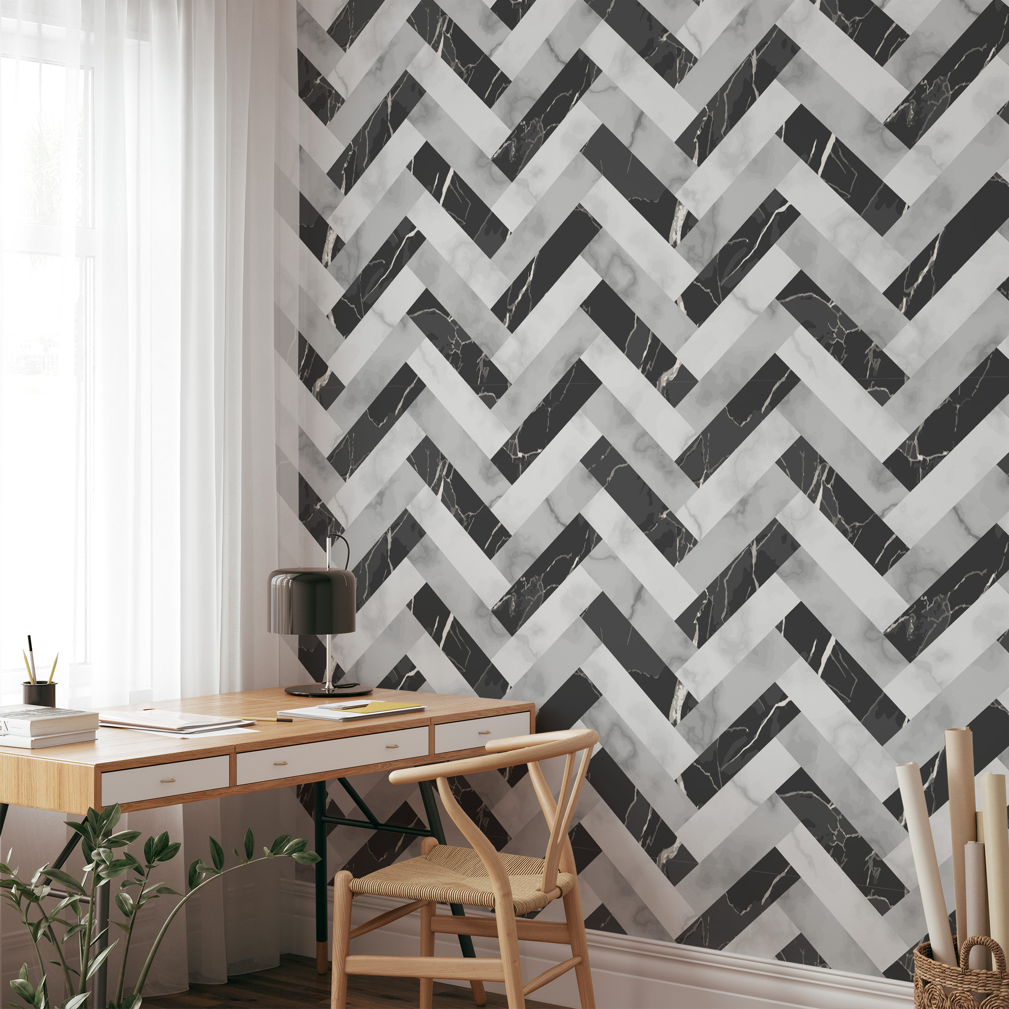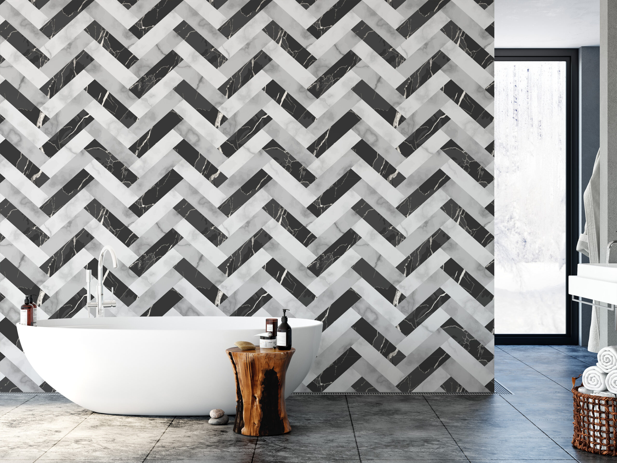 Modern Black and White Marble Herringbone Peel and Stick Wallpaper, Geometric Faux Marble Wall Mural, Sophisticated Monochrome Decor gmla-0003