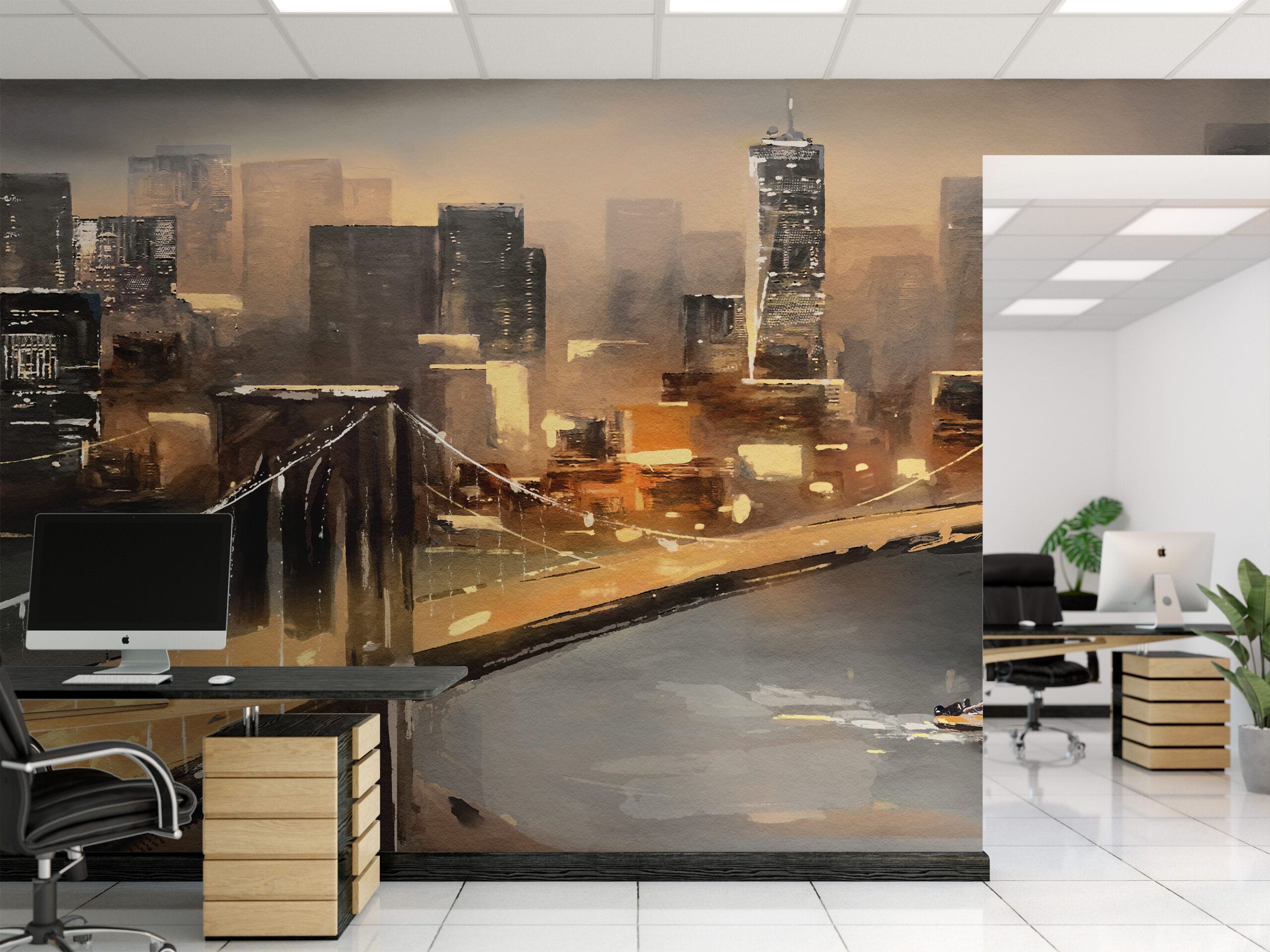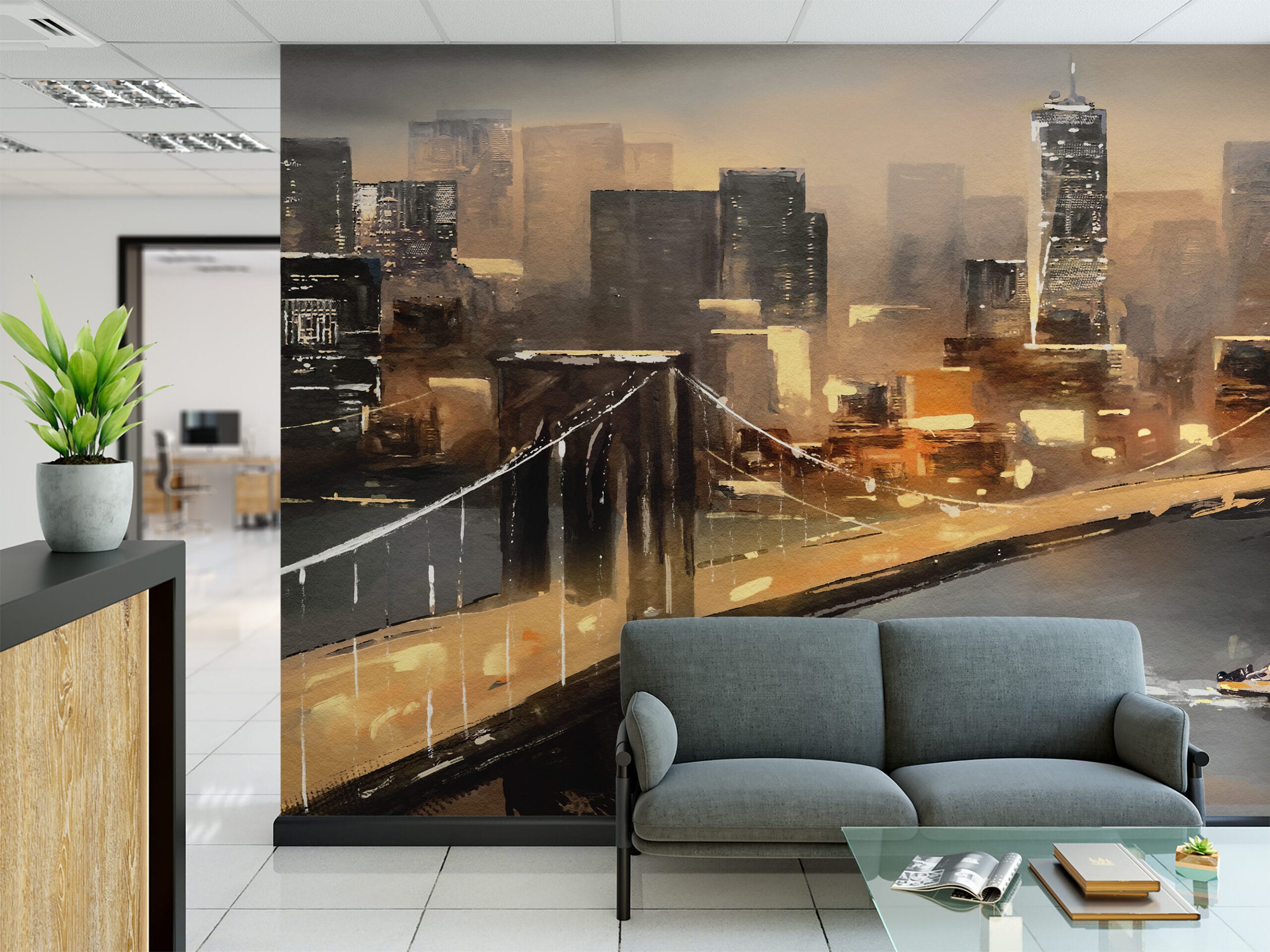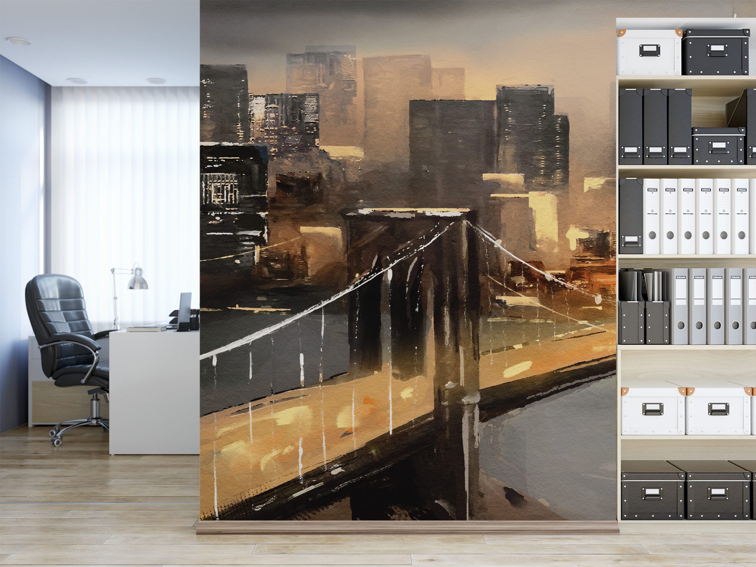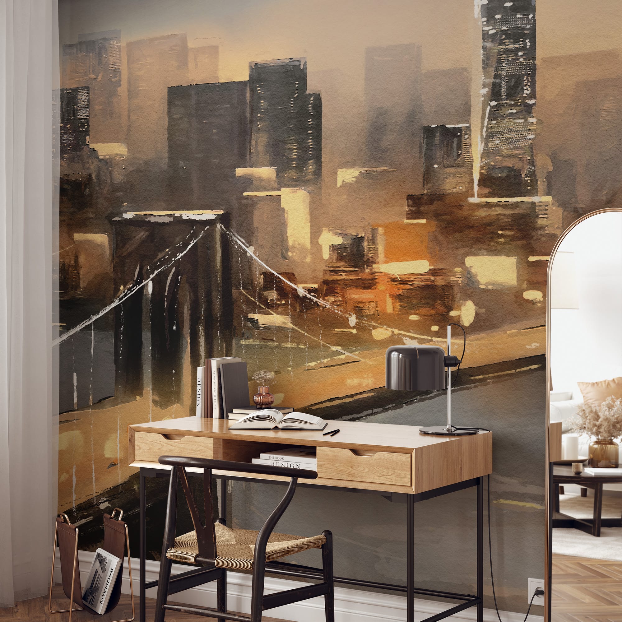 Modern Brooklyn Bridge Cityscape Peel and Stick Wallpaper, Artistic Gold and Brown Urban Office Wall Mural ntrs-0014