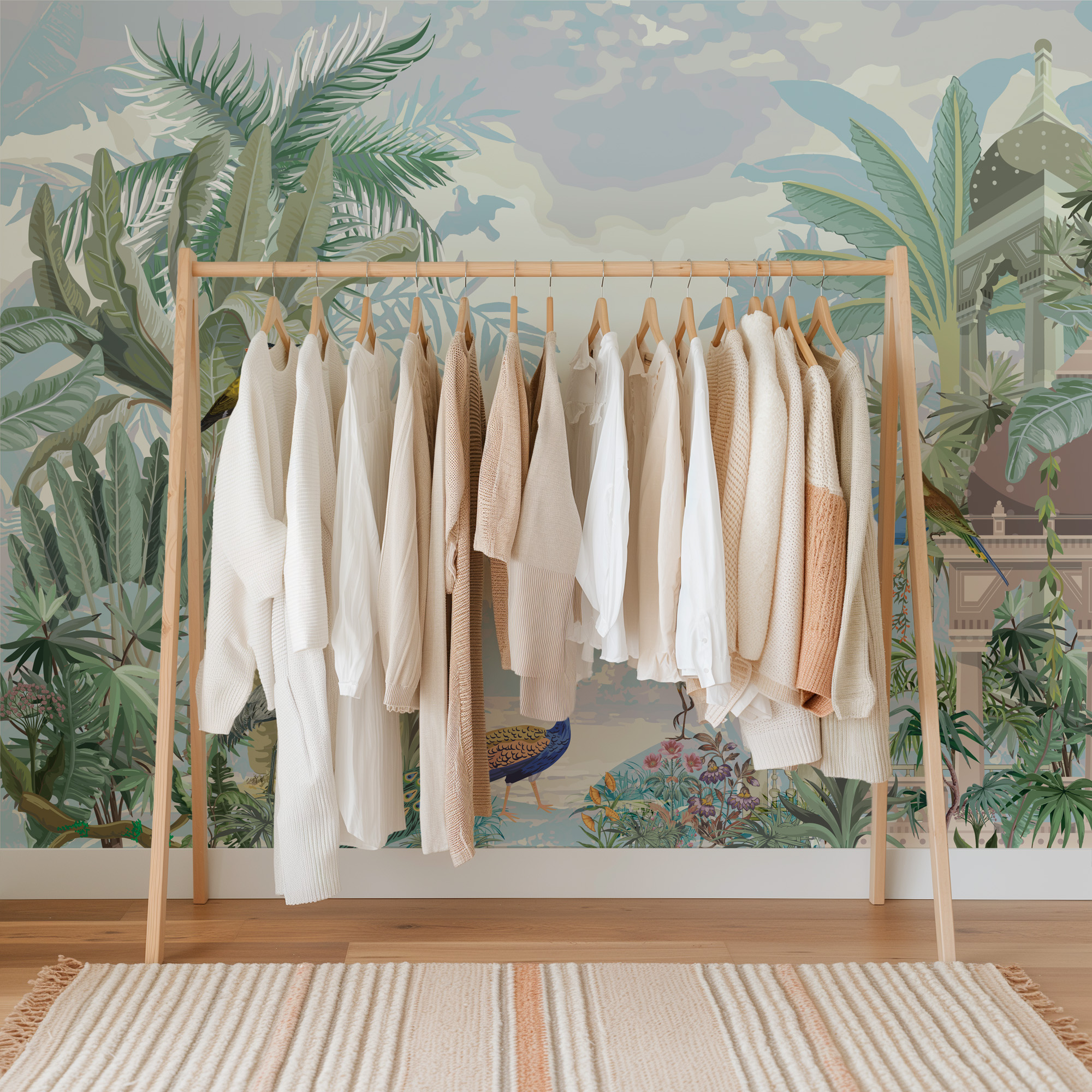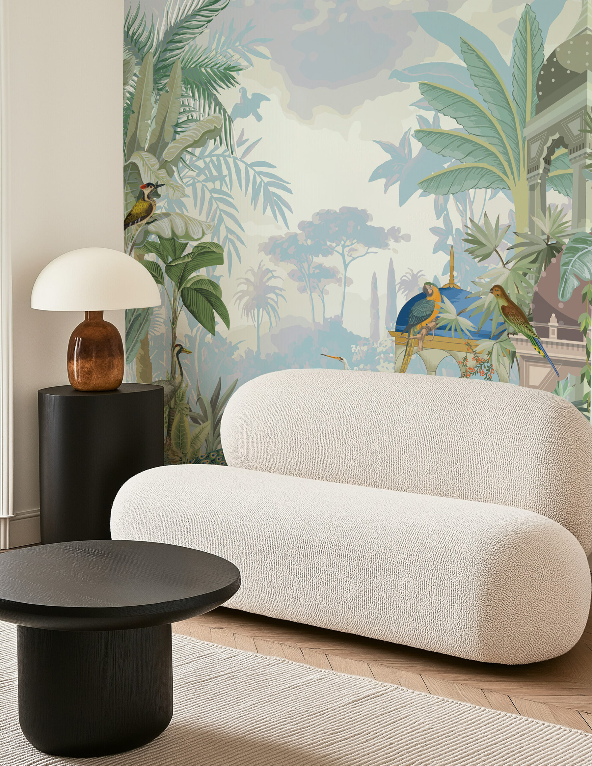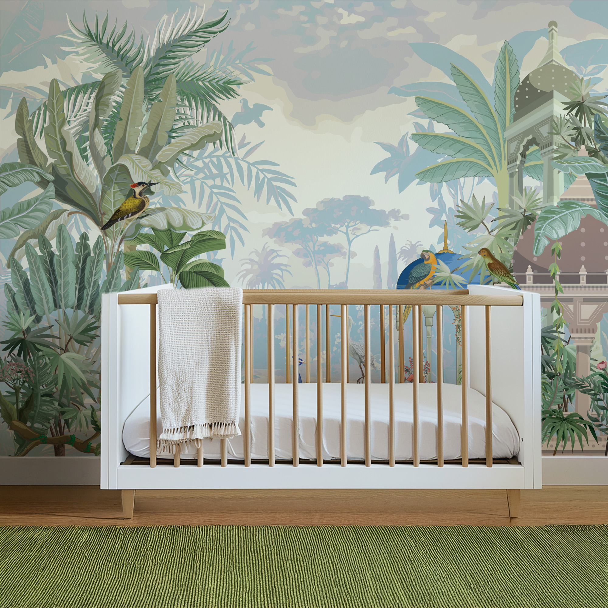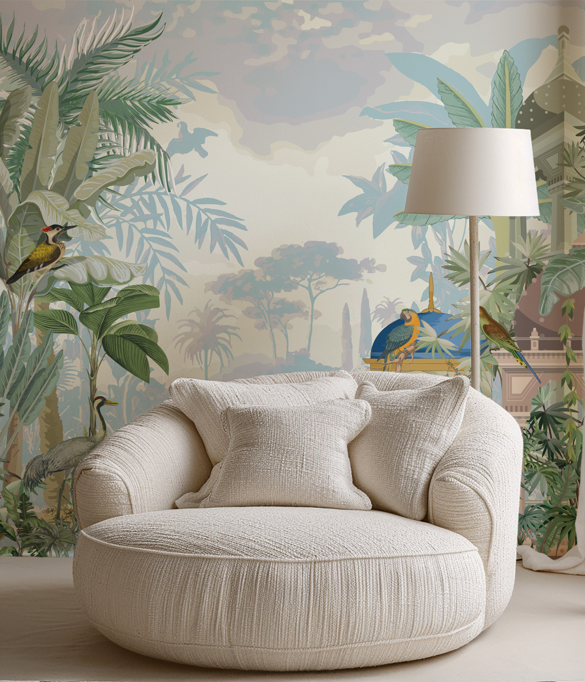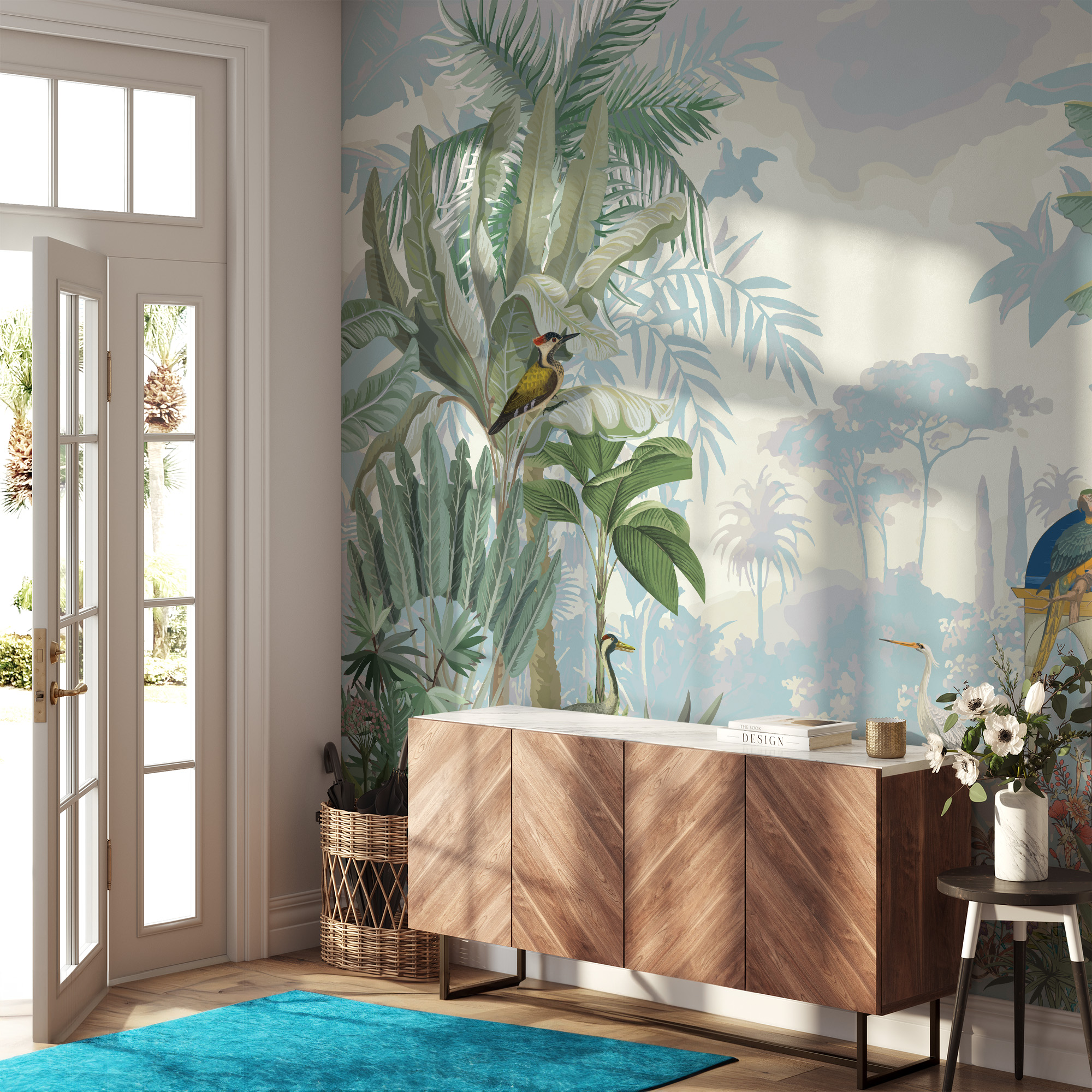 Modern Chinoiserie Tropical Jungle with Birds Peel and Stick Wallpaper, Exotic Nursery Wall Mural ntrs-0022