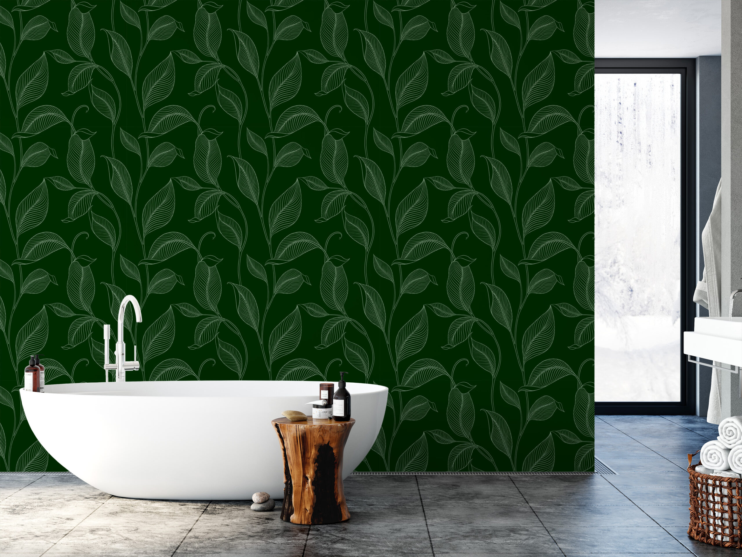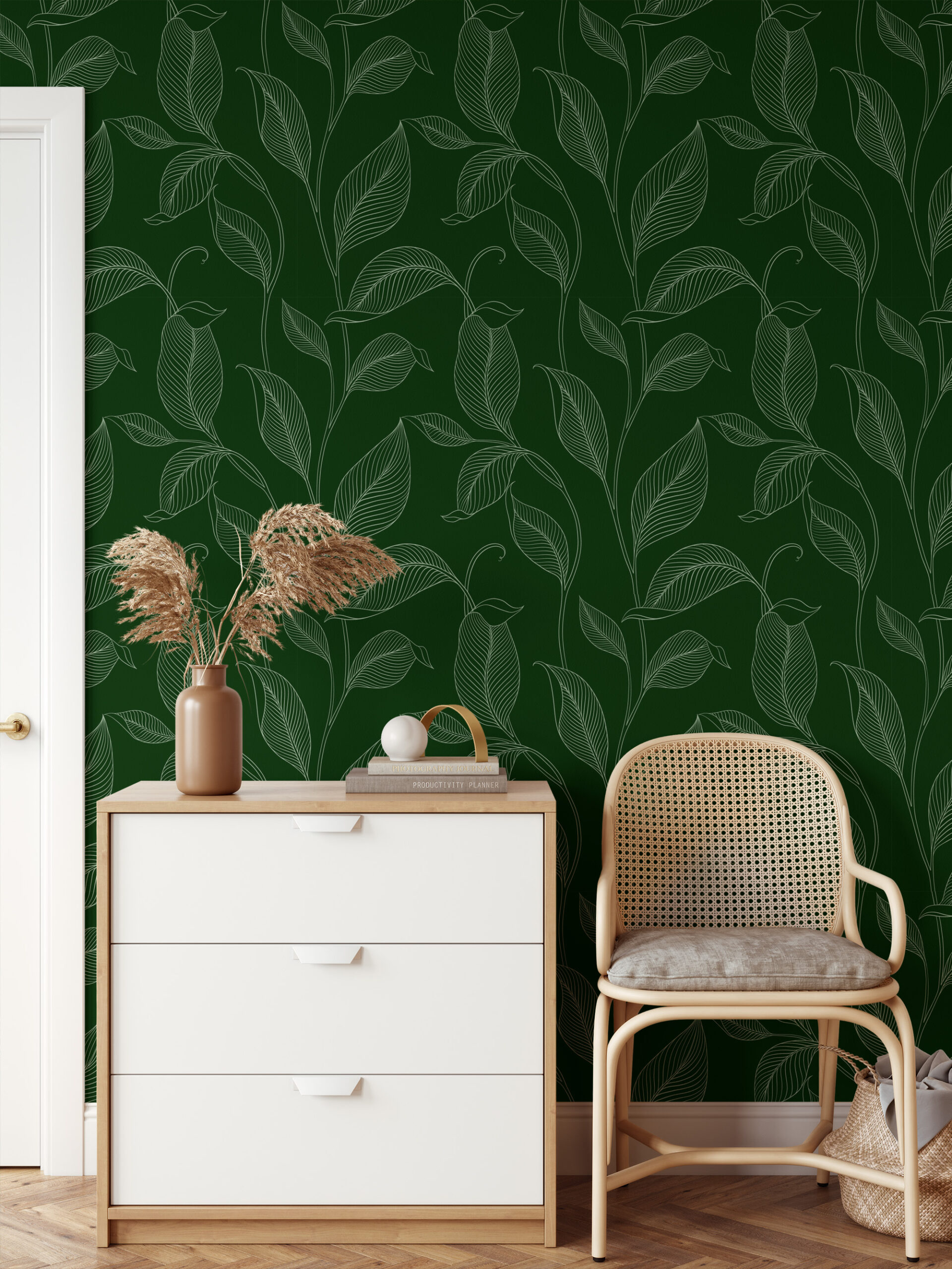 Modern Dark Green and White Botanical Leaf Line Art Peel and Stick Wallpaper, Elegant Nature Wall Mural lvjg-0025