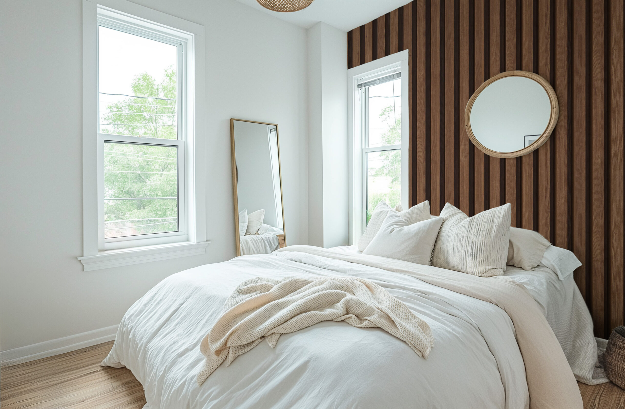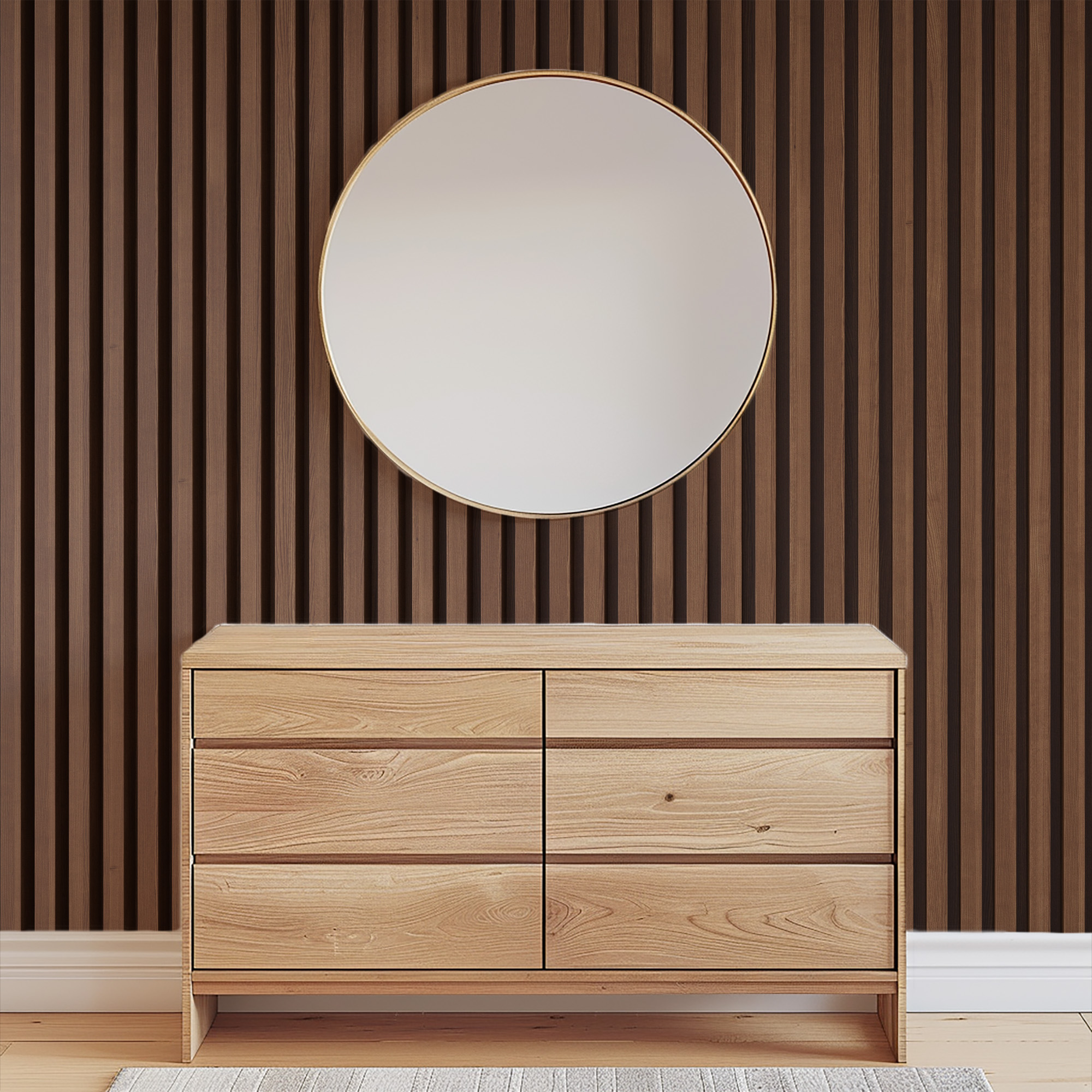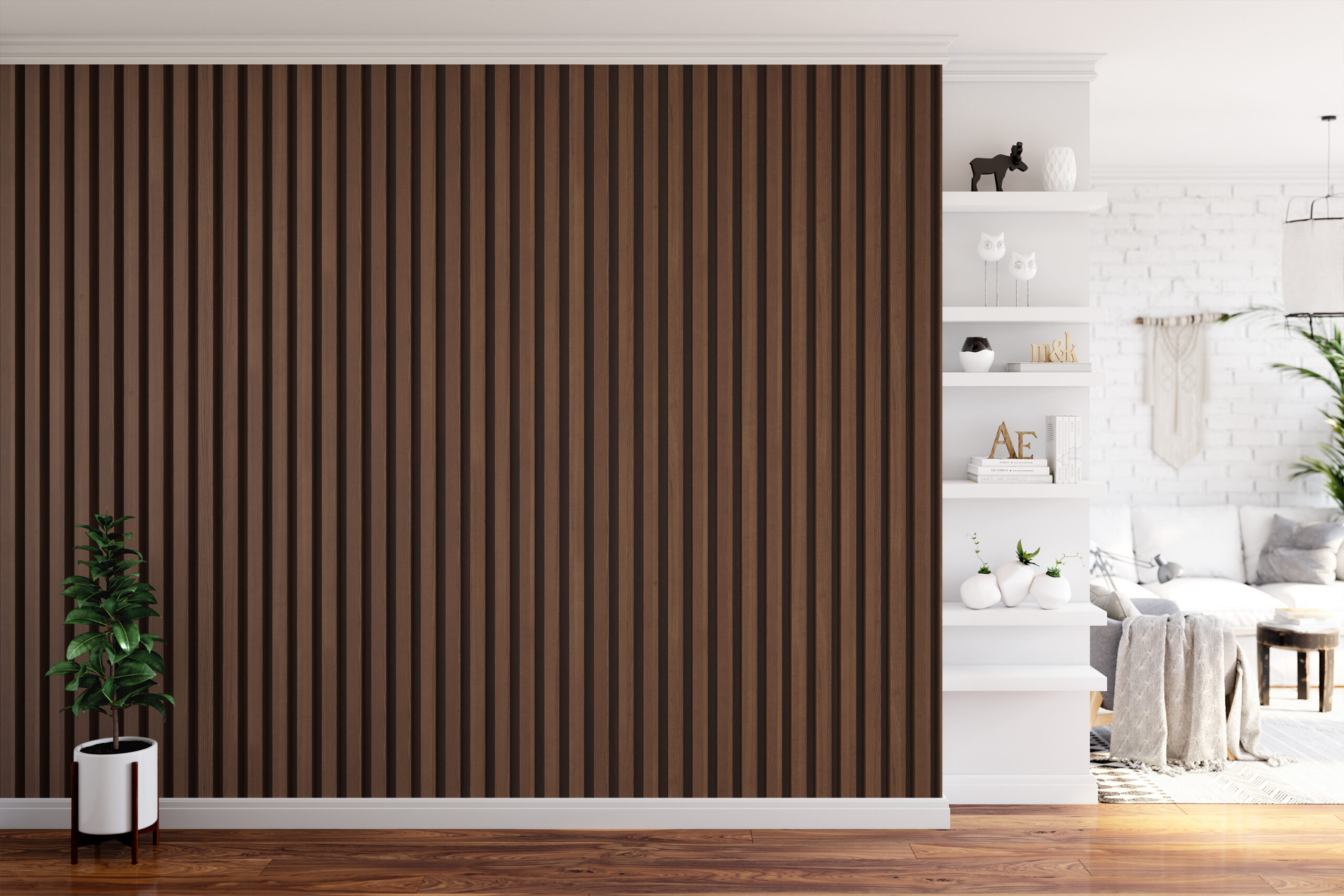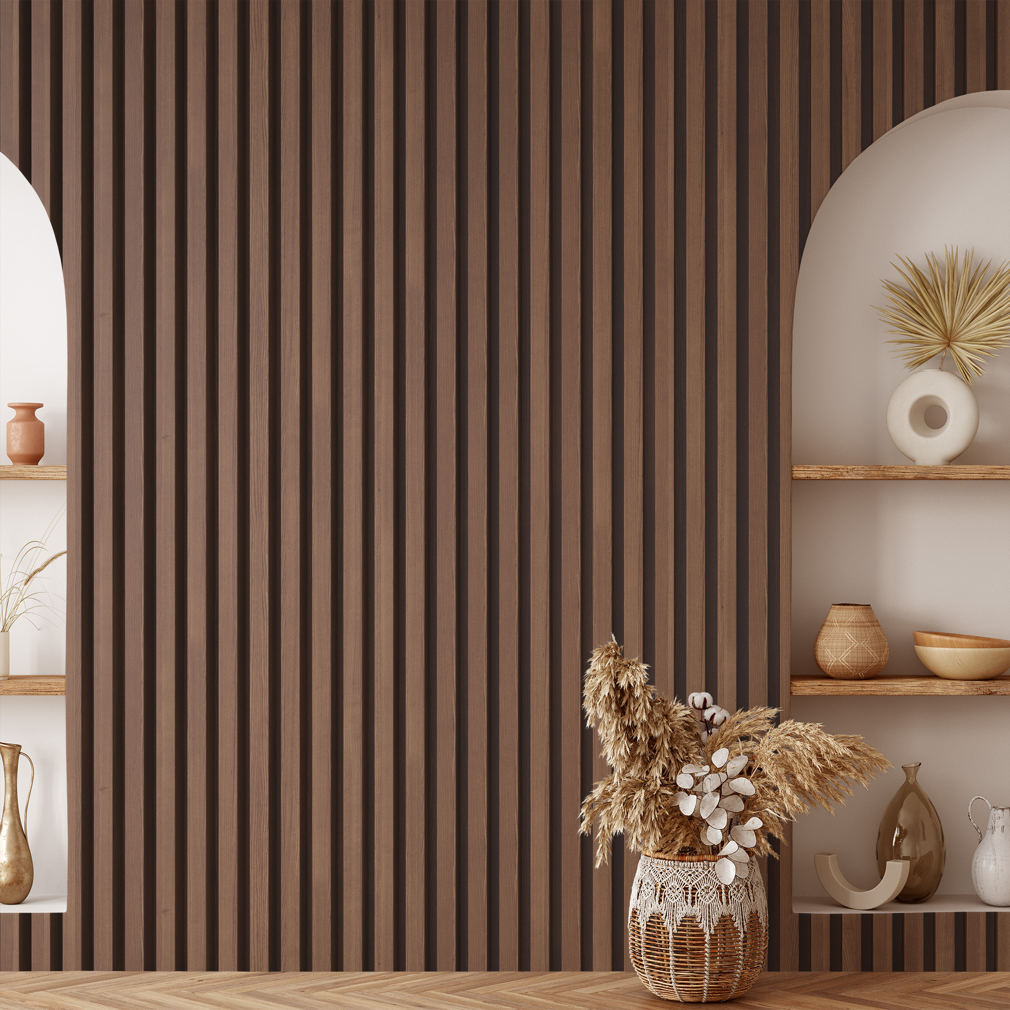 Modern Dark Walnut Vertical Wood Slat Peel and Stick Wallpaper, Architectural Timber Panel Wall Mural, Rustic Industrial Removable Wallpaper faux-0019