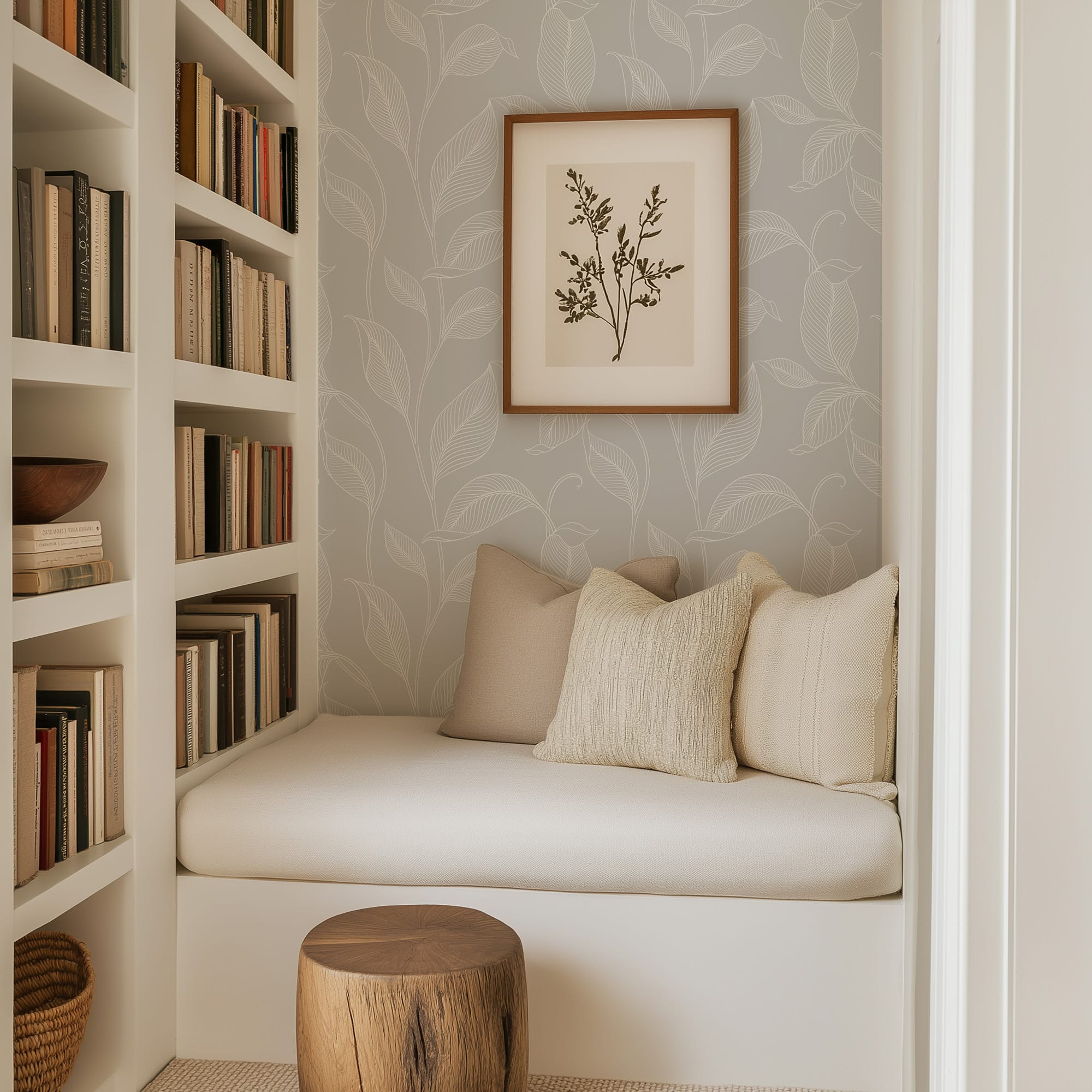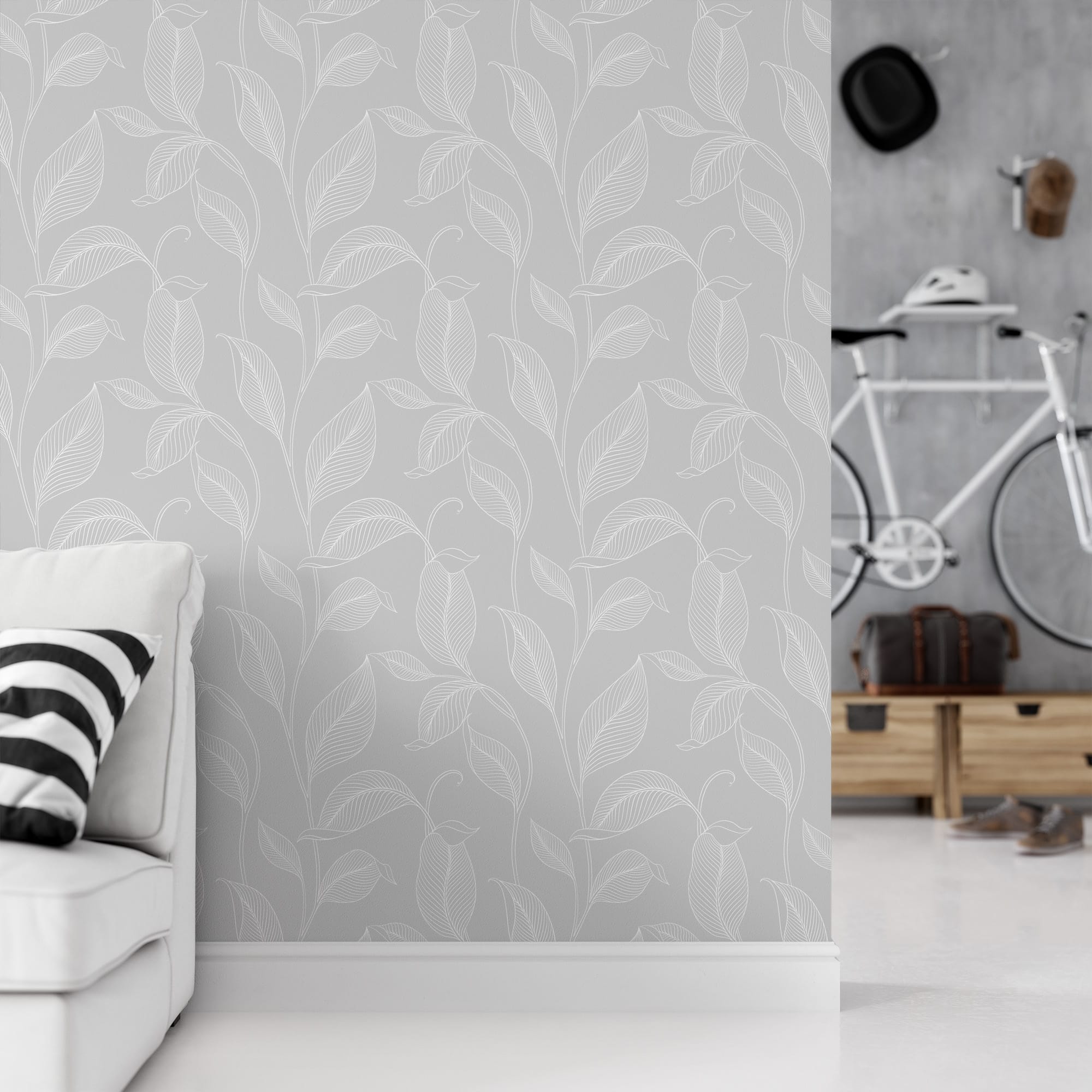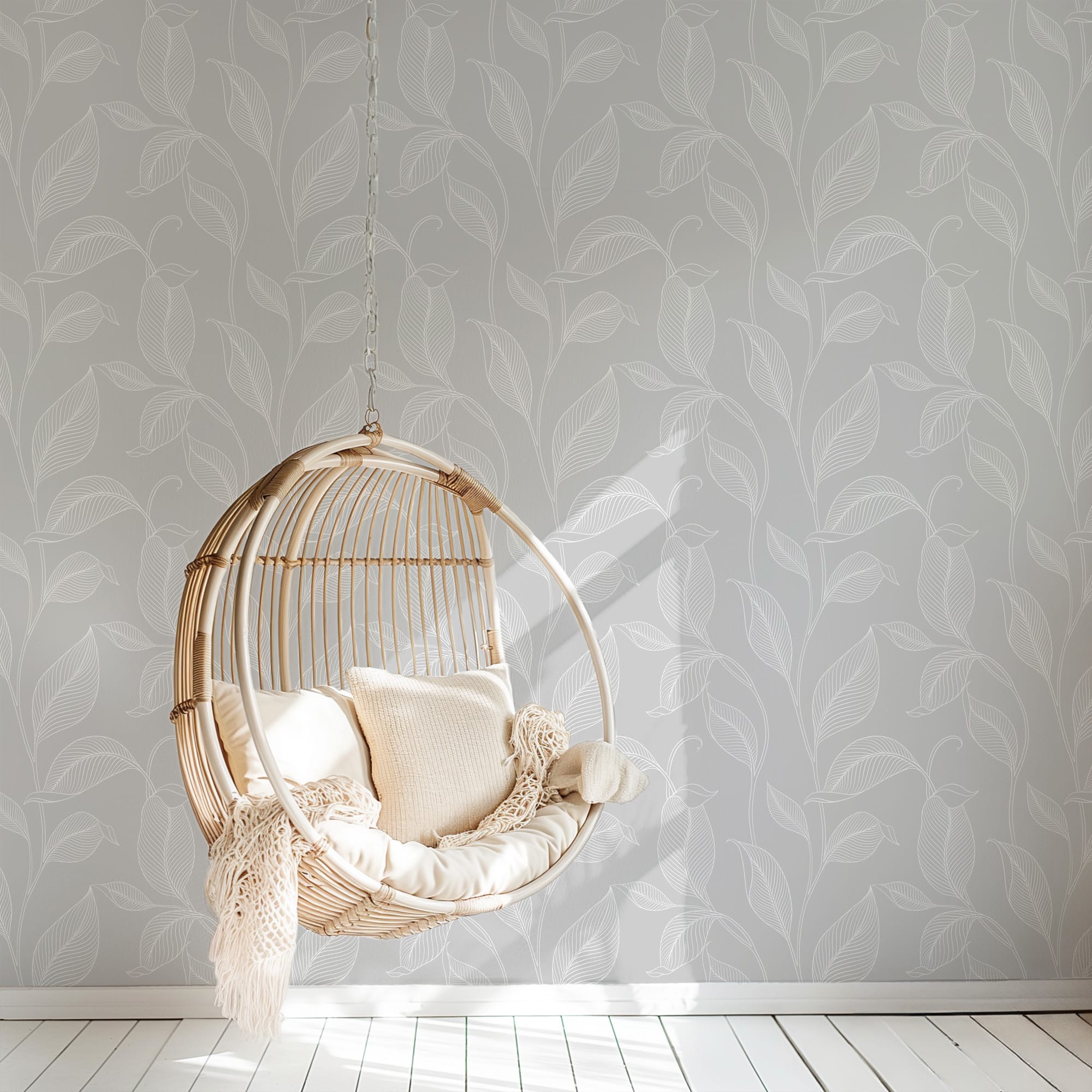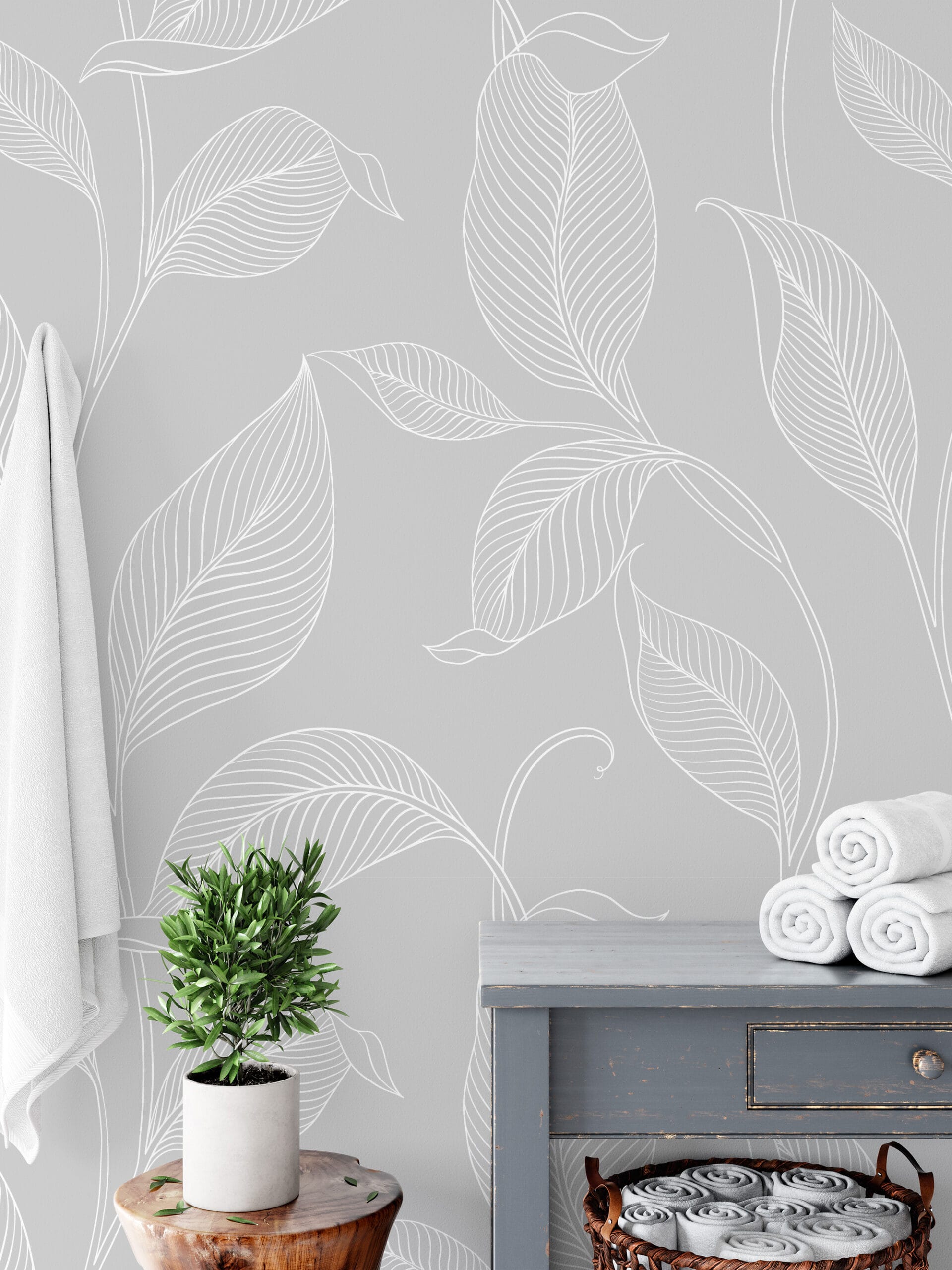 Modern Grey and White Botanical Leaf Line Art Peel and Stick Wallpaper, Minimalist Nature Bathroom Wall Mural lvjg-0024