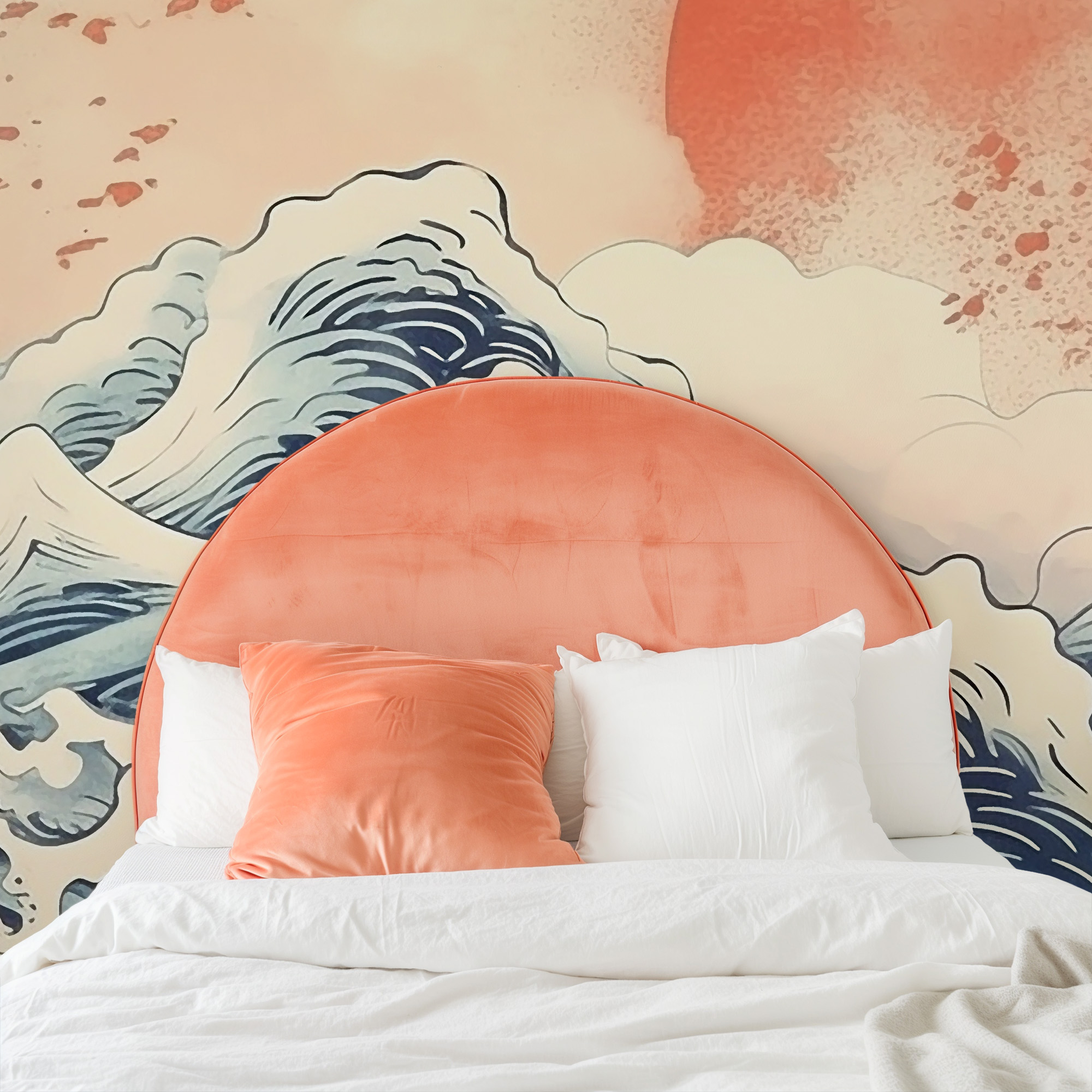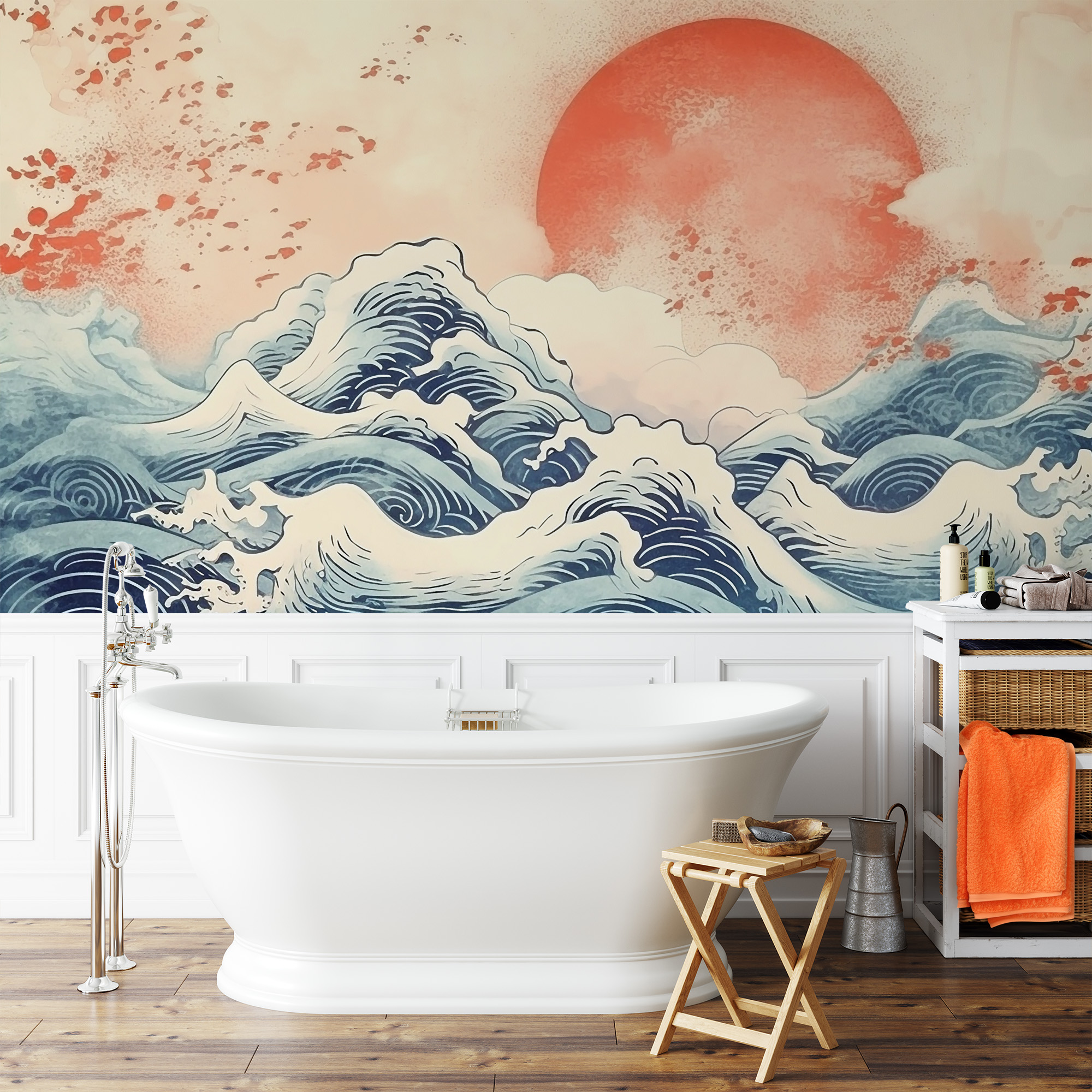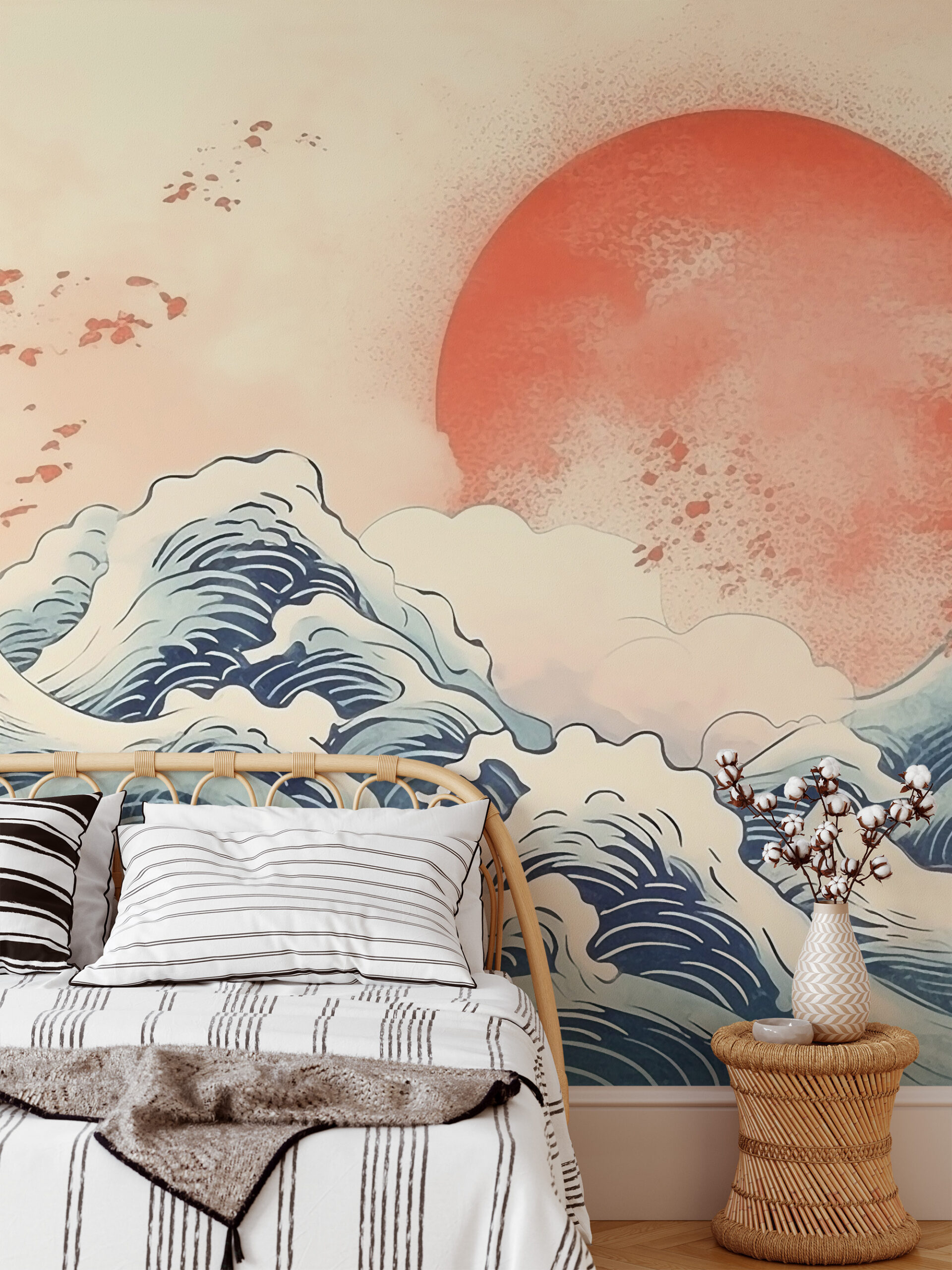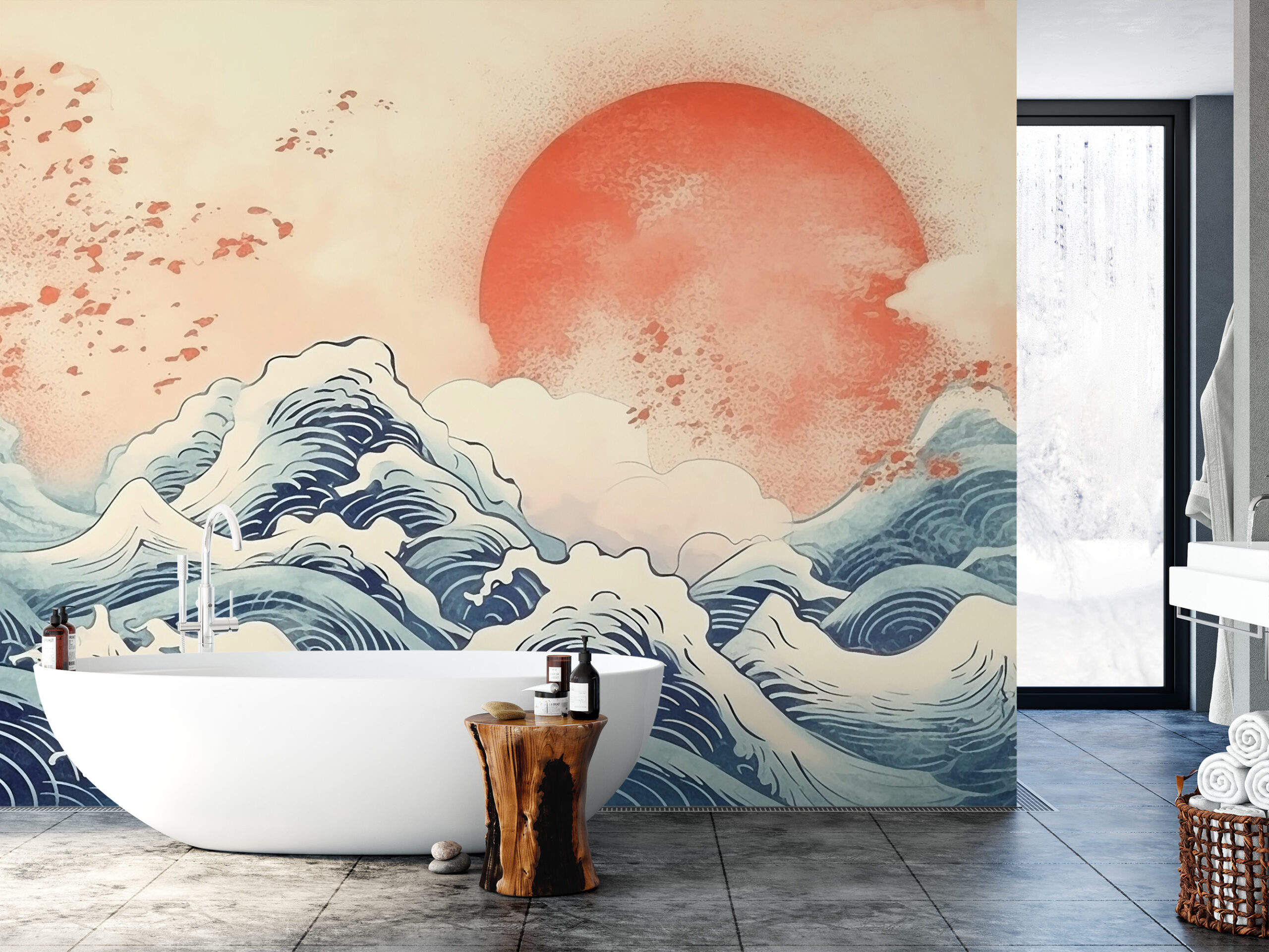 Modern Red Sun and Japanese Waves Peel and Stick Wallpaper, Oriental Ocean Nature Wall Mural ntrs-0046