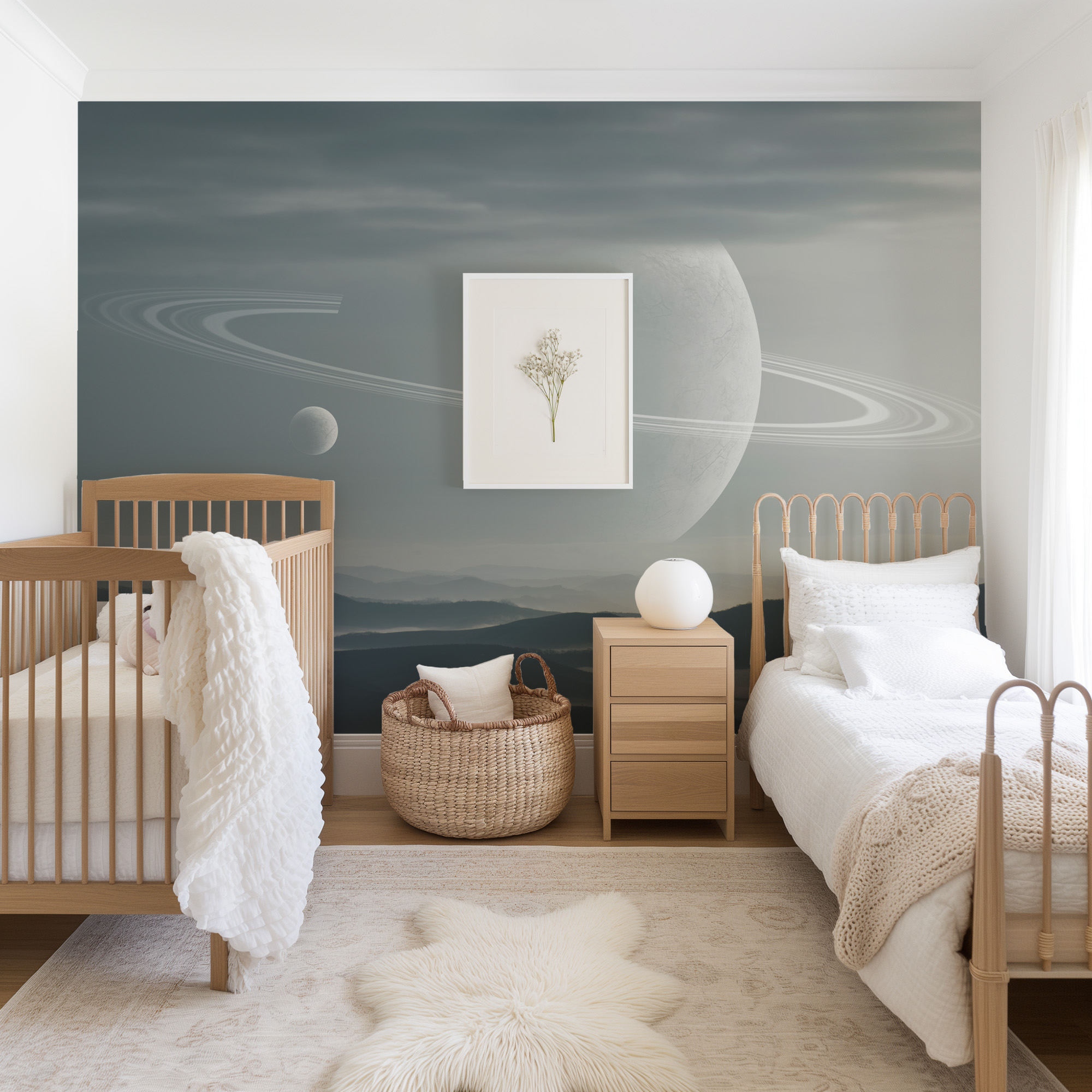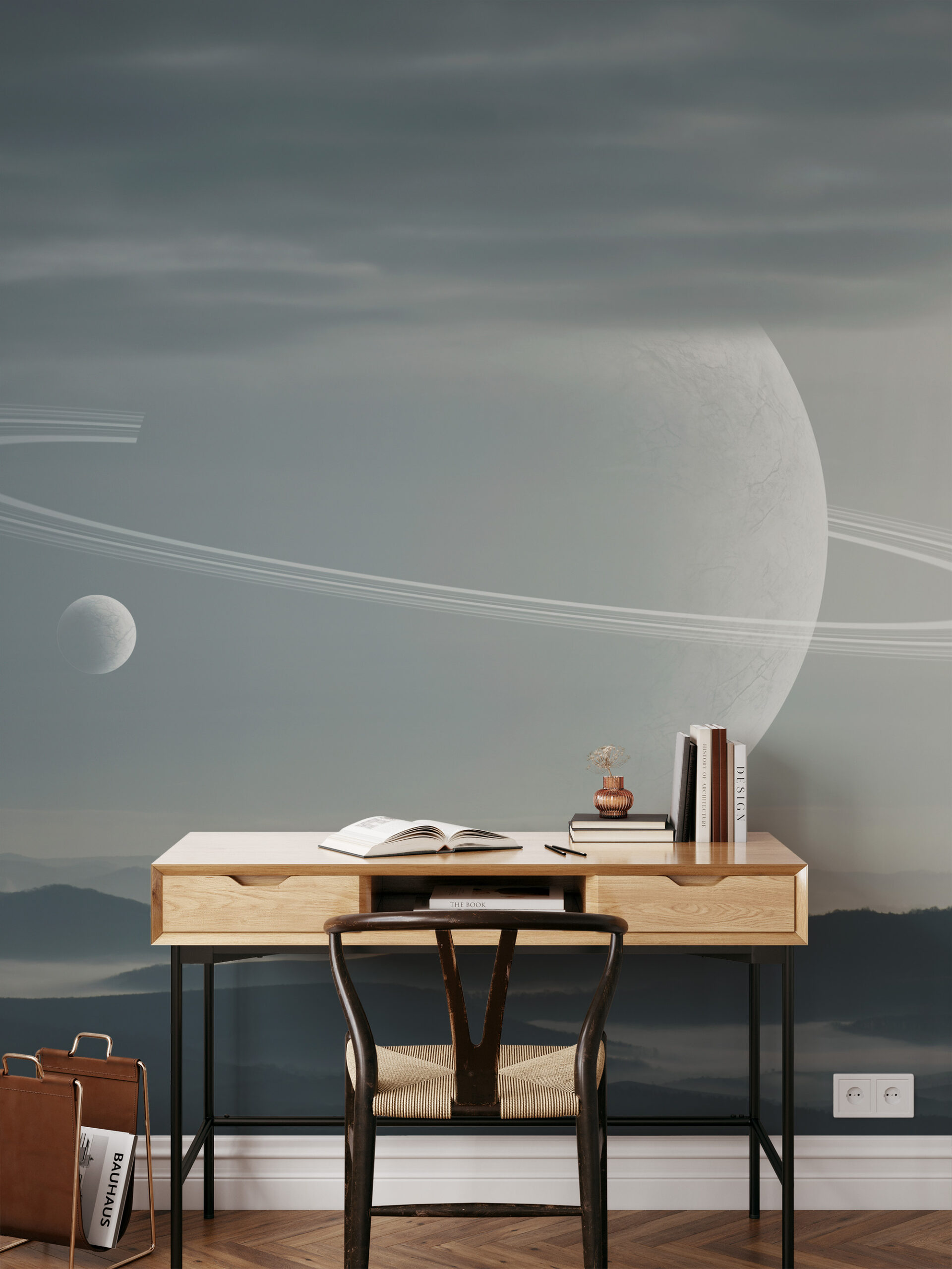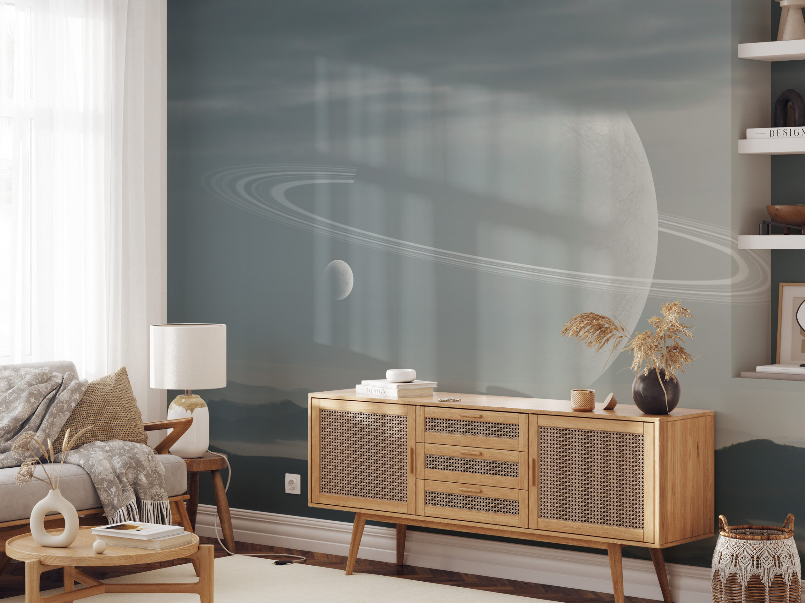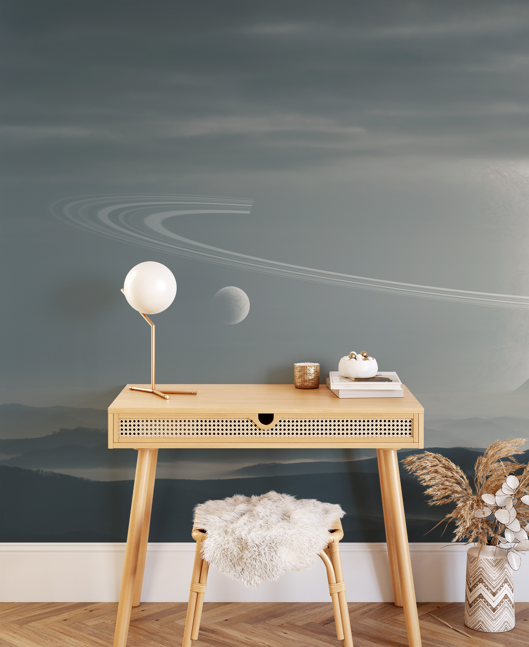 Modern Space Planet with Rings Peel and Stick Wallpaper, Minimalist Cosmic Galaxy Office Wall Mural ntrs-0005