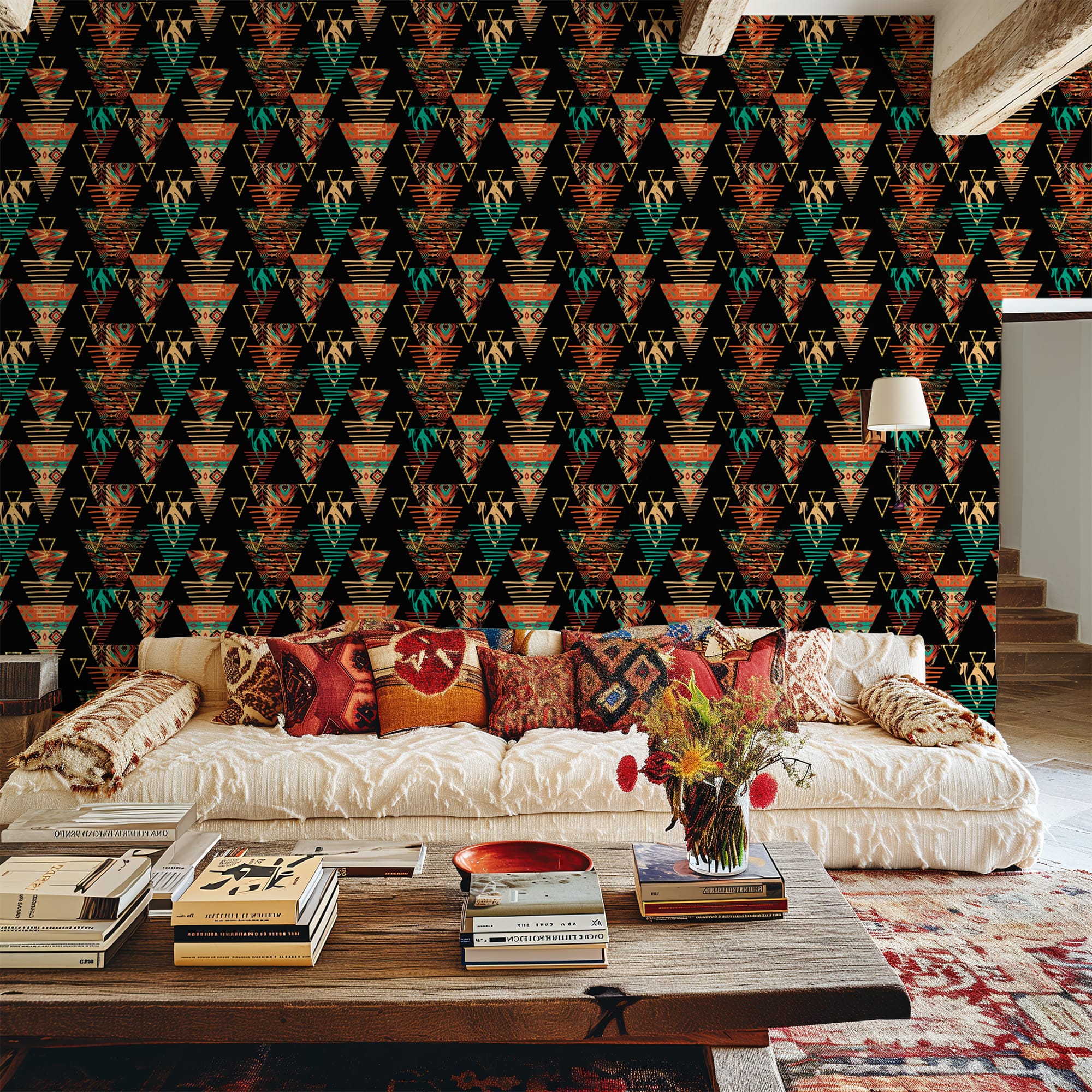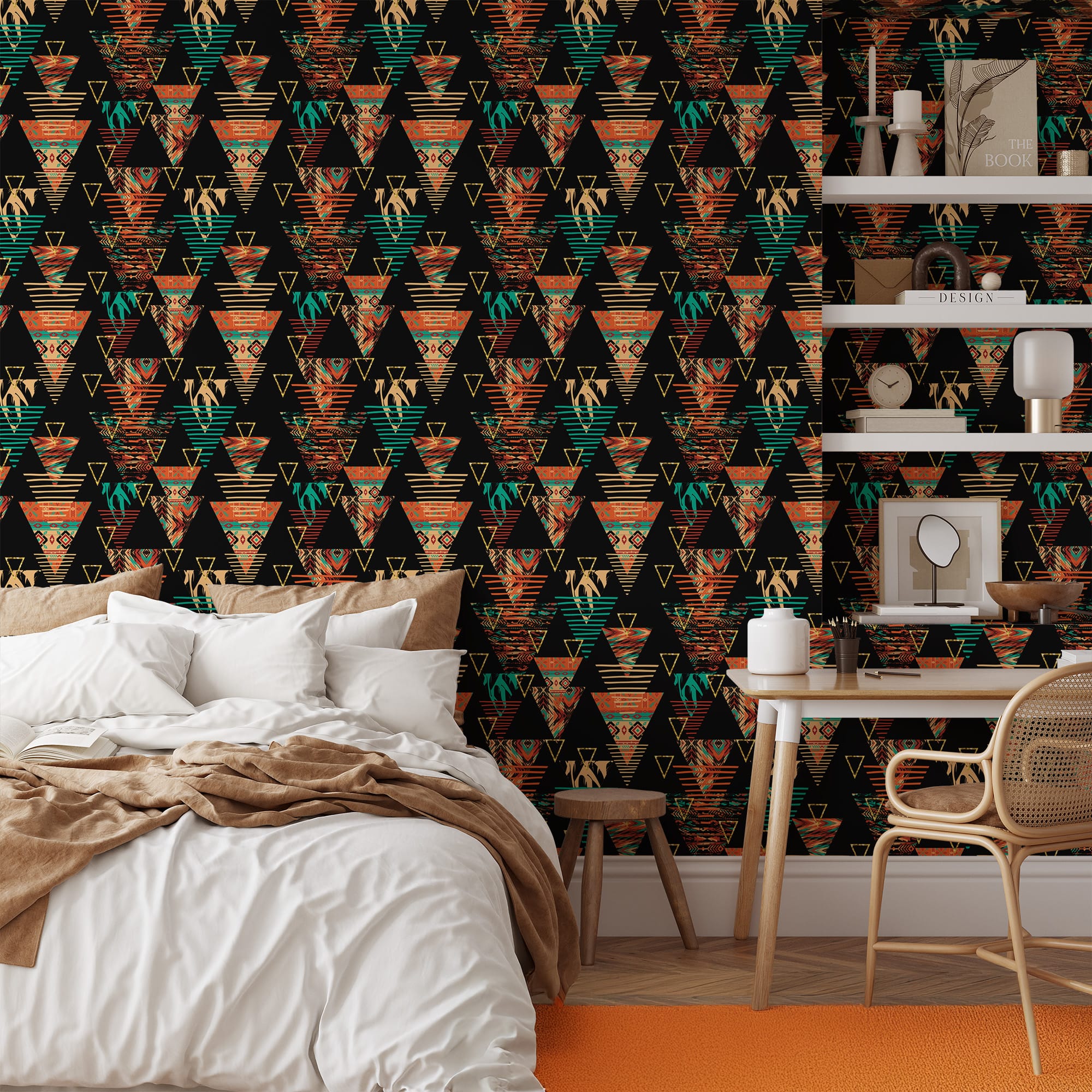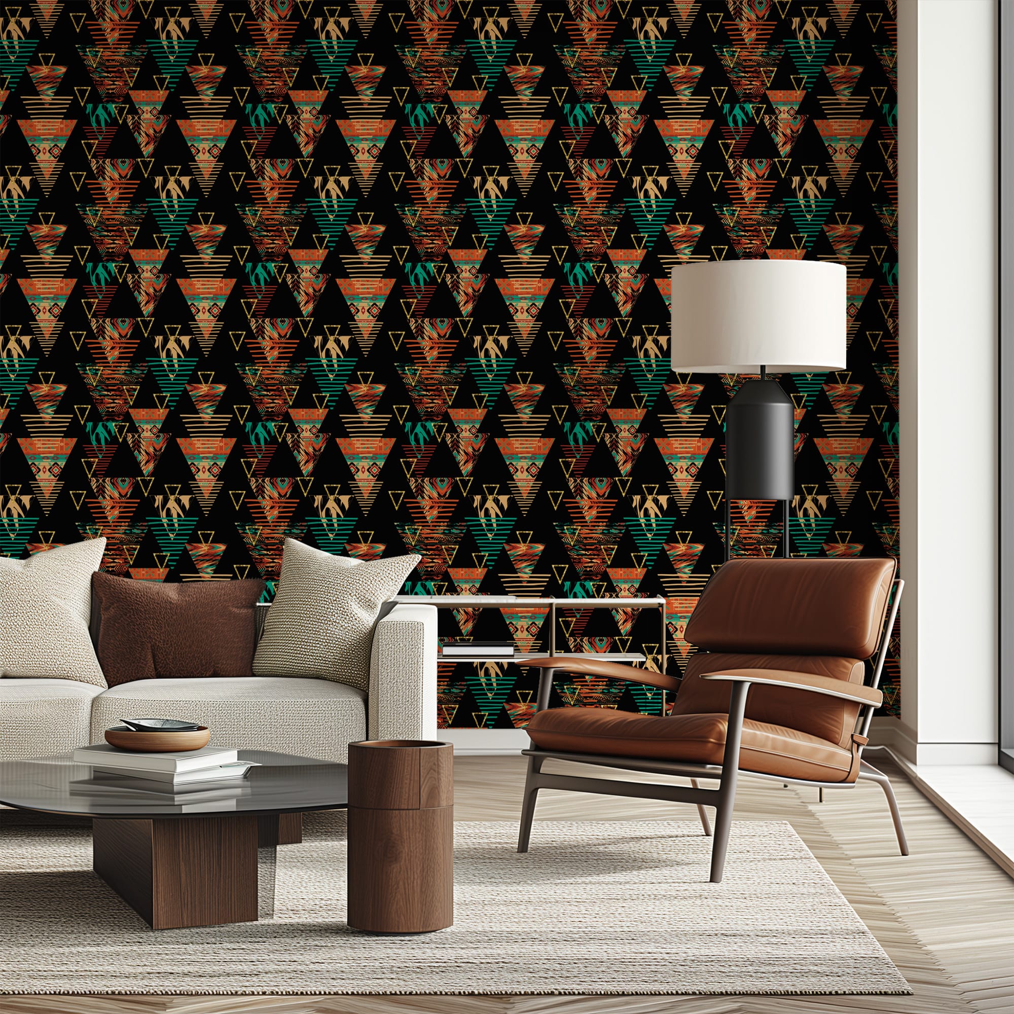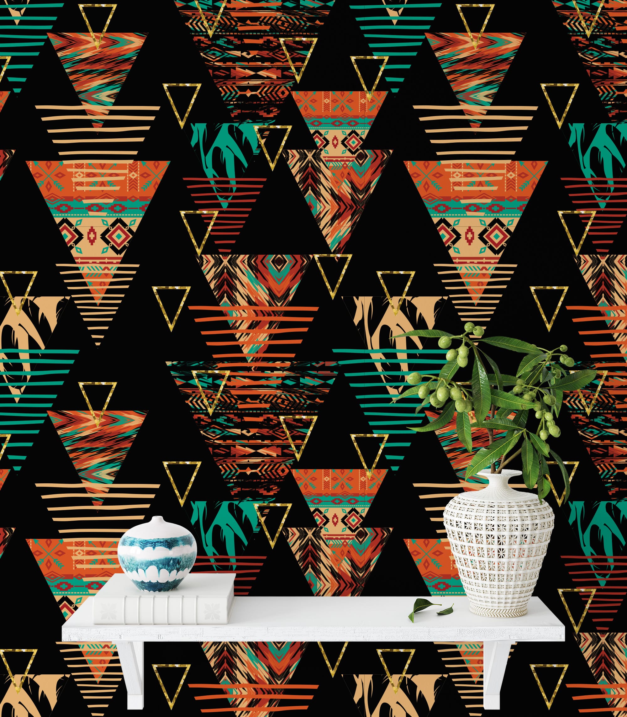 Modern Tribal Geometric Peel and Stick Wallpaper, Ethnic Triangle Pattern Wall Mural, Colorful Bohemian African Inspired Removable Wallpaper abst-0027