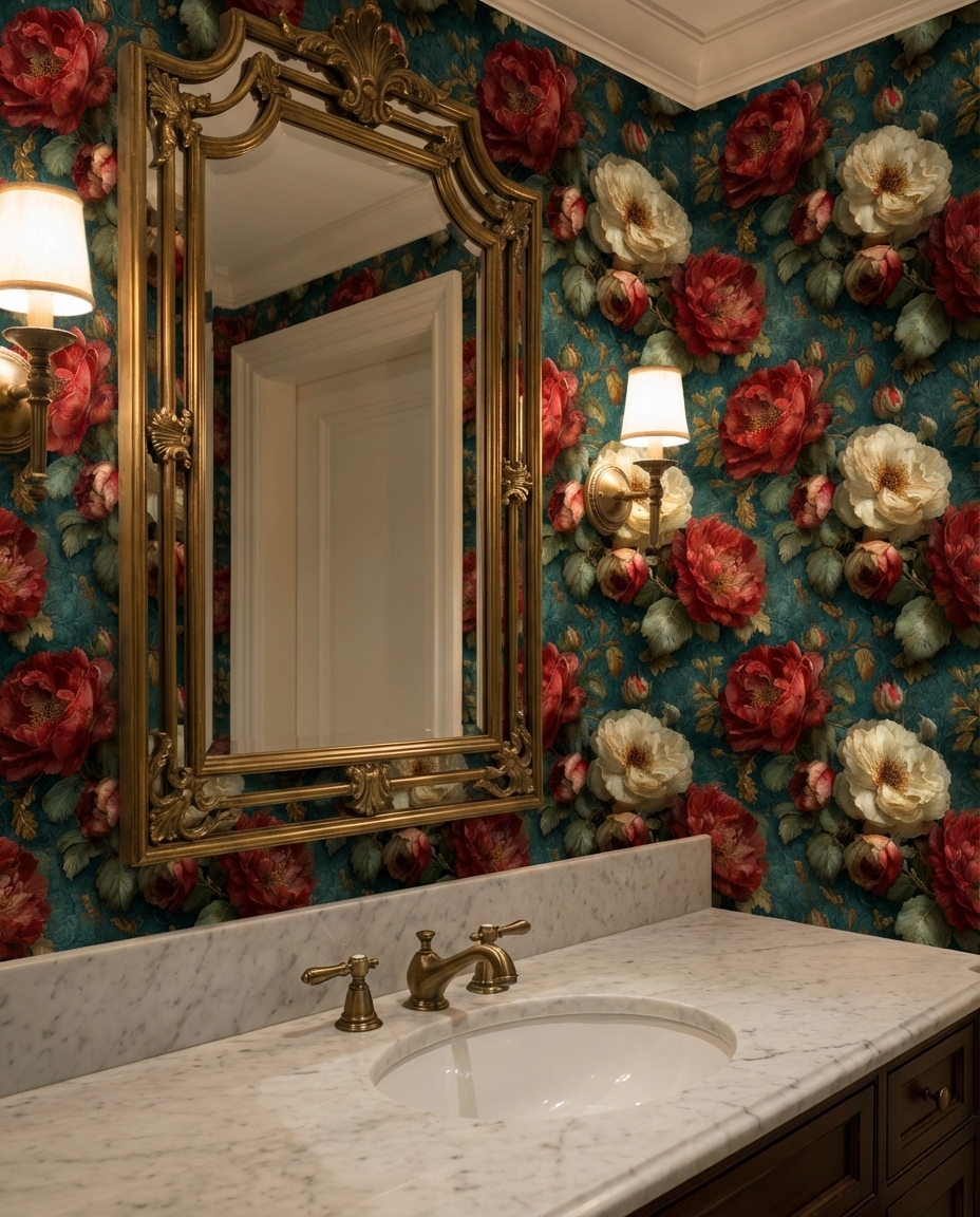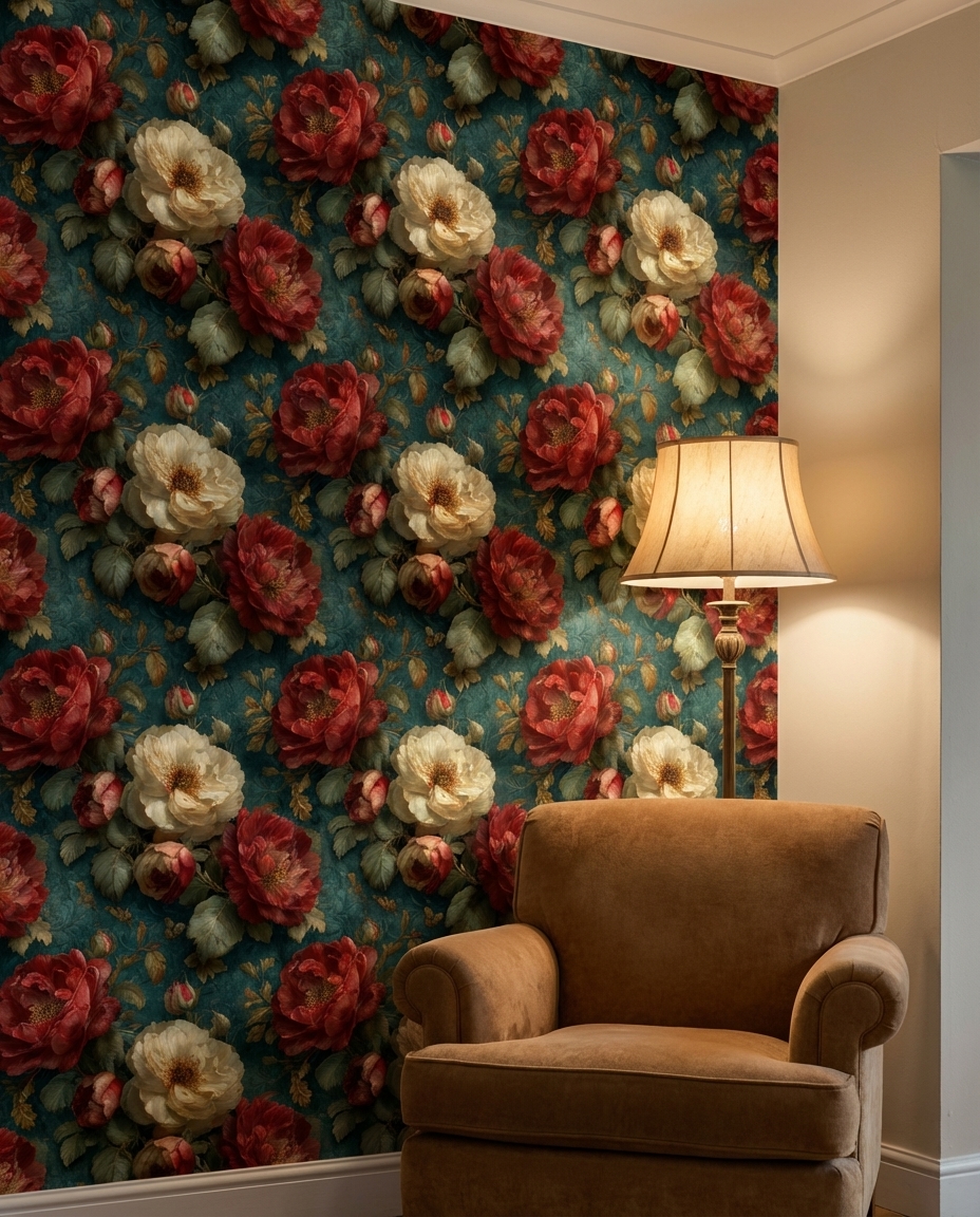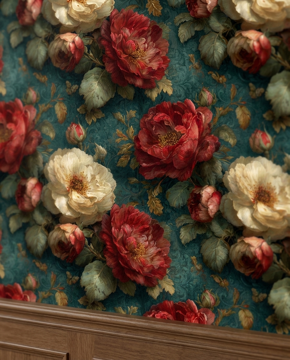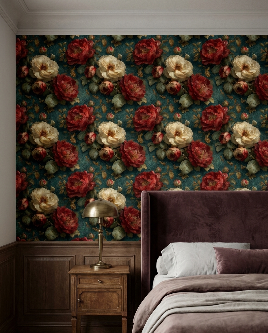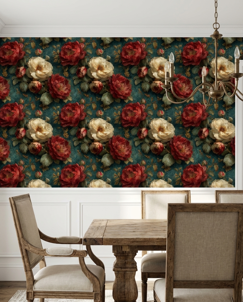Modern Vintage Dark Teal and Red Floral Peel and Stick Wallpaper, Moody Victorian Rose Wall Mural m-flrl-005
