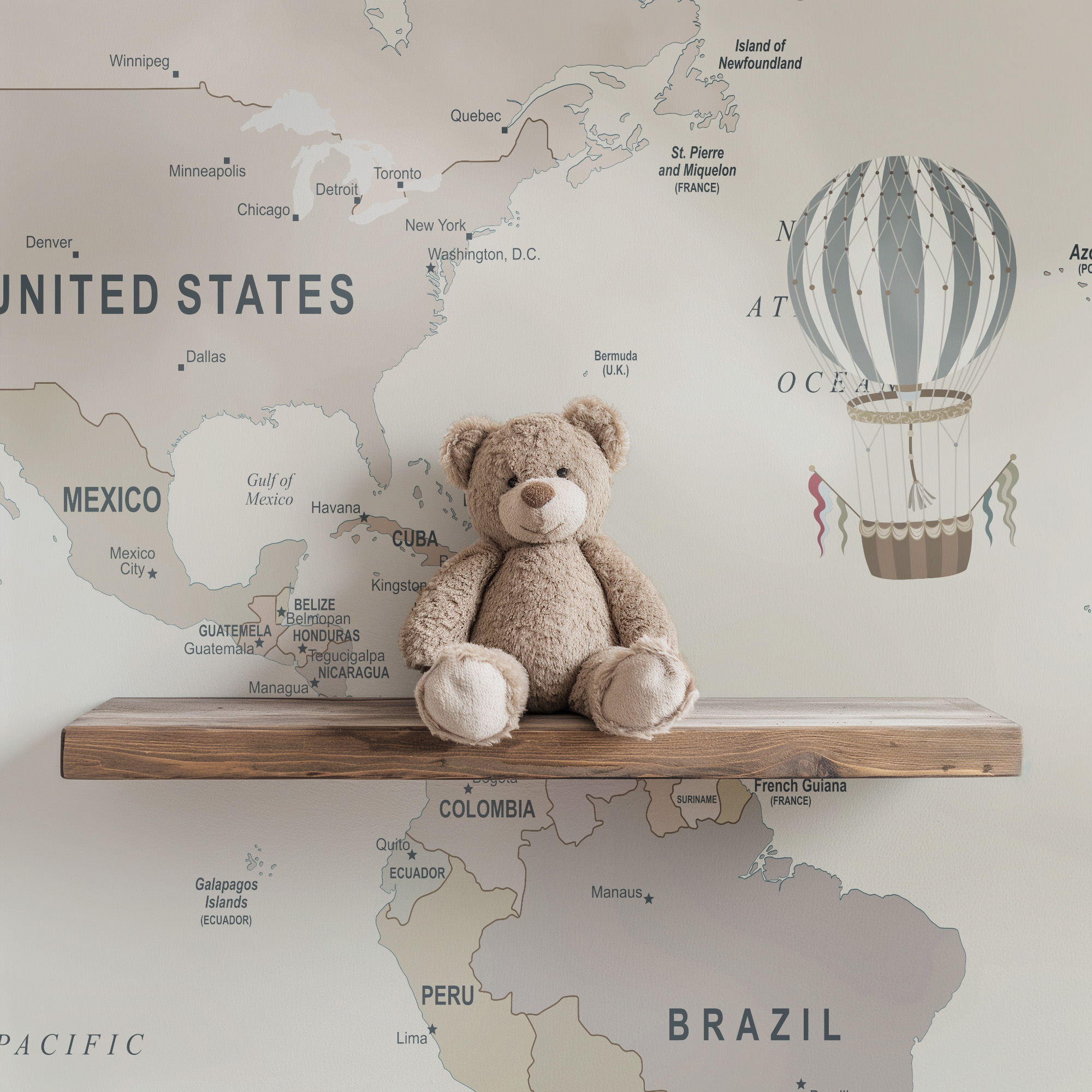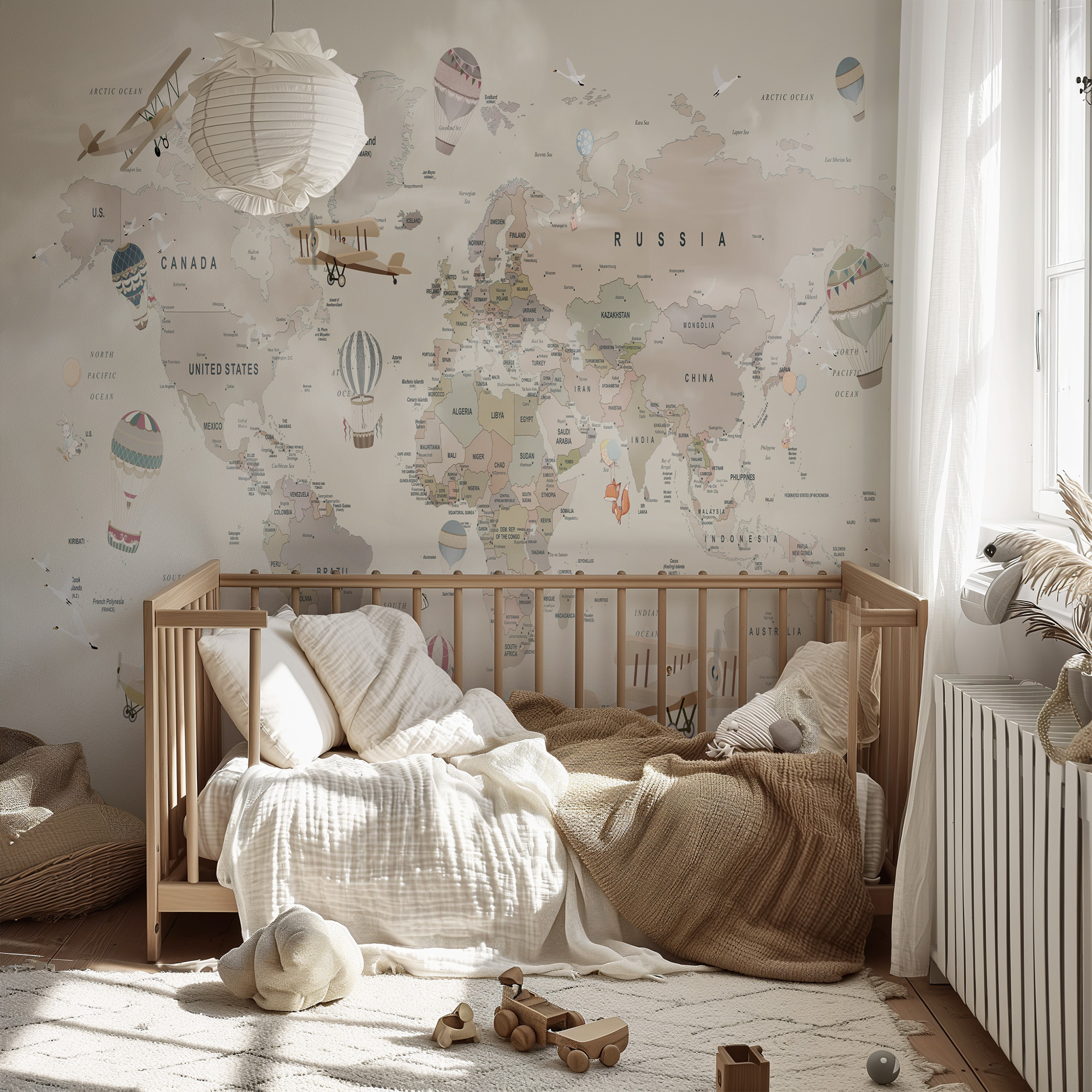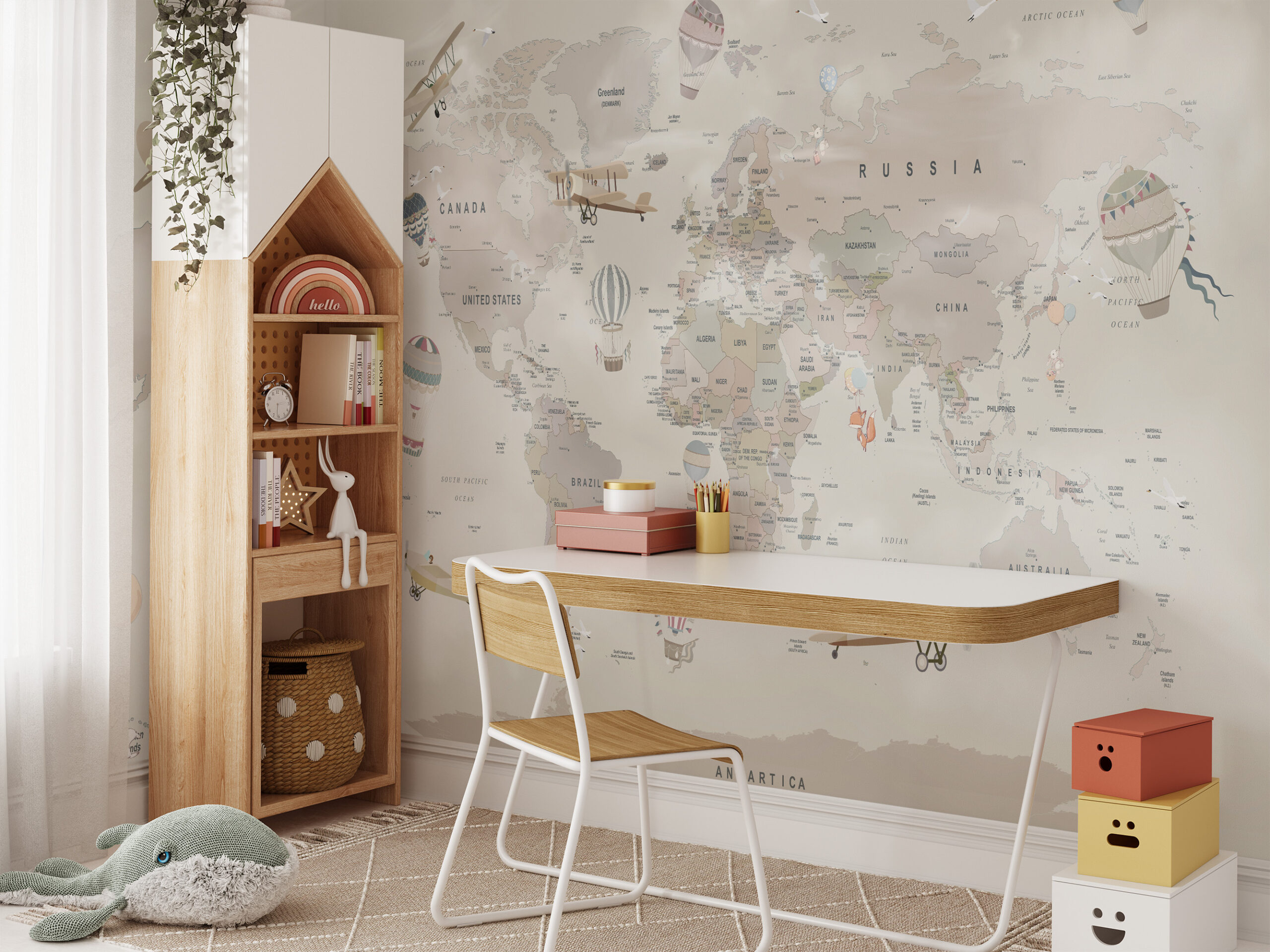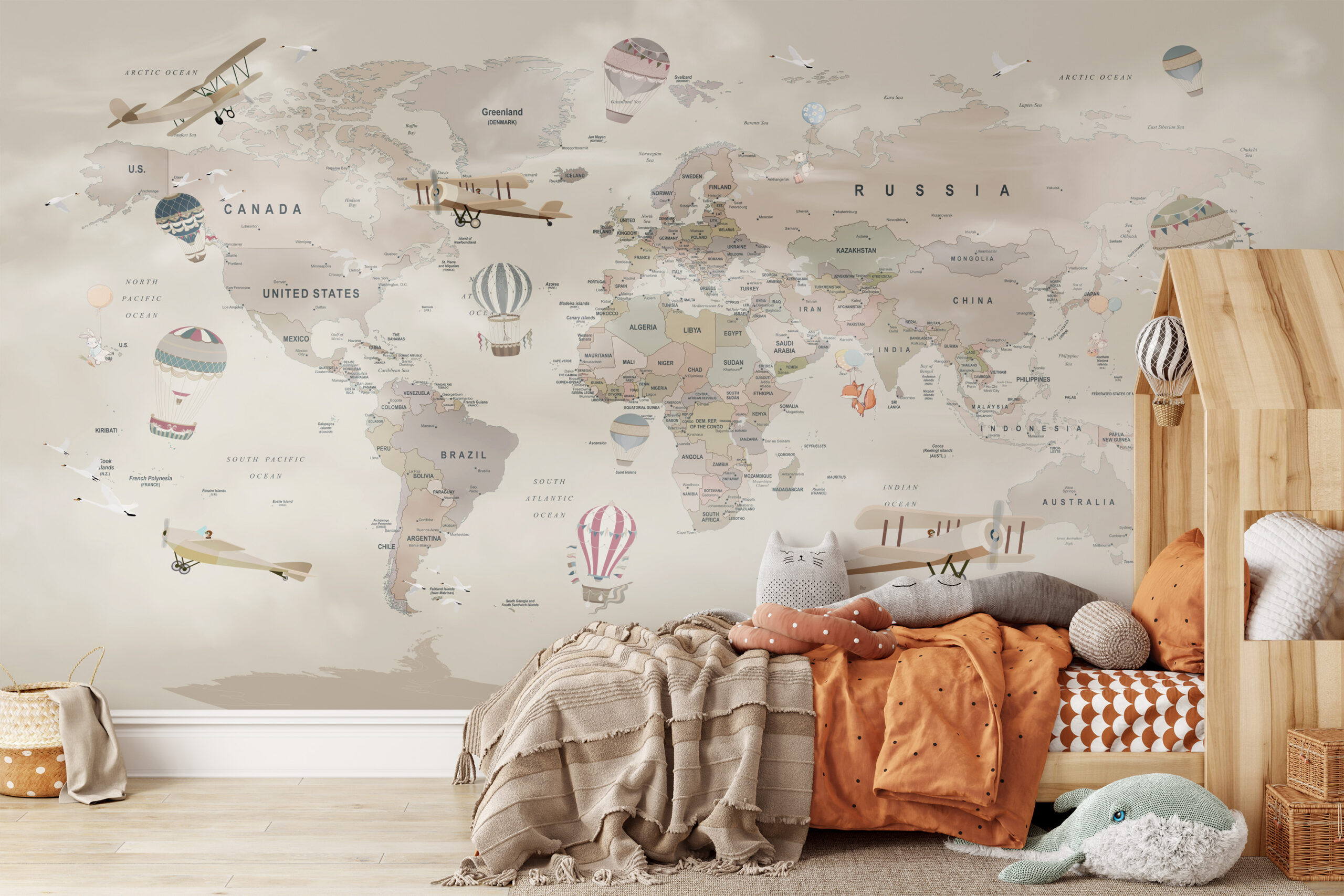 Modern Vintage World Map with Airplanes Peel and Stick Wallpaper, Educational Neutral Kids Room Wall Mural wrsp-0004