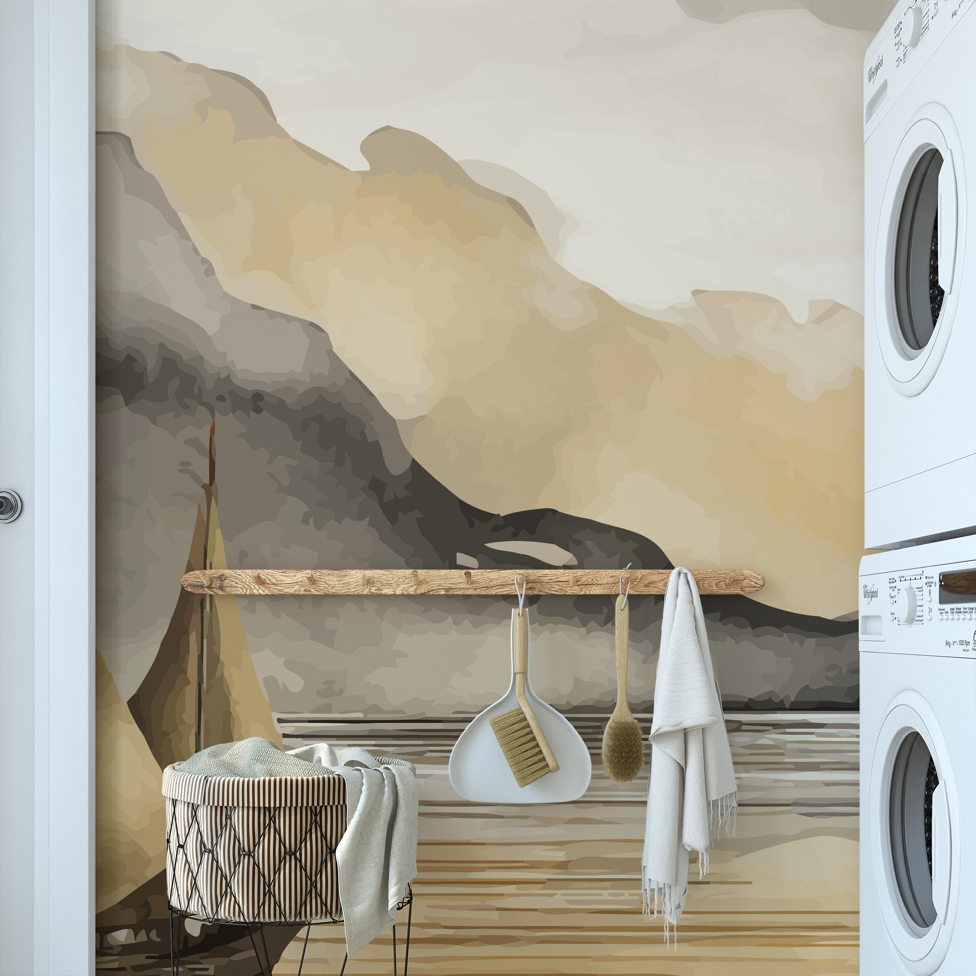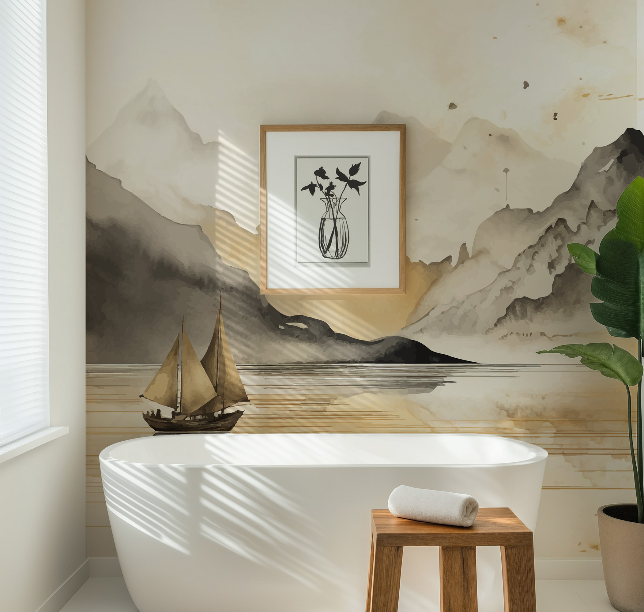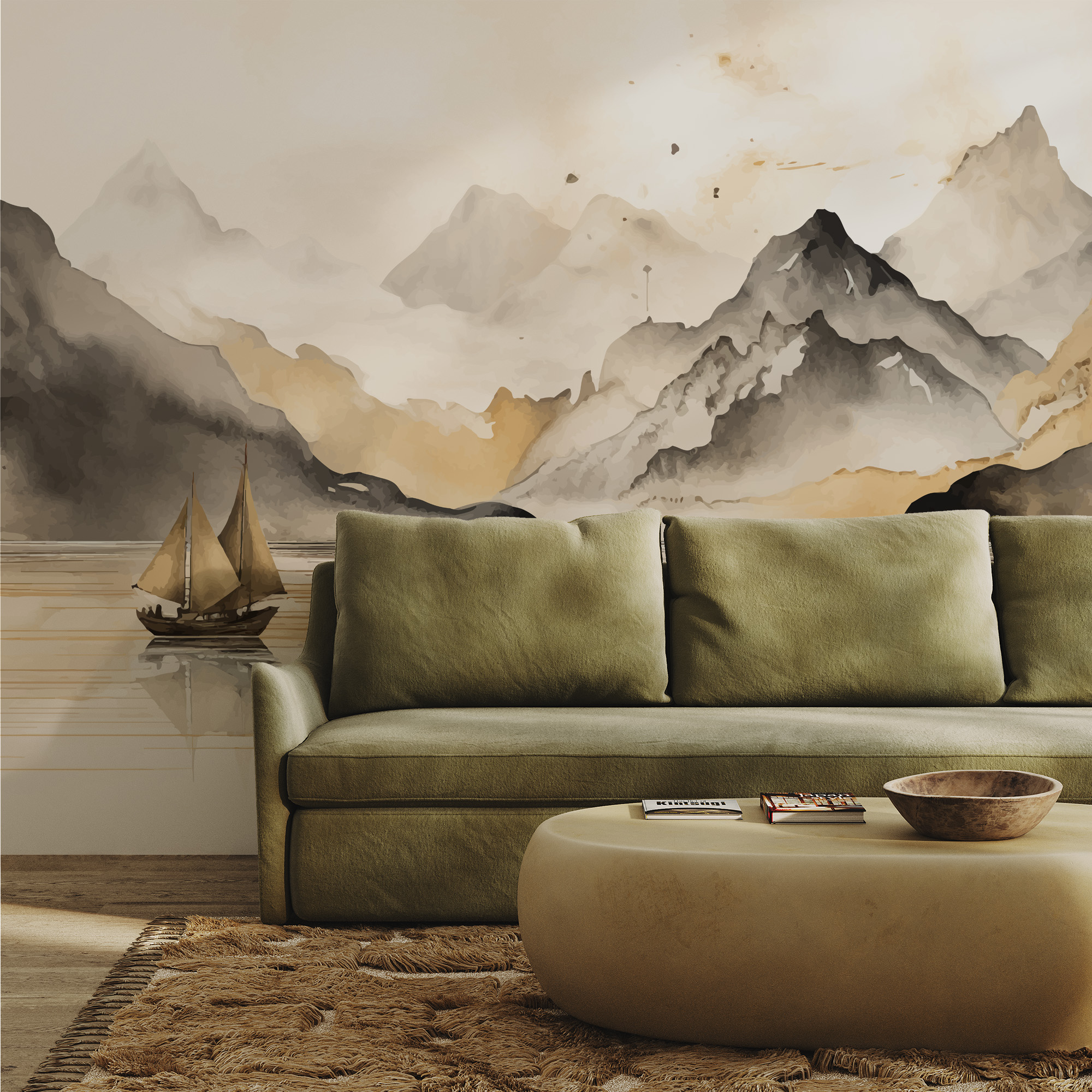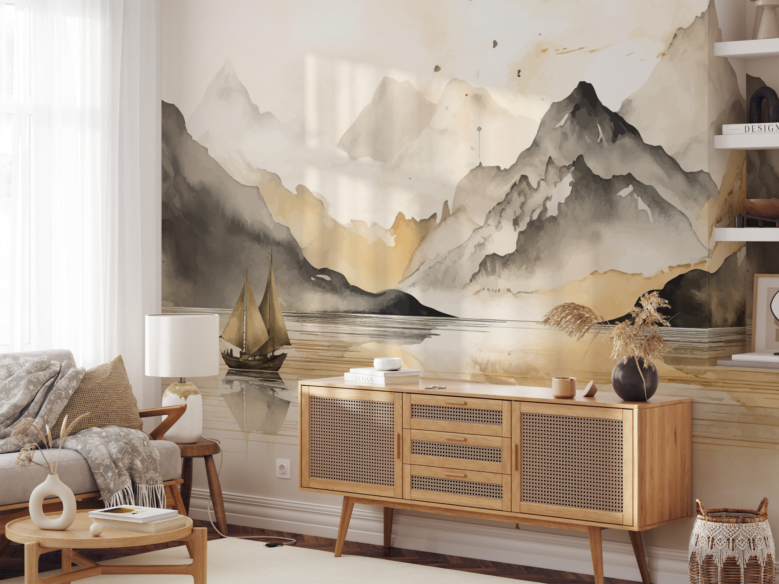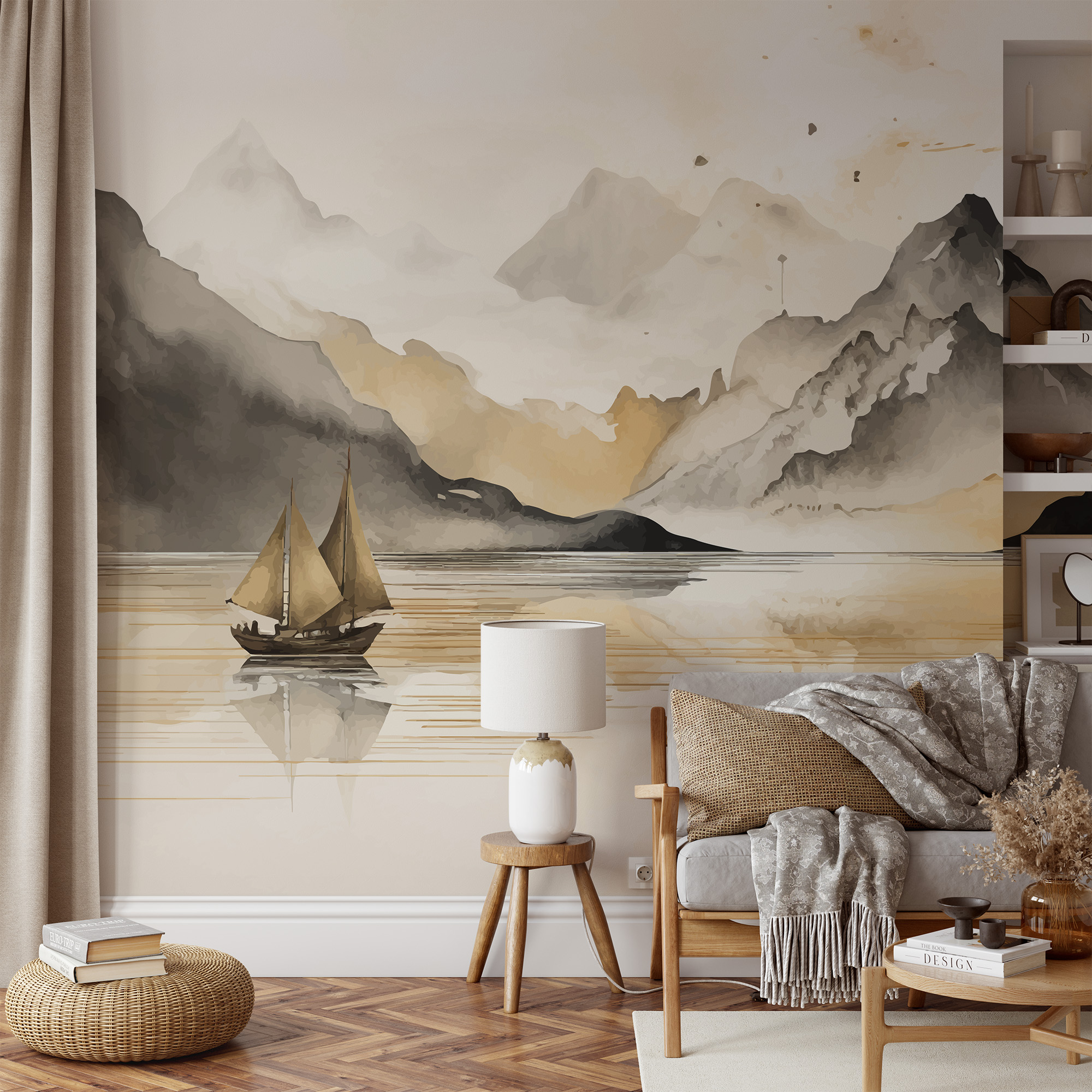 Modern Watercolor Mountain and Sailboat Peel and Stick Wallpaper, Serene Gold and Grey Nature Living Room Wall Mural ntrs-0032