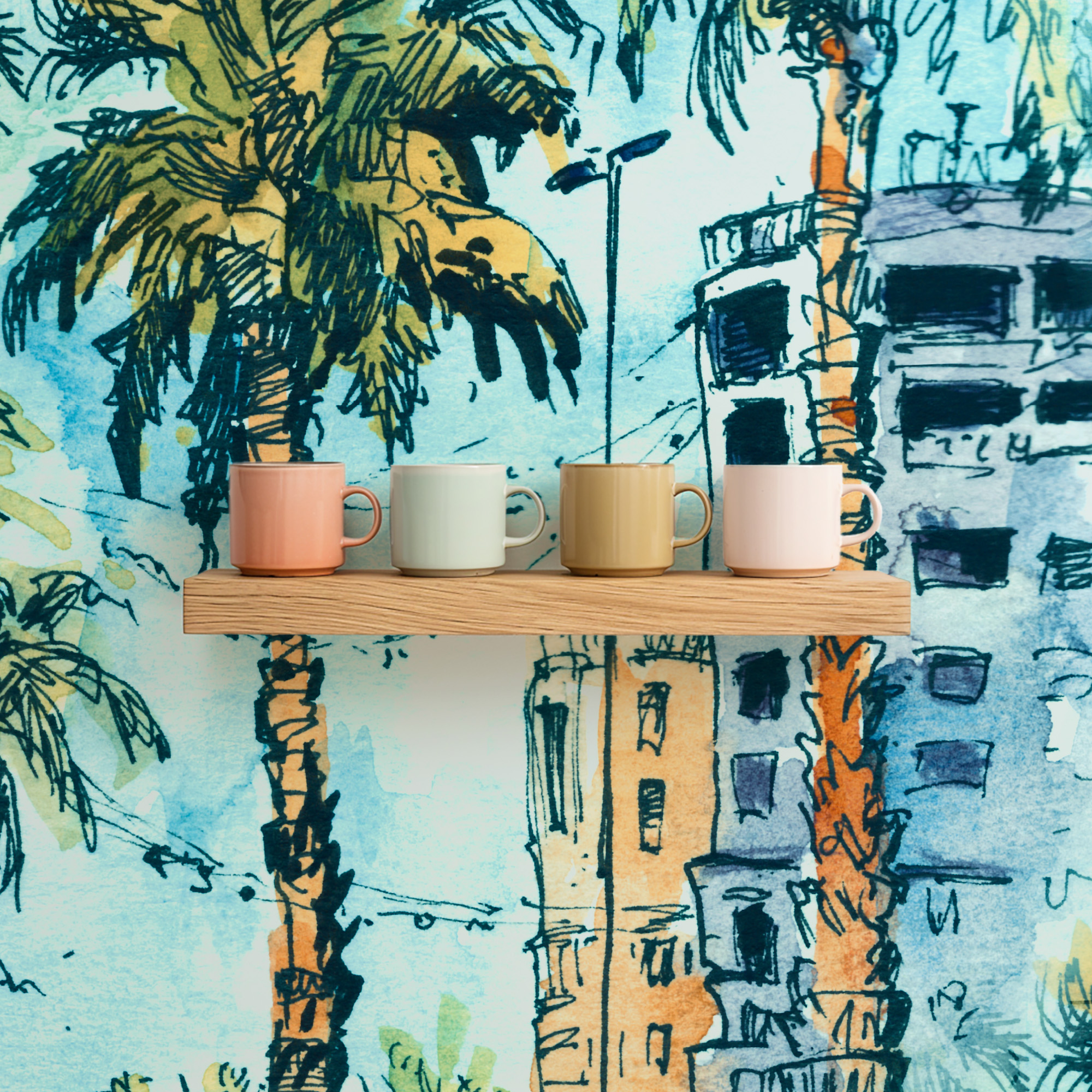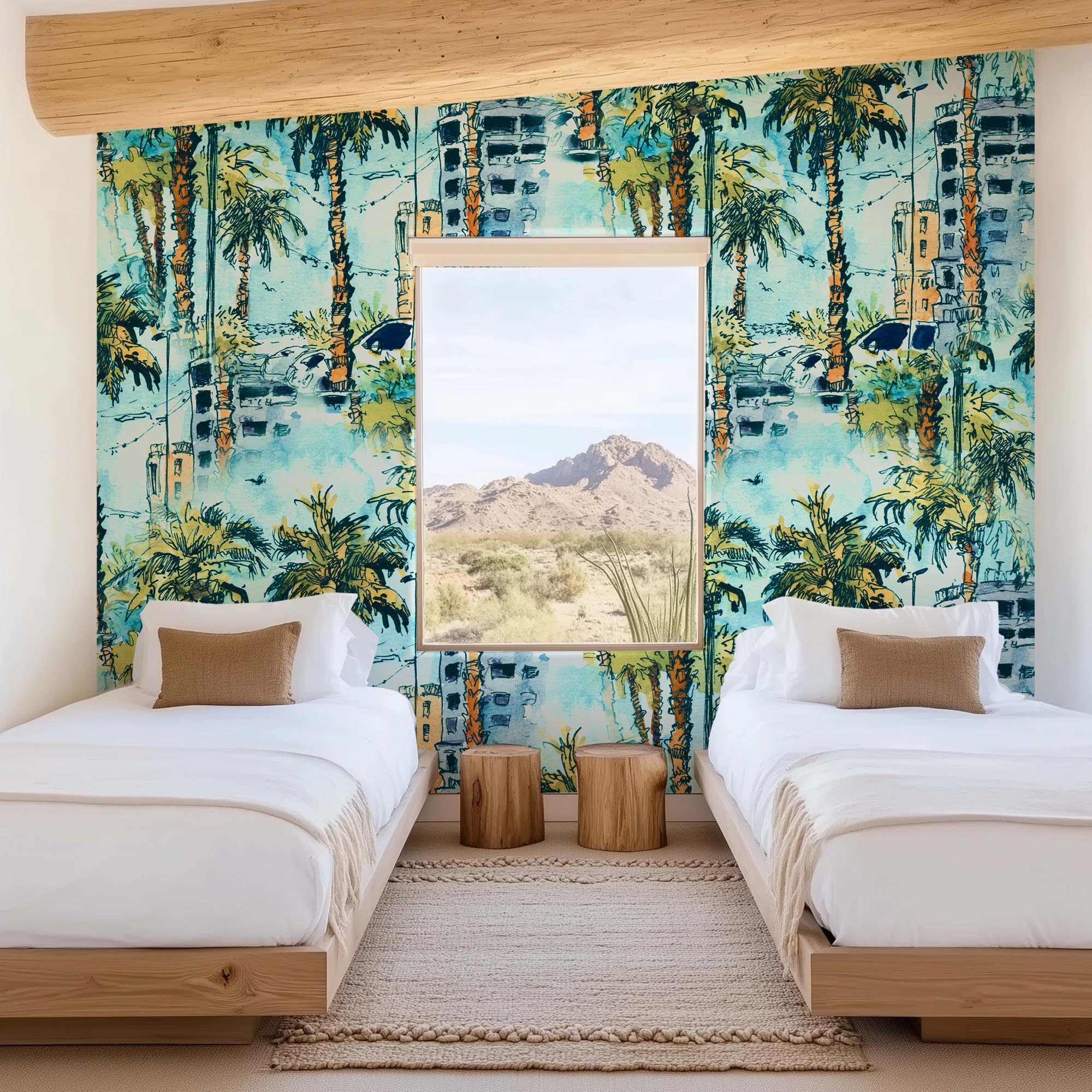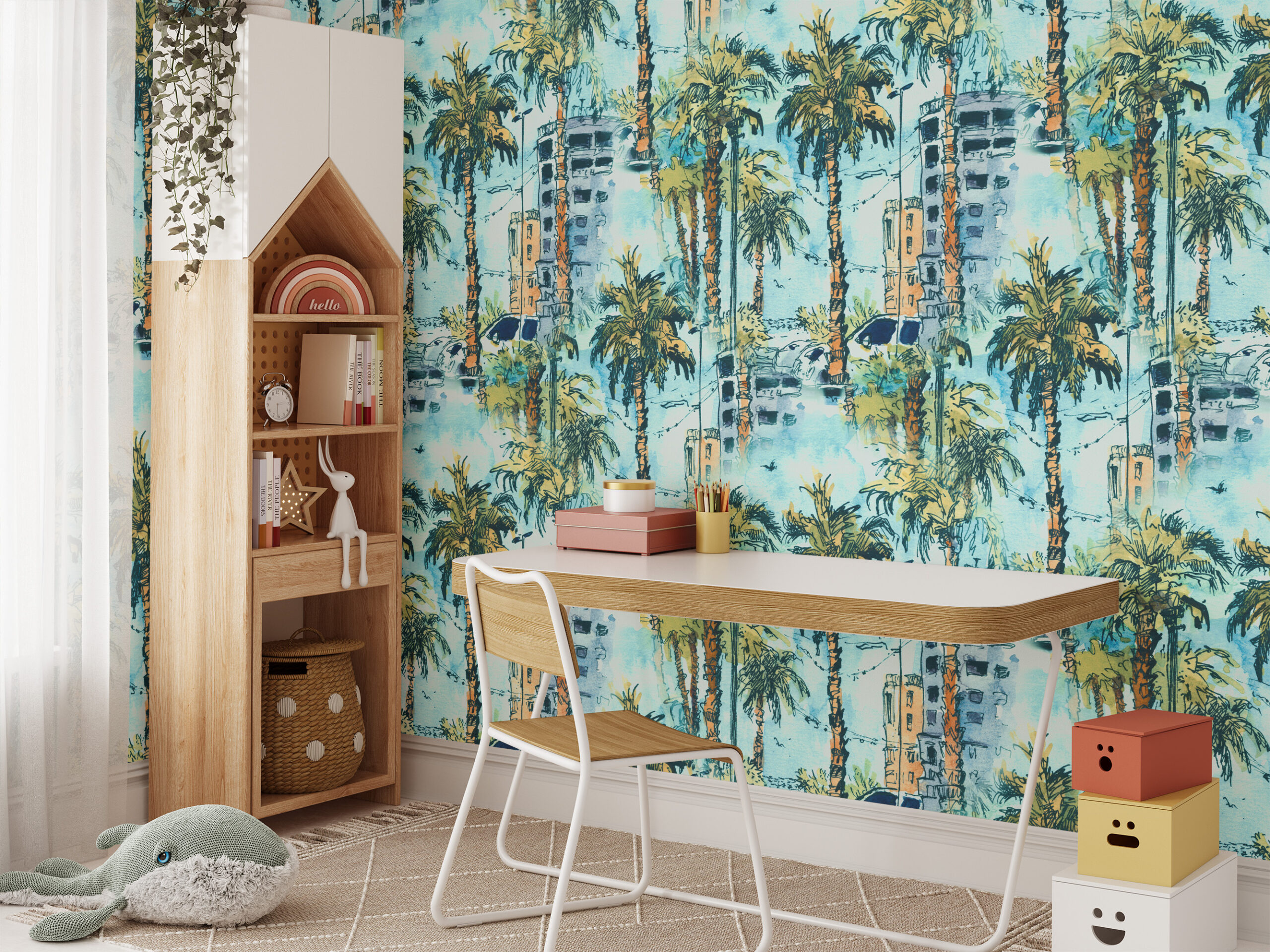 Modern Watercolor Tropical Palm Tree and City Peel and Stick Wallpaper, Artistic Coastal Living Room Wall Mural ntrs-0002