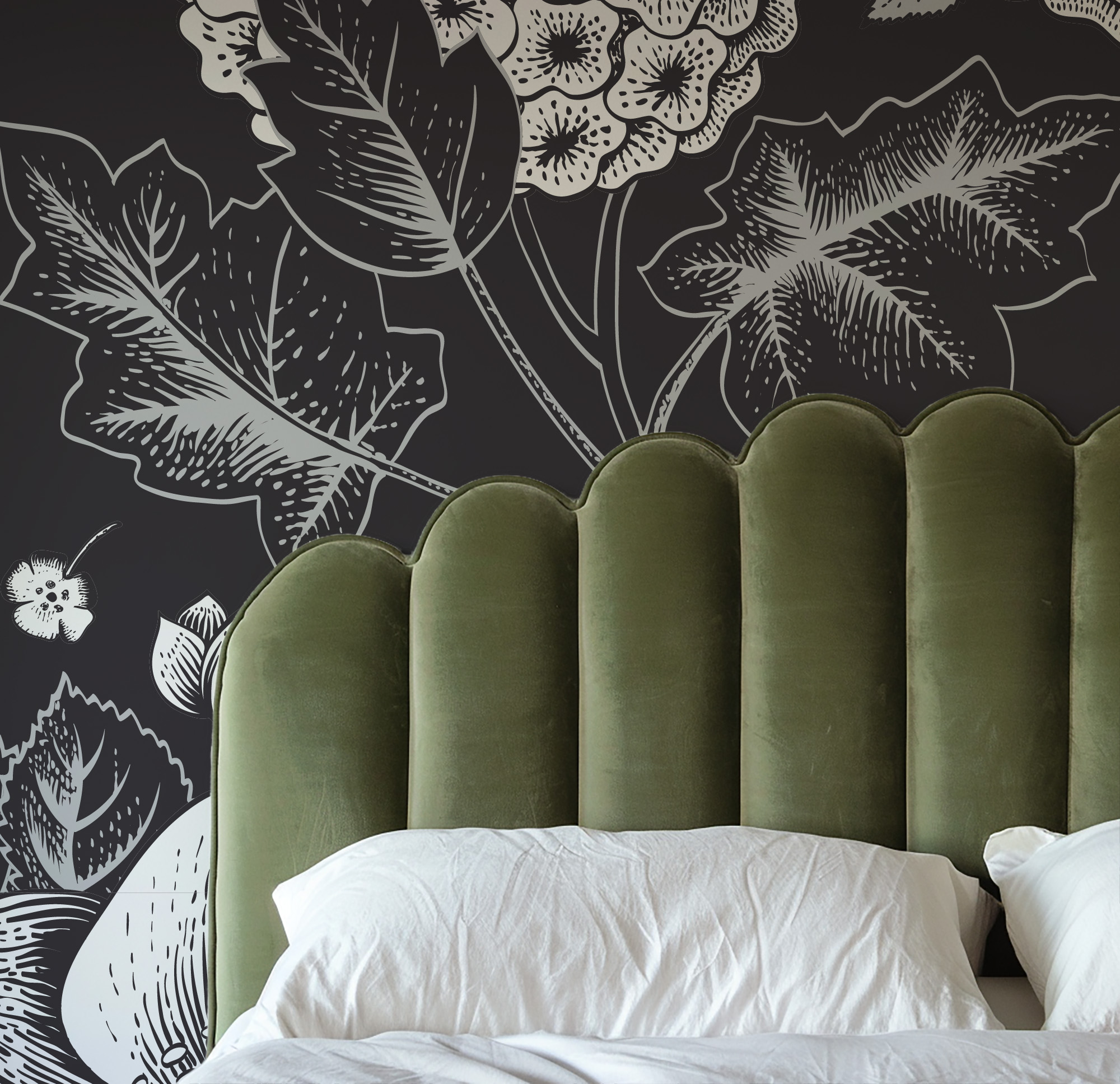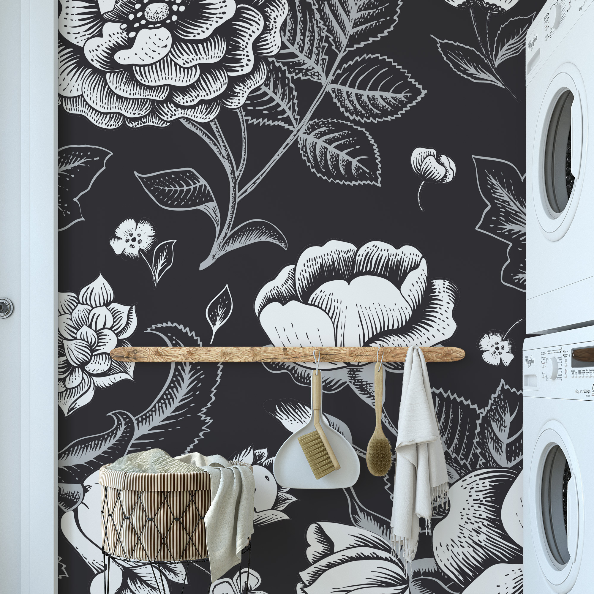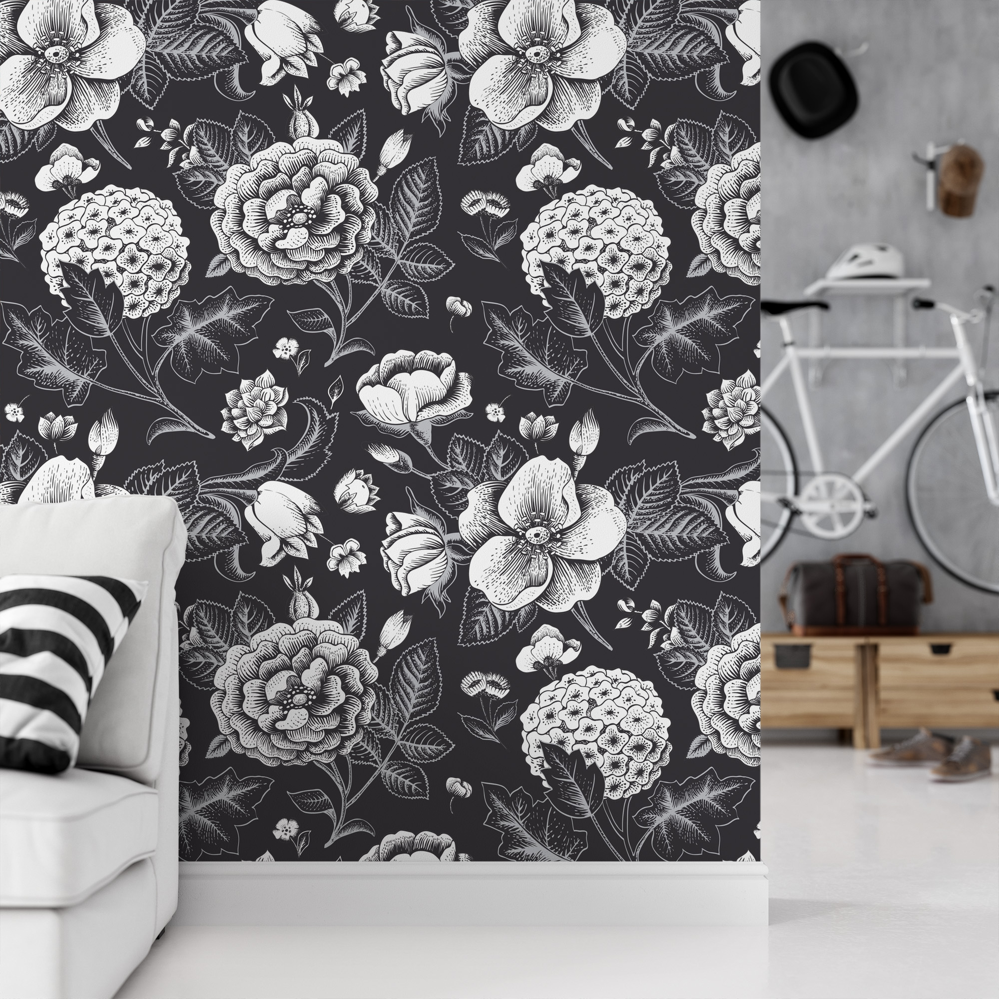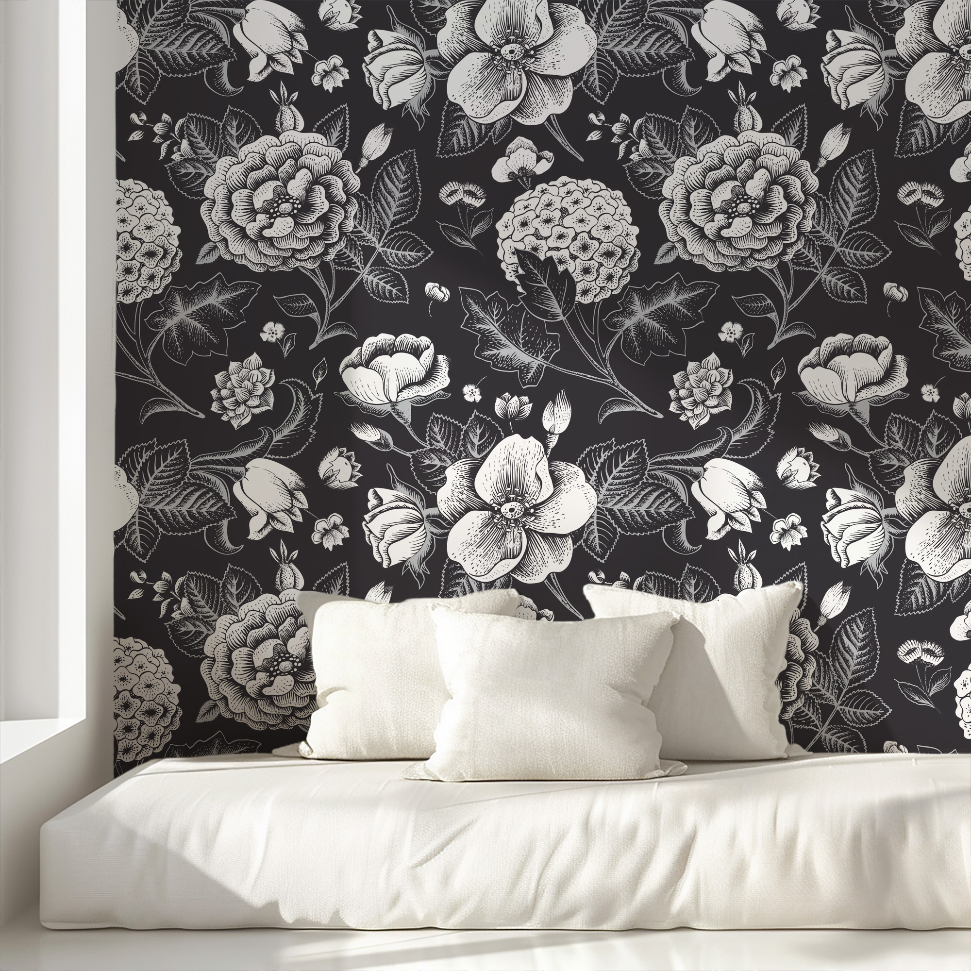 Moody Black and White Floral Peel and Stick Wallpaper, Vintage Botanical Sketch Wall Mural, Large Rose and Hydrangea Removable Decor flrl-0014