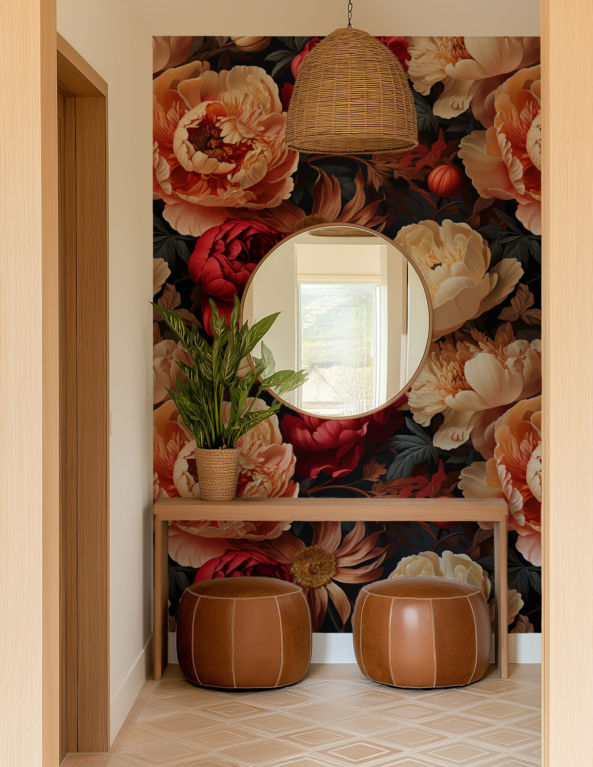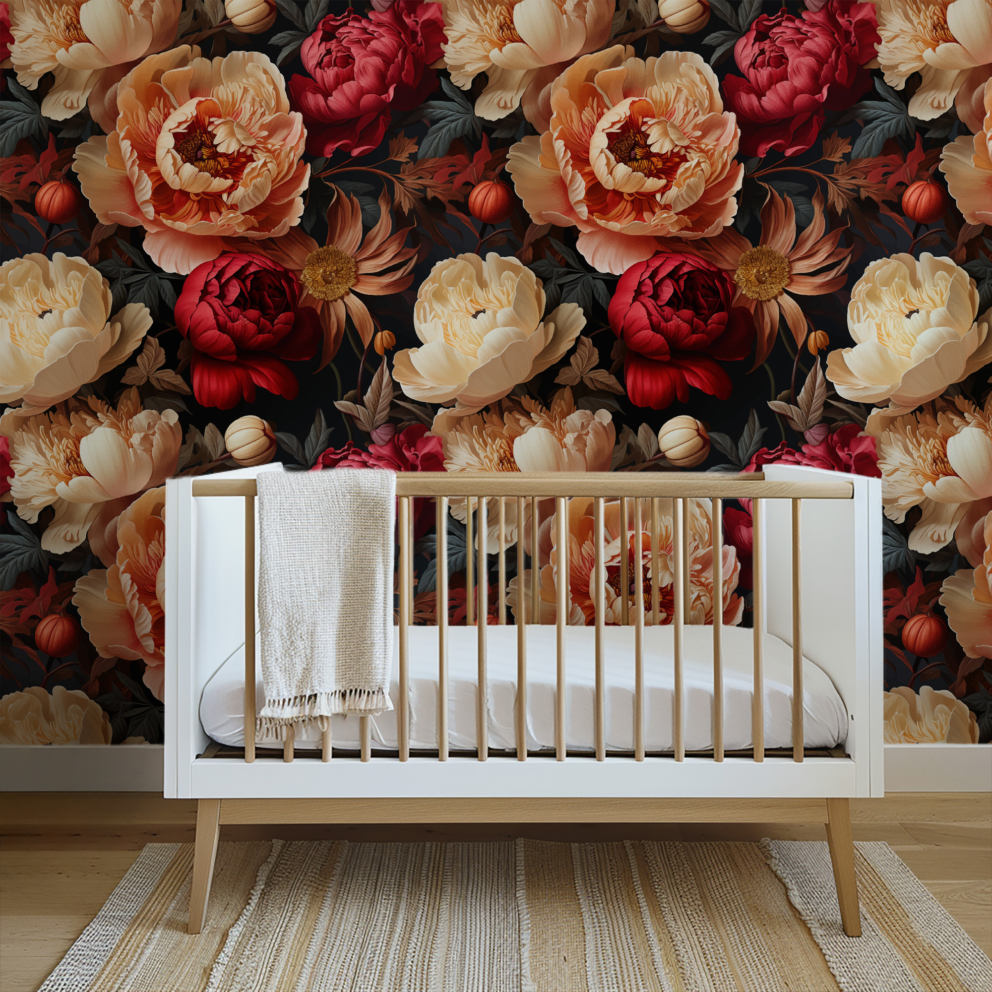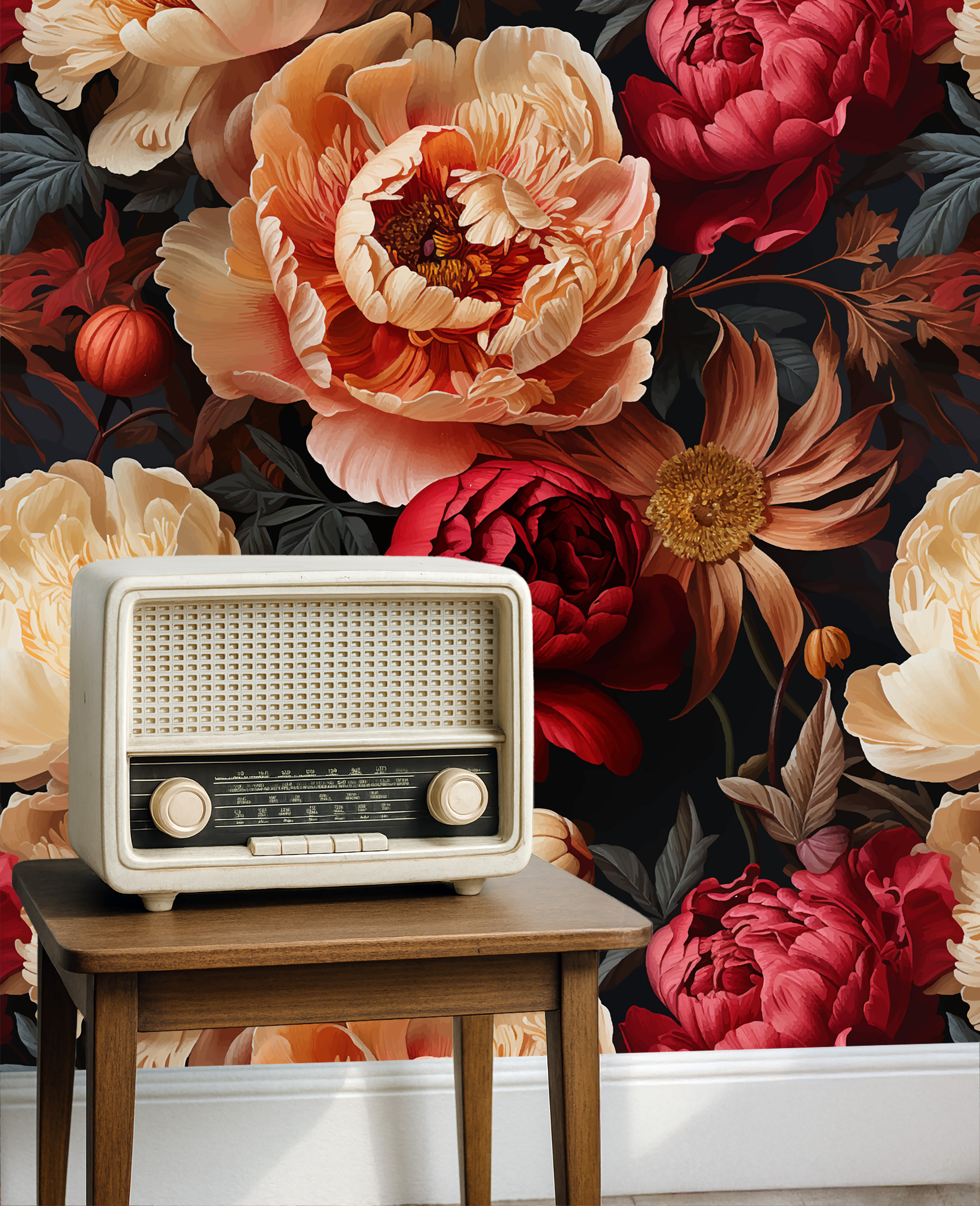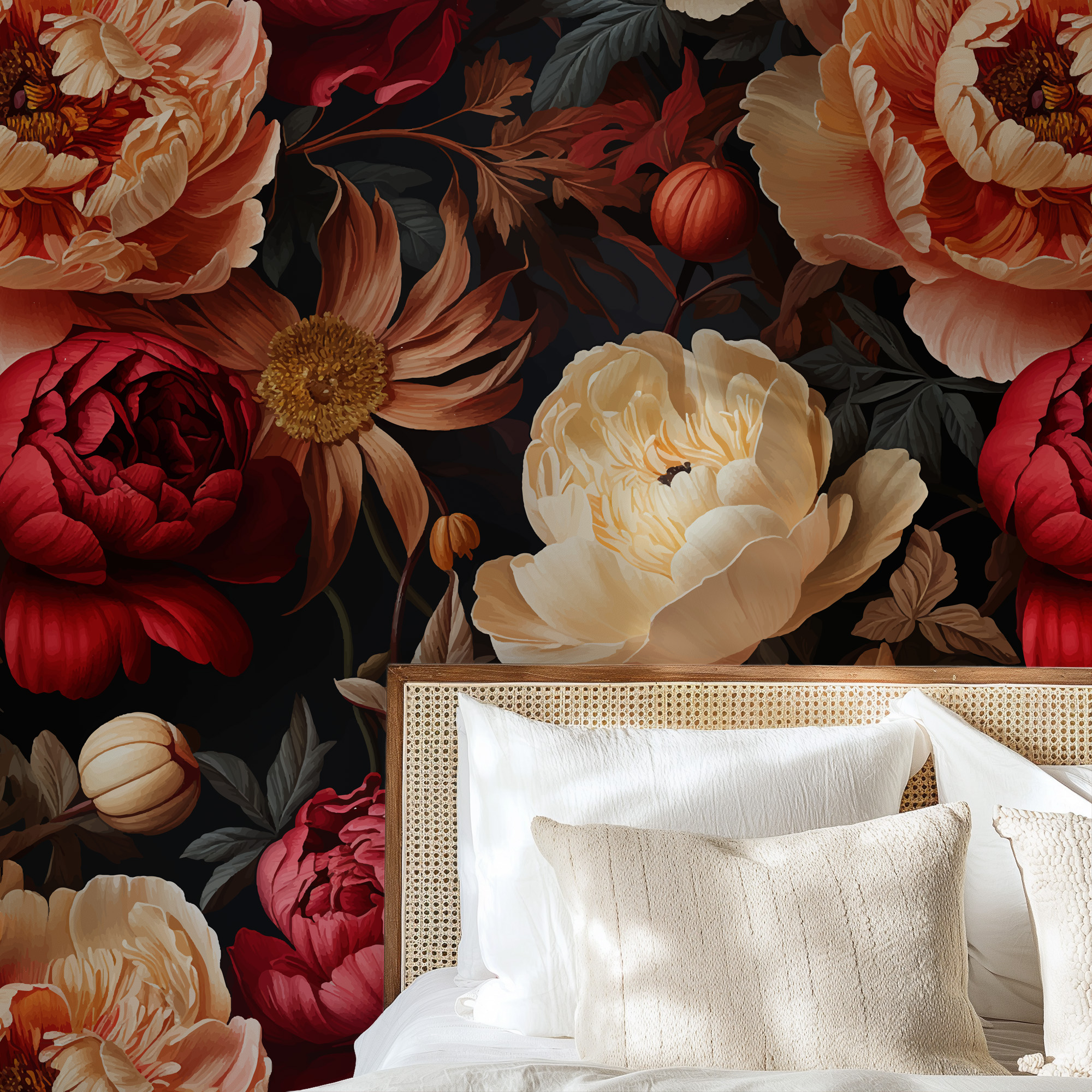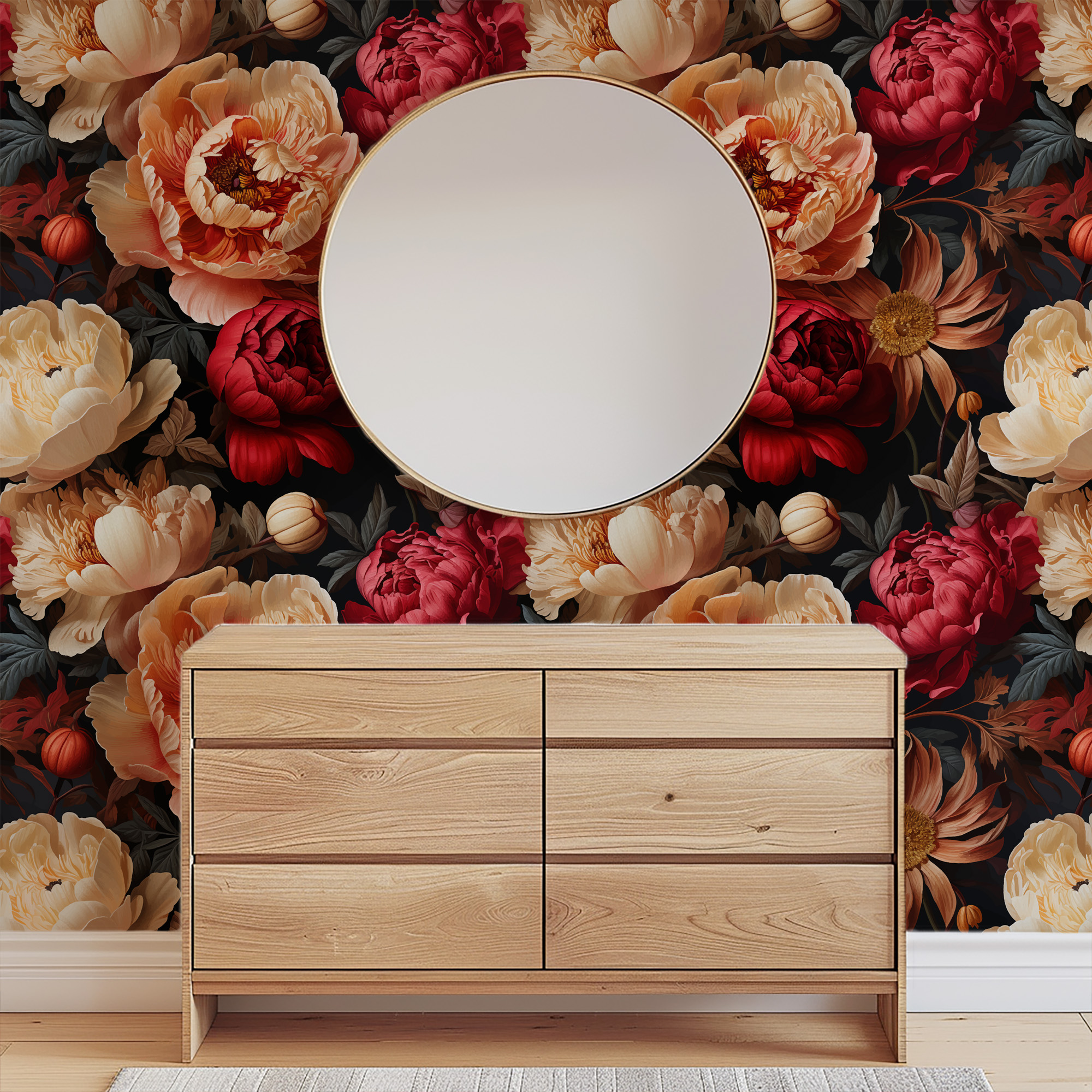 Moody Dark Peony Peel and Stick Wallpaper, Large Red and Cream Floral Wall Mural, Vintage Romantic Botanical Decor flrl-0052