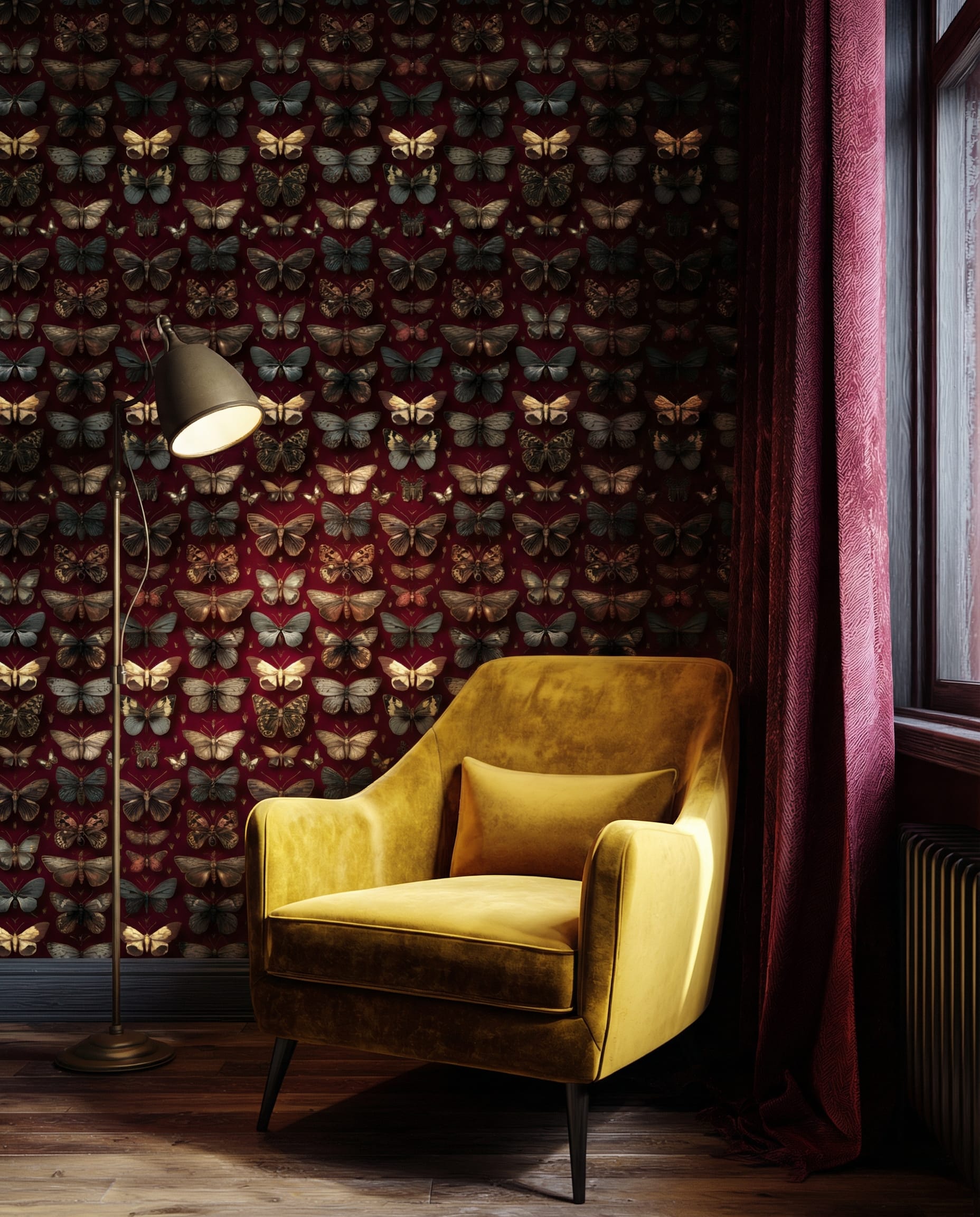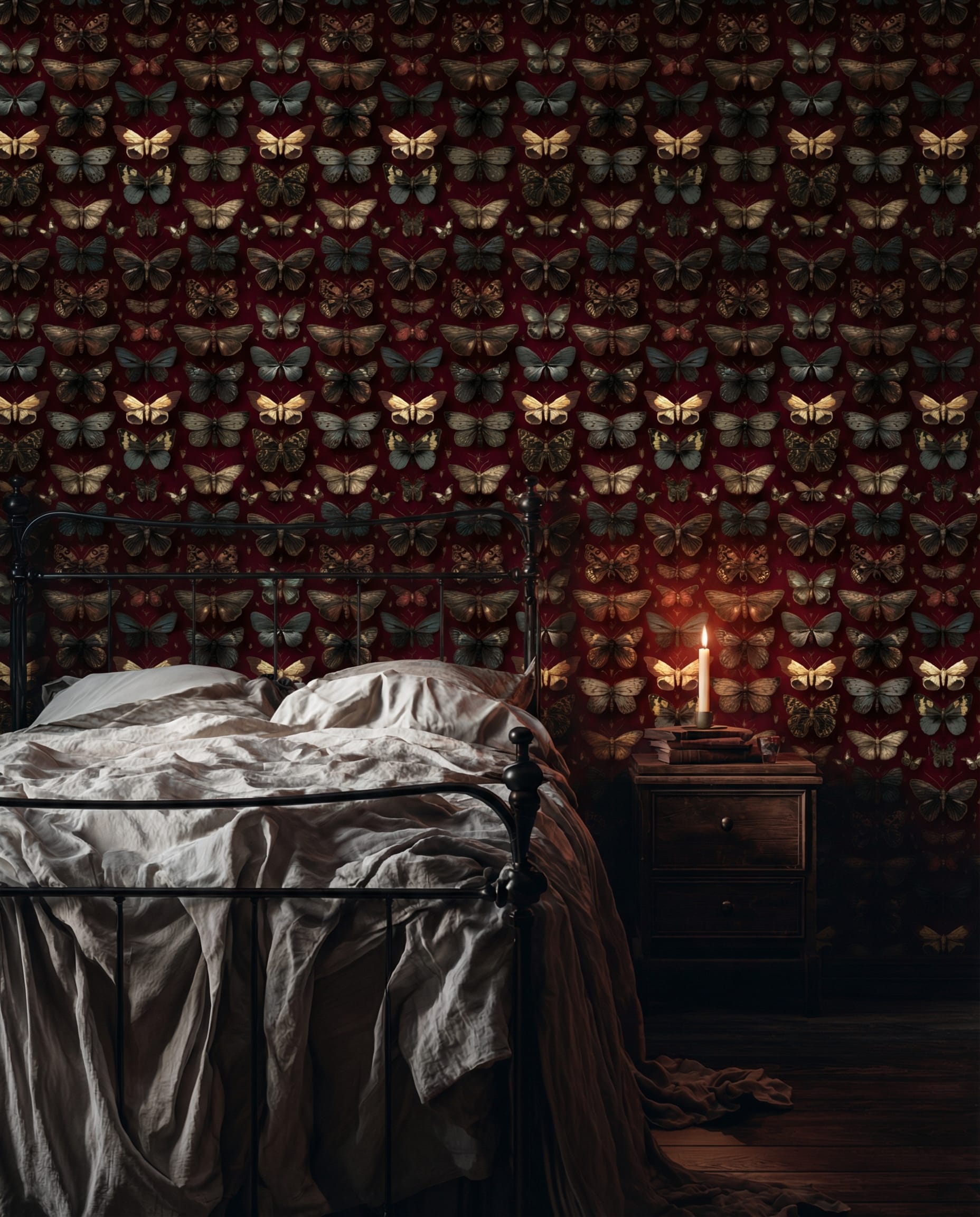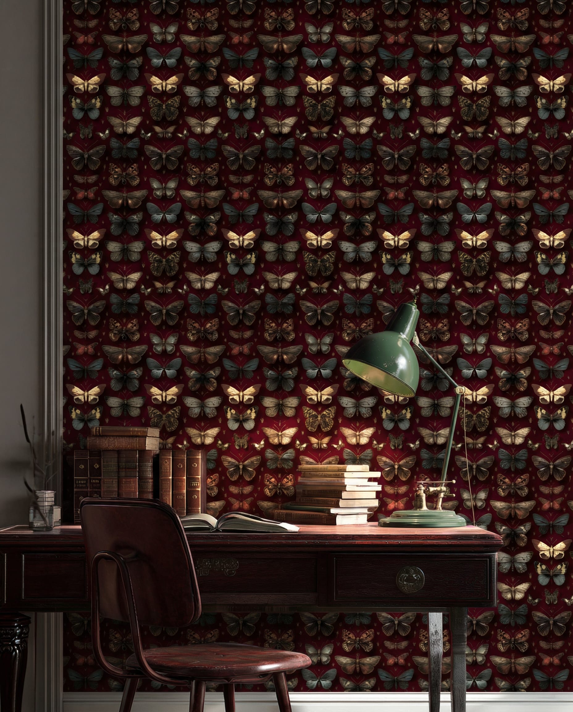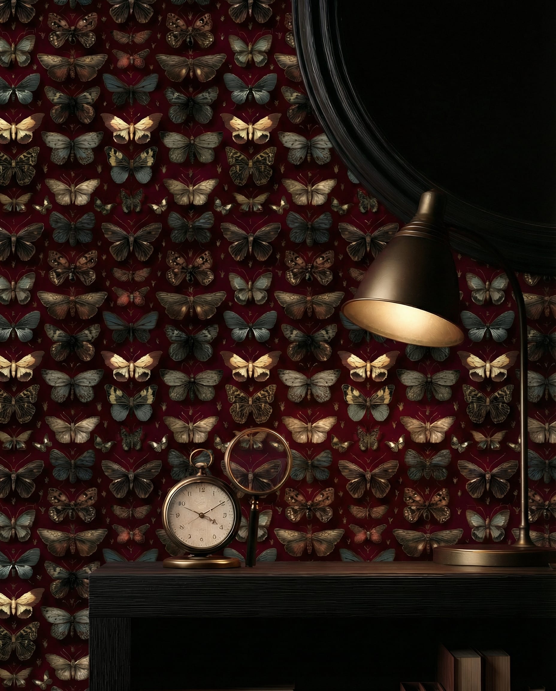 Moody Dark Red Butterfly and Moth Peel and Stick Wallpaper, Vintage Gothic Floral Wall Mural, Dark Academia Burgundy Removable Wallpaper m-anml-003