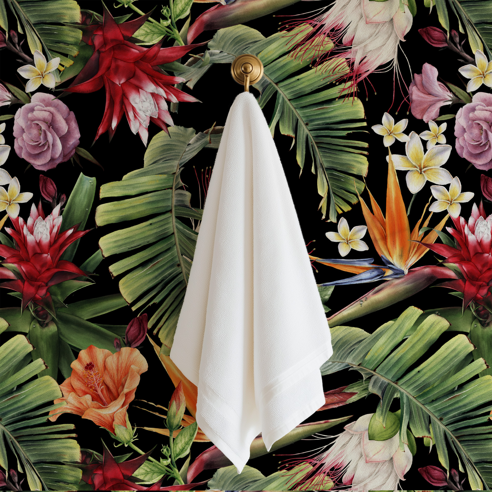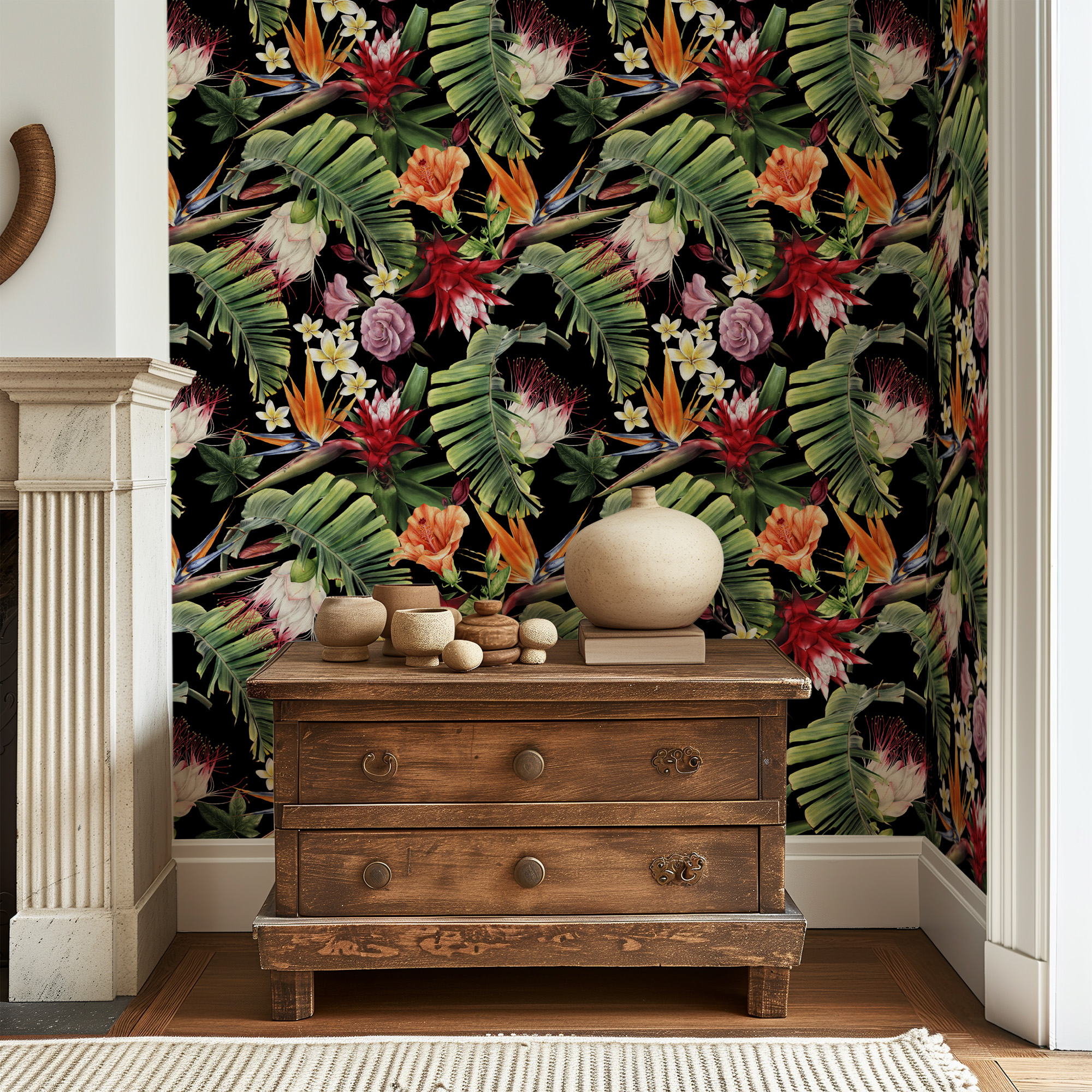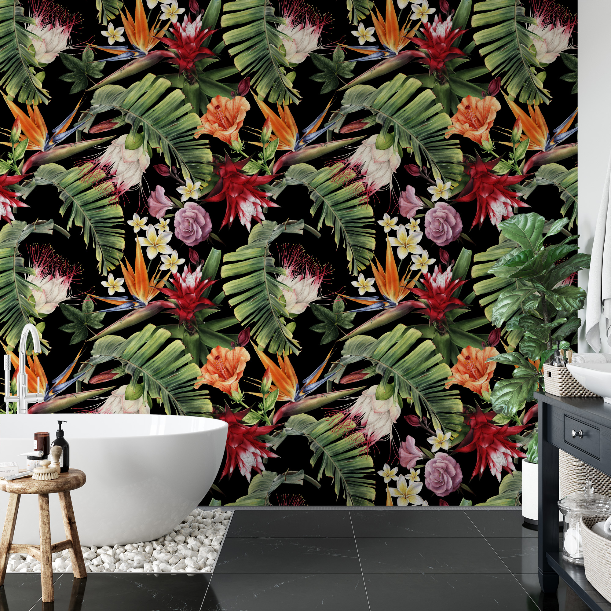 Moody Dark Tropical Floral Peel and Stick Wallpaper, Black Jungle Botanical Wall Mural, Exotic Leaf and Flower Removable Wall Decor flrl-0003