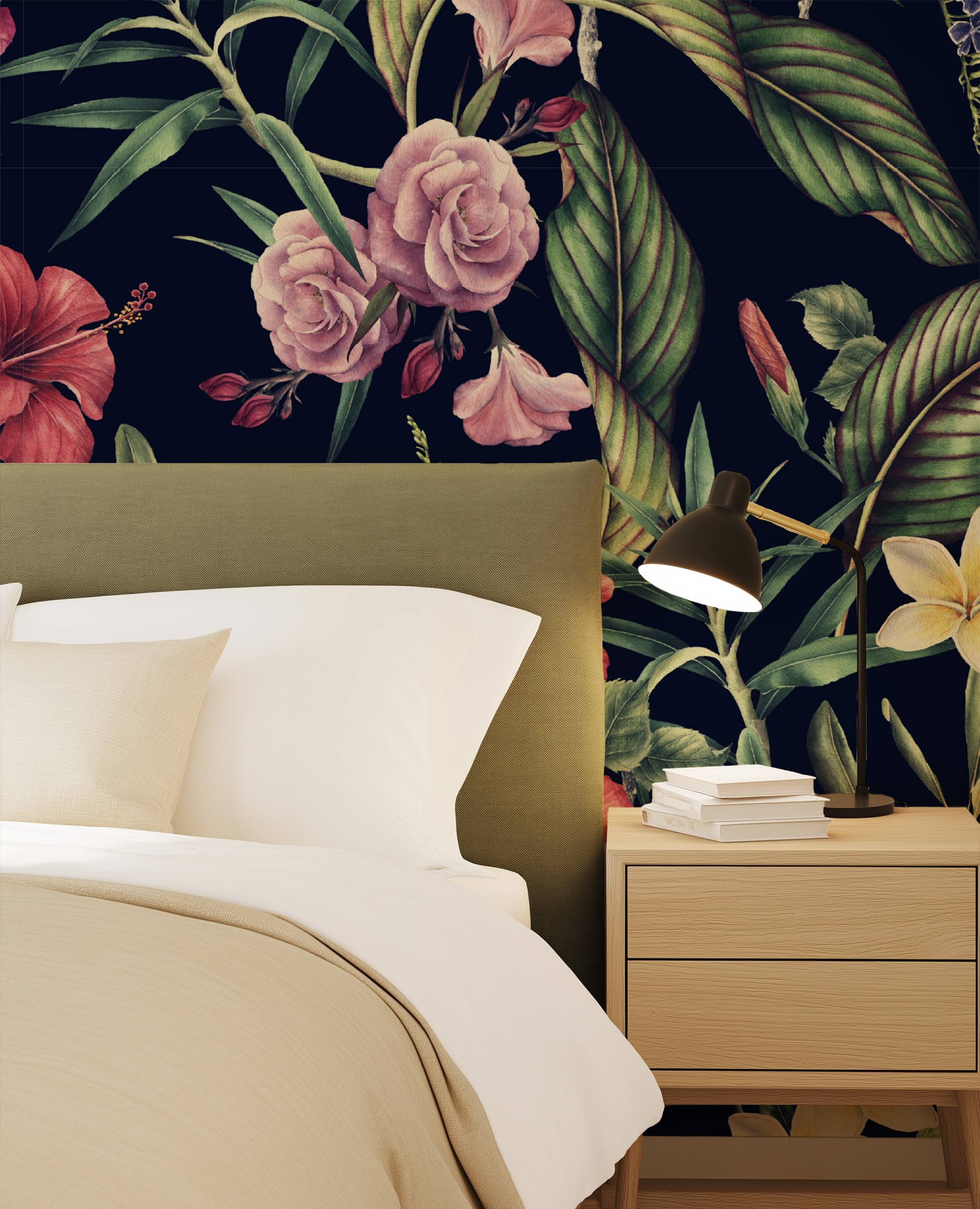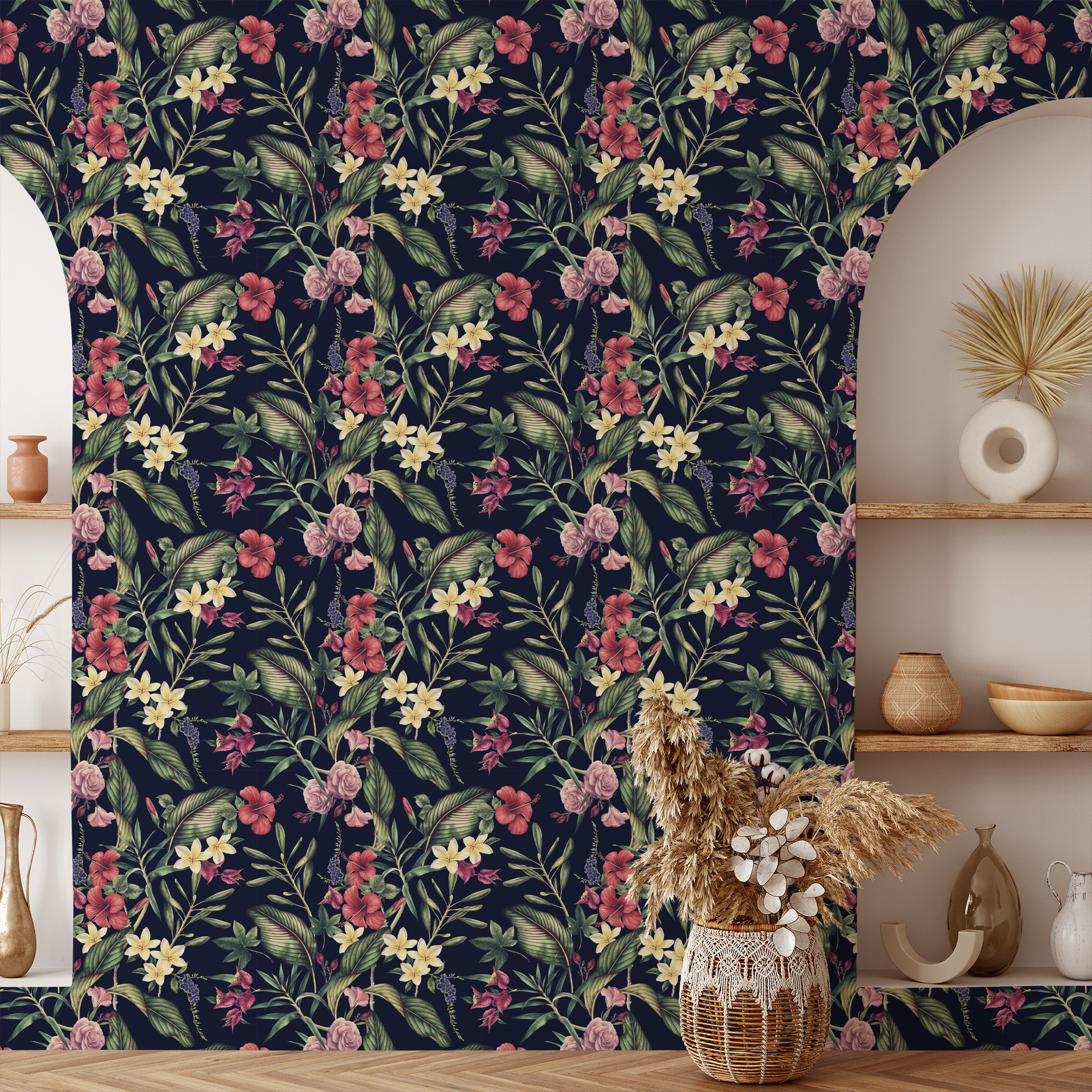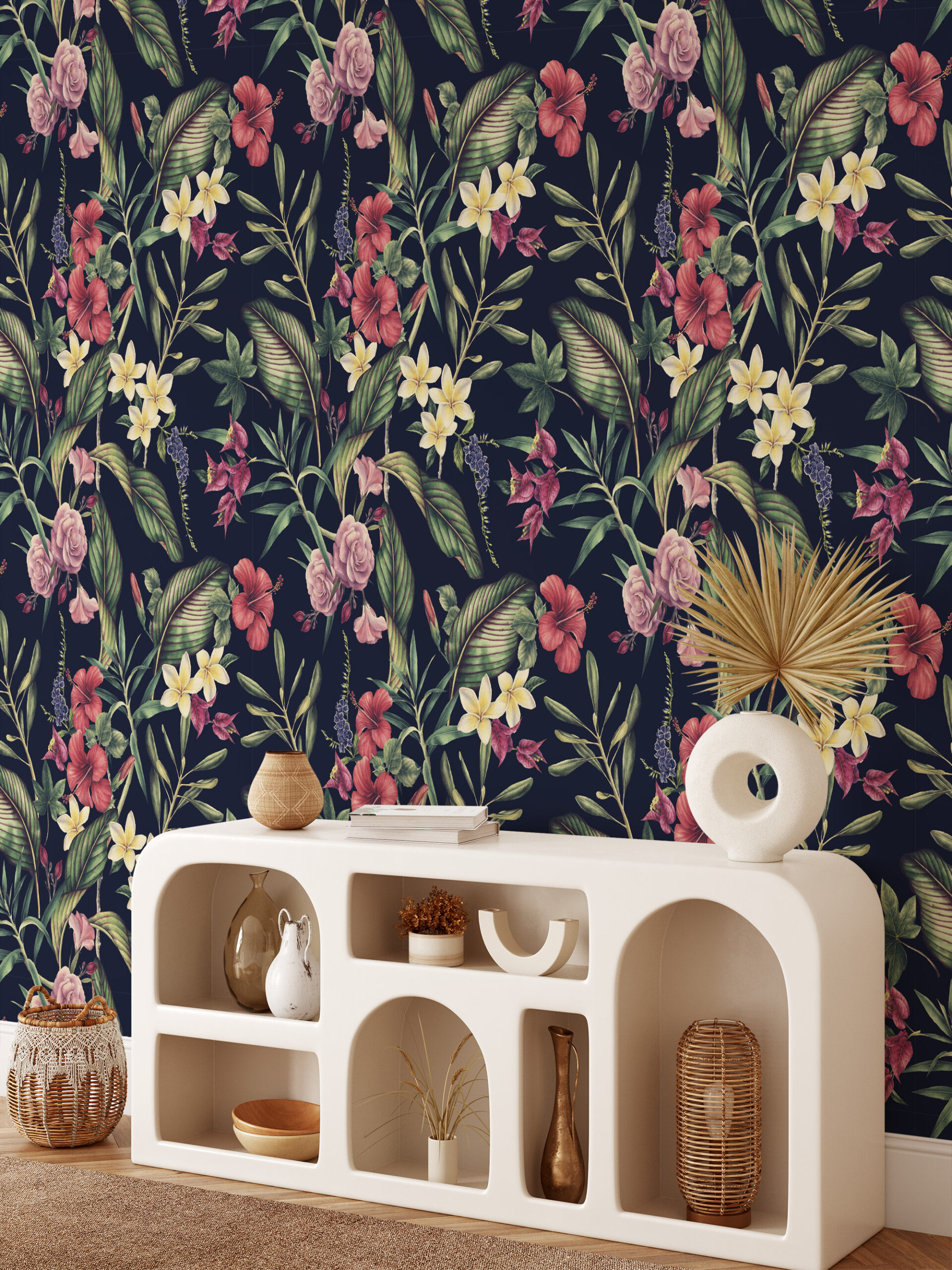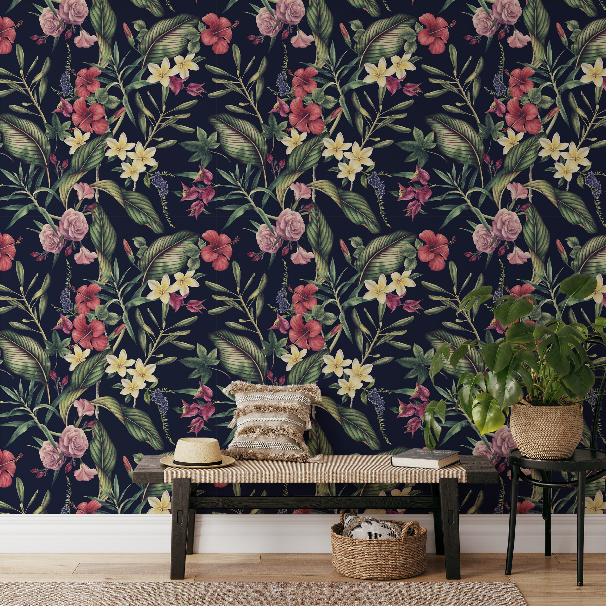 Moody Navy Tropical Floral Peel and Stick Wallpaper, Dark Botanical Hibiscus and Rose Wall Mural, Exotic Nature Entryway Decor flrl-0074