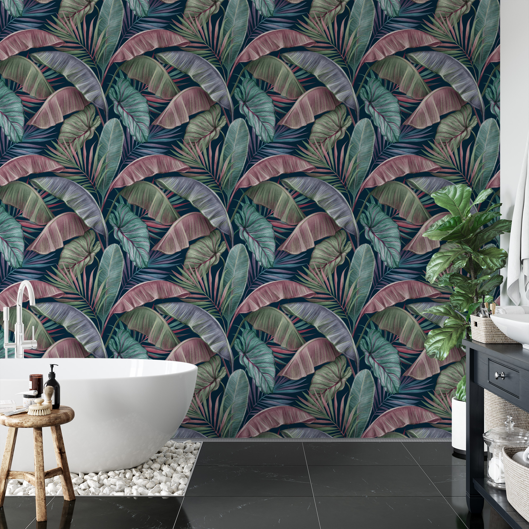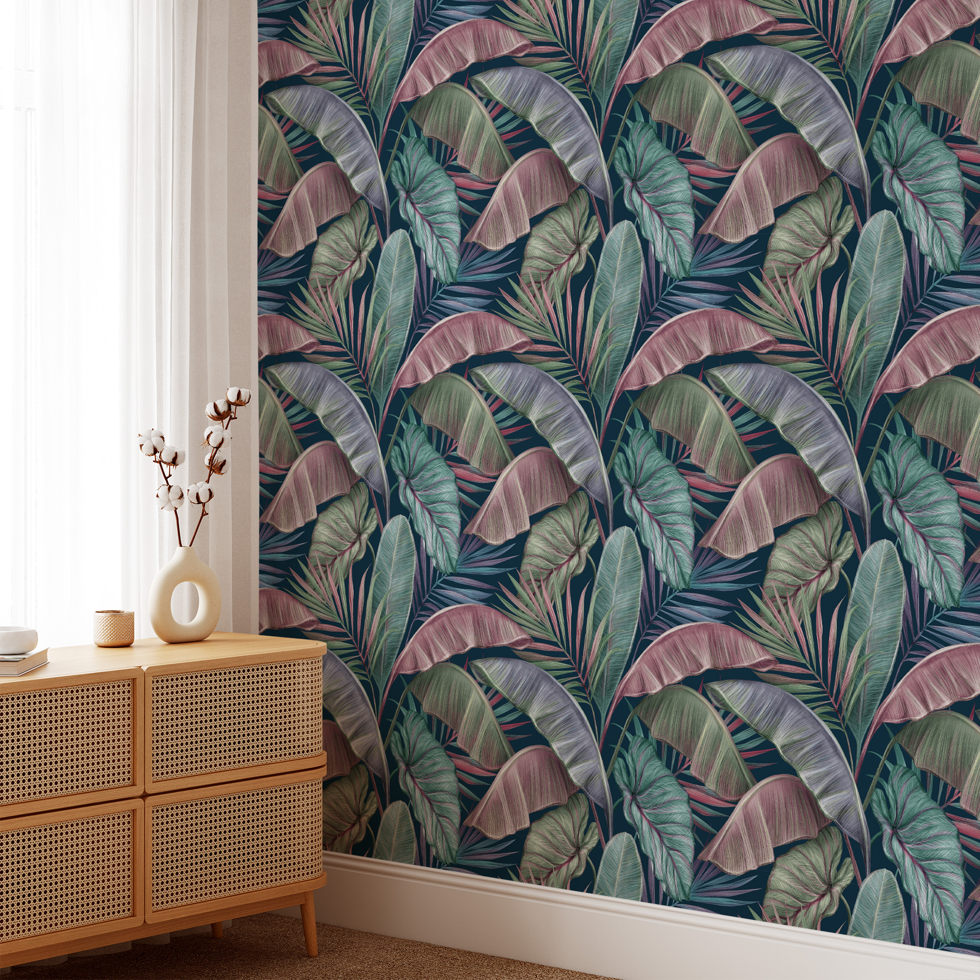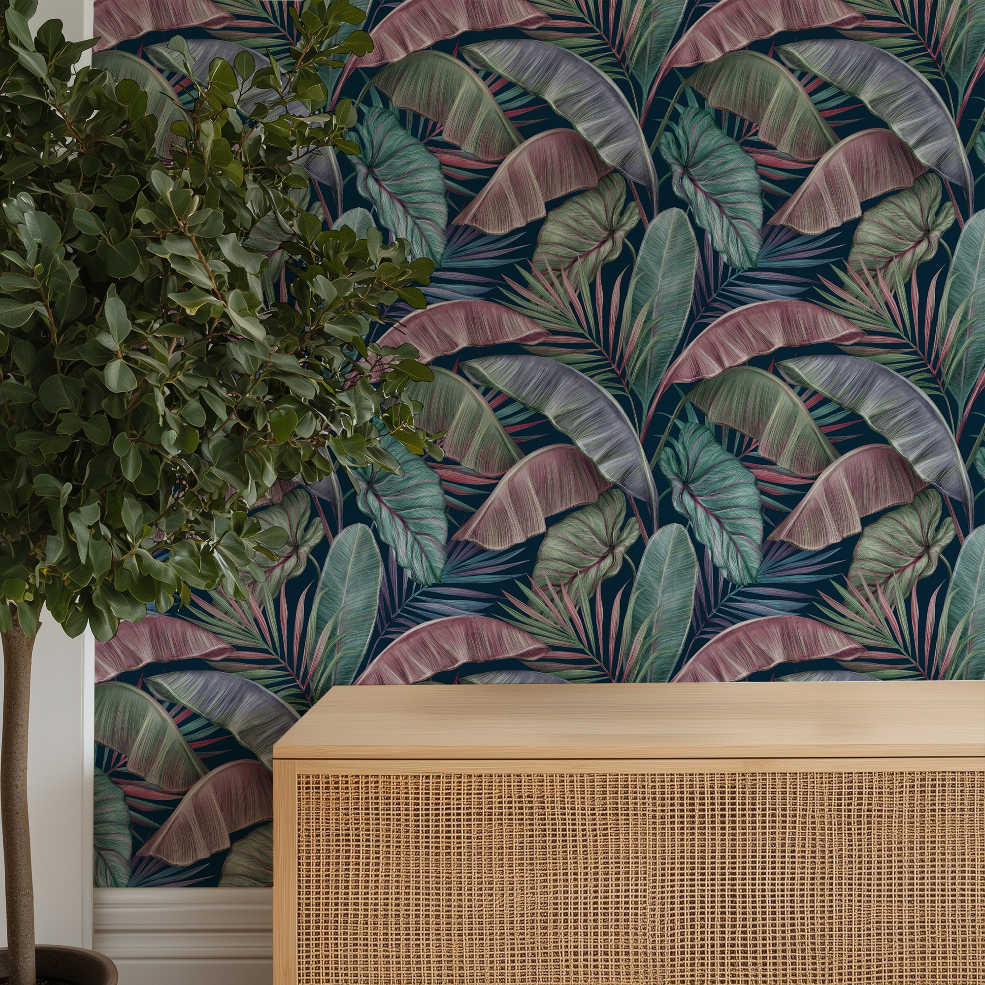 Moody Pink and Teal Tropical Leaves Peel and Stick Wallpaper, Bold Botanical Navy Wall Mural lvjg-0015