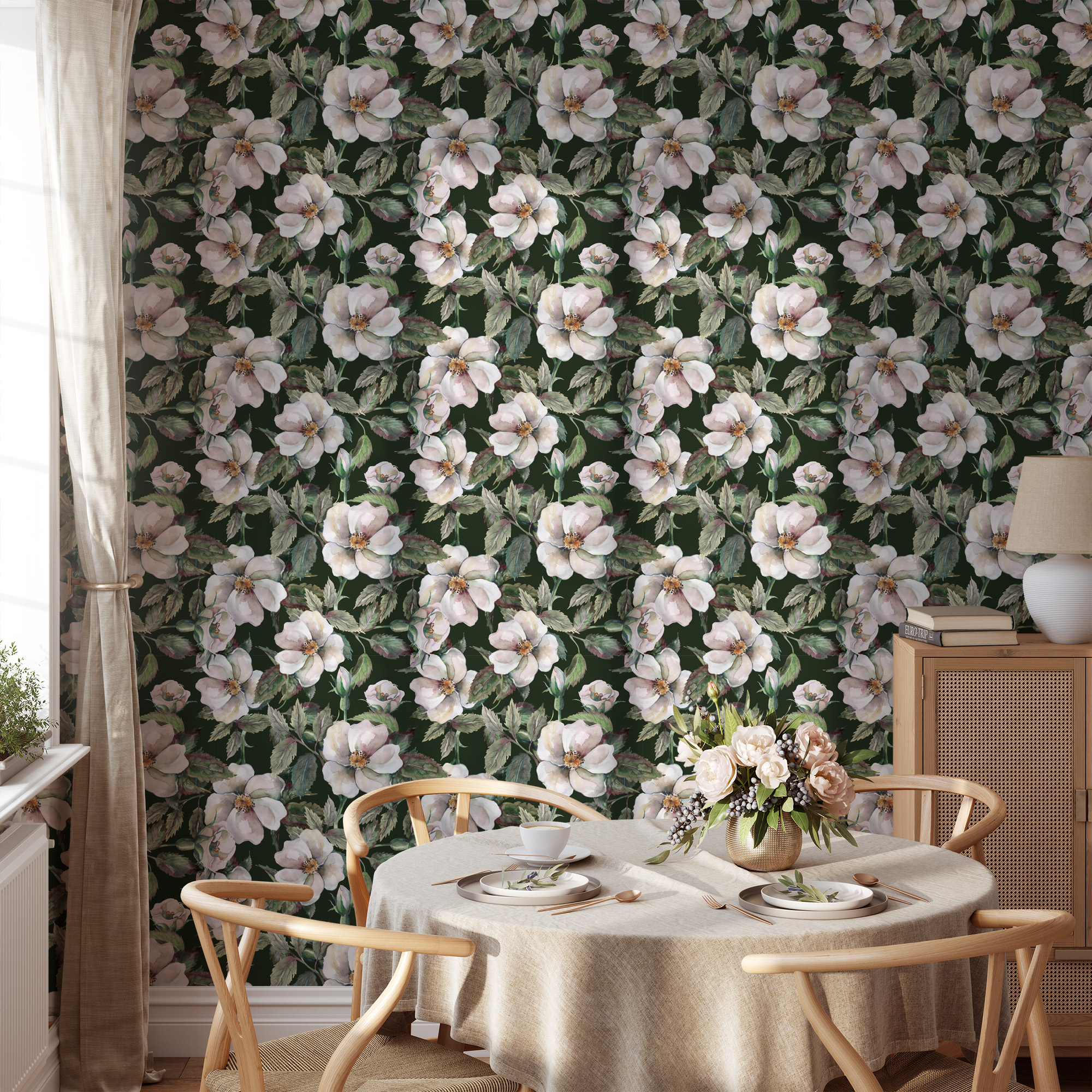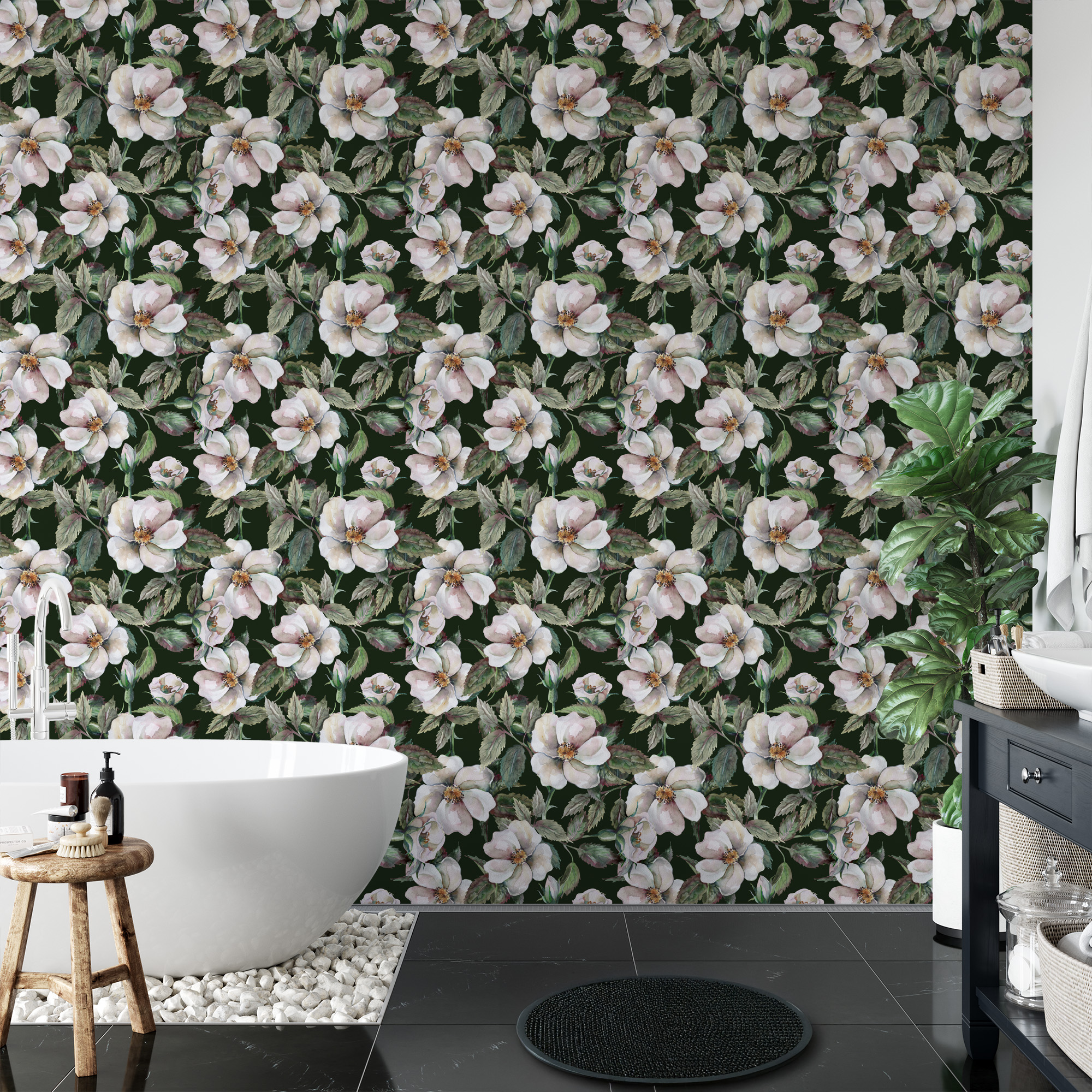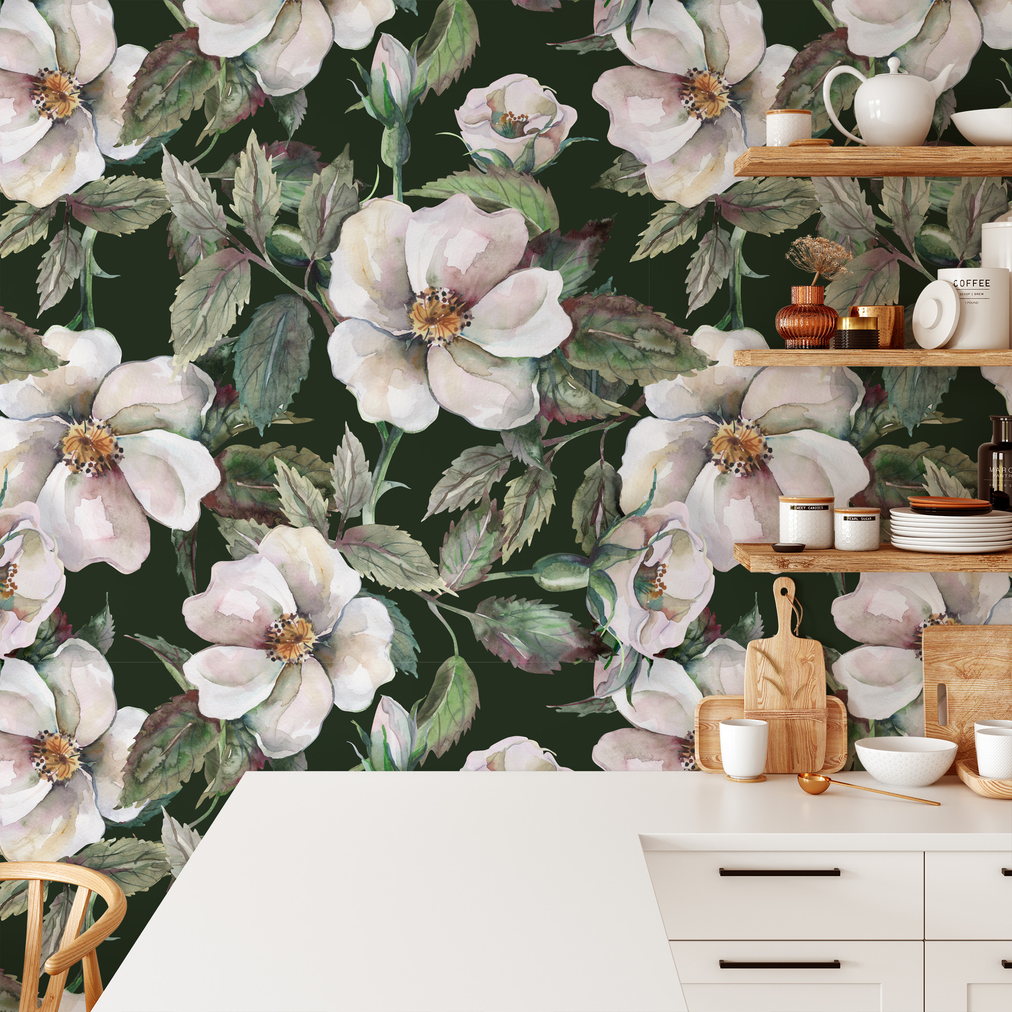 Moody White Rose Dark Floral Peel and Stick Wallpaper, Vintage Botanical Wall Mural, Elegant Black and White Flower Decor flrl-0010