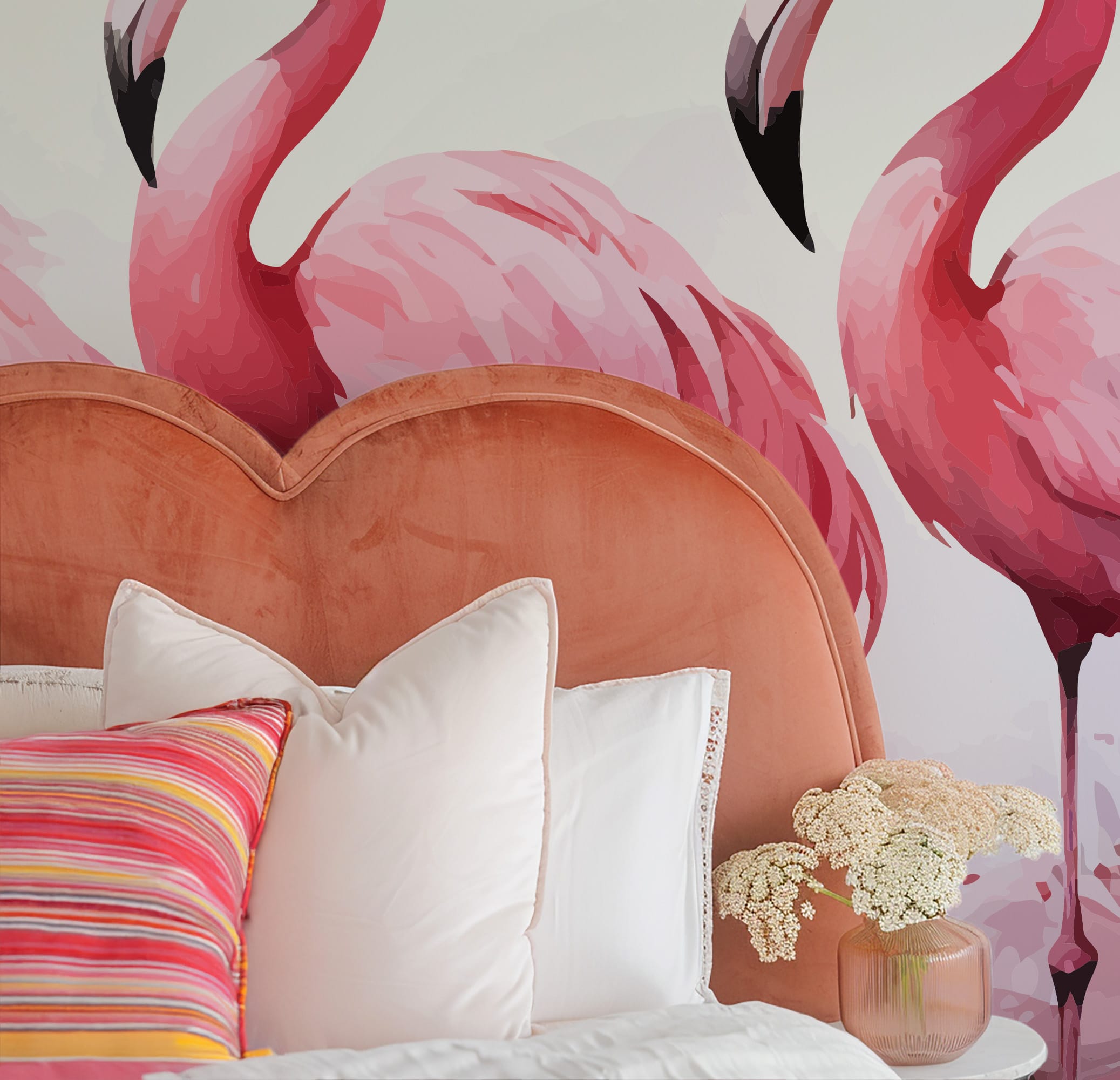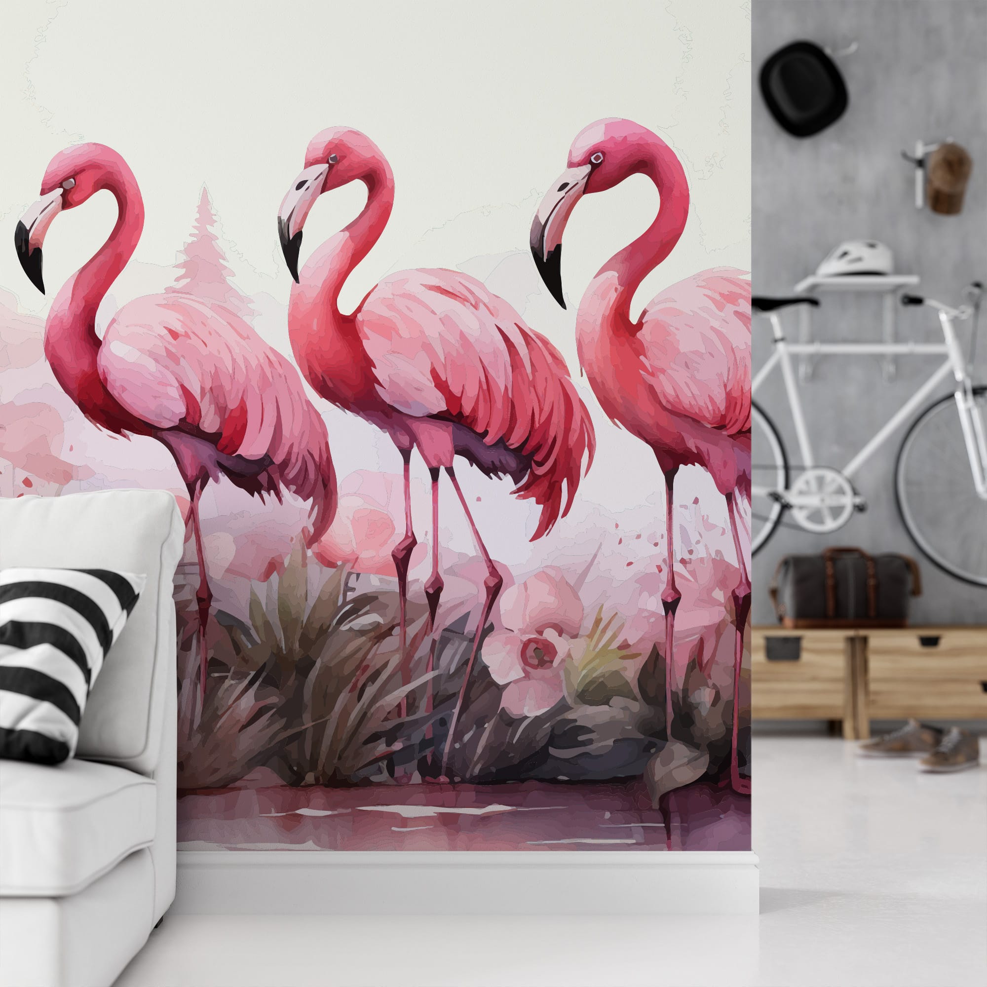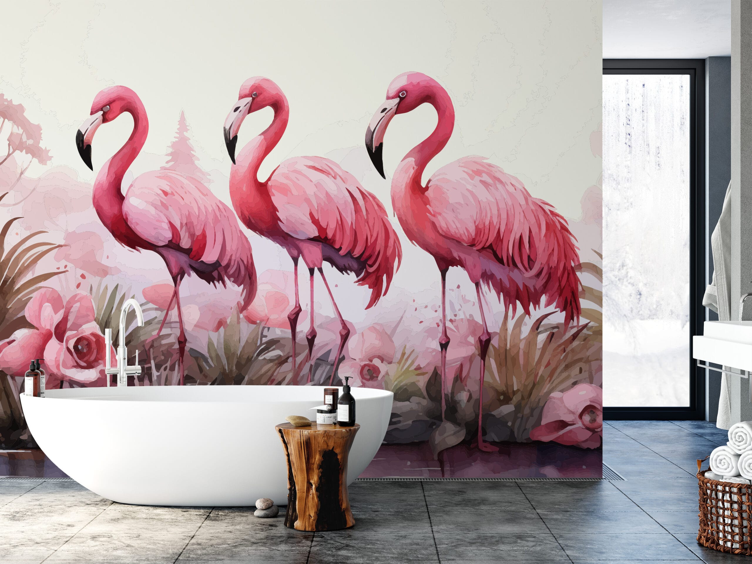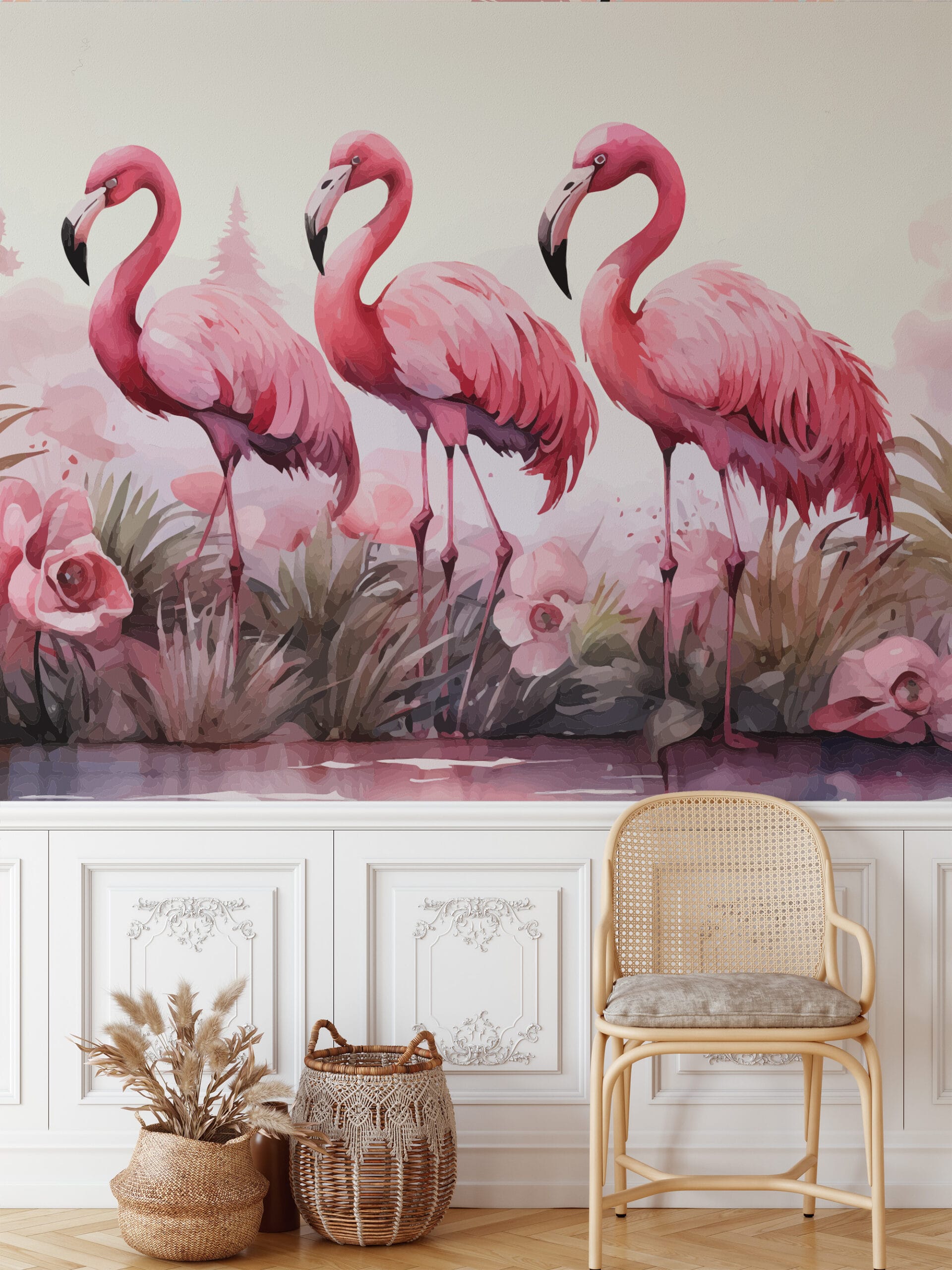 Pink Flamingo Tropical Watercolor Peel and Stick Wallpaper, Vibrant Animal Wall Mural, Modern Bathroom Botanical Removable Wallpaper anml-0019