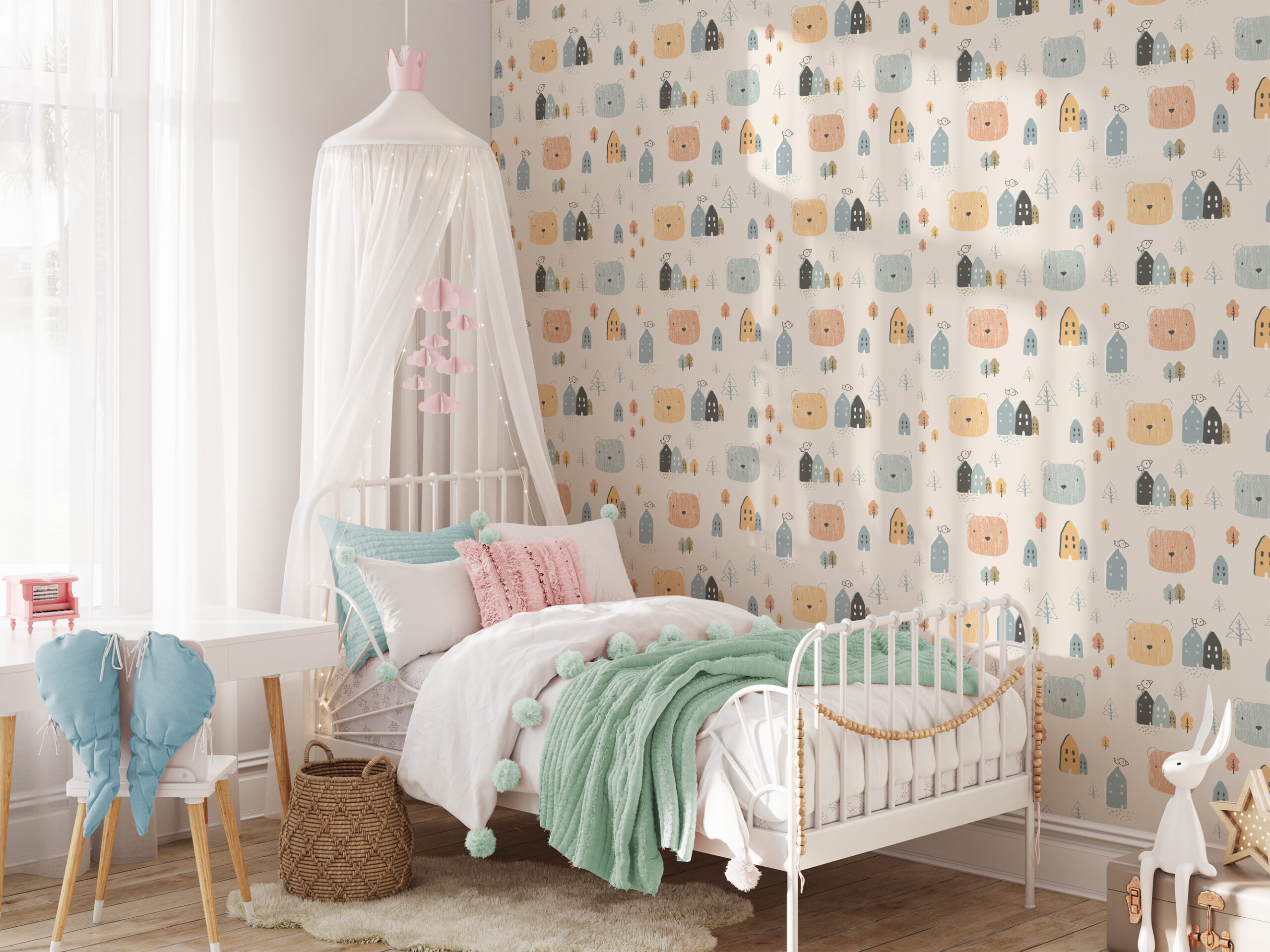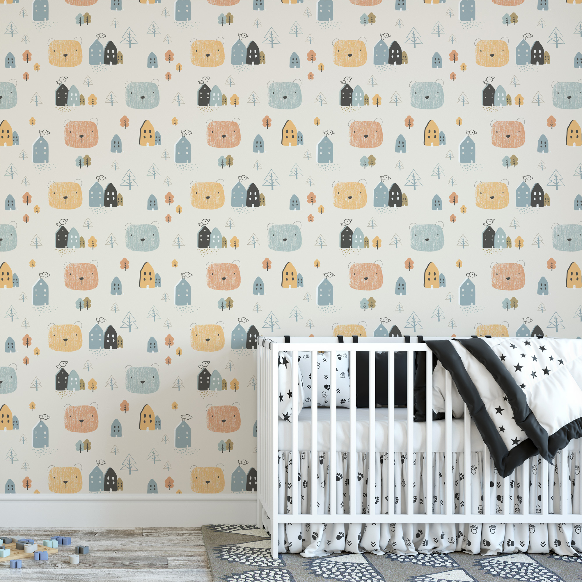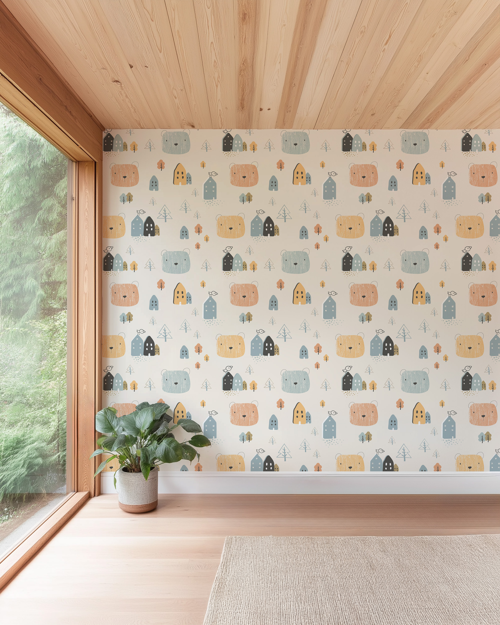 Scandi Bear and Tiny House Pattern Kids Peel and Stick Wallpaper, Nordic Cream Nursery Wall Mural, Whimsical Forest Village Decor kids-0024