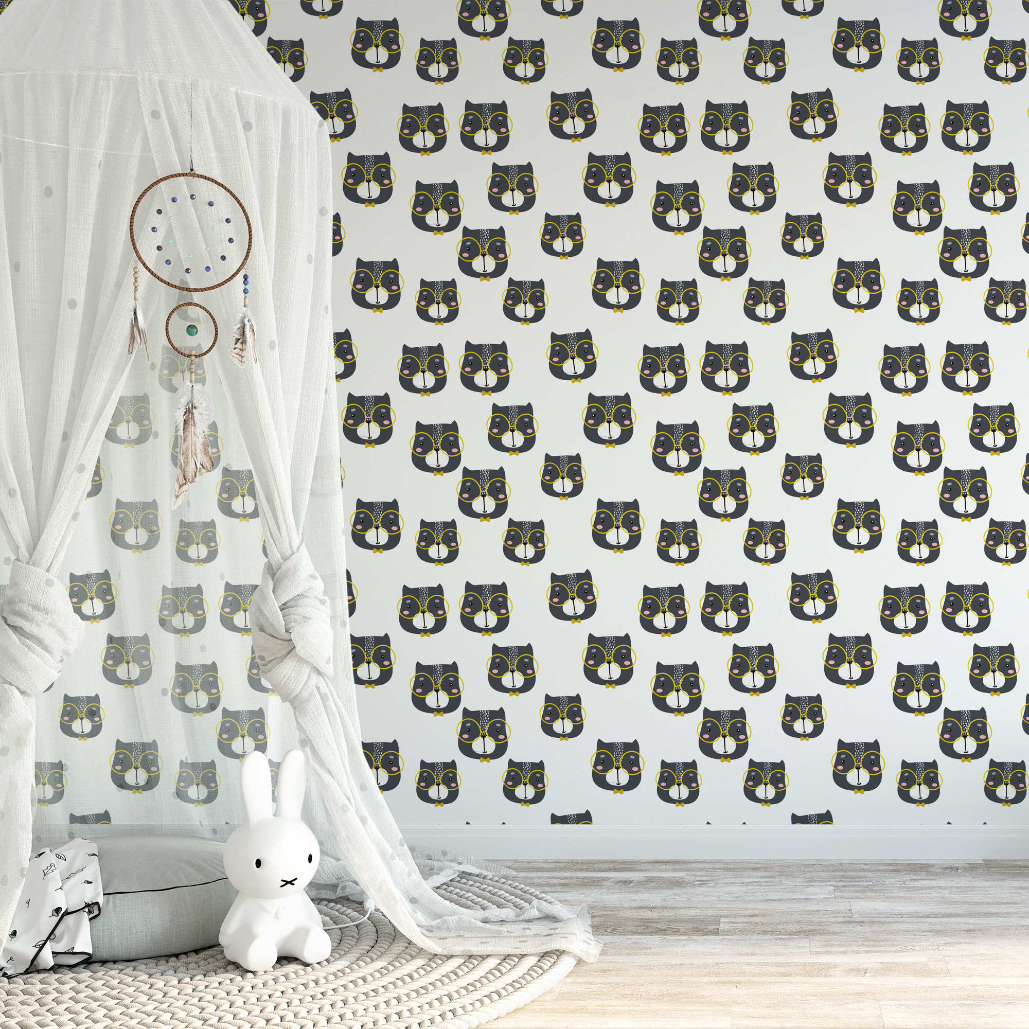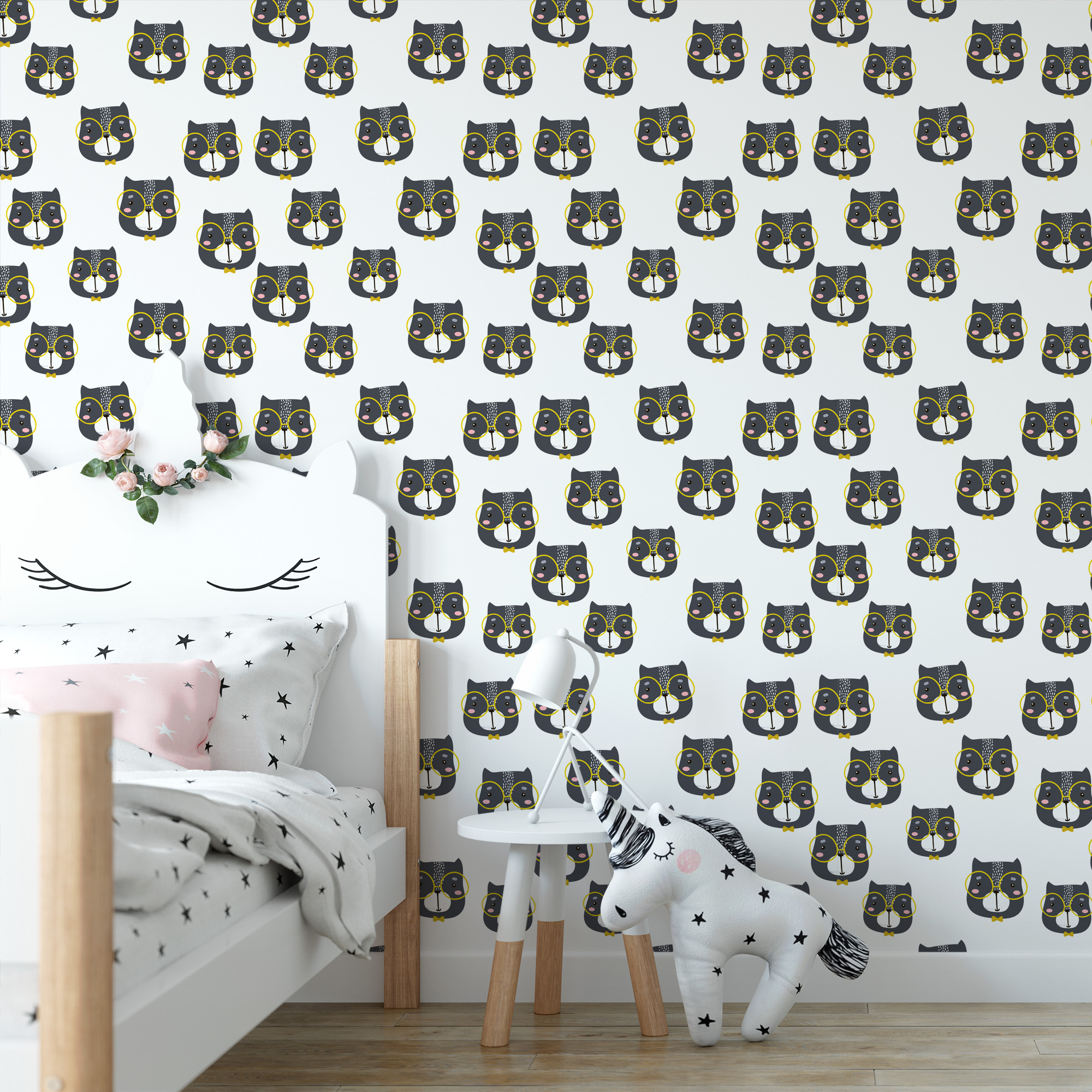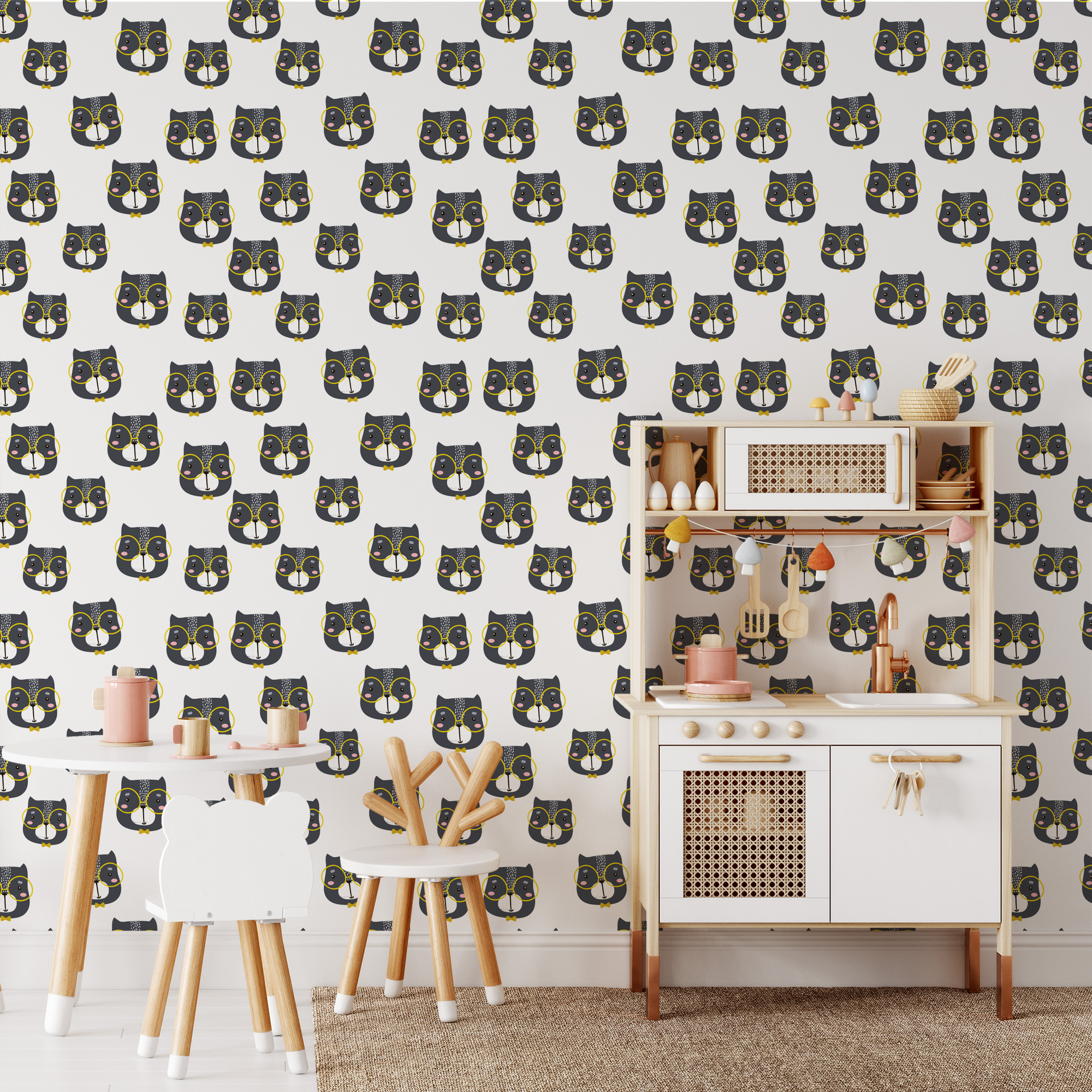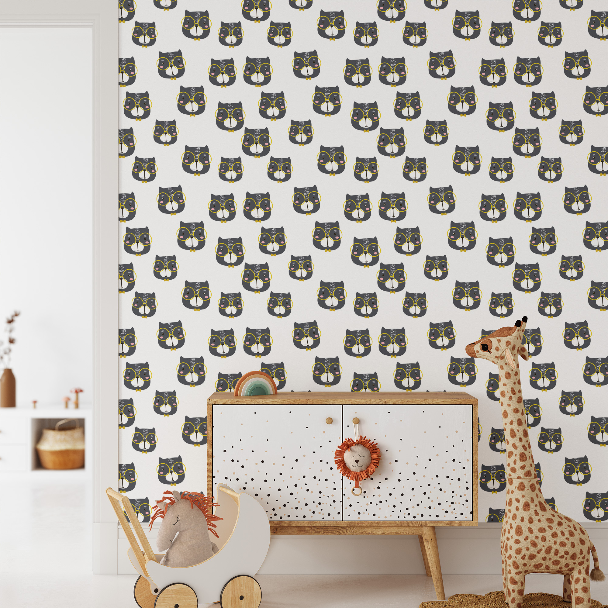 Smart Cat with Yellow Glasses Kids Peel and Stick Wallpaper, Modern Monochrome Nursery Wall Mural, Geeky Animal Decor kids-0058