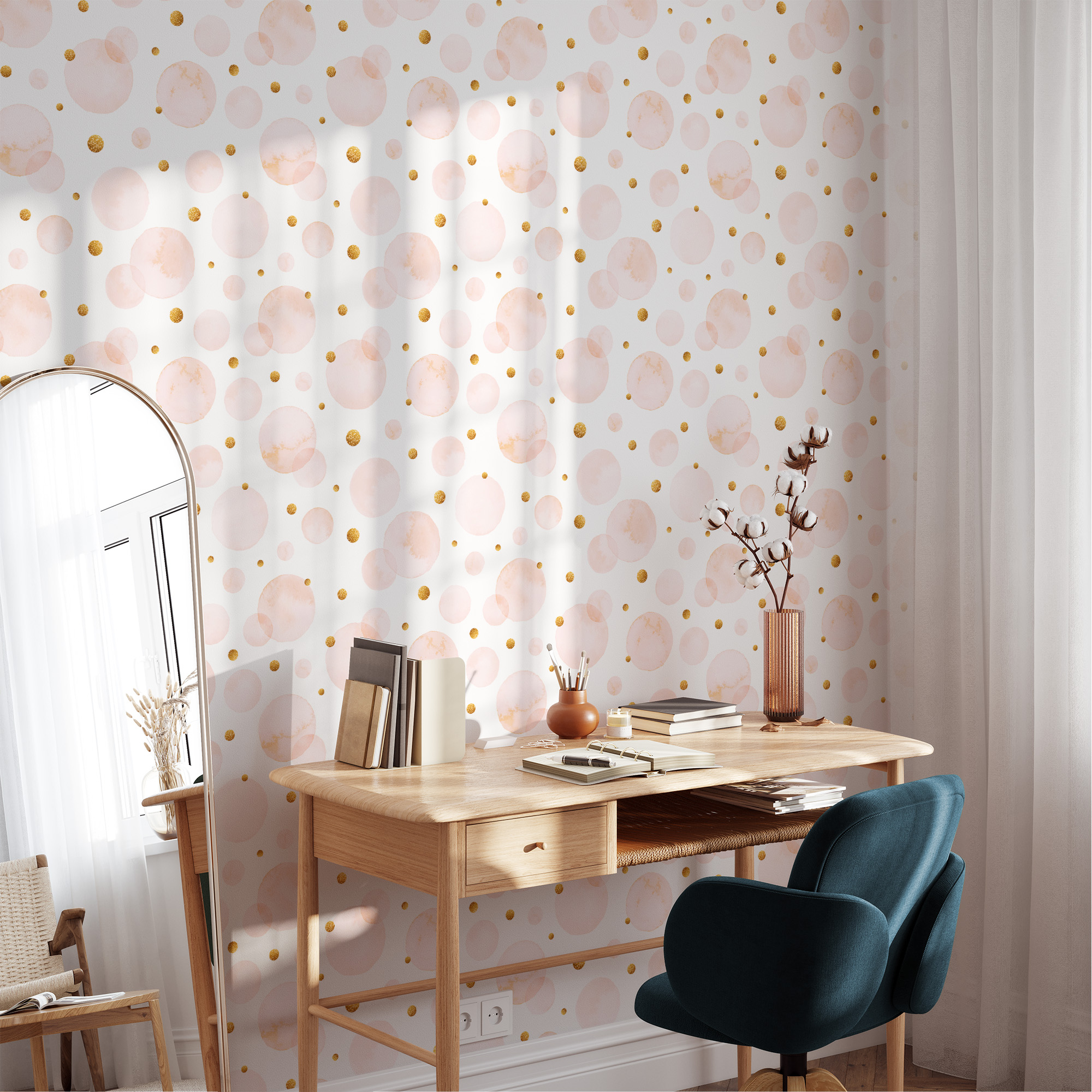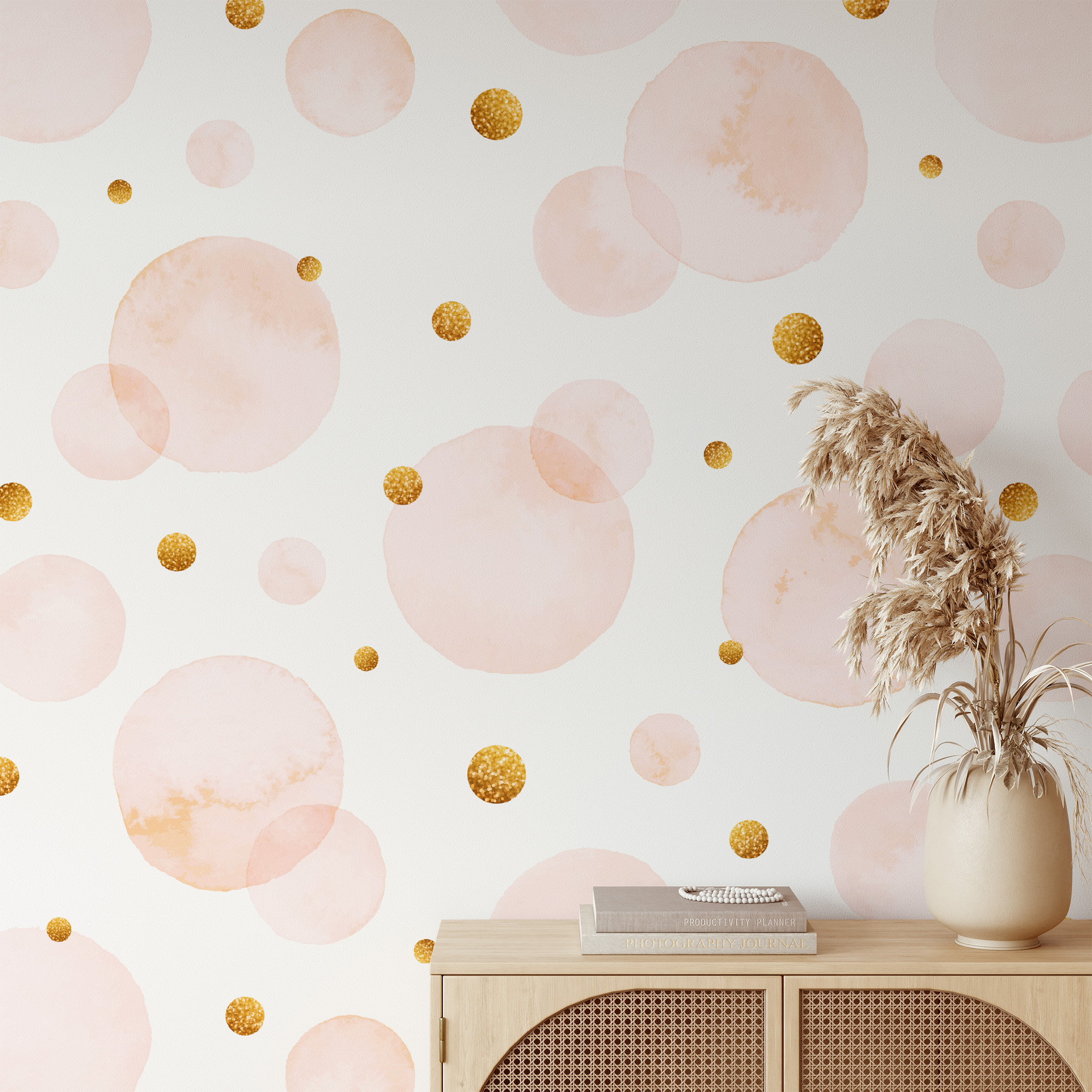 Soft Pink Watercolor Bubbles with Gold Glitter Peel and Stick Wallpaper, Abstract Circles Wall Mural, Whimsical Nursery Decor gmla-0010