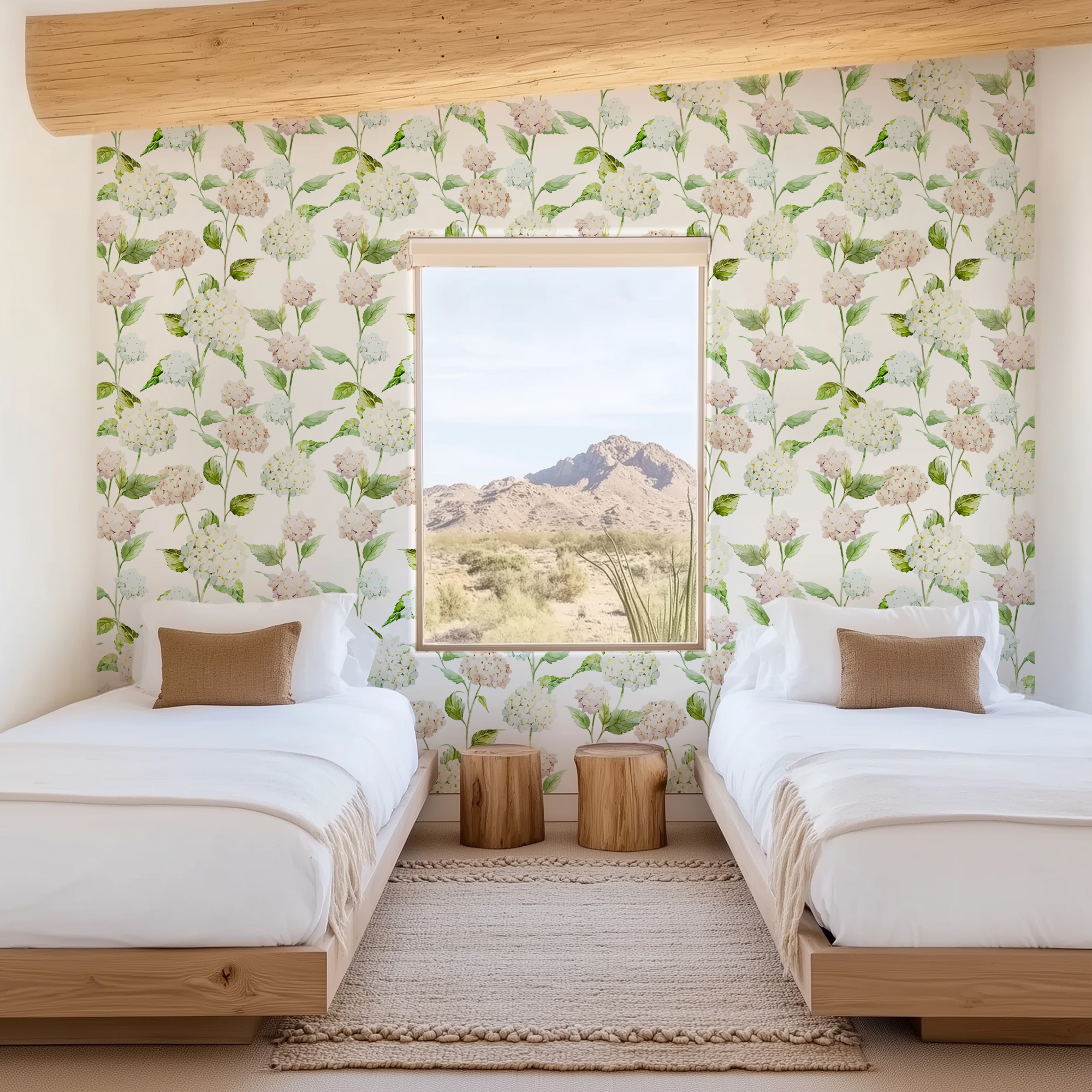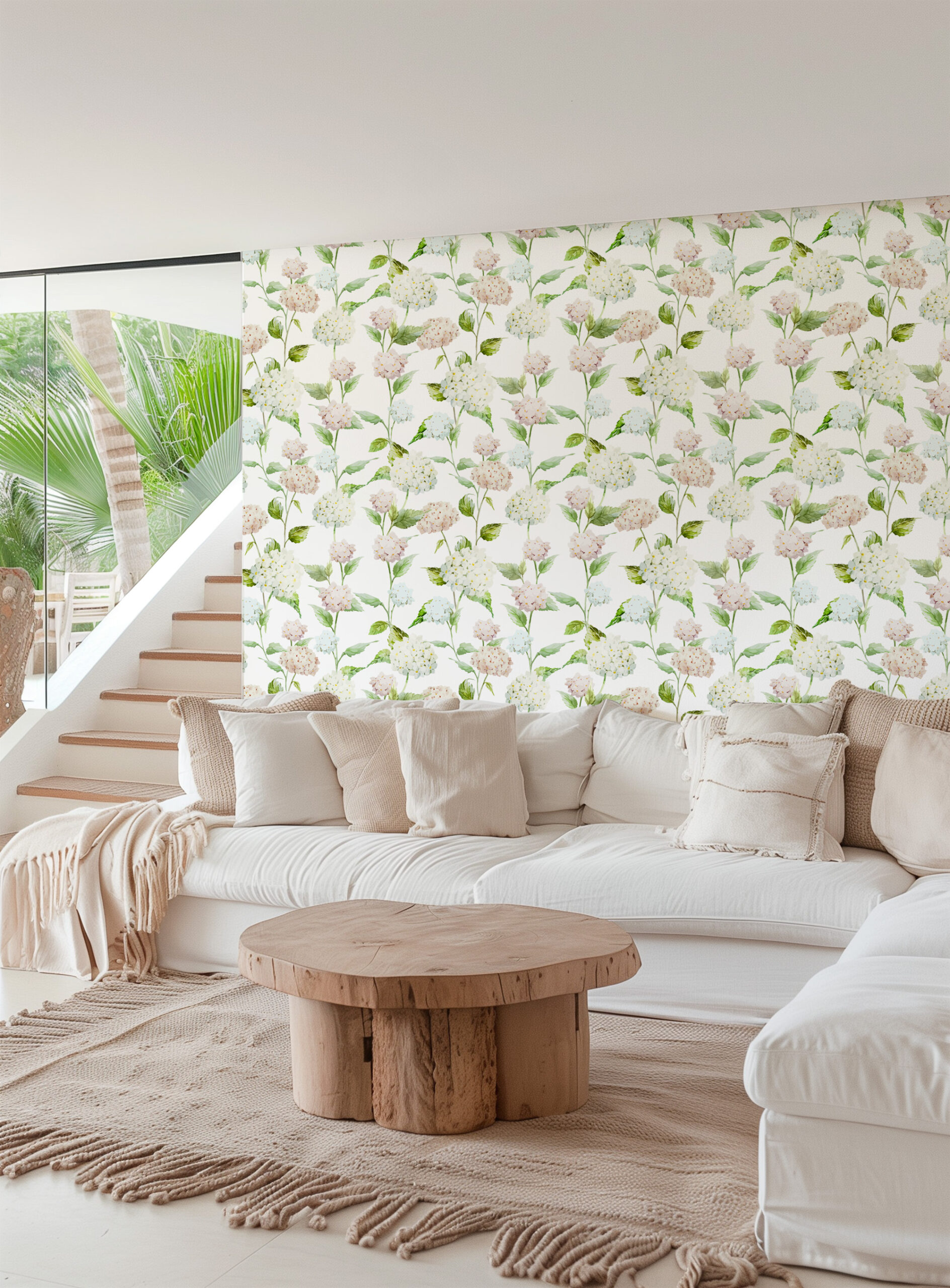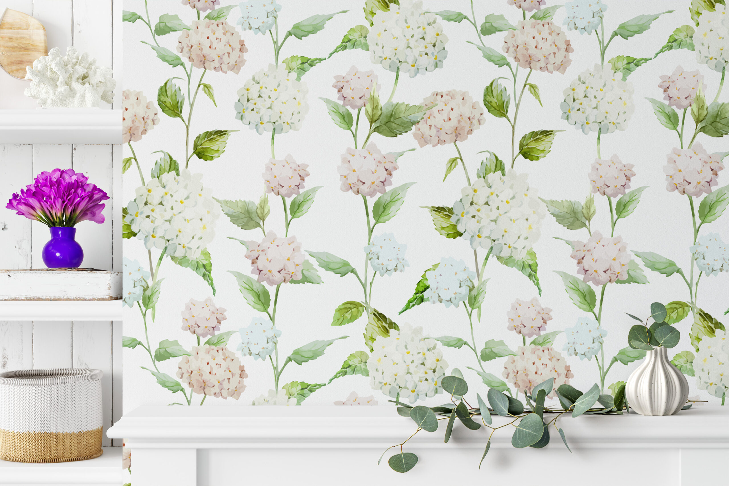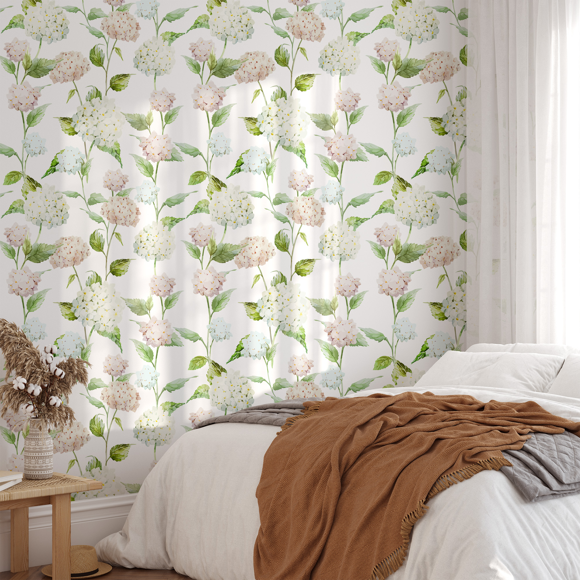 Soft Watercolor Hydrangea Peel and Stick Wallpaper, Romantic White and Pink Floral Wall Mural, Elegant Botanical Home Decor flrl-0067