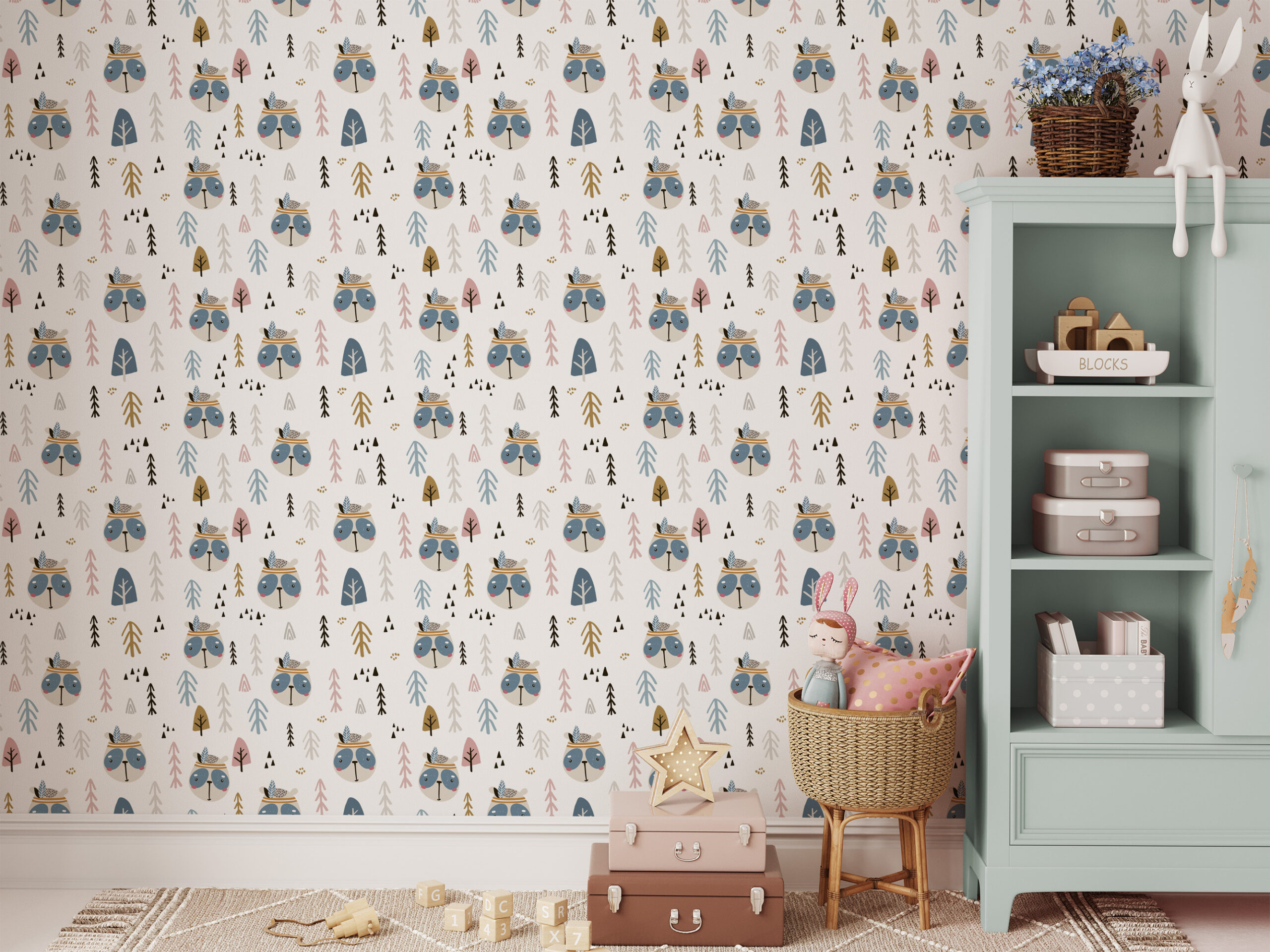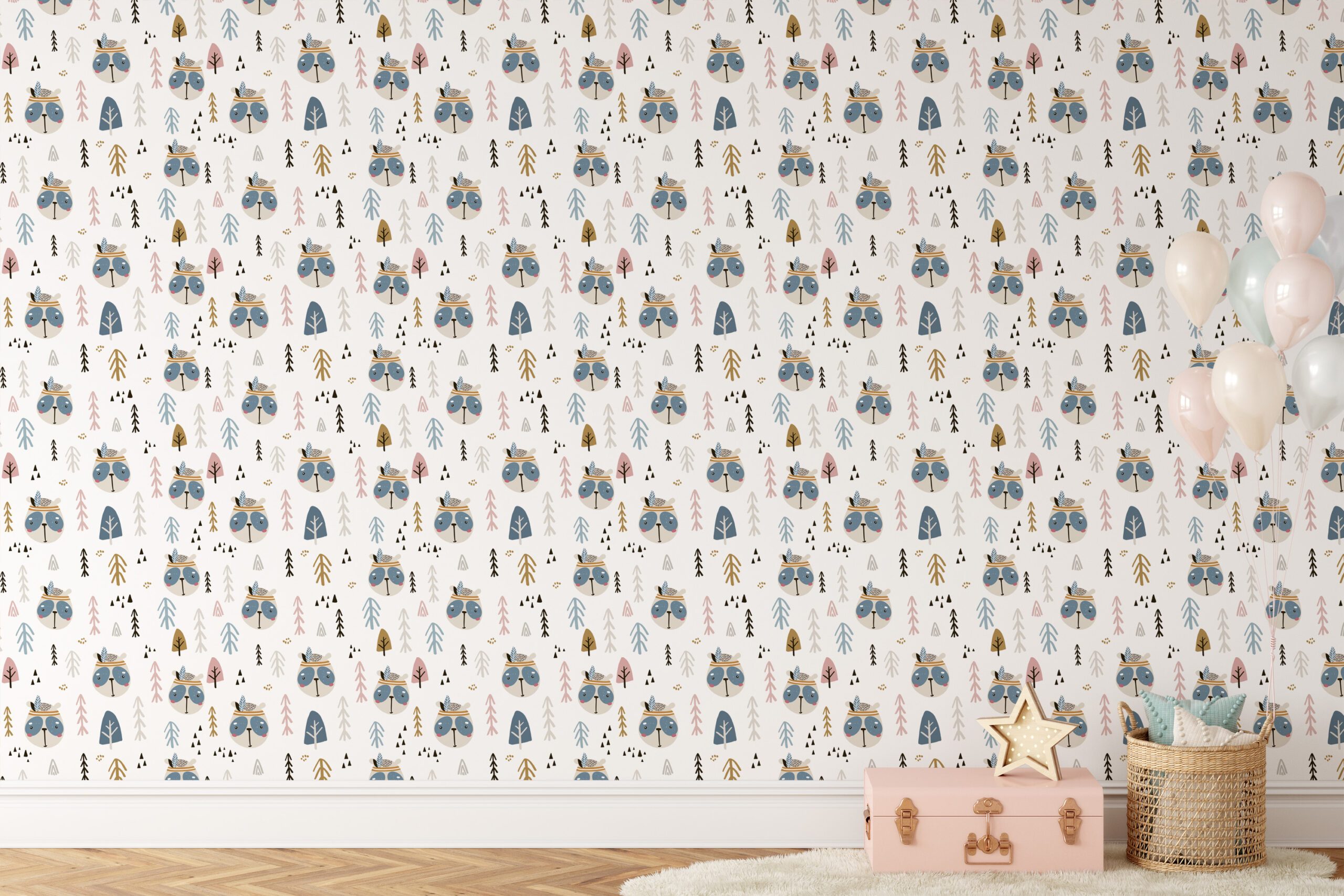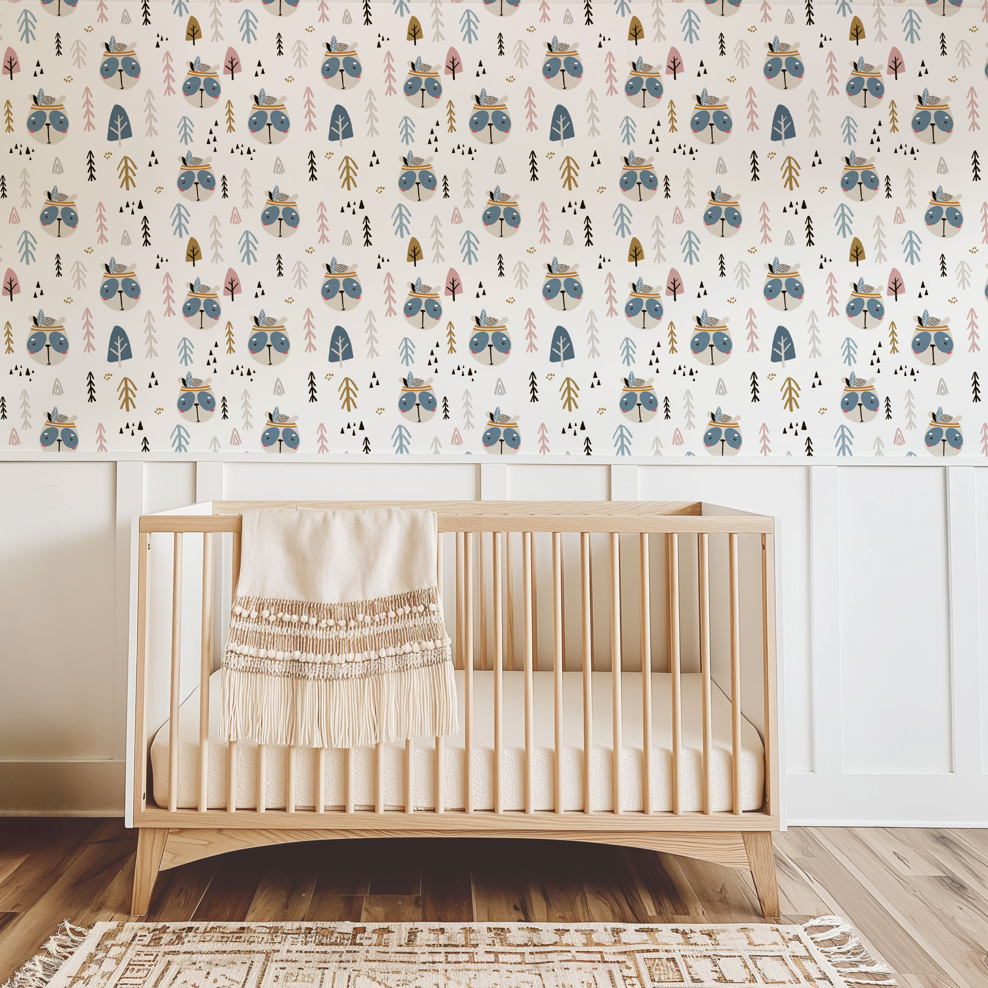 Tribal Woodland Animals and Pine Forest Kids Peel and Stick Wallpaper, Neutral Scandi Nursery Wall Mural kids-0060