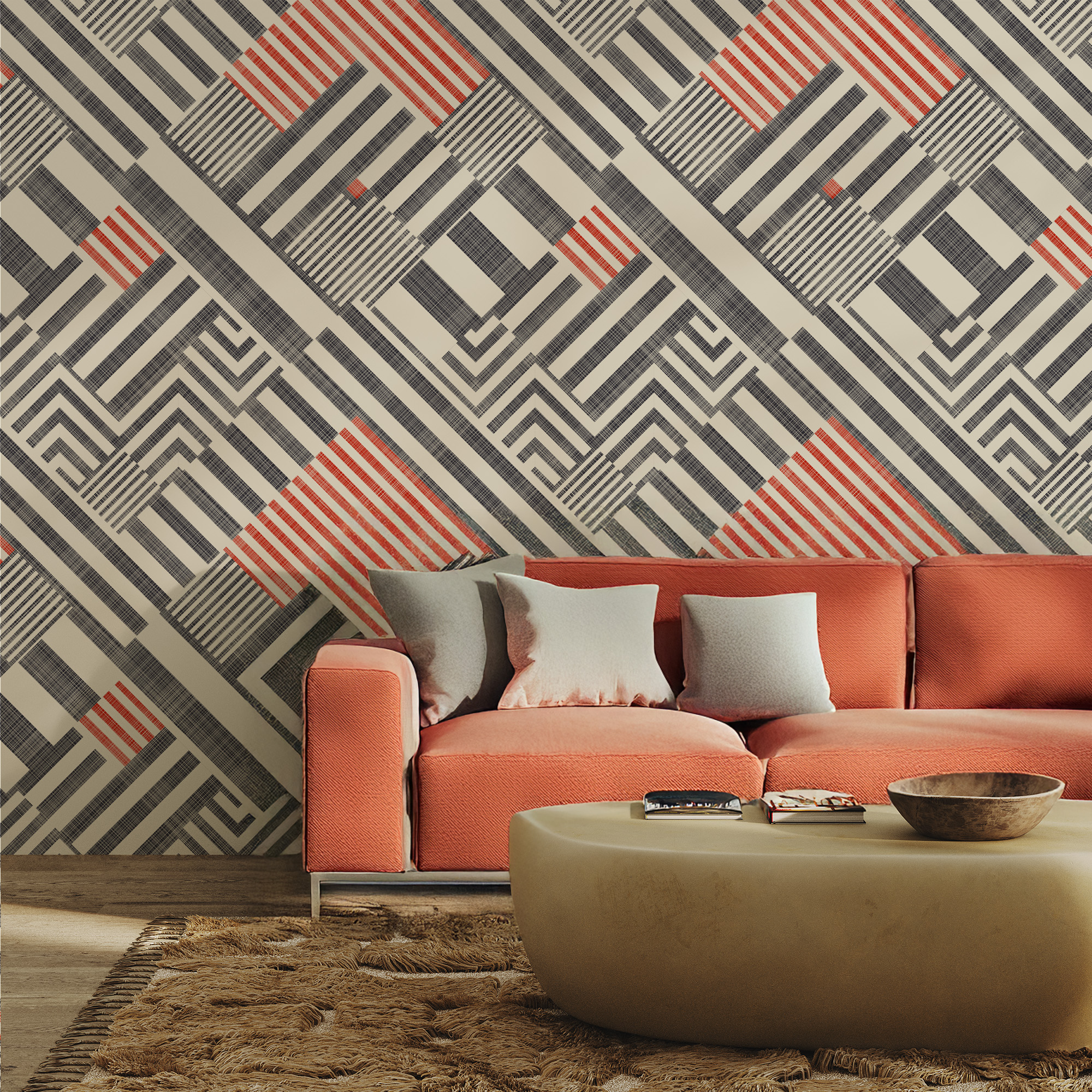 Vertical Earthy Herringbone Stripe Peel and Stick Wallpaper, Boho Chevron Texture Wall Mural, Muted Teal and Rust Kitchen Decor gmla-0022