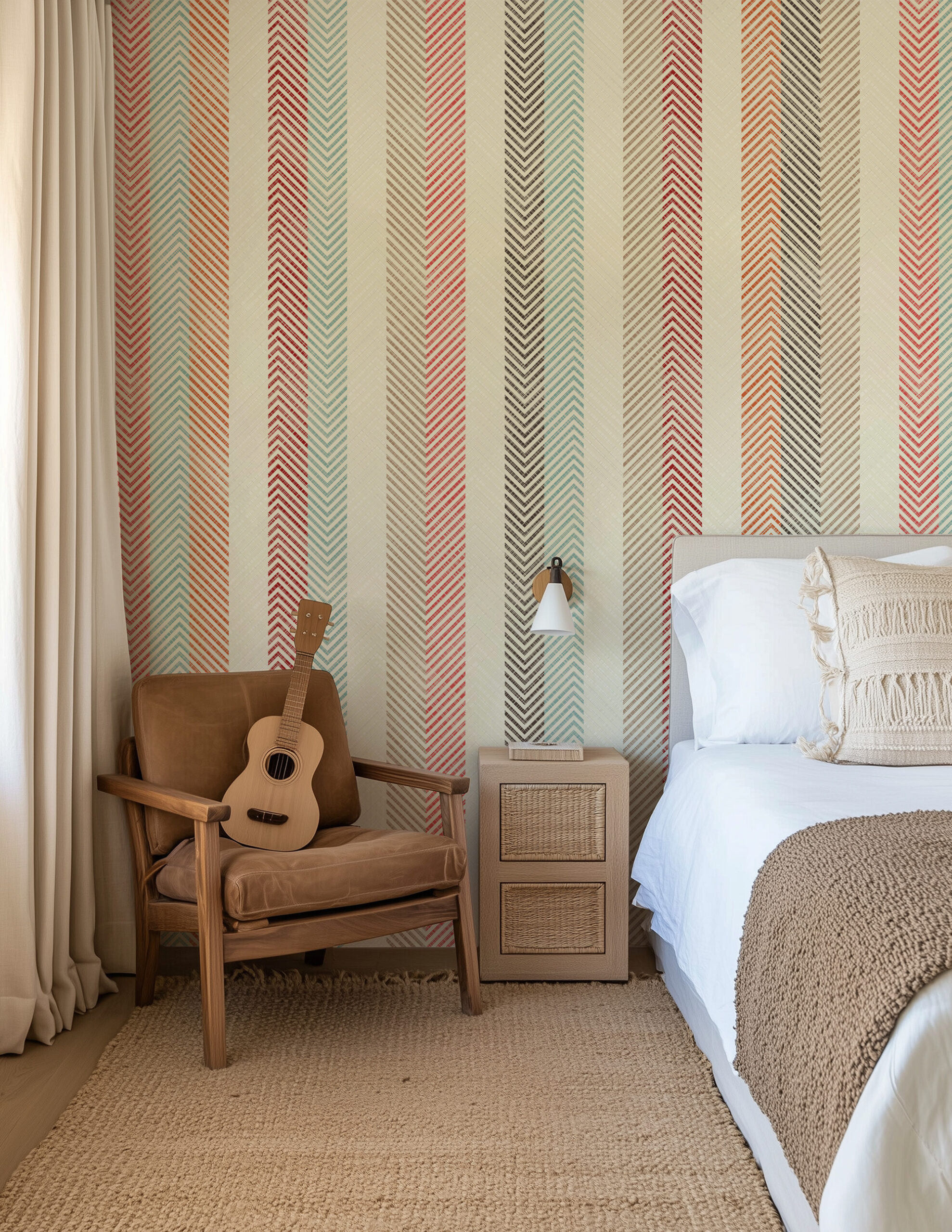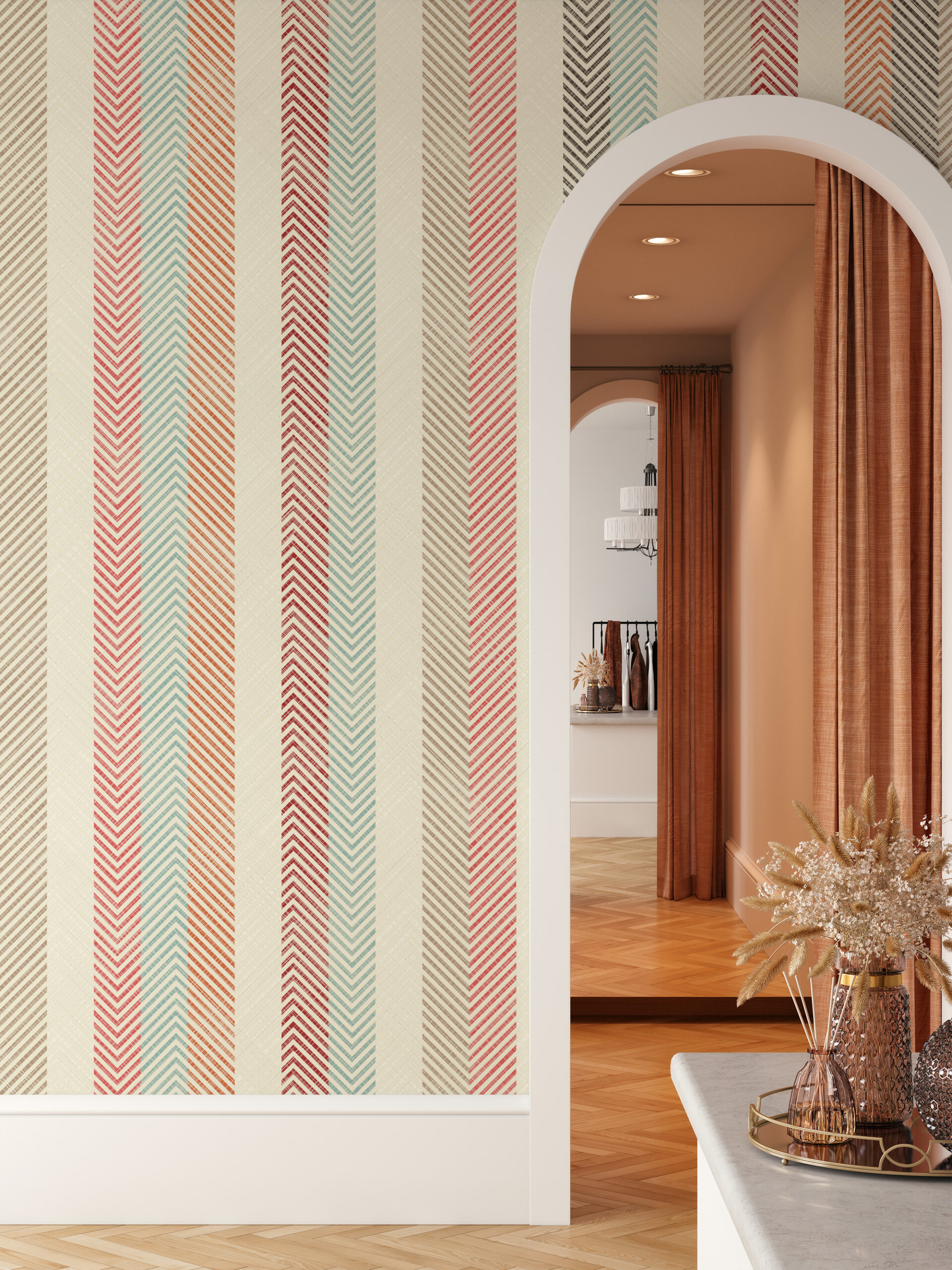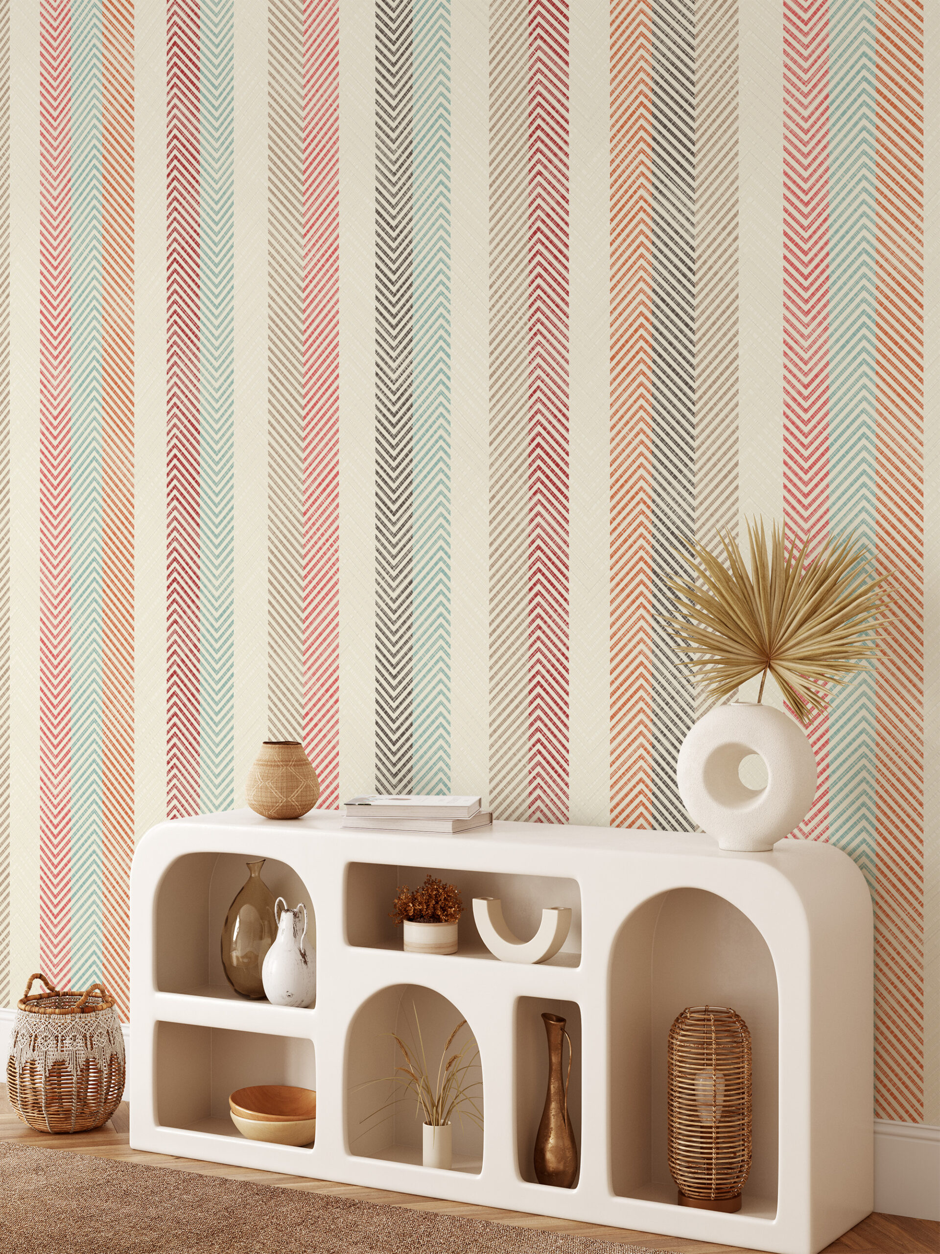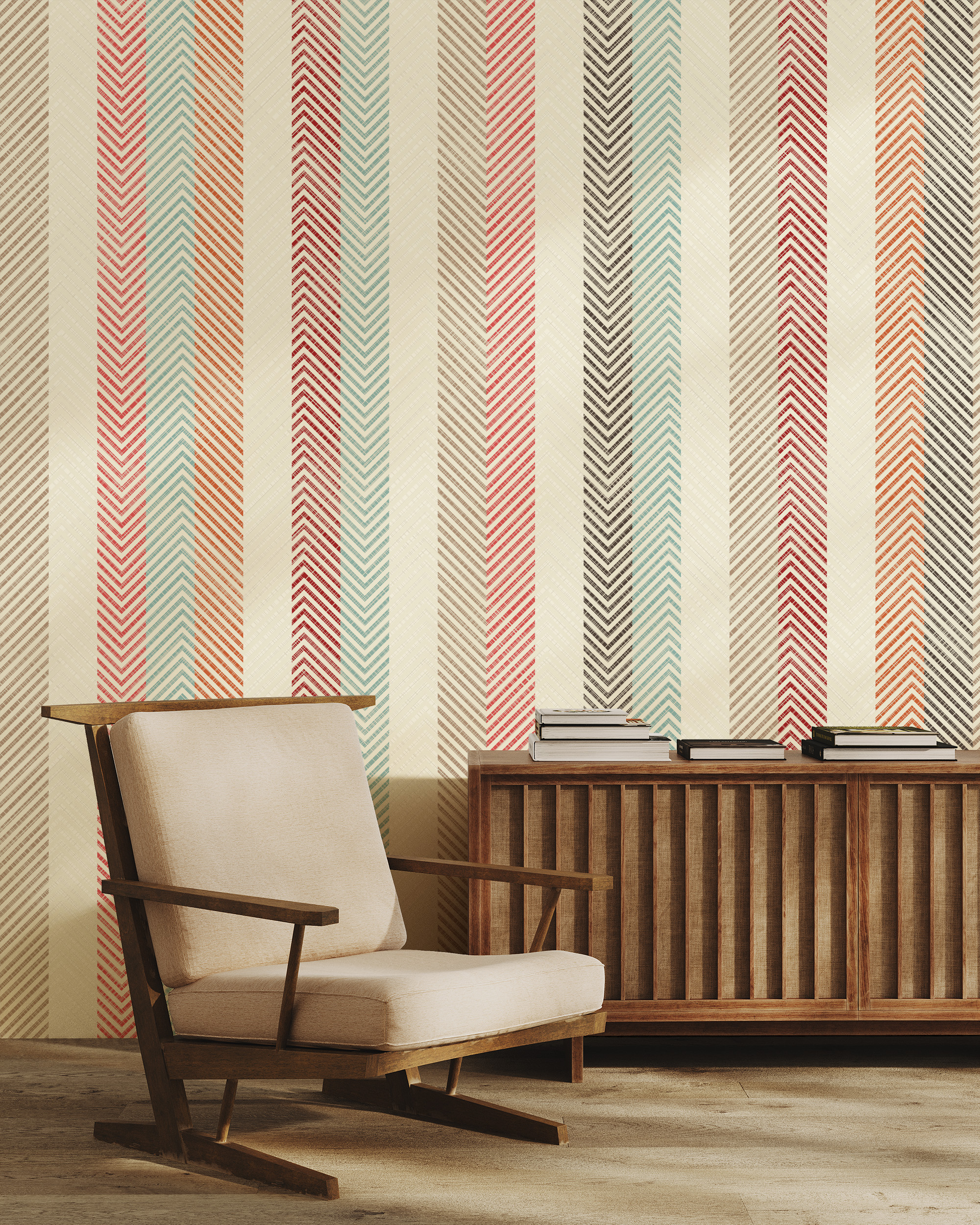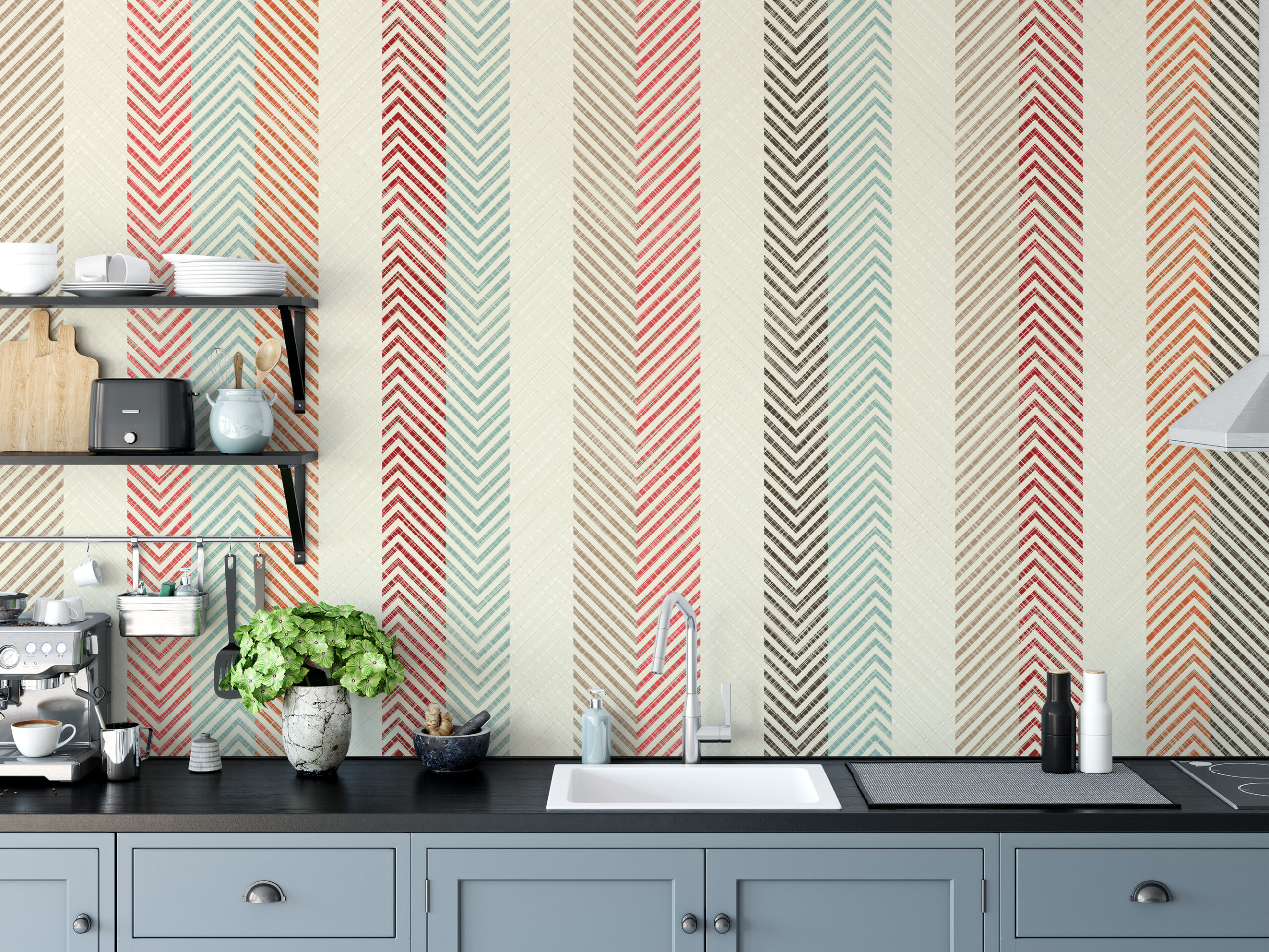 Vertical Earthy Herringbone Stripe Peel and Stick Wallpaper, Boho Chevron Texture Wall Mural, Muted Teal and Rust Kitchen Decor gmla-0021